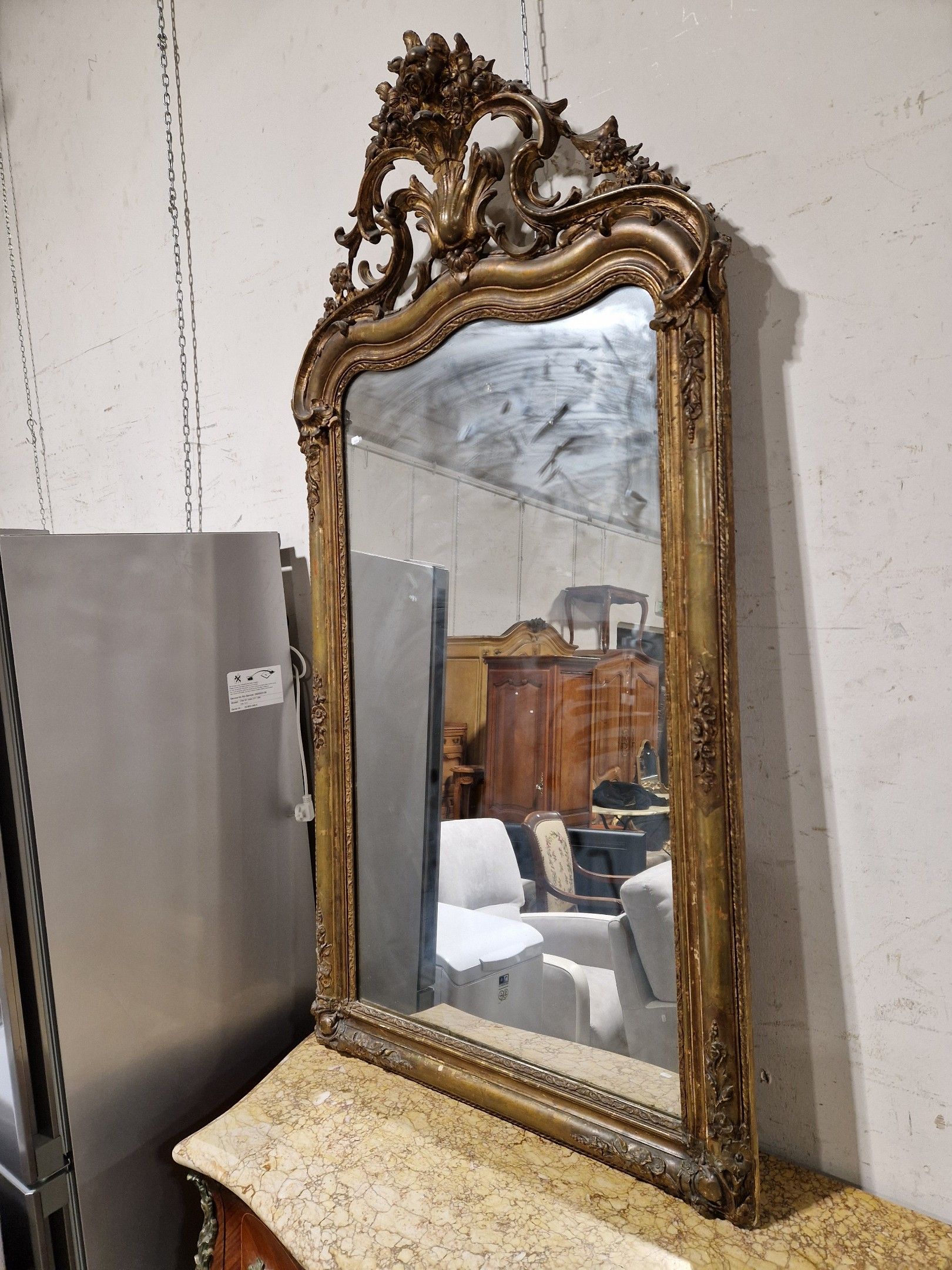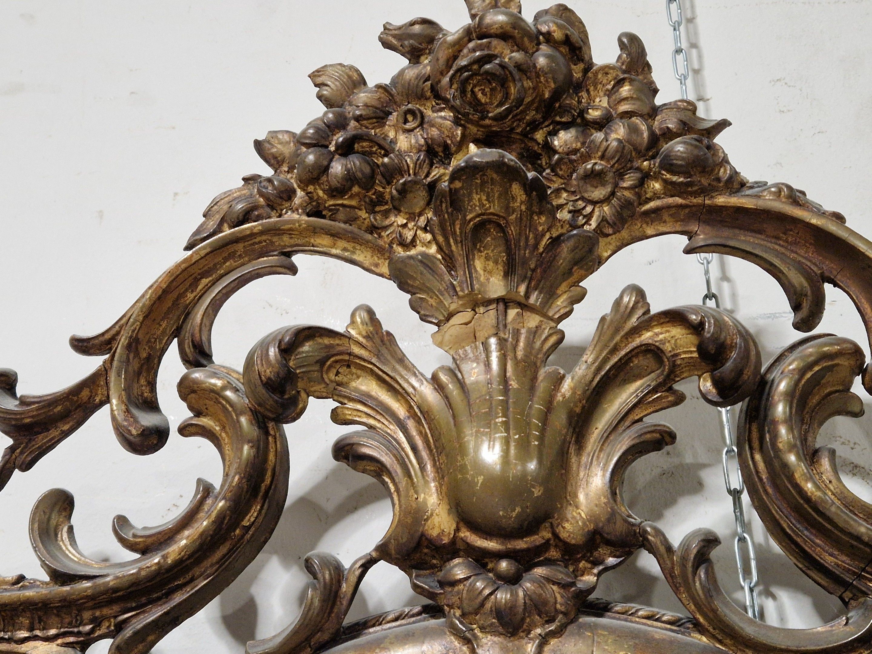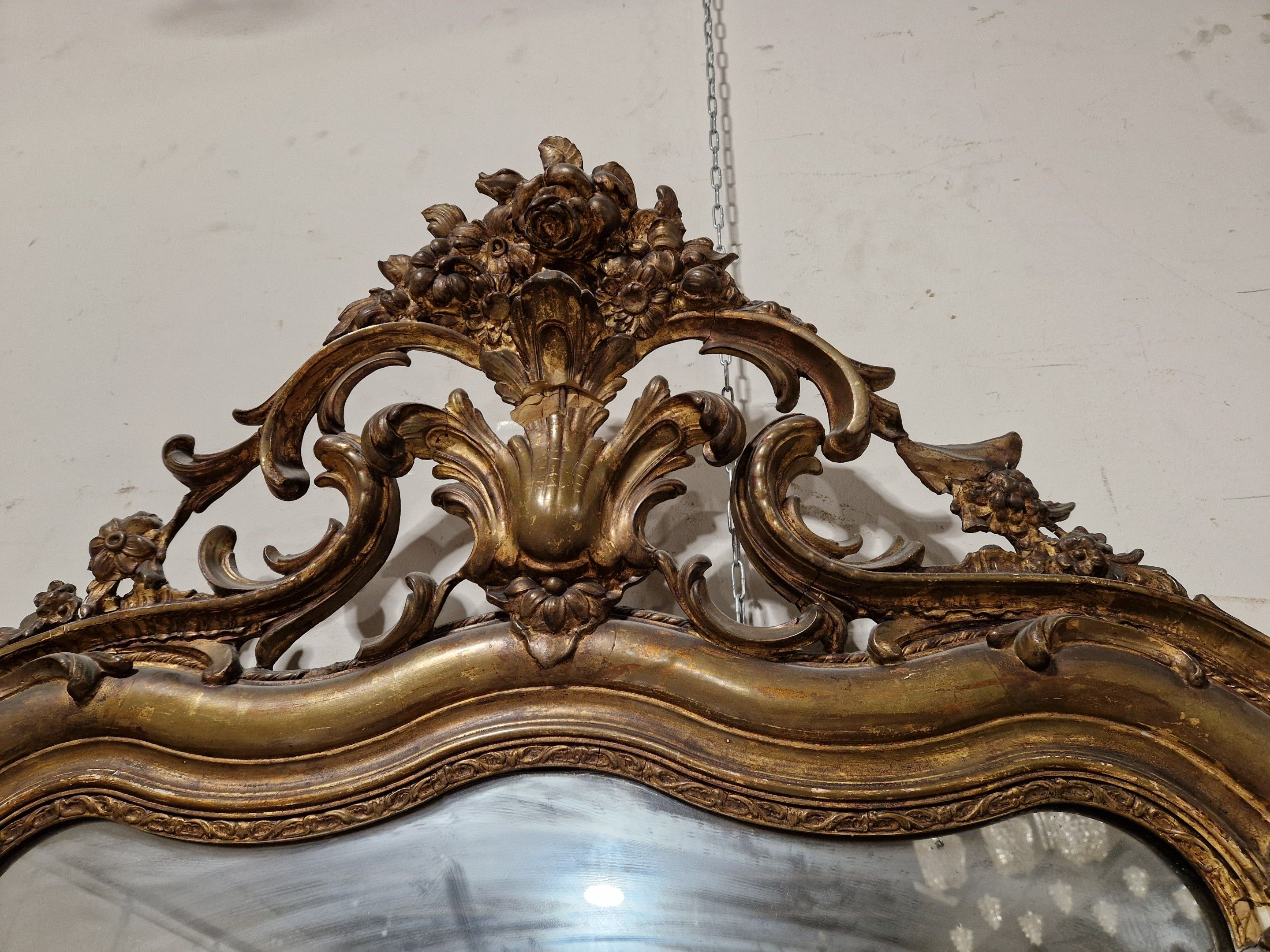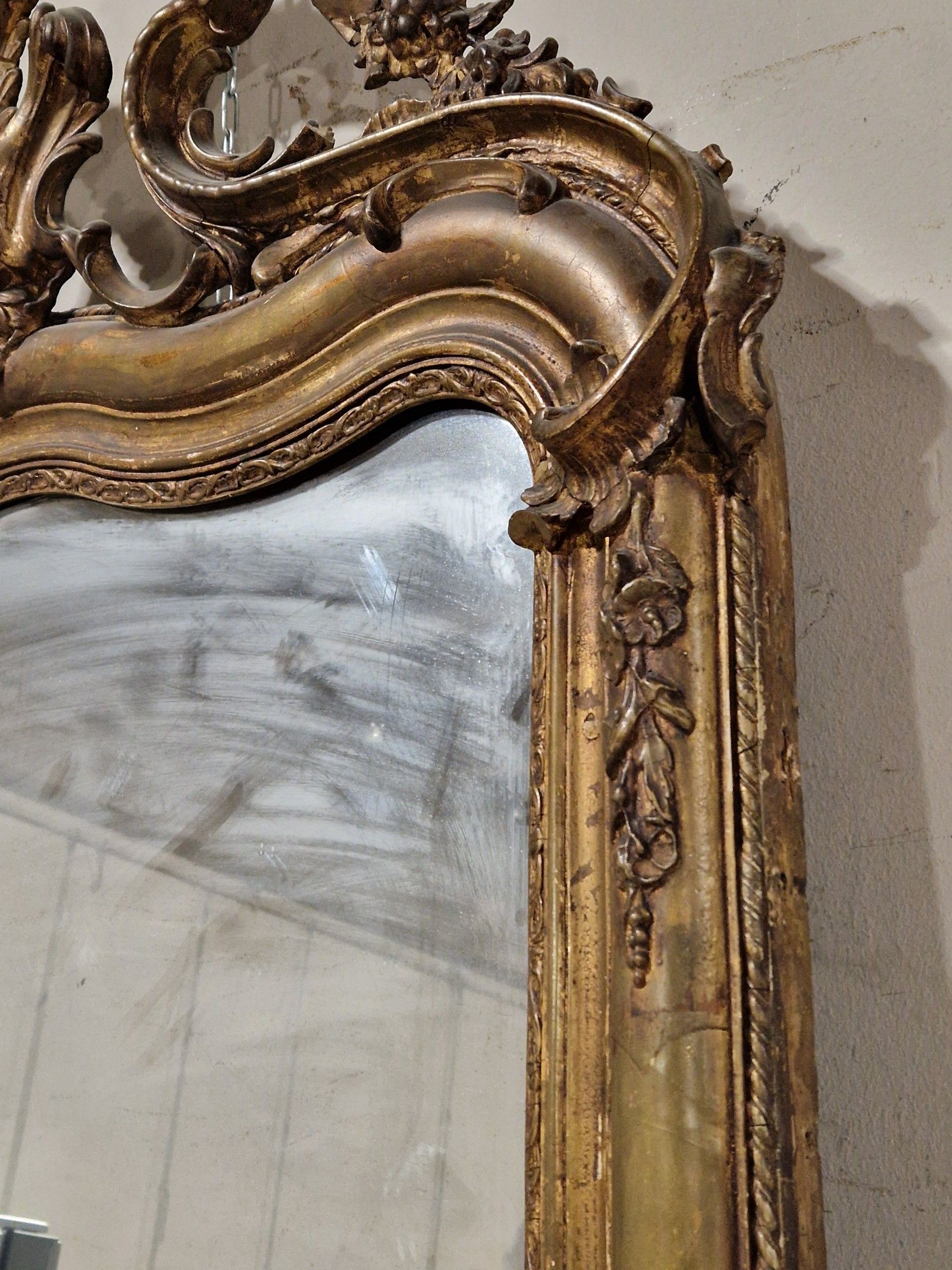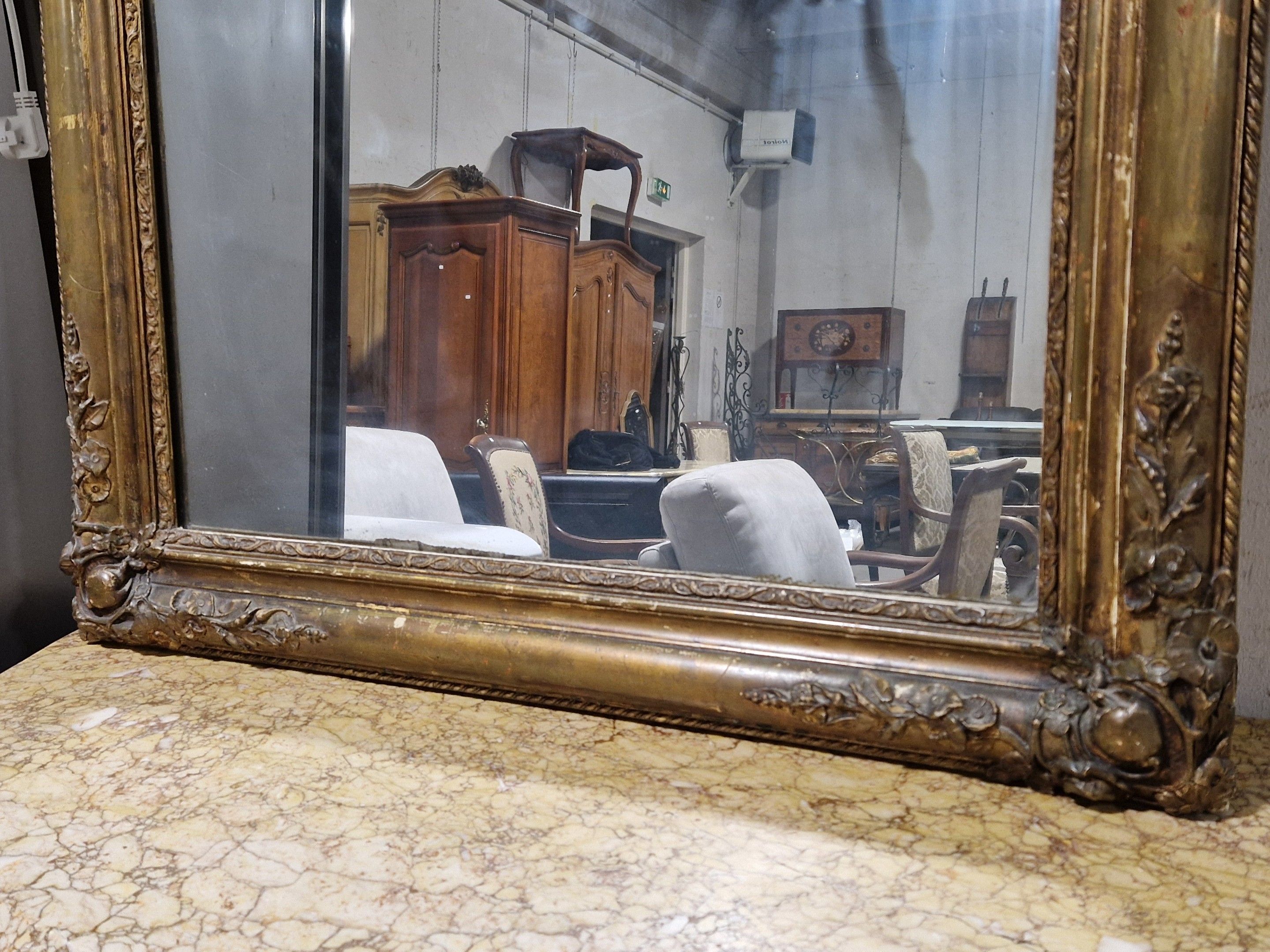 Late 19th century gilded plaster mantel mirror. Re-gilding and decoration. 170 x 92 cm