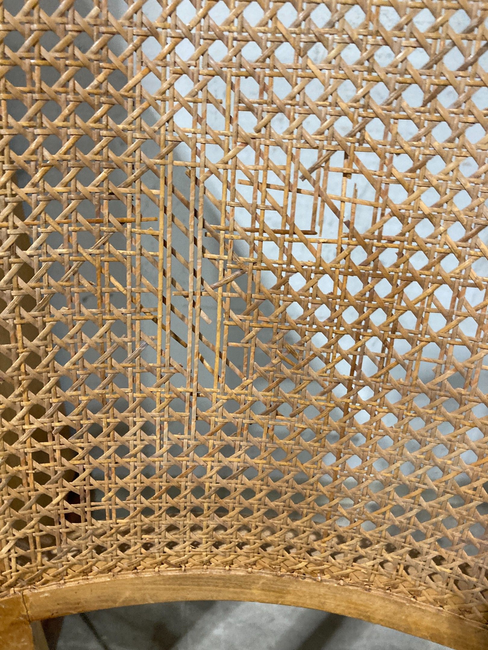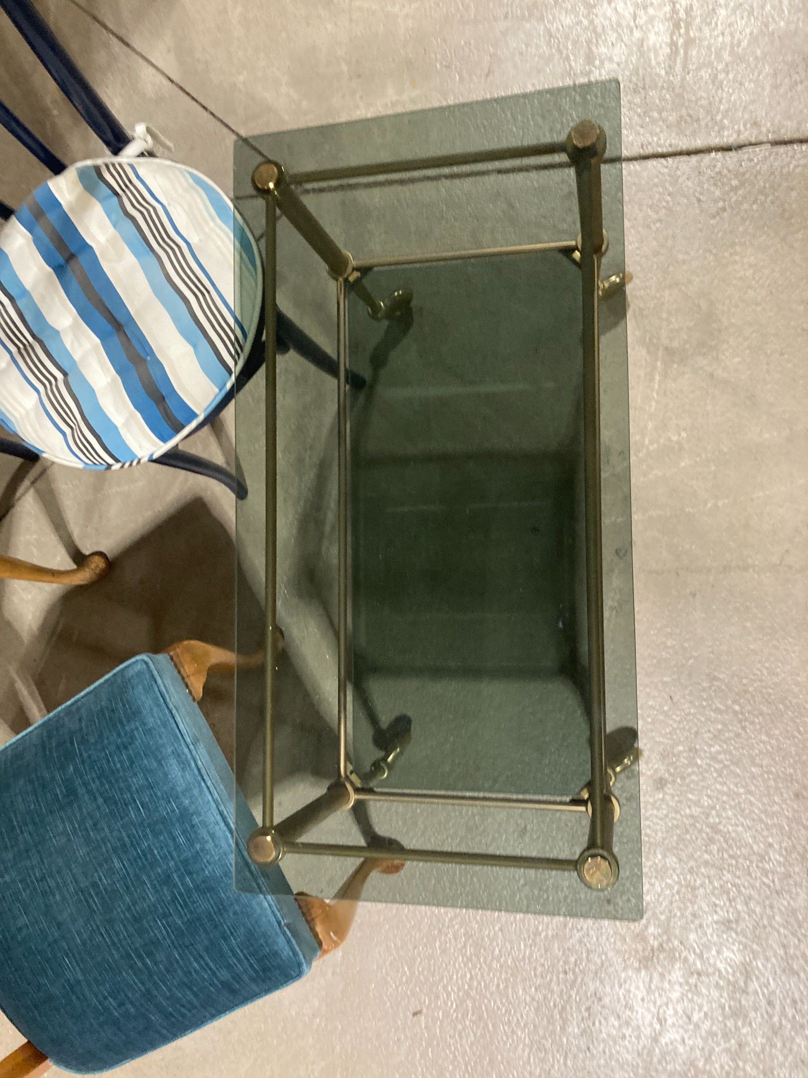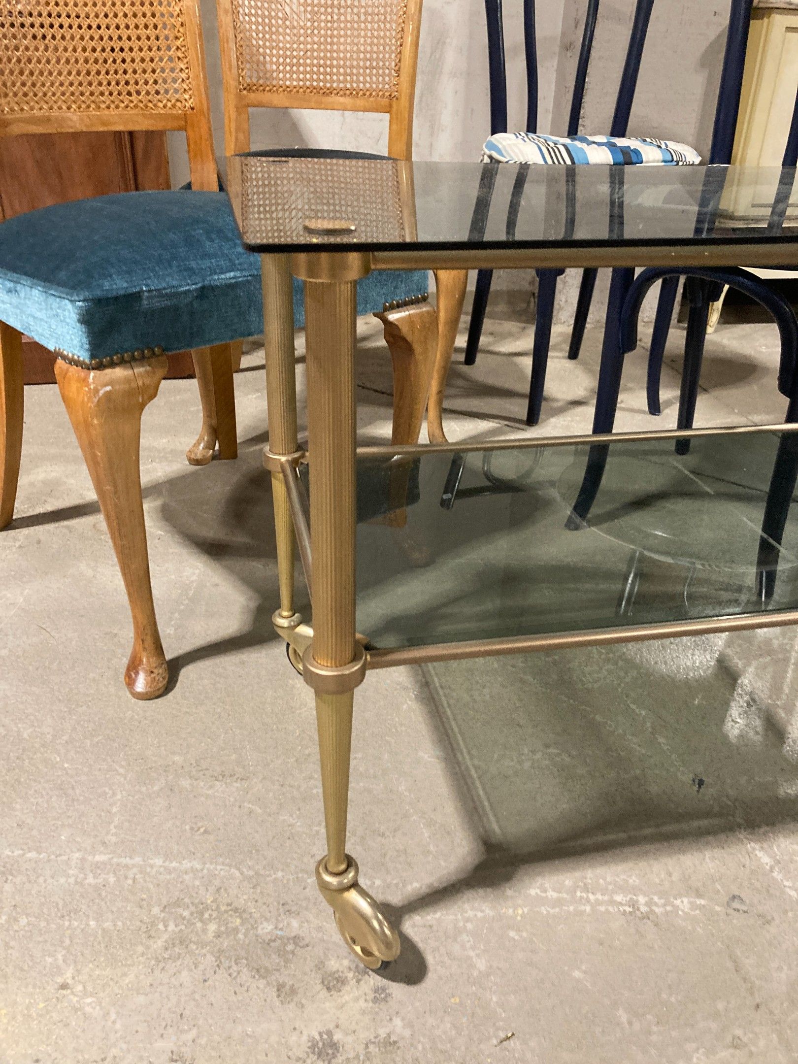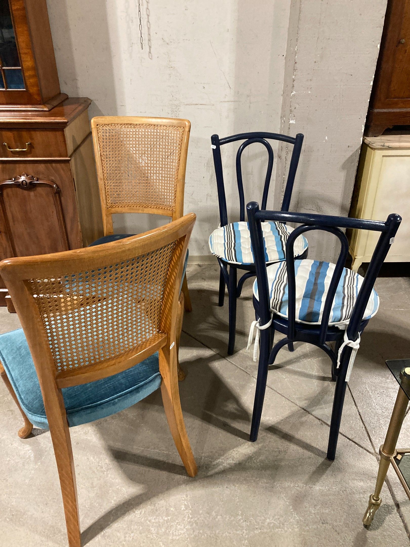 Two navy painted wooden kitchen chairs and two English chairs with blue velvet seats. There is also a serving trolley with castors and a smoked glass top.