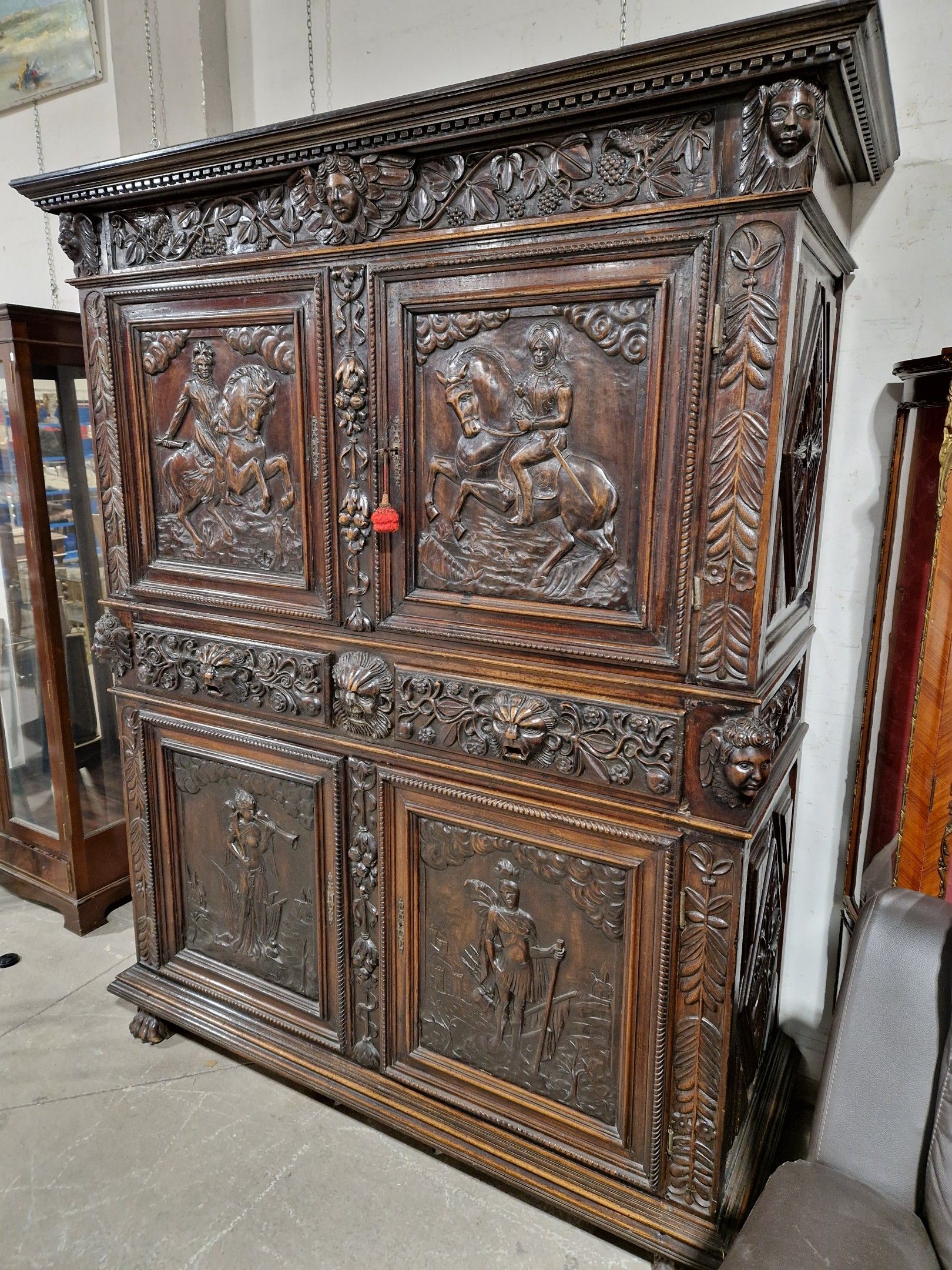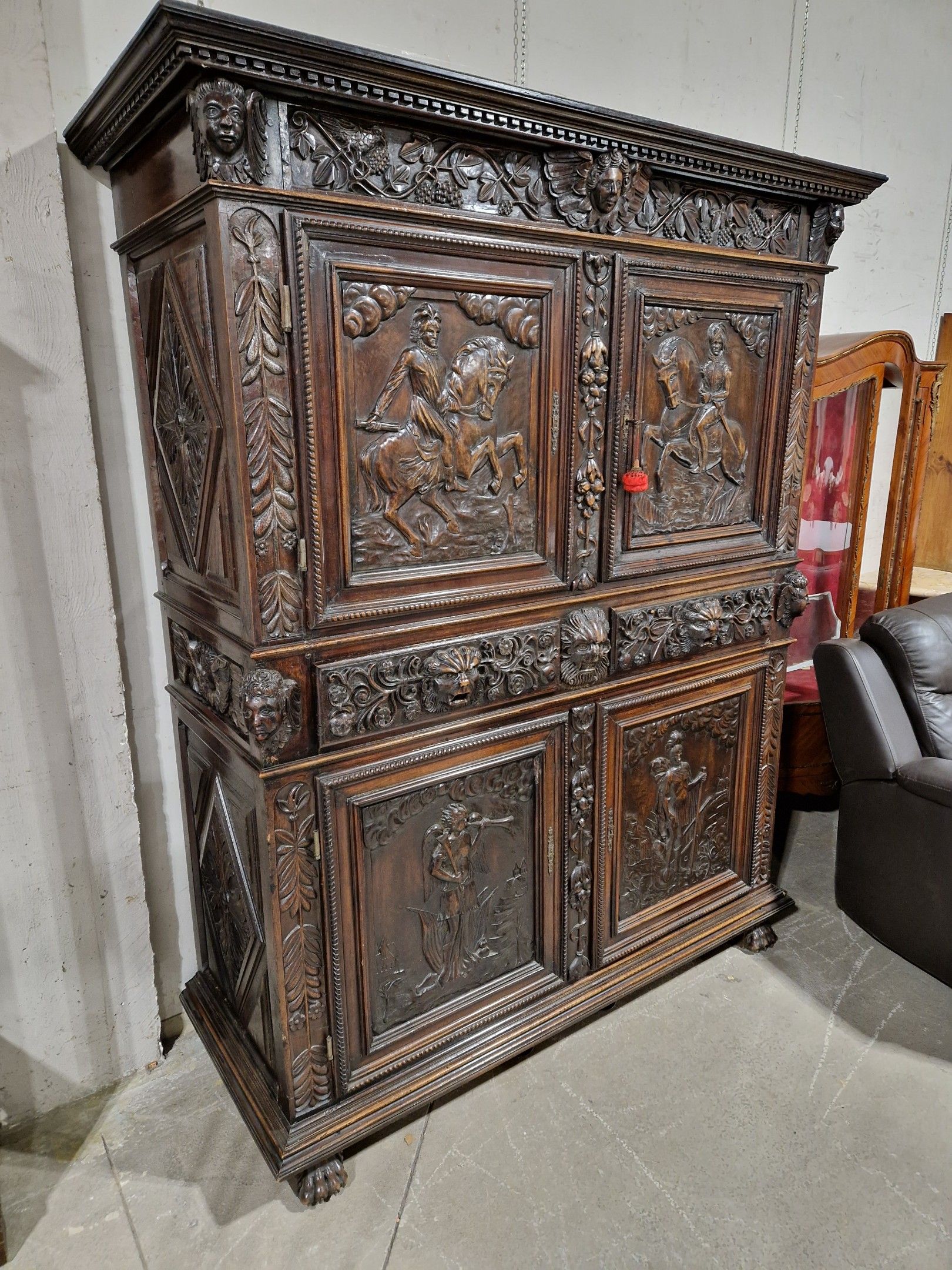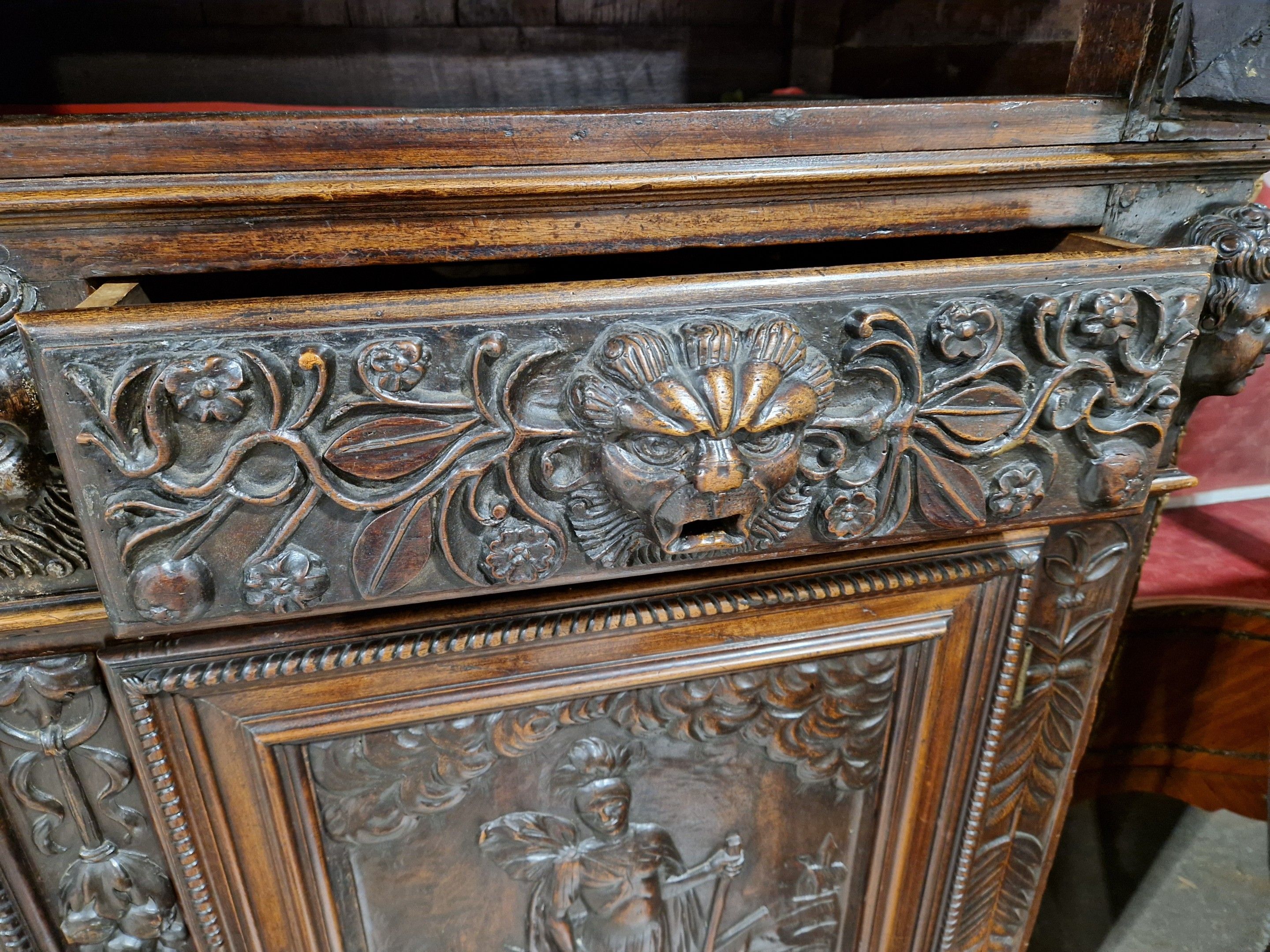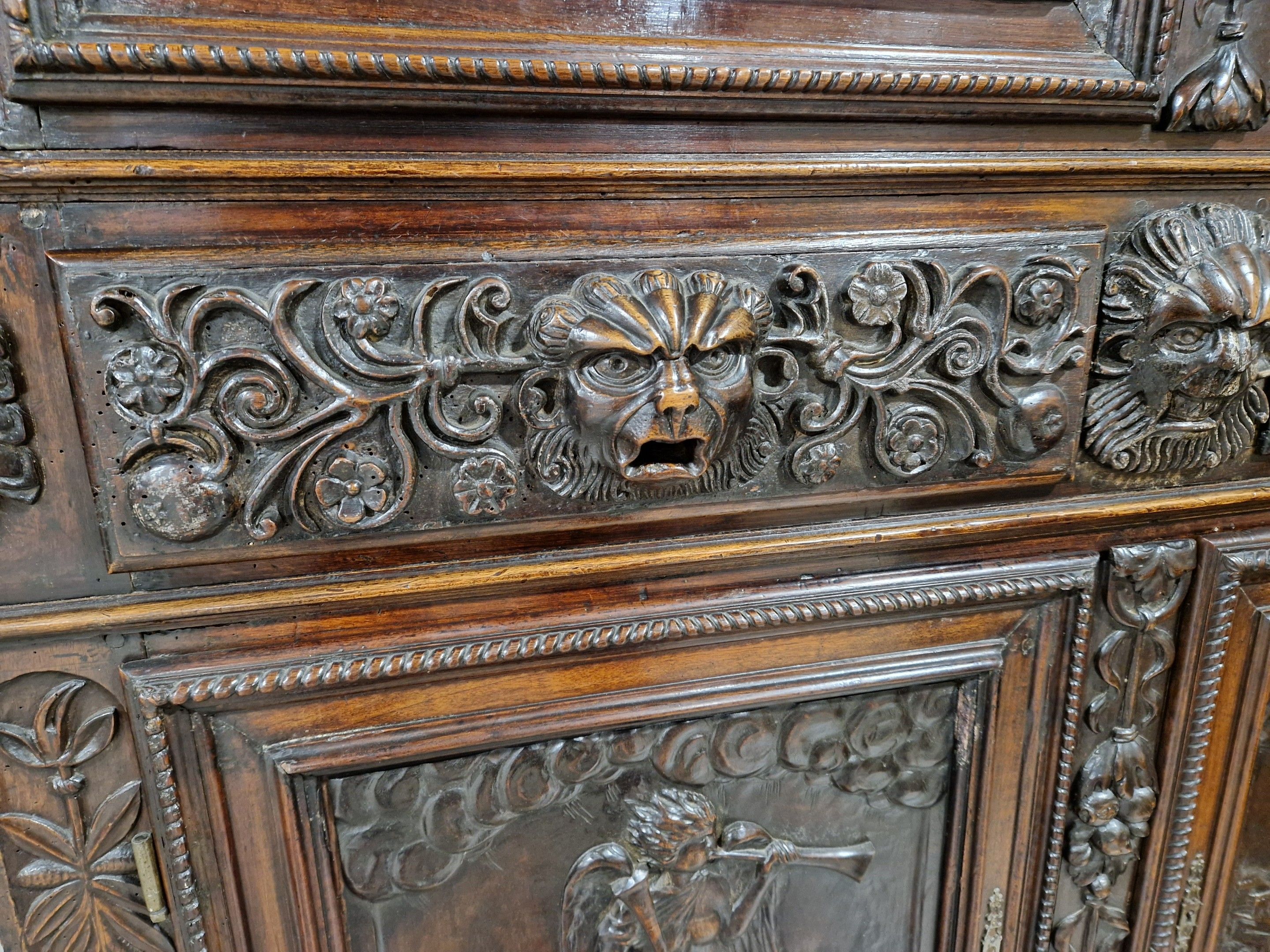 Louis XIII style four-door sideboard in patinated wood with rich carved decoration of horsemen and allegories on the doors, grimacing masks on the two central drawers and angels' heads on the jambs. Late 19th-early 20th century. 203.5 x 166 x 66 cm