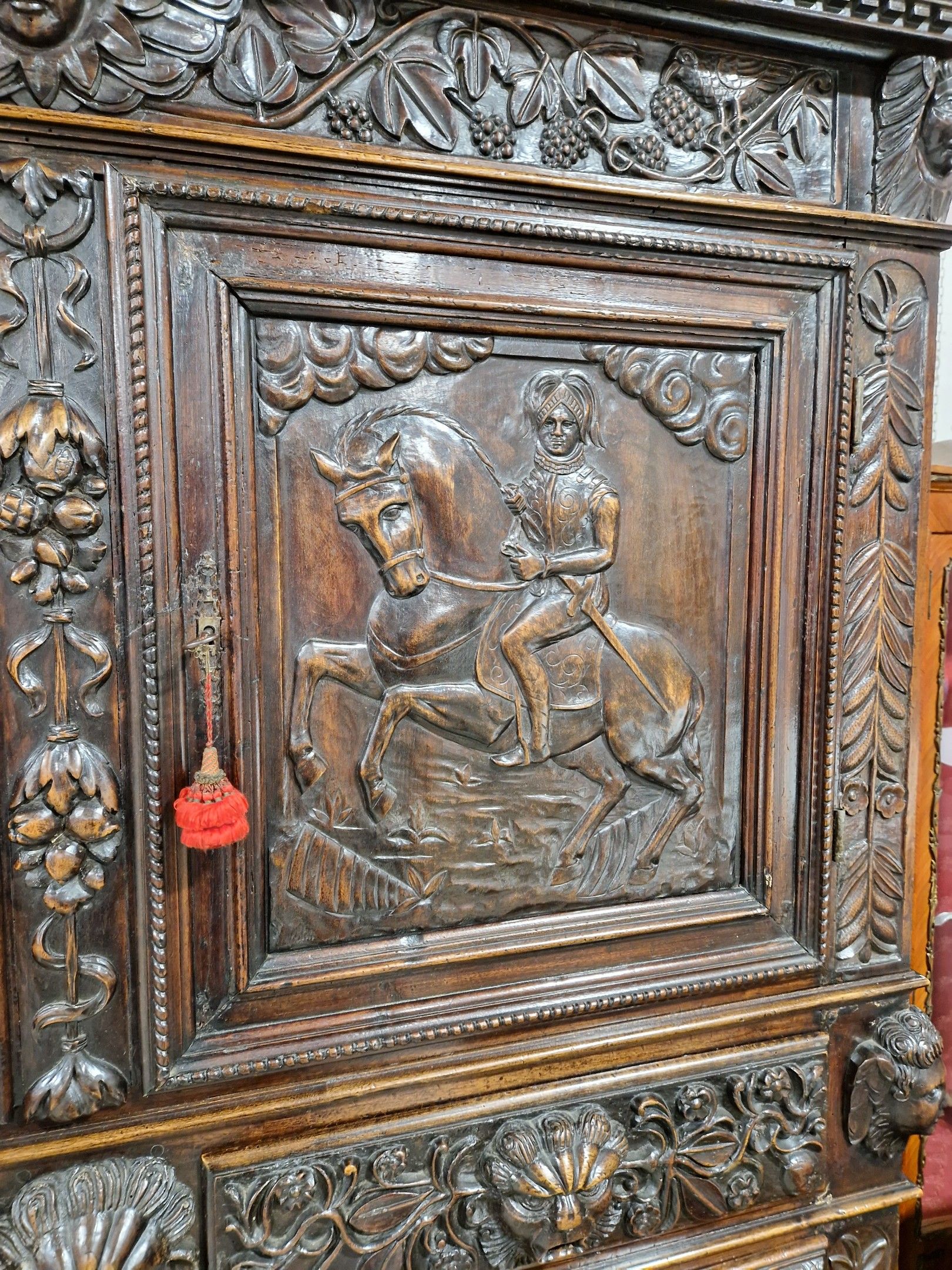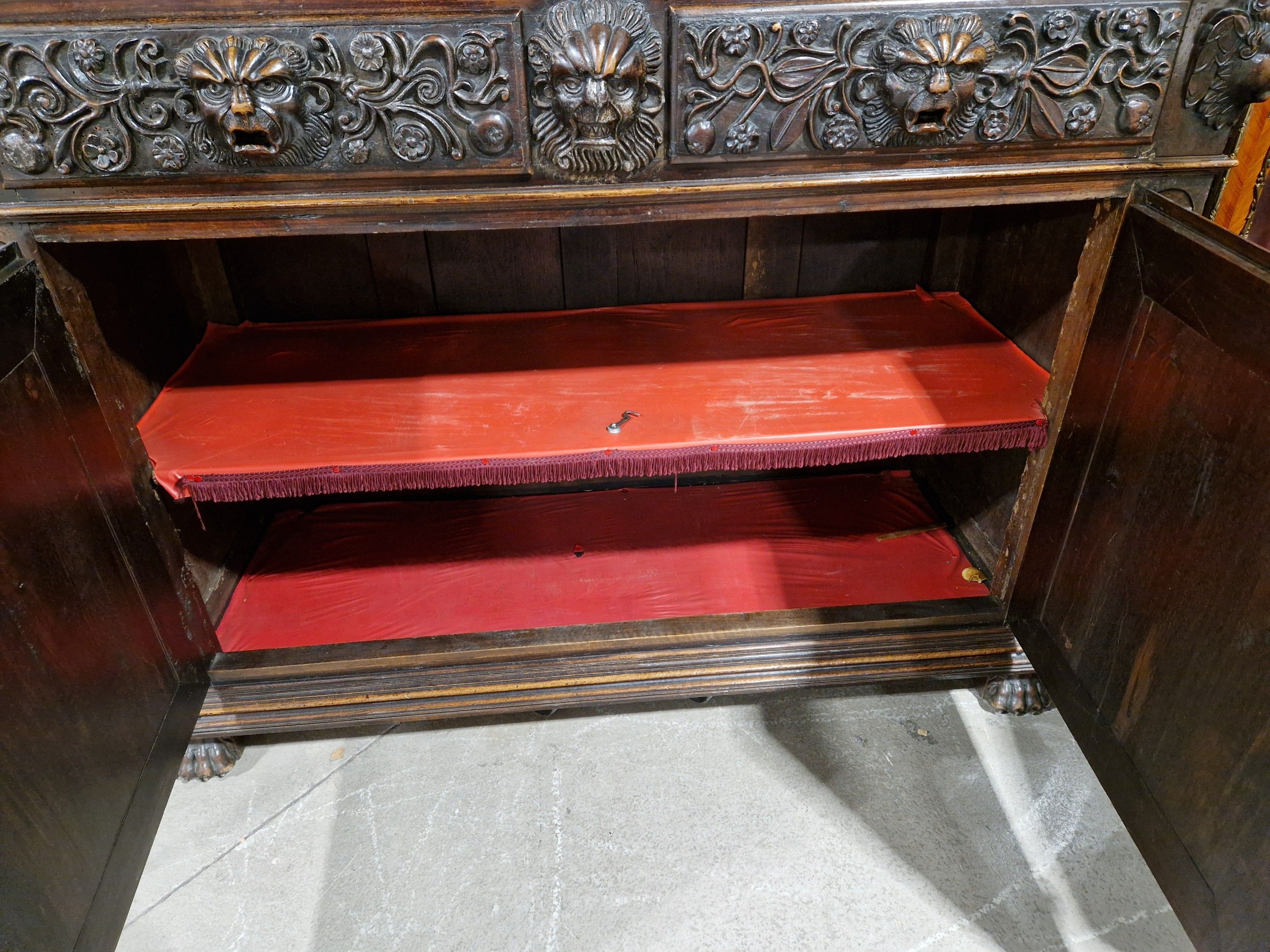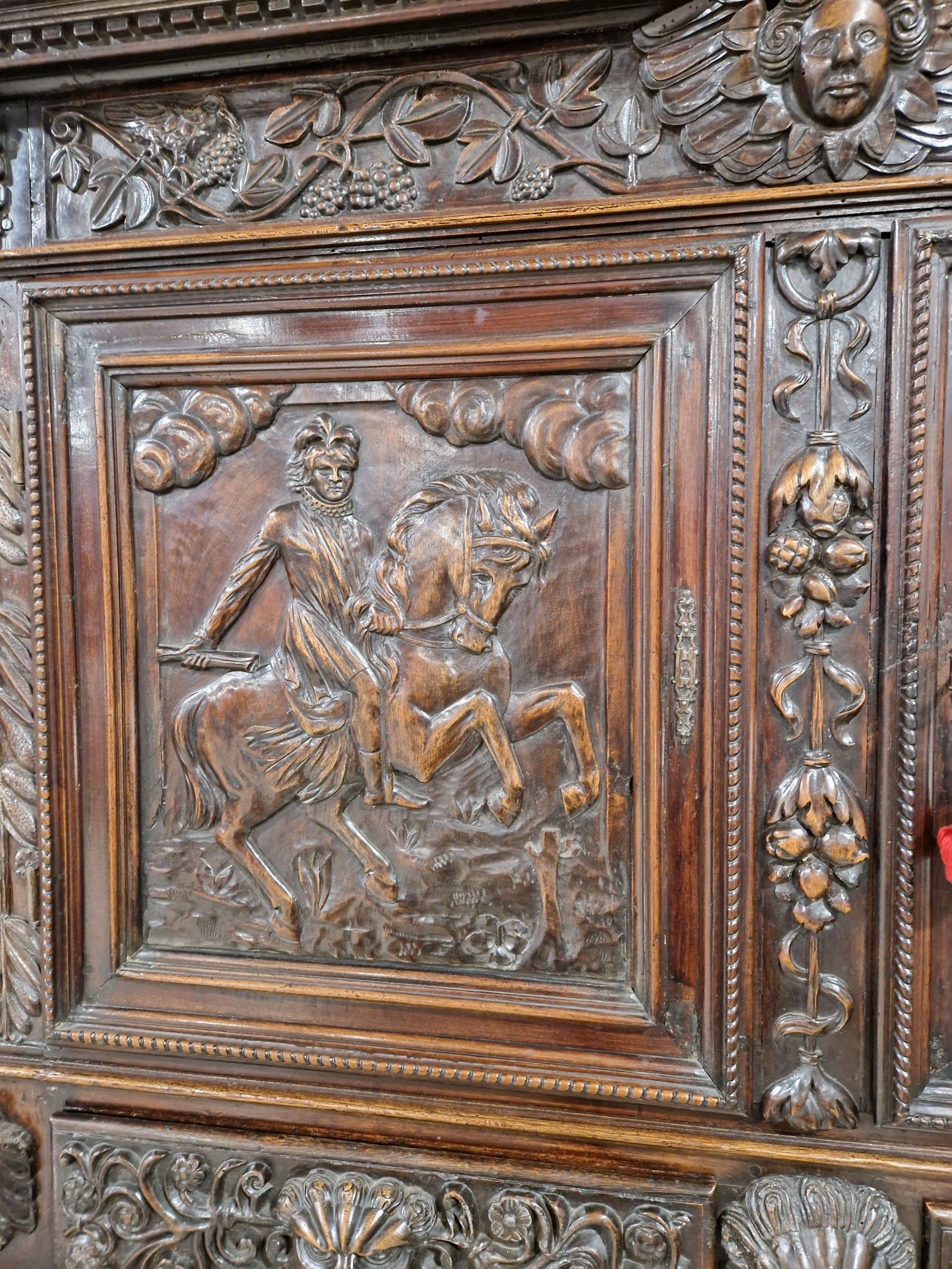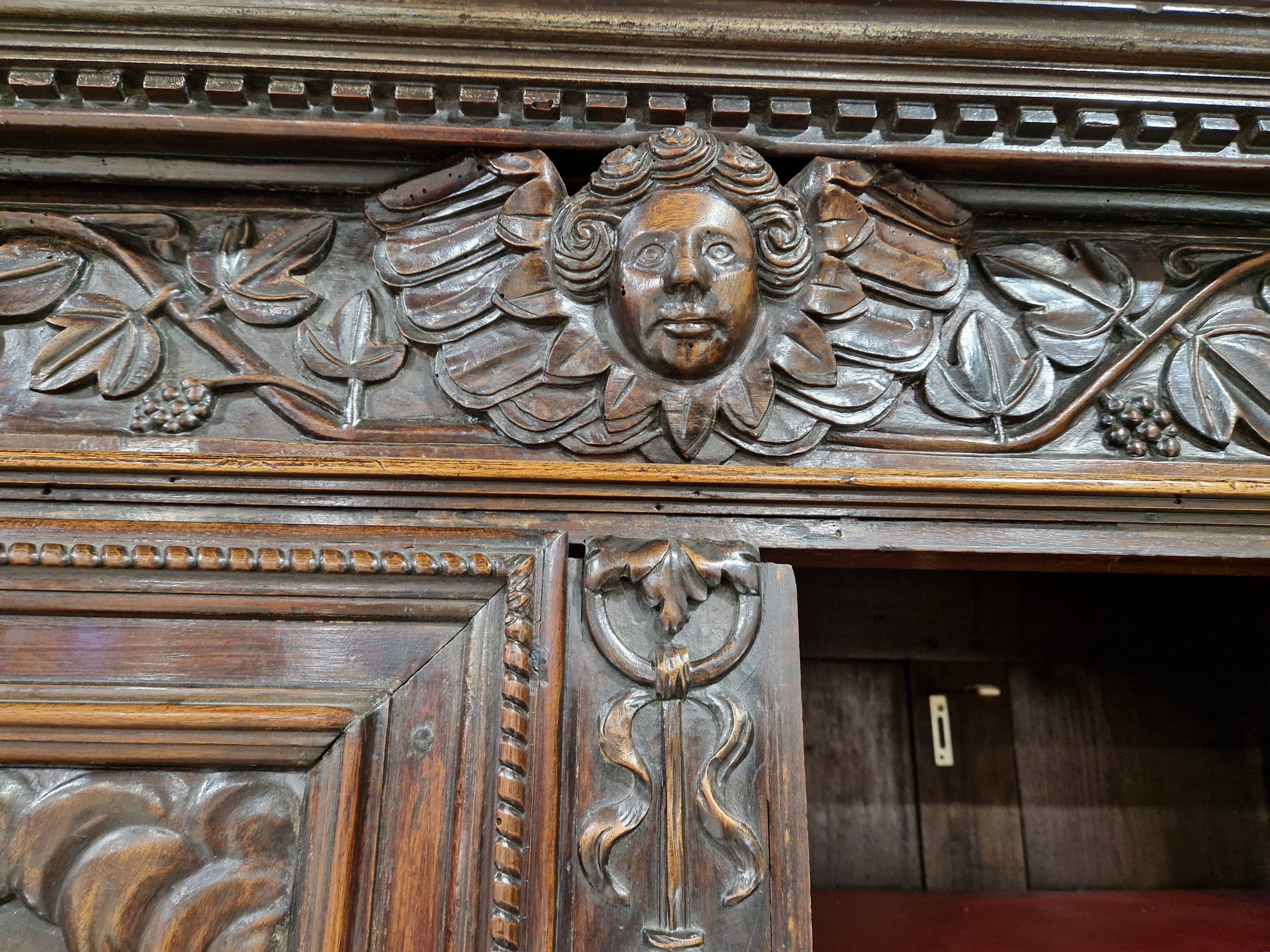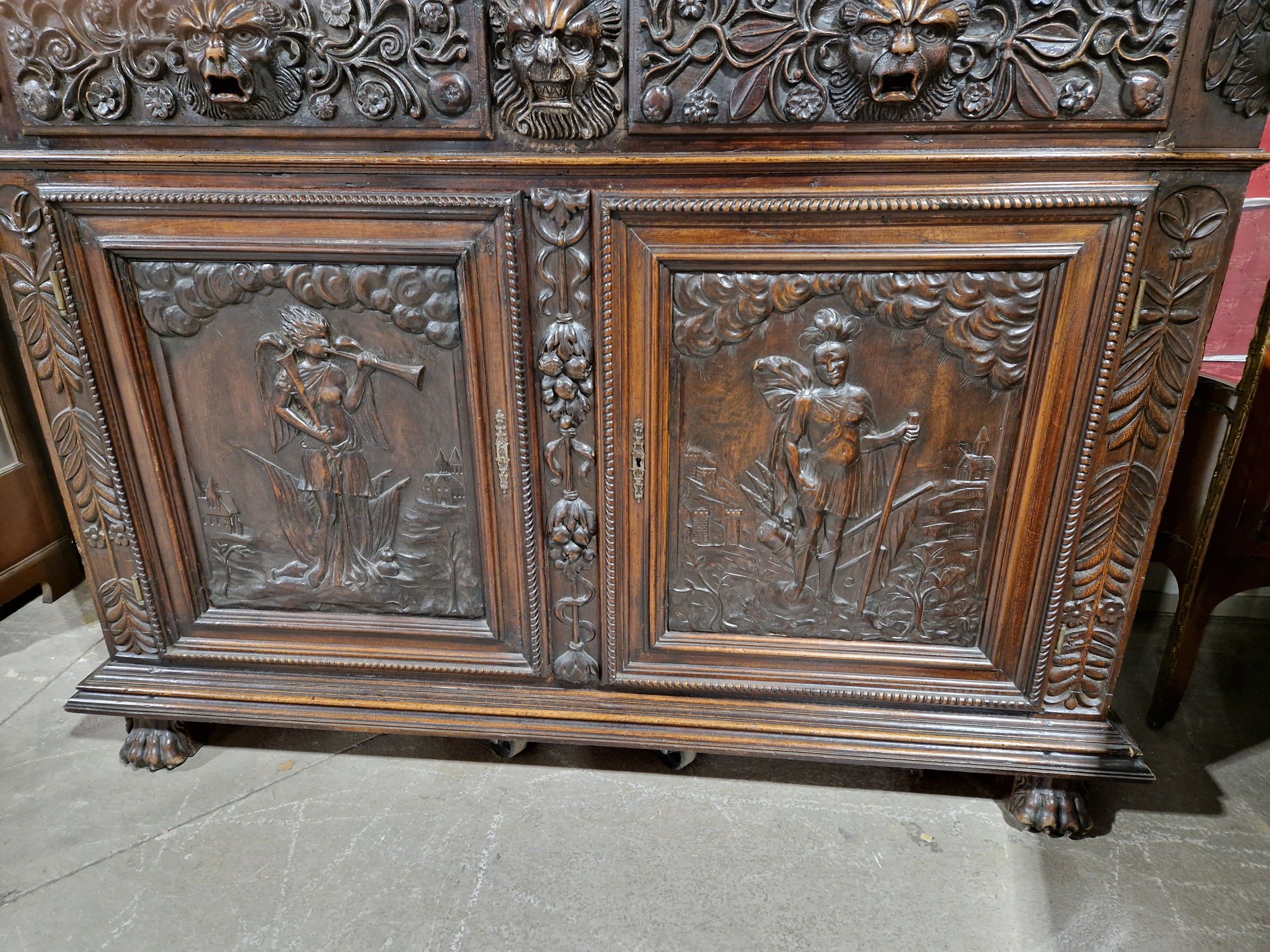 Louis XIII style four-door sideboard in patinated wood with rich carved decoration of horsemen and allegories on the doors, grimacing masks on the two central drawers and angels' heads on the jambs. Late 19th-early 20th century. 203.5 x 166 x 66 cm