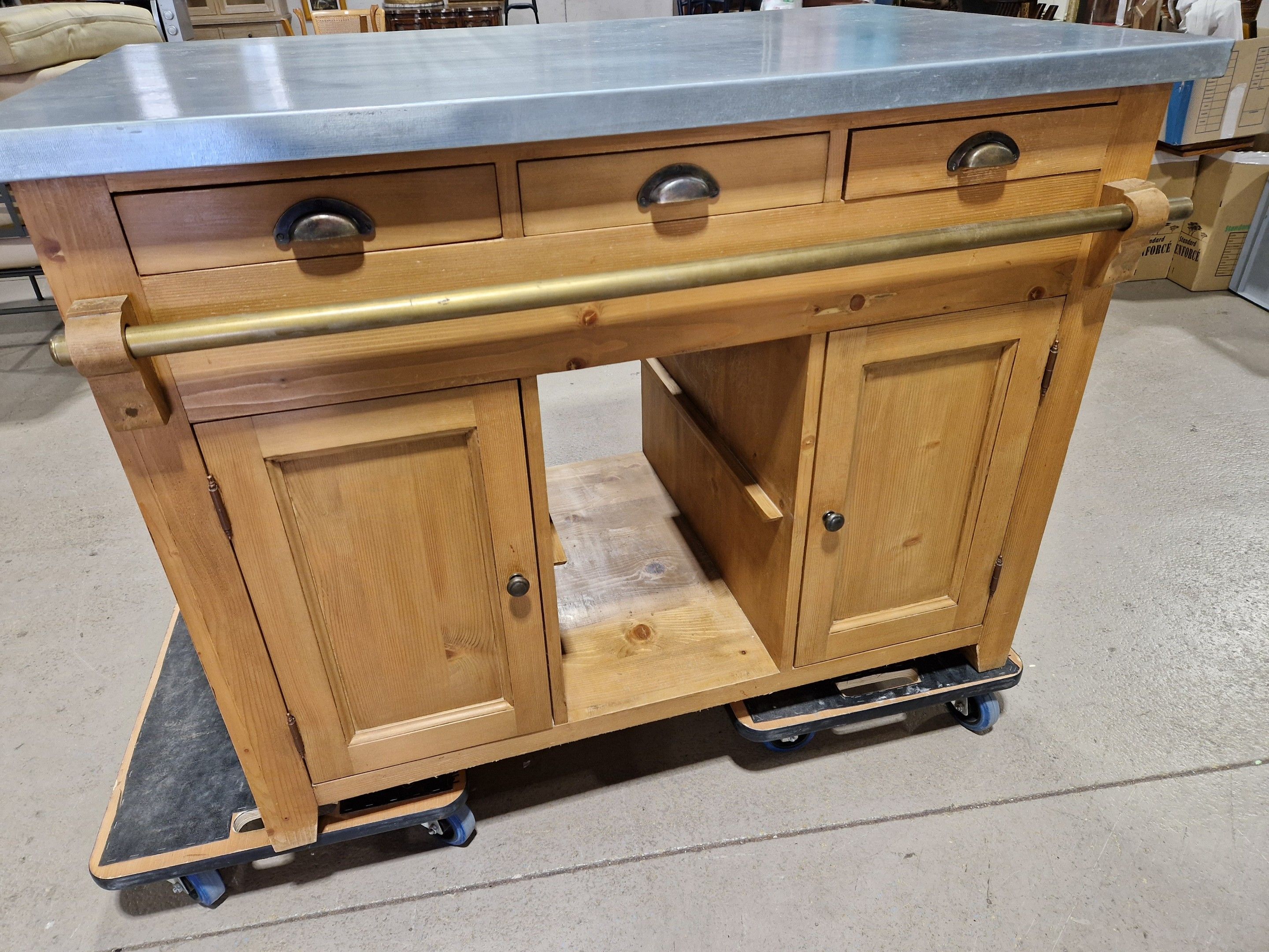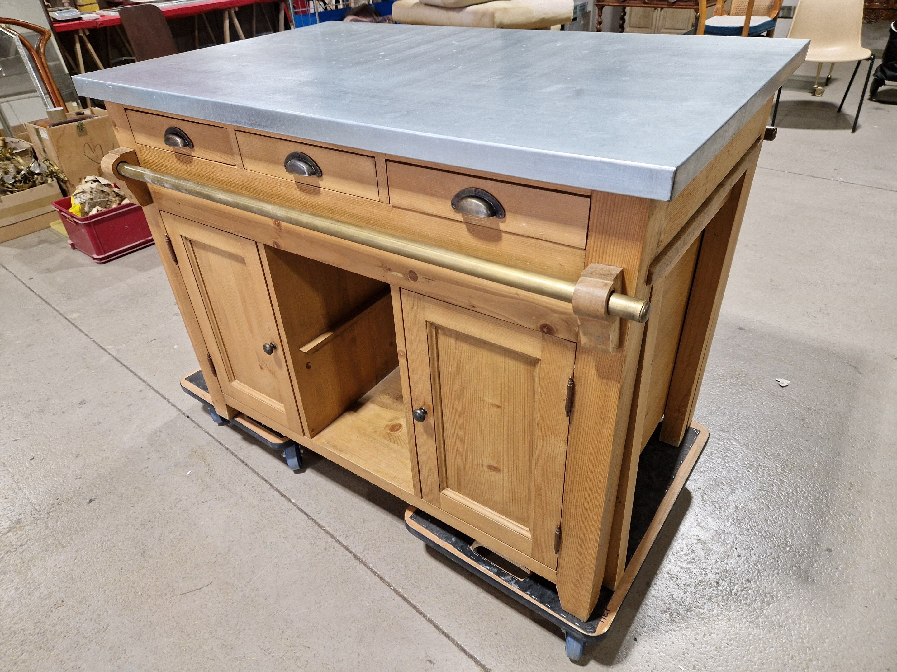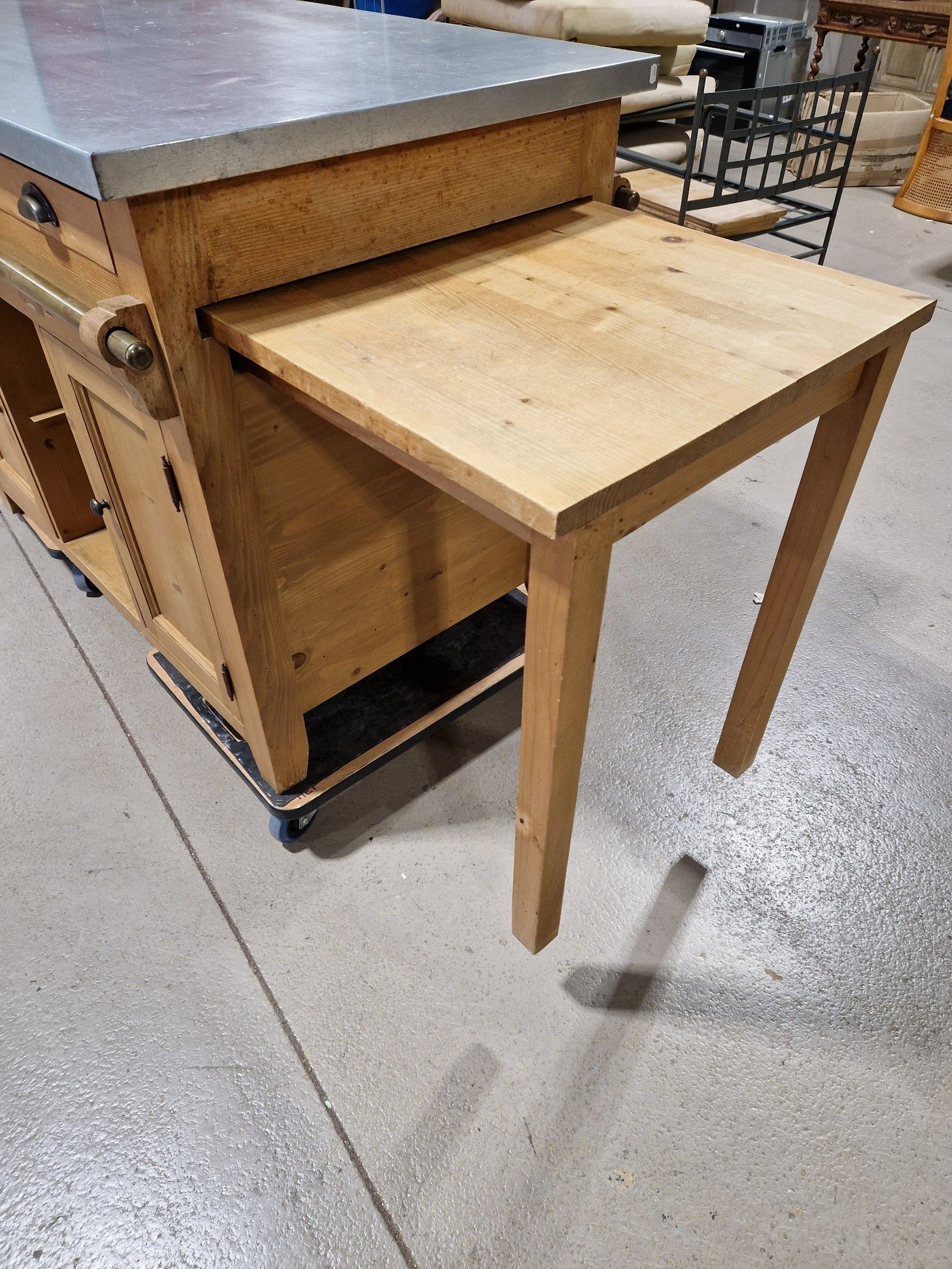 Pine counter forming a central island with zinc top, pull-out side shelf, niches and storage drawers. 92 x 120 x 75 cm