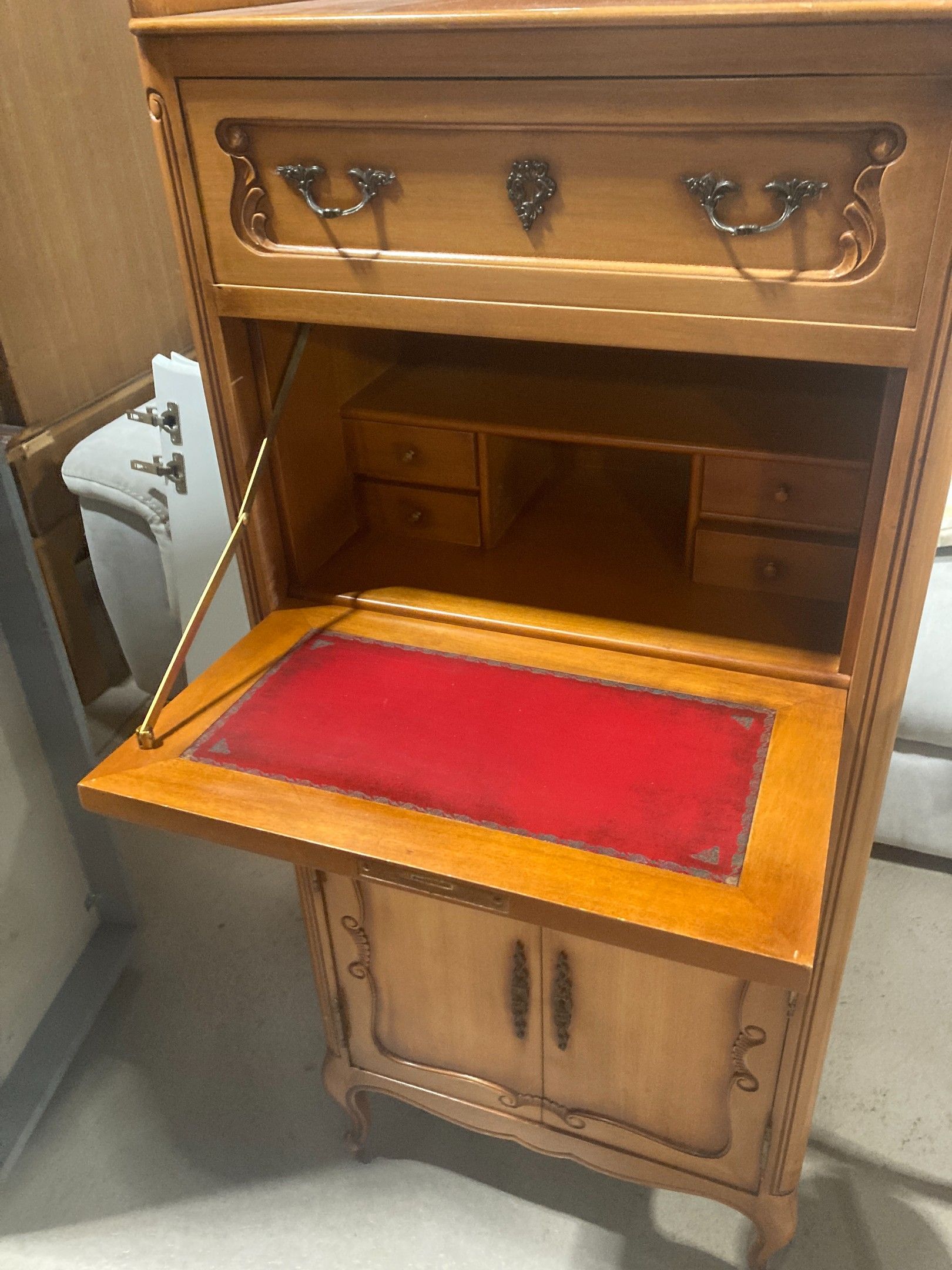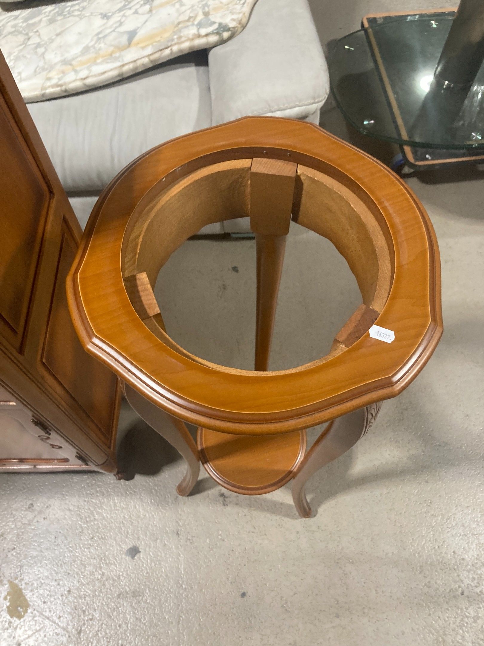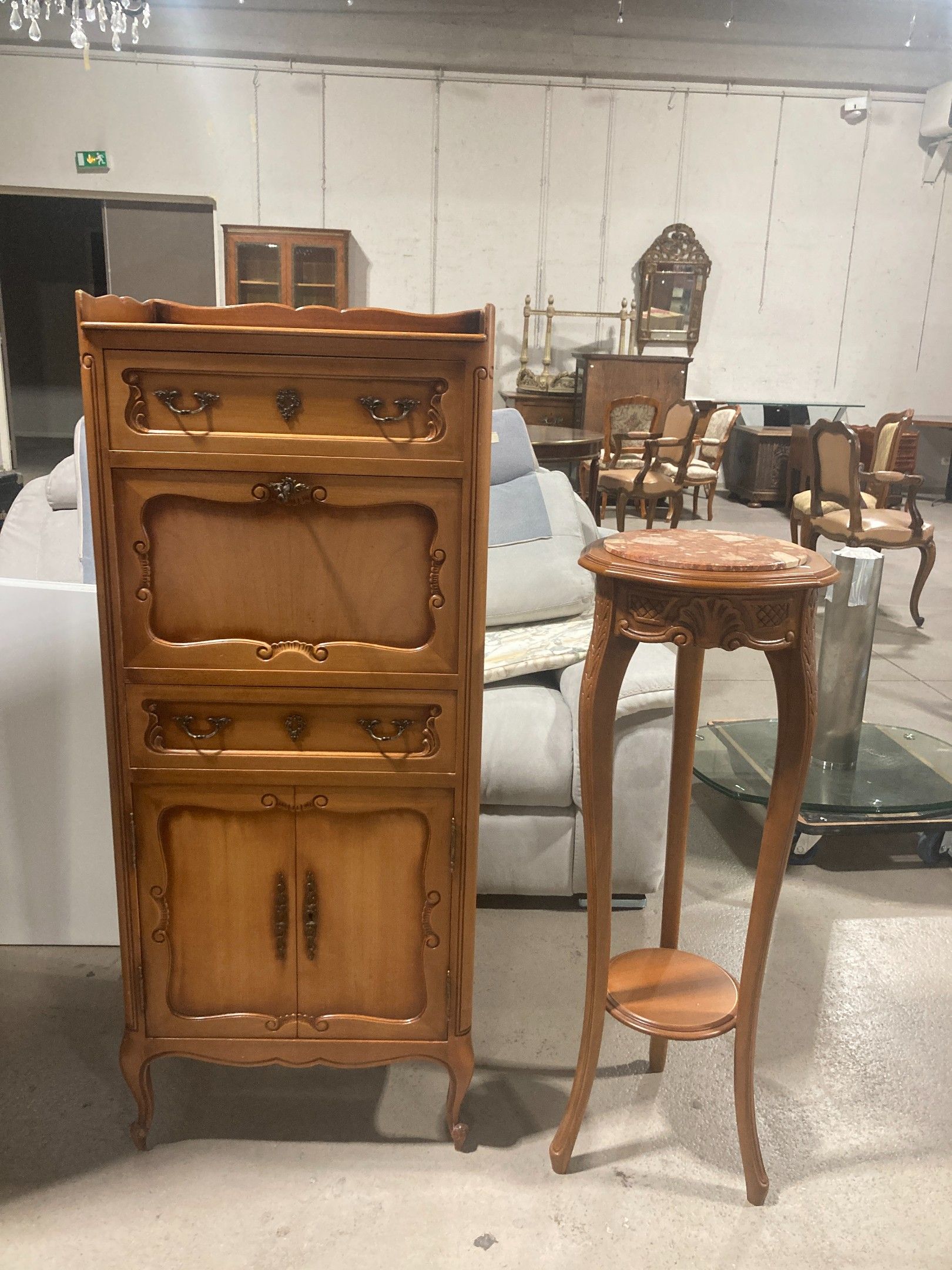 Small secretary with flap. 125 x 53 x 35 cm. Attached is a small circular marble top, height: 99 cm.