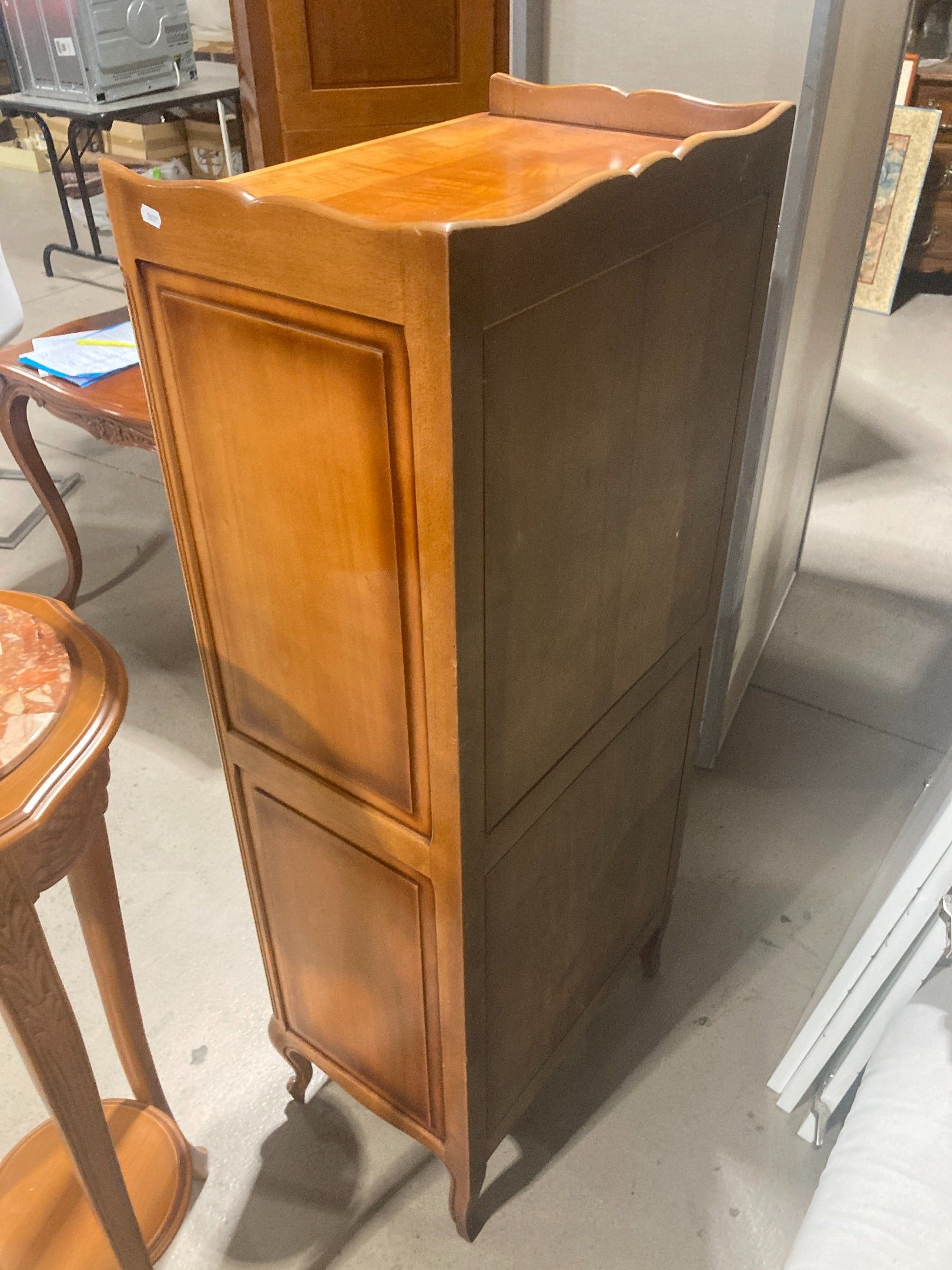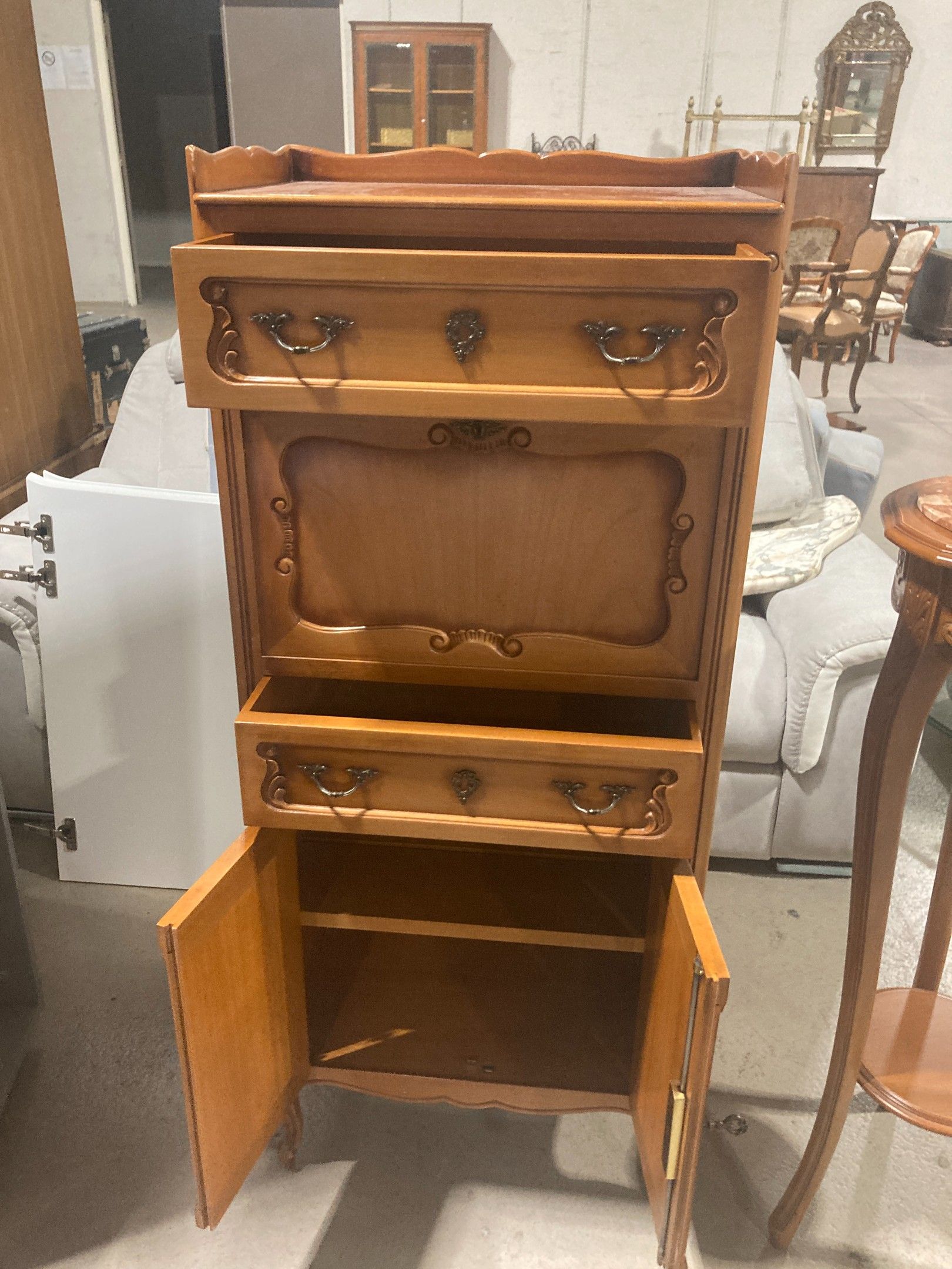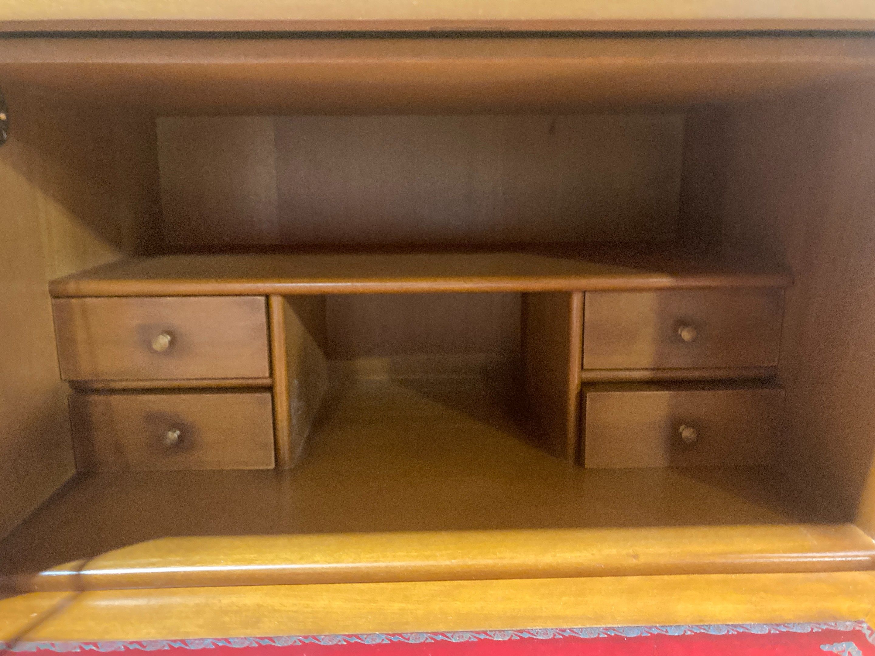 Small secretary with flap. 125 x 53 x 35 cm. Attached is a small circular marble top, height: 99 cm.