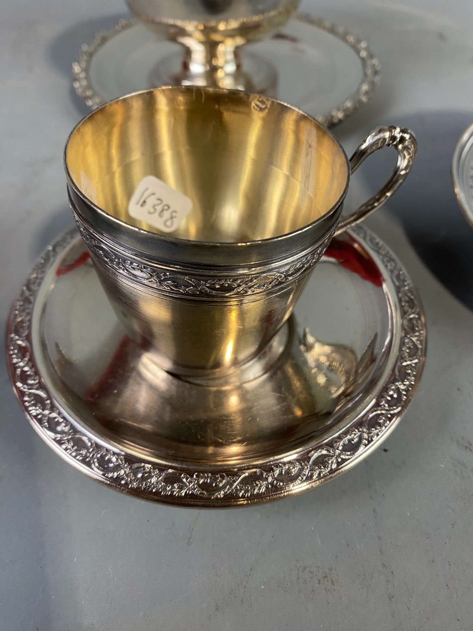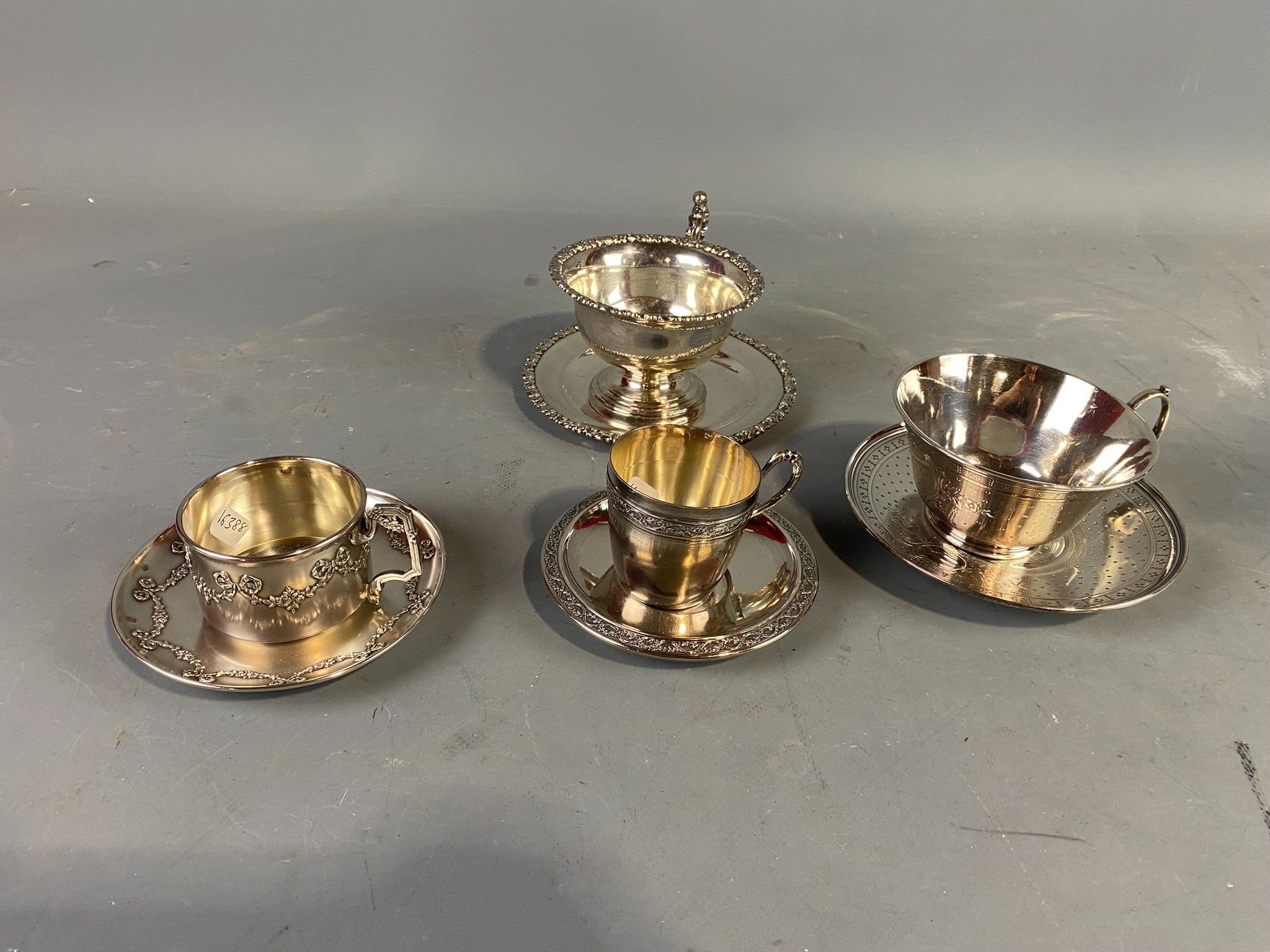 Set of four silver cups and saucers (Minerve hallmark) 19th and early 20th centuries: two for coffee and two for tea. 692 gr net