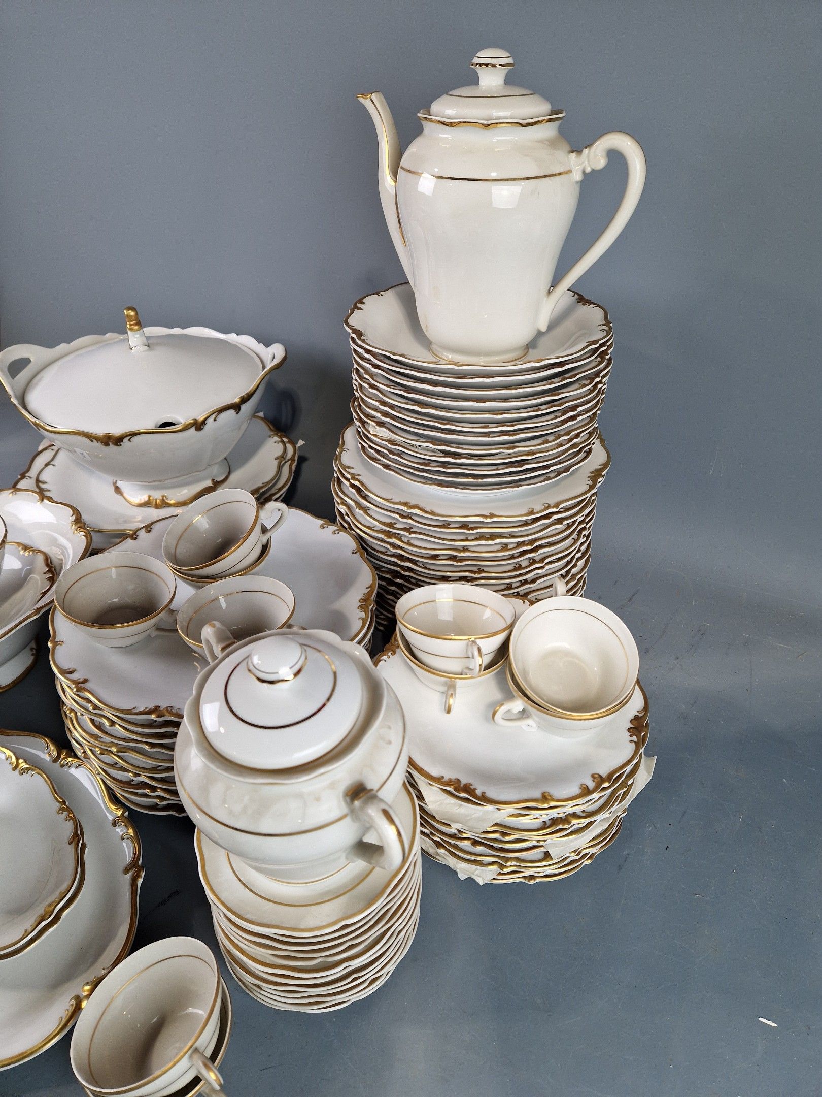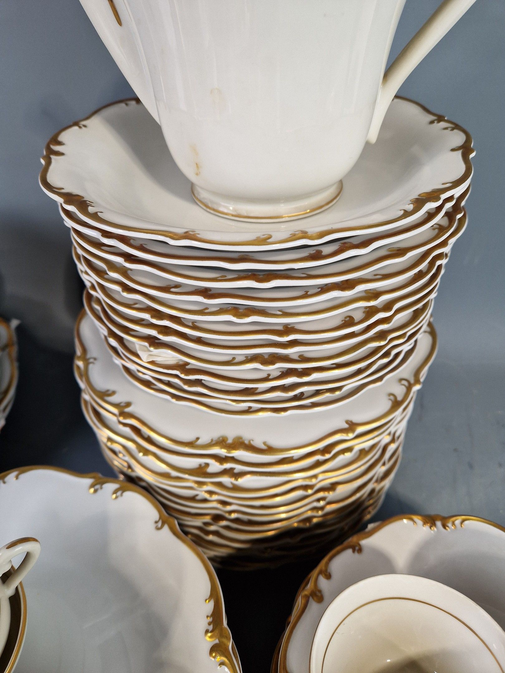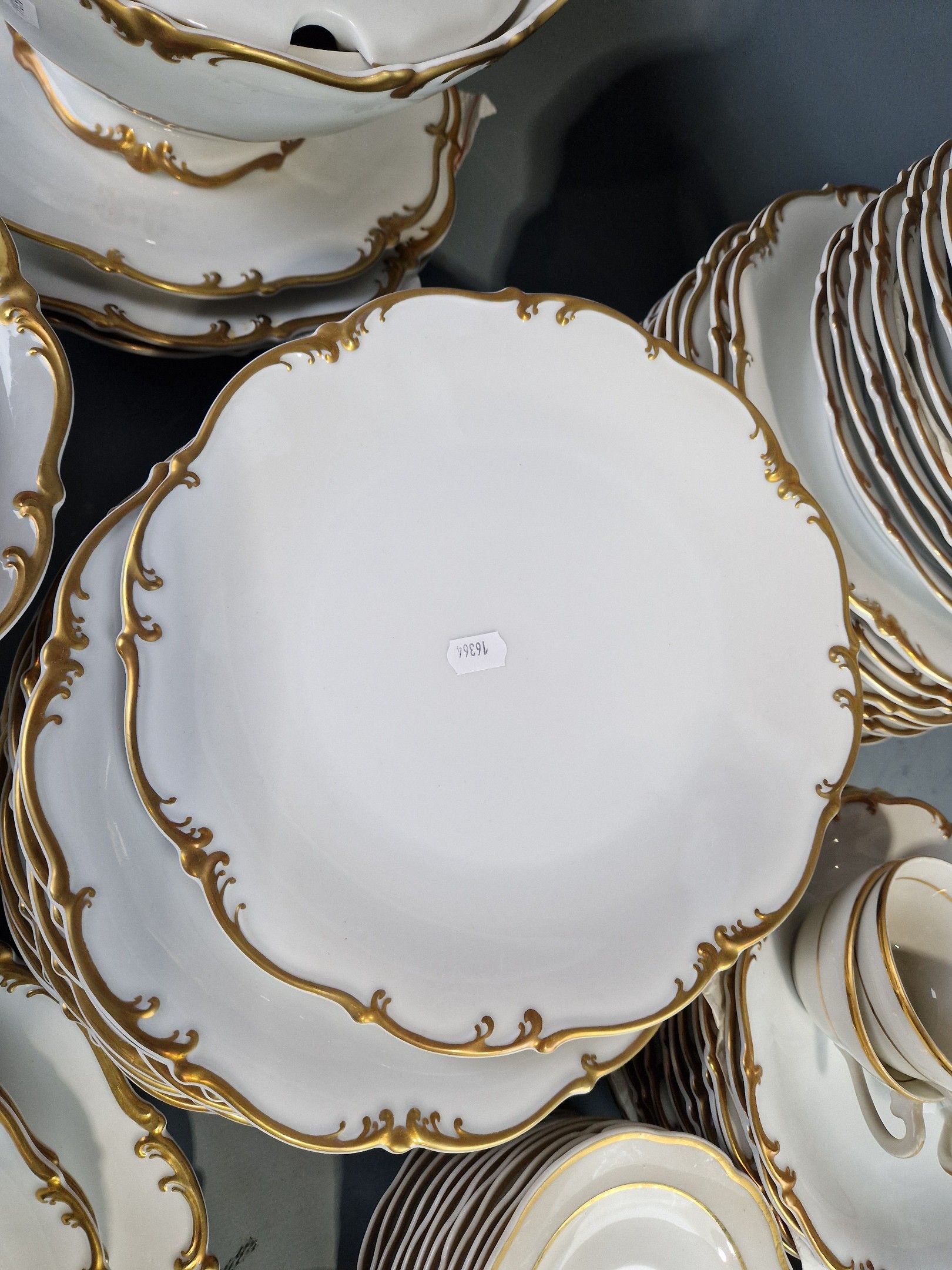 German porcelain dinner service with scalloped edge. Elegant white pattern with a simple gold border. It includes twenty-four dinner plates, twelve soup plates, twelve dessert plates, a covered tureen, a sauceboat, a salad bowl, two ravioli dishes and four serving dishes (three round and one oval). Attached is a Limoges porcelain coffee set of a similar design, comprising twelve cups and saucers, a coffee pot, a milk jug and a covered sugar bowl. Good condition