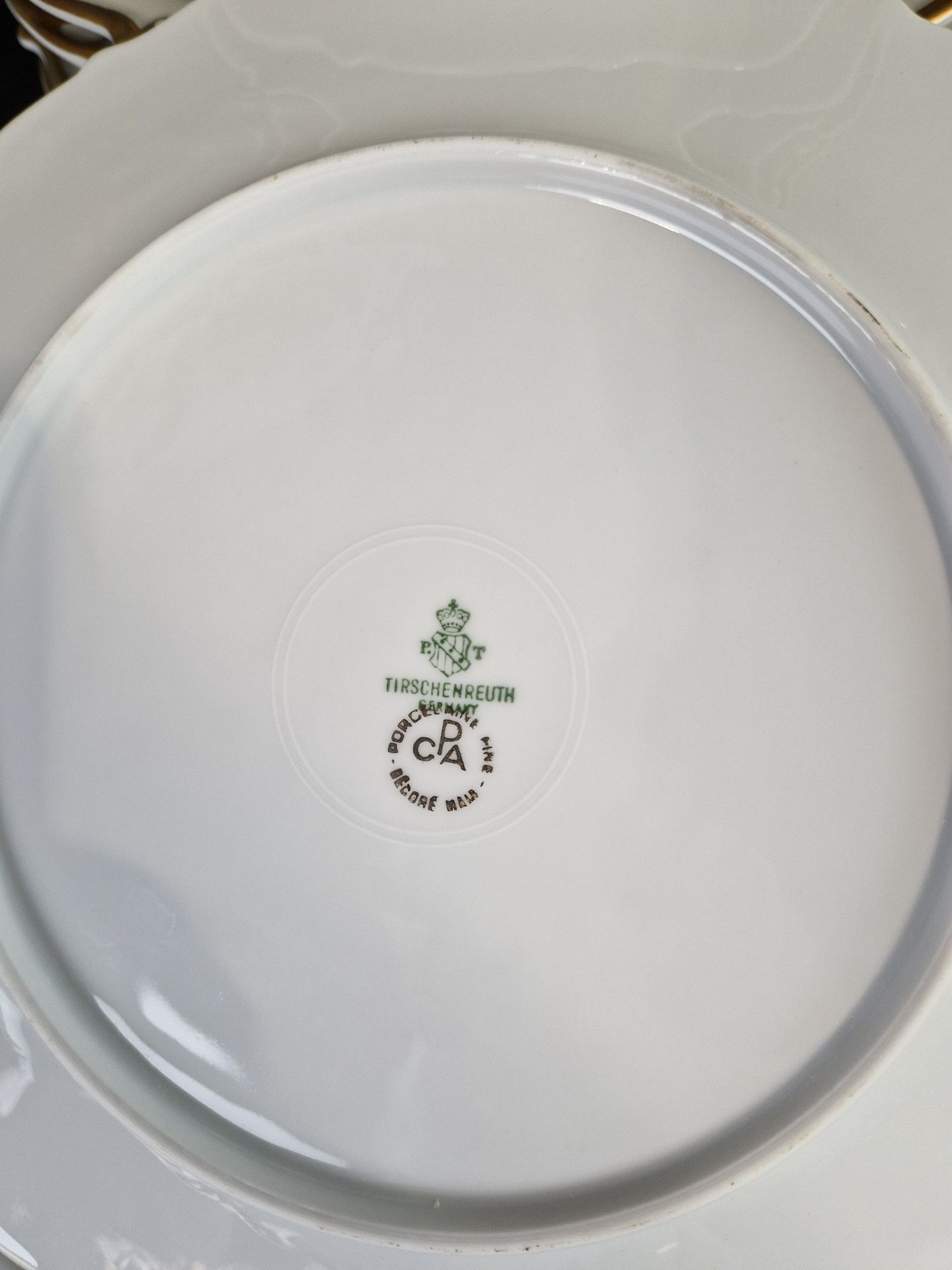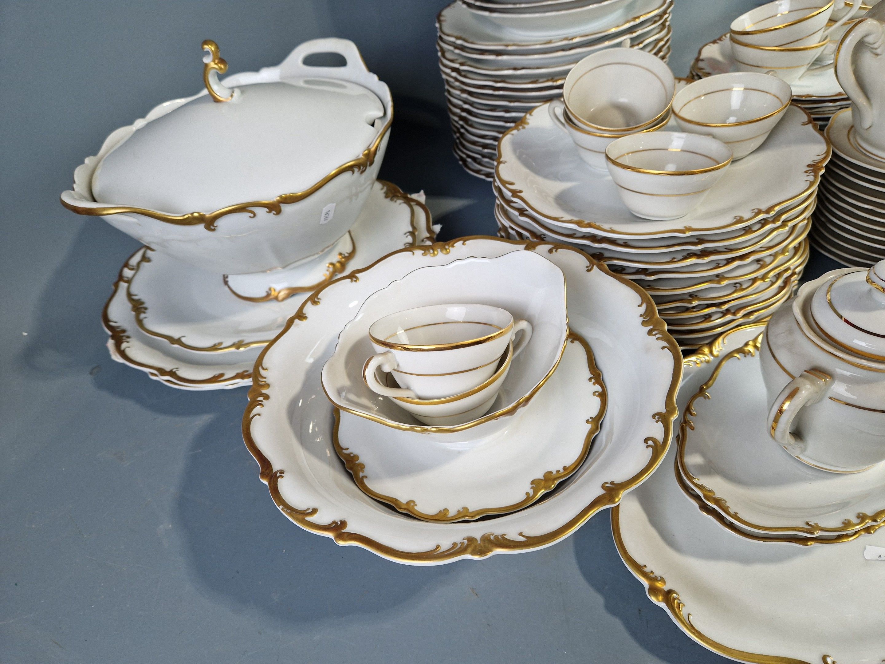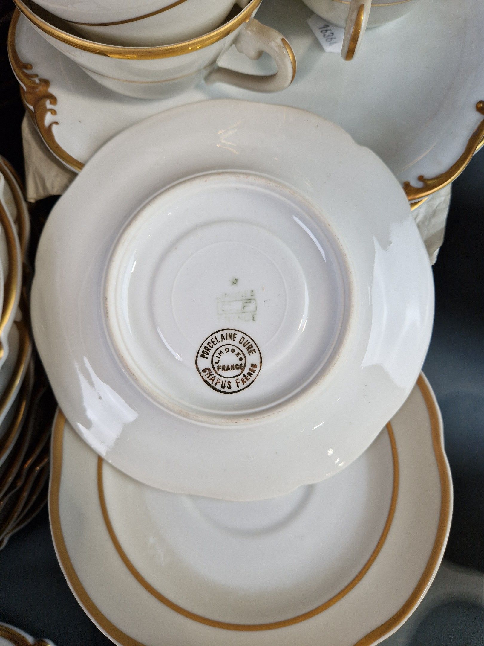 German porcelain dinner service with scalloped edge. Elegant white pattern with a simple gold border. It includes twenty-four dinner plates, twelve soup plates, twelve dessert plates, a covered tureen, a sauceboat, a salad bowl, two ravioli dishes and four serving dishes (three round and one oval). Attached is a Limoges porcelain coffee set of a similar design, comprising twelve cups and saucers, a coffee pot, a milk jug and a covered sugar bowl. Good condition