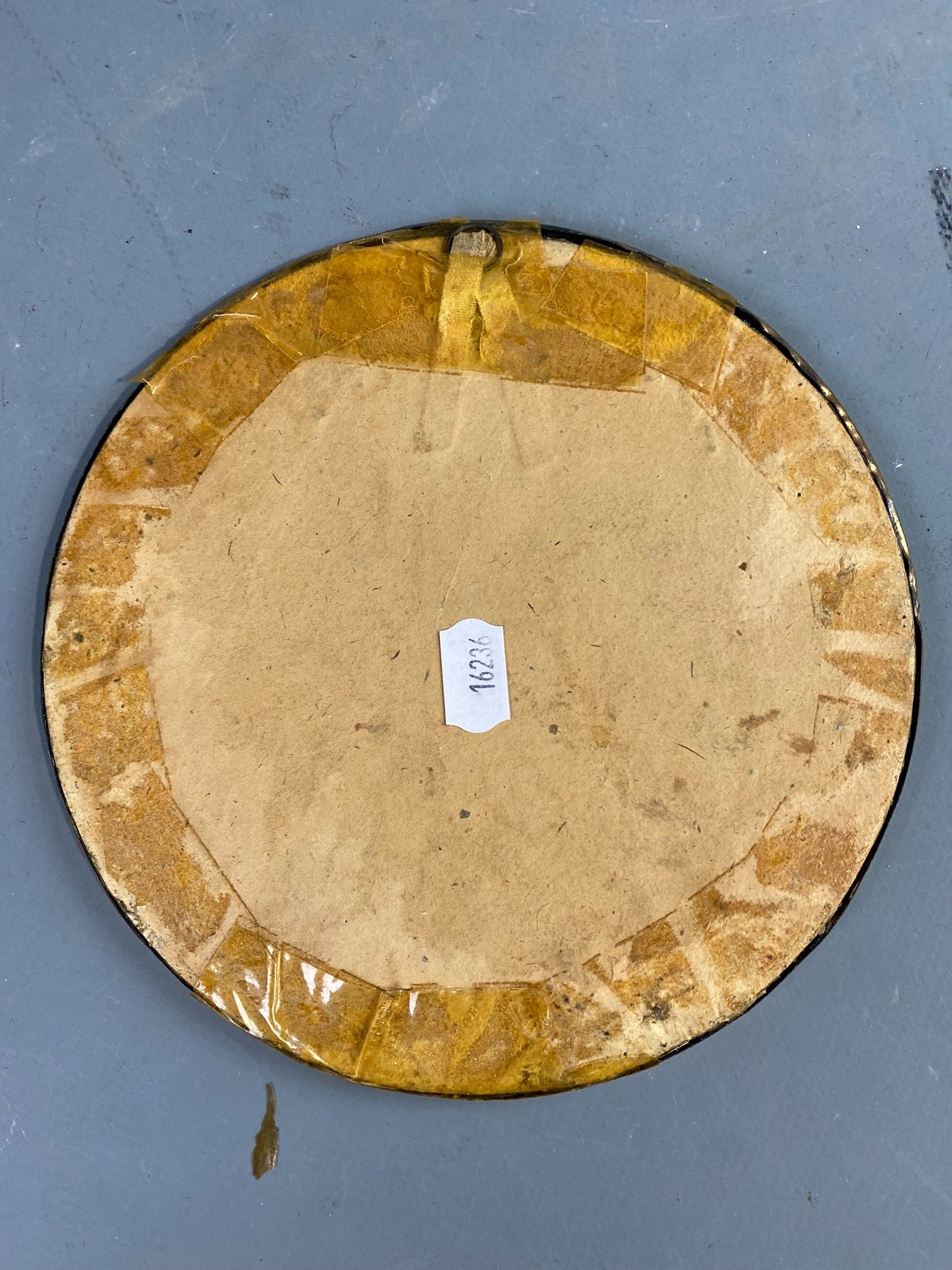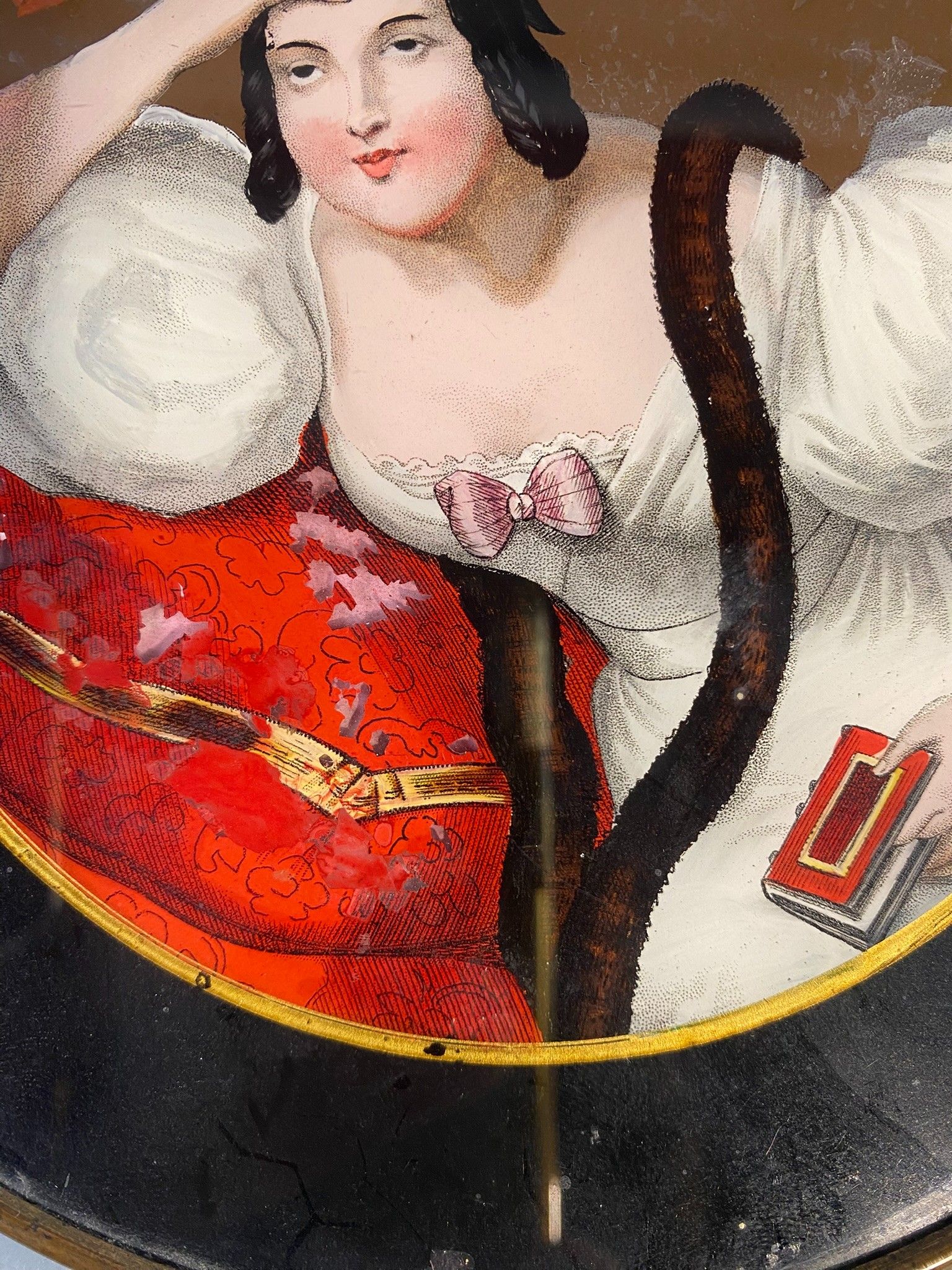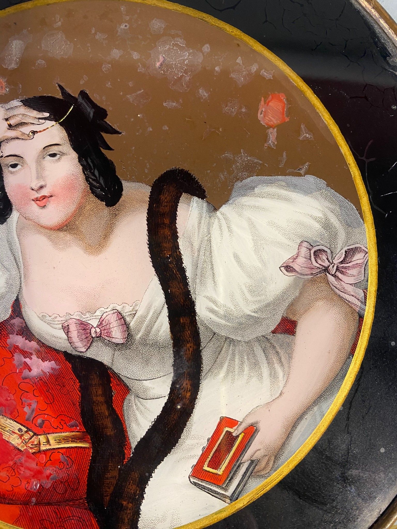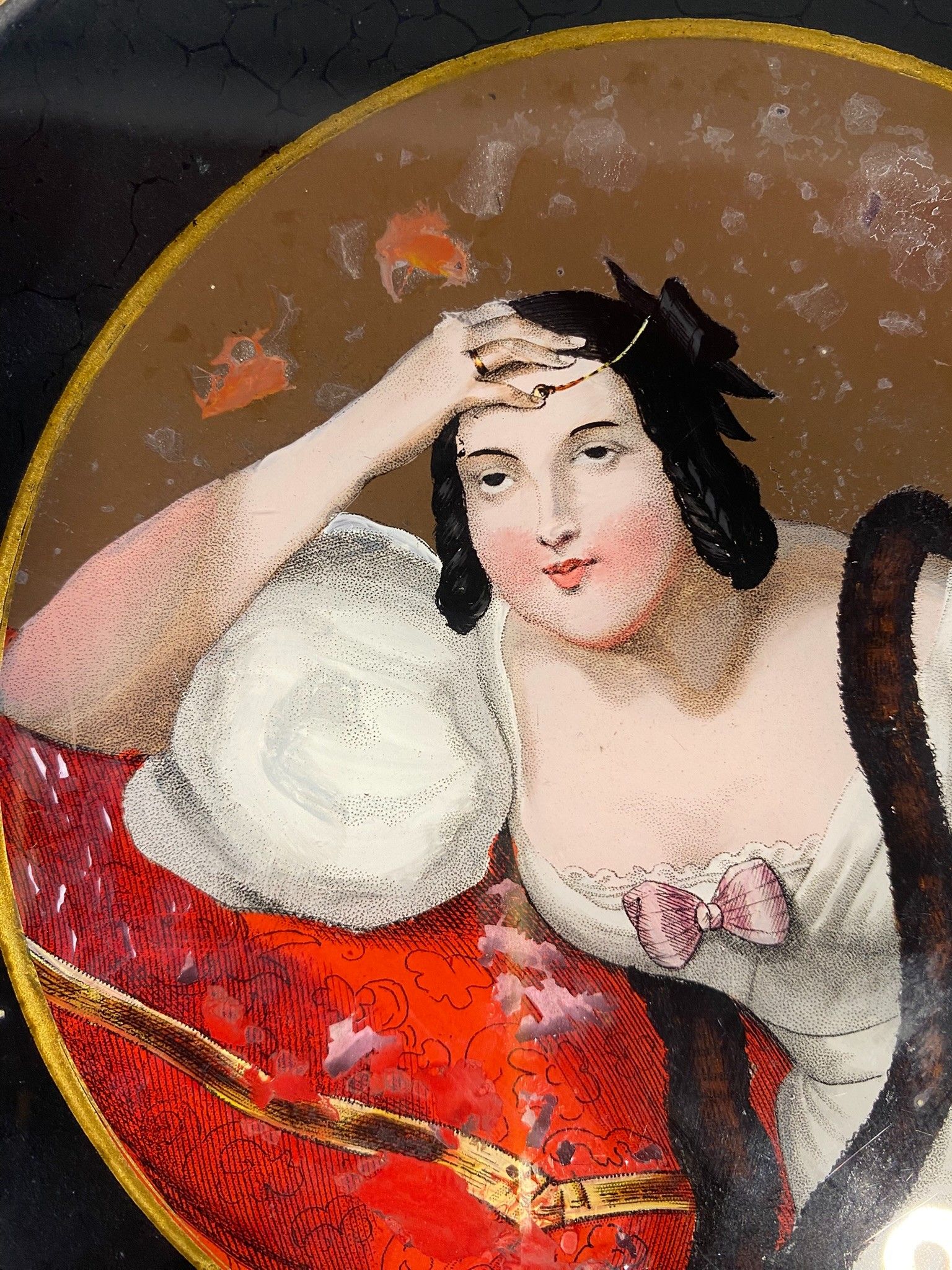 Romantic period glass mount portrait of a young elegant woman on a sofa. Diameter: 16.5 cm. Some delamination