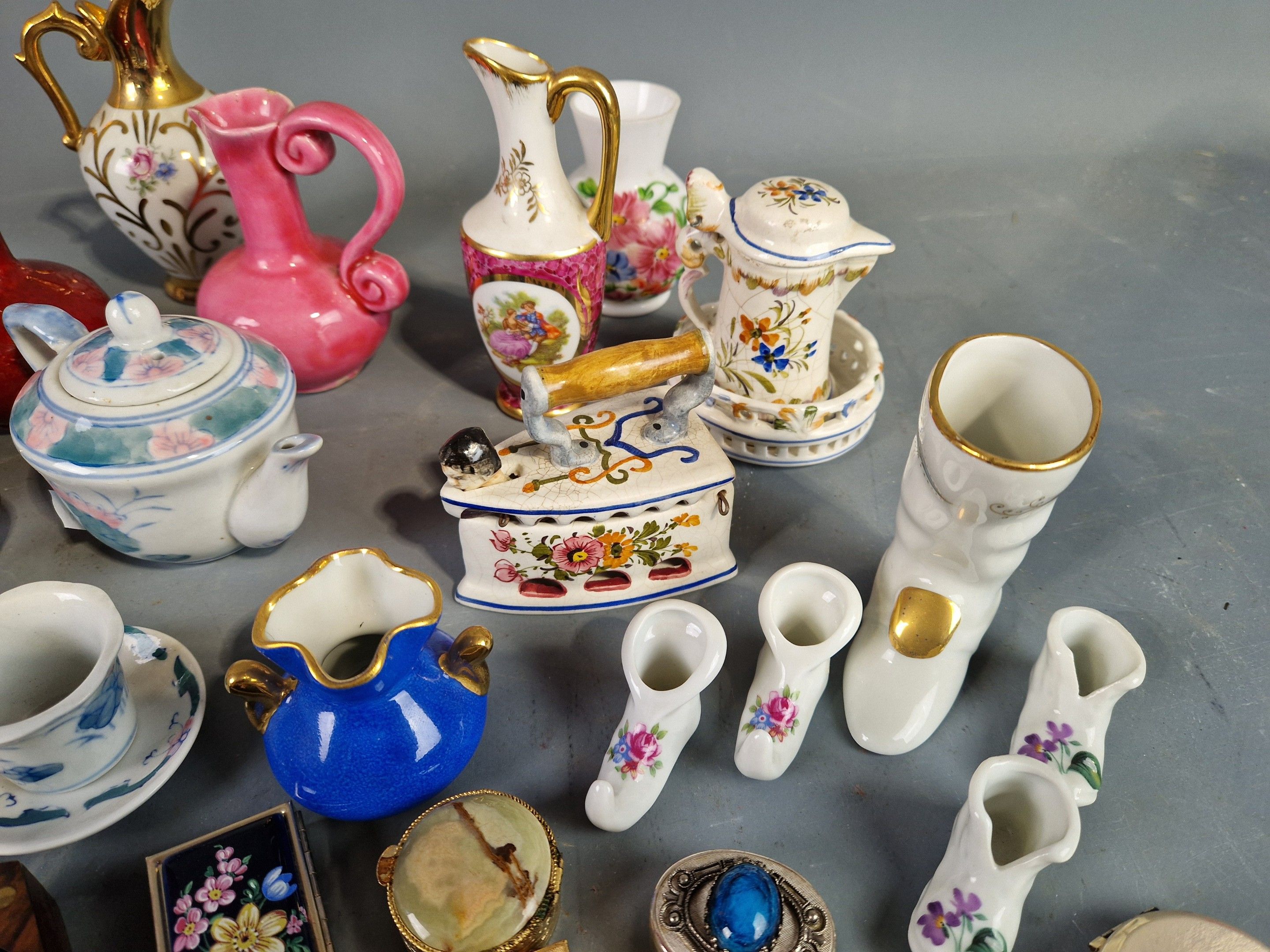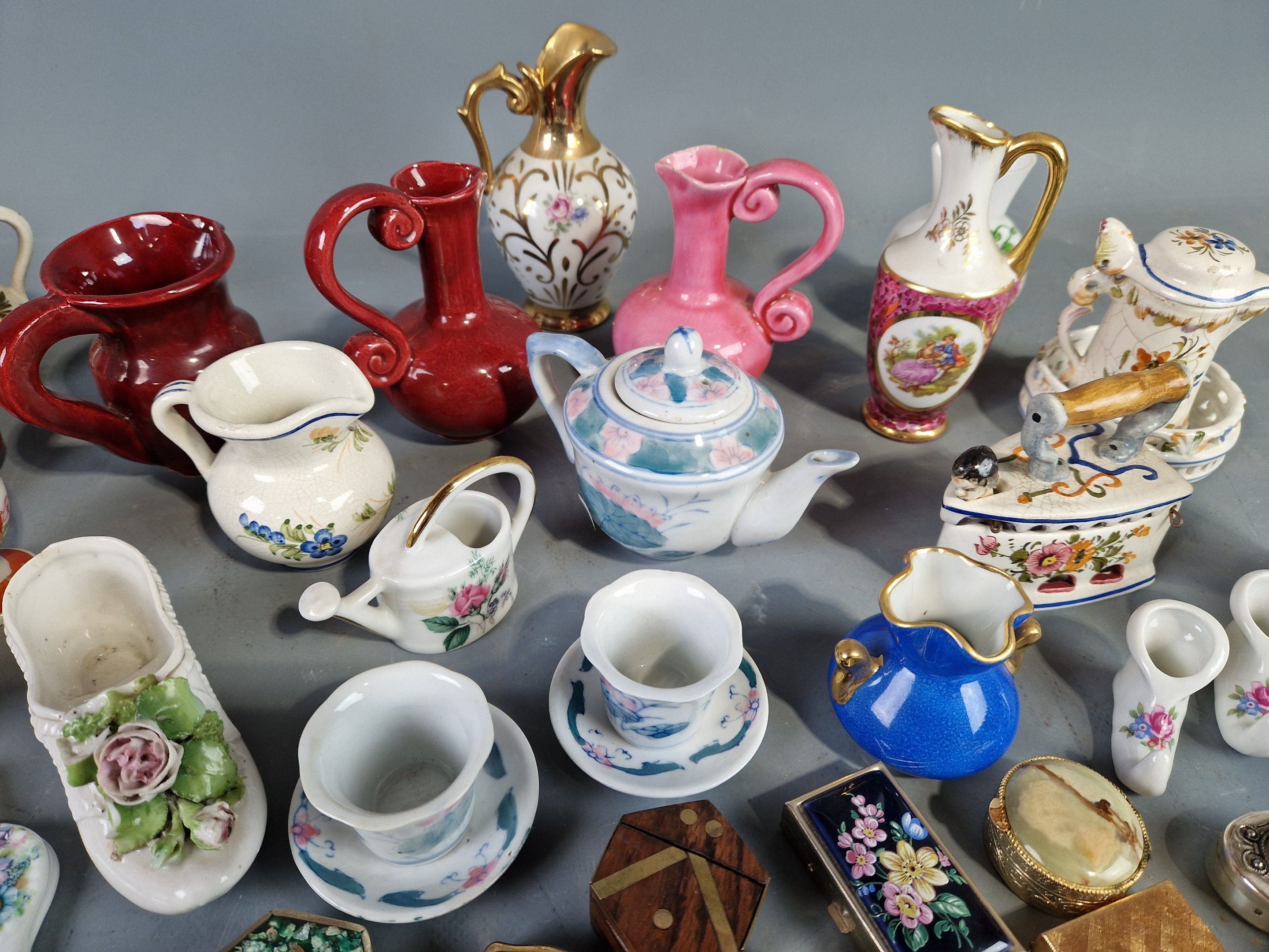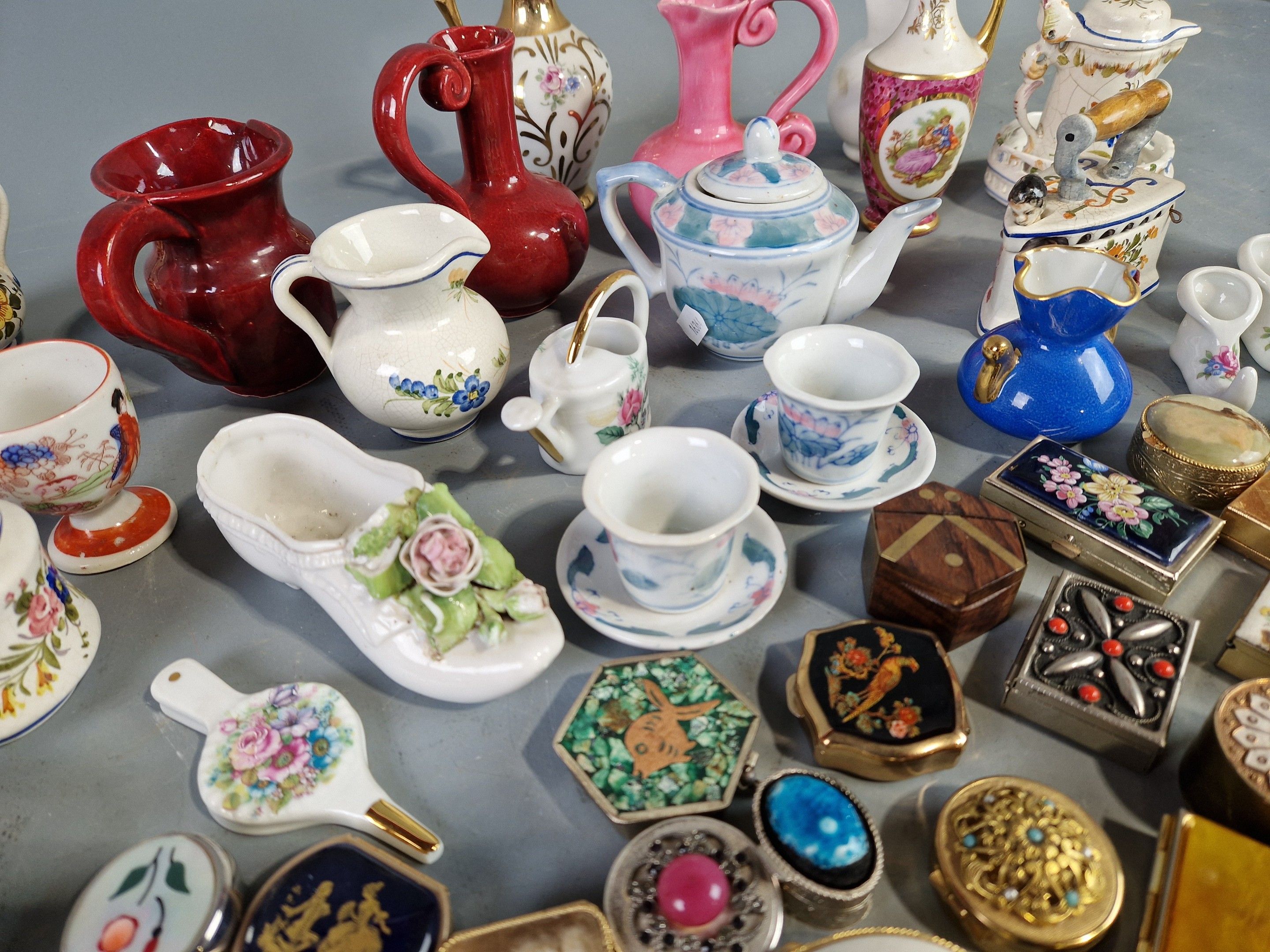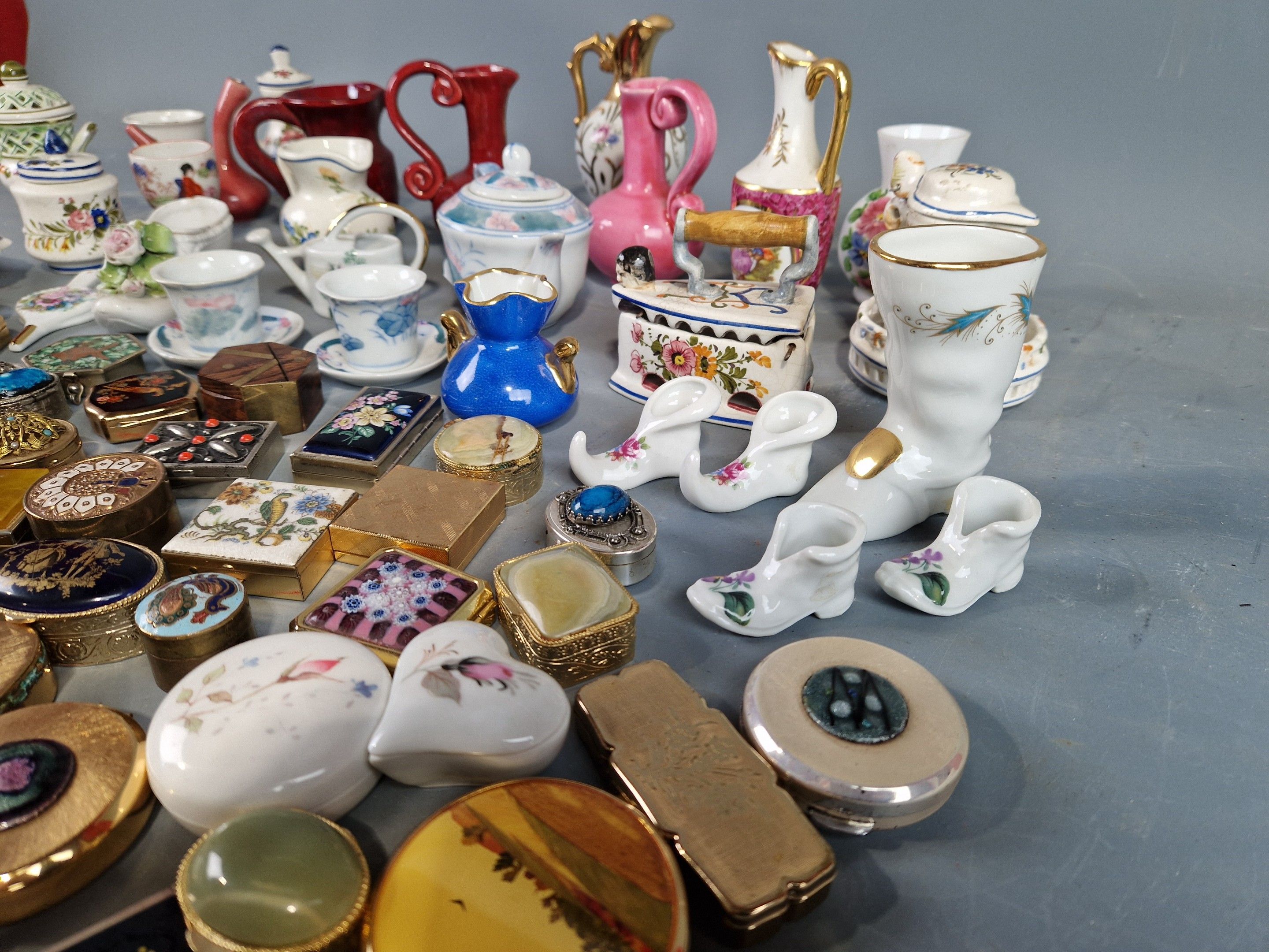 An attractive collection of modern pill boxes. It includes about fifty items. There is also a small batch of miniature porcelain or earthenware vases (some in the shape of shoes, a watering can, miniature jugs, egg cups, butter dishes, covered pots and irons).