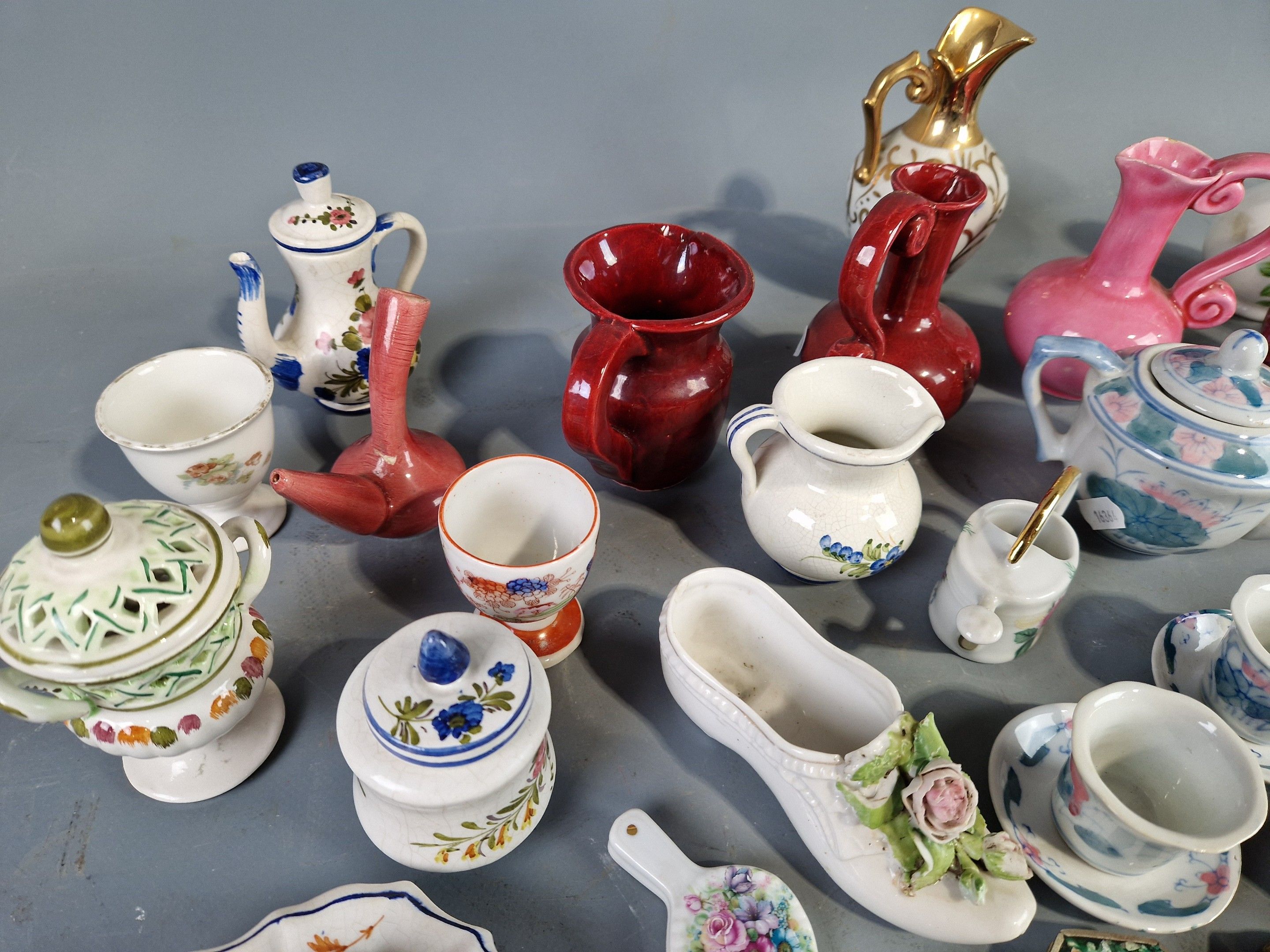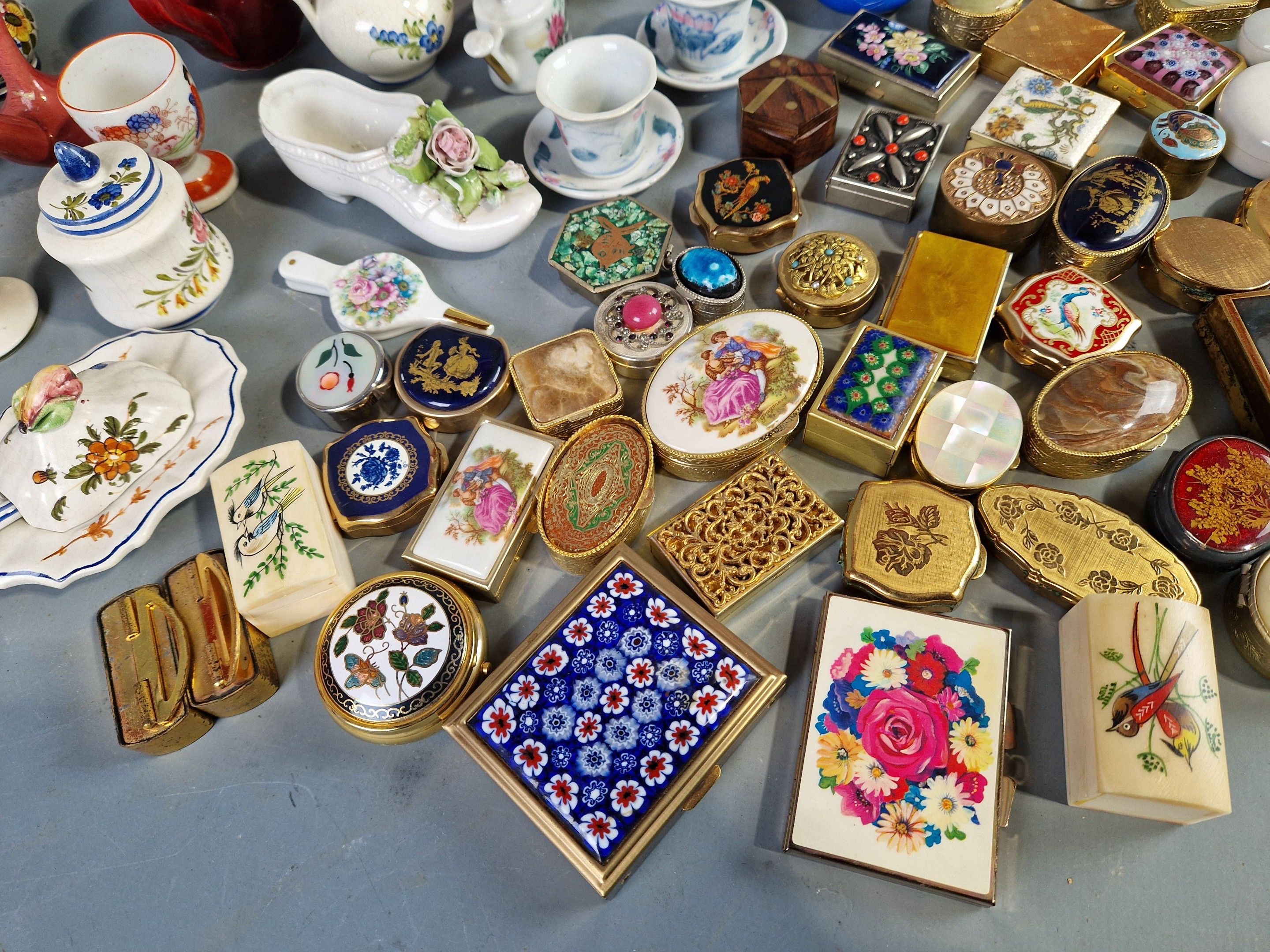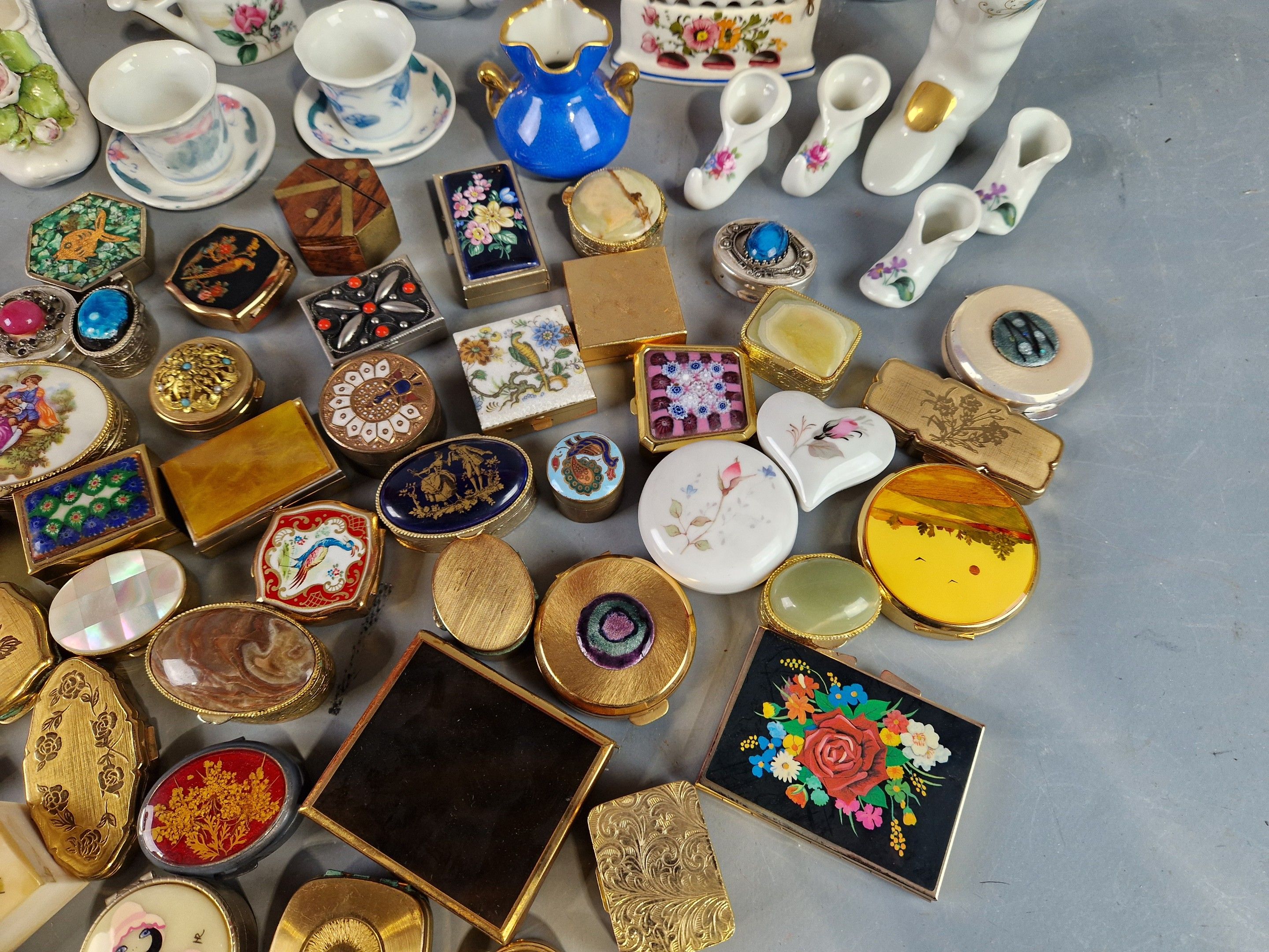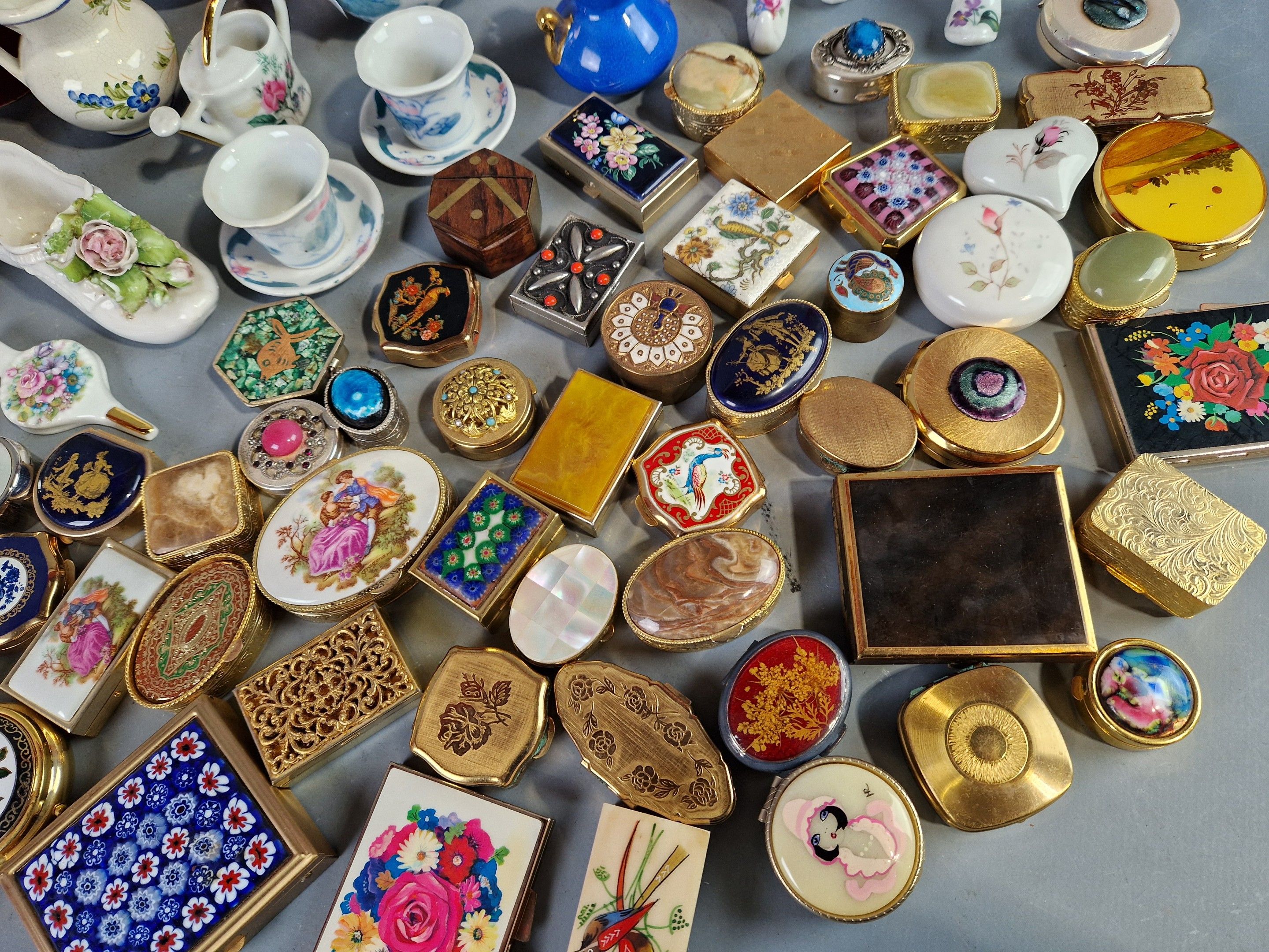 An attractive collection of modern pill boxes. It includes about fifty items. There is also a small batch of miniature porcelain or earthenware vases (some in the shape of shoes, a watering can, miniature jugs, egg cups, butter dishes, covered pots and irons).