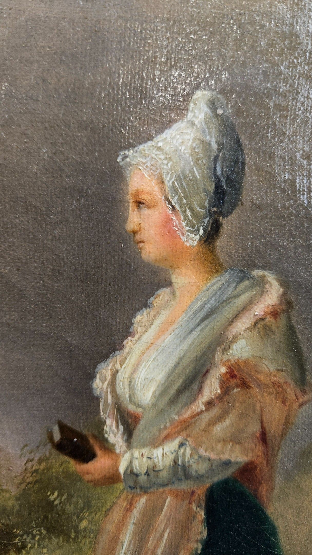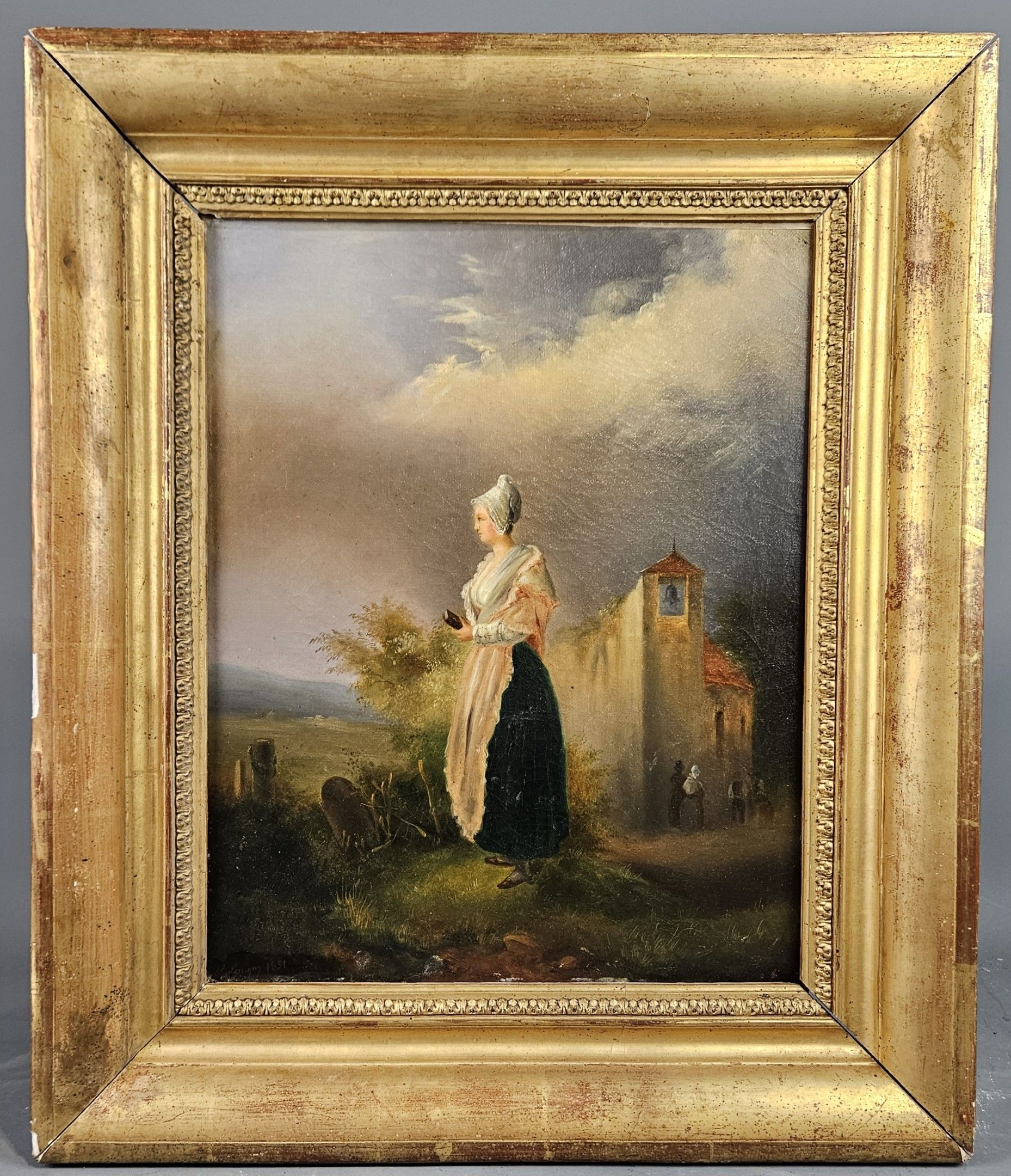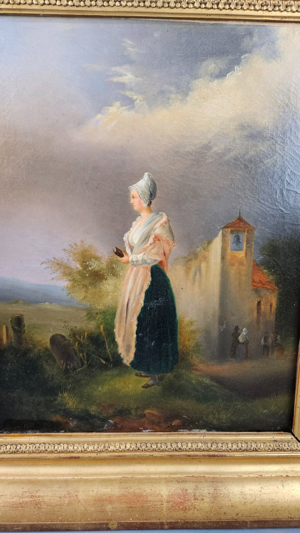 Mid-nineteenth century school: "Young woman with a missal leaving a country church". Oil on canvas (canvas-backed), 41 x 33 cm, SBG and dated 1851