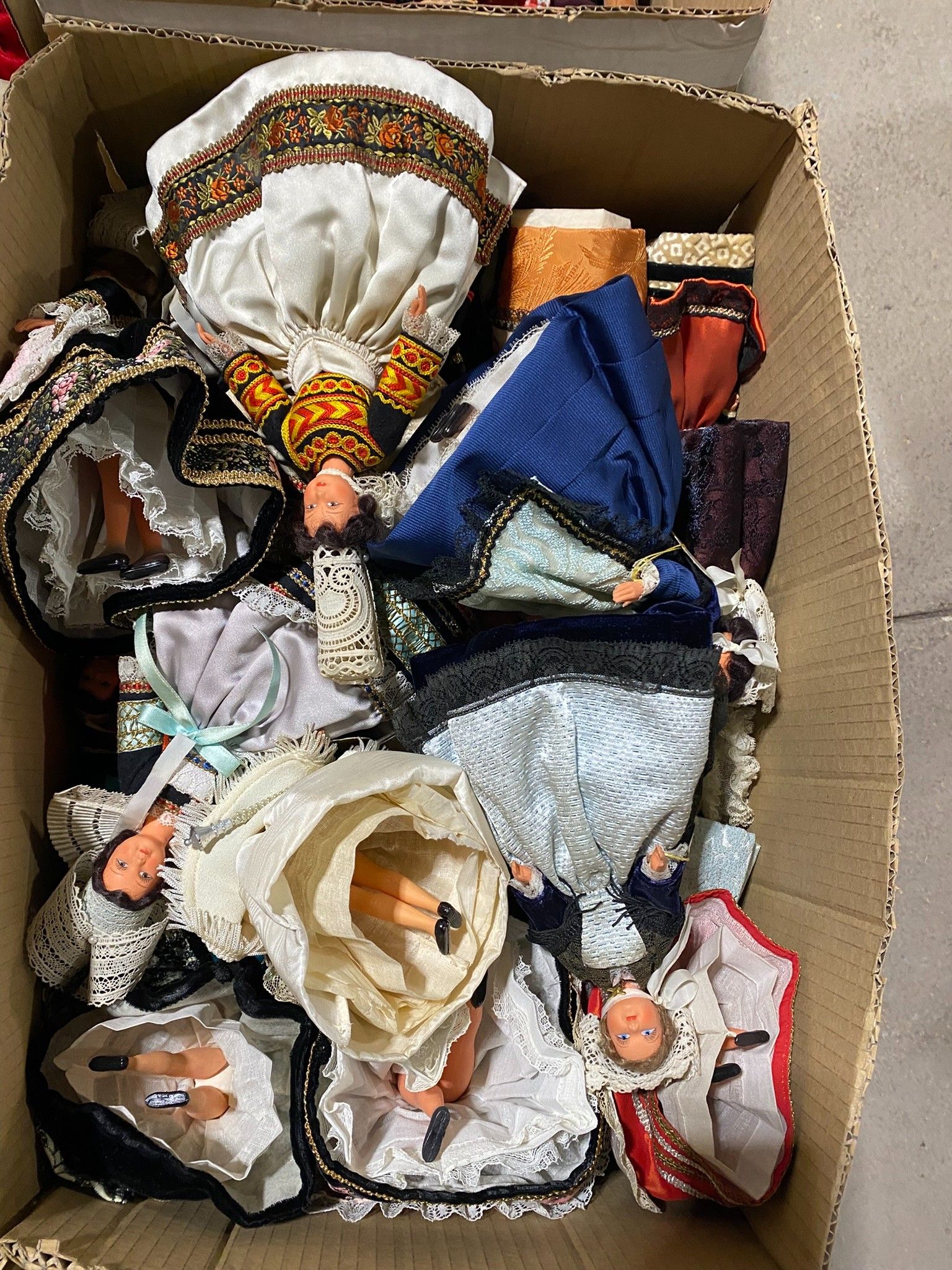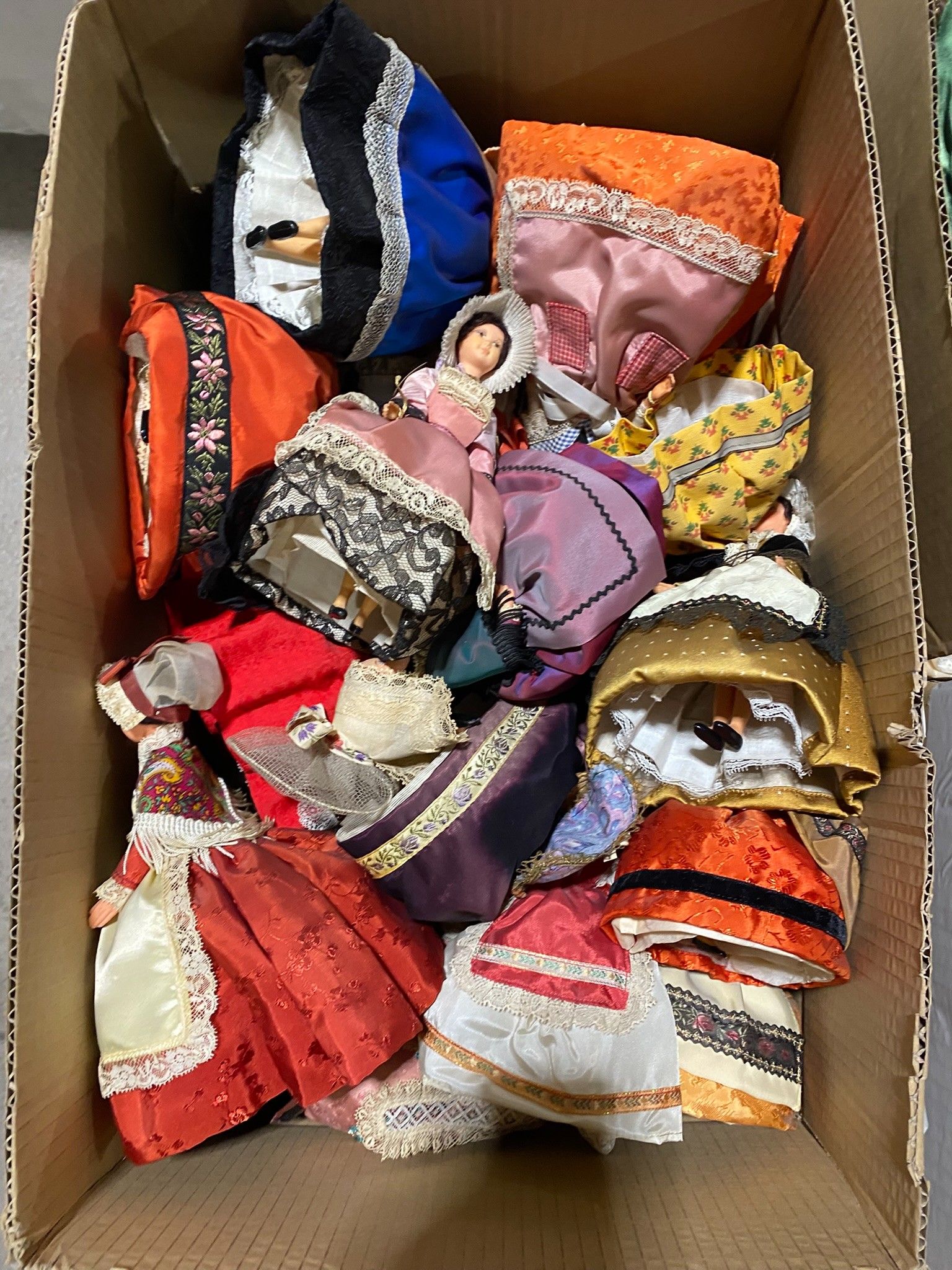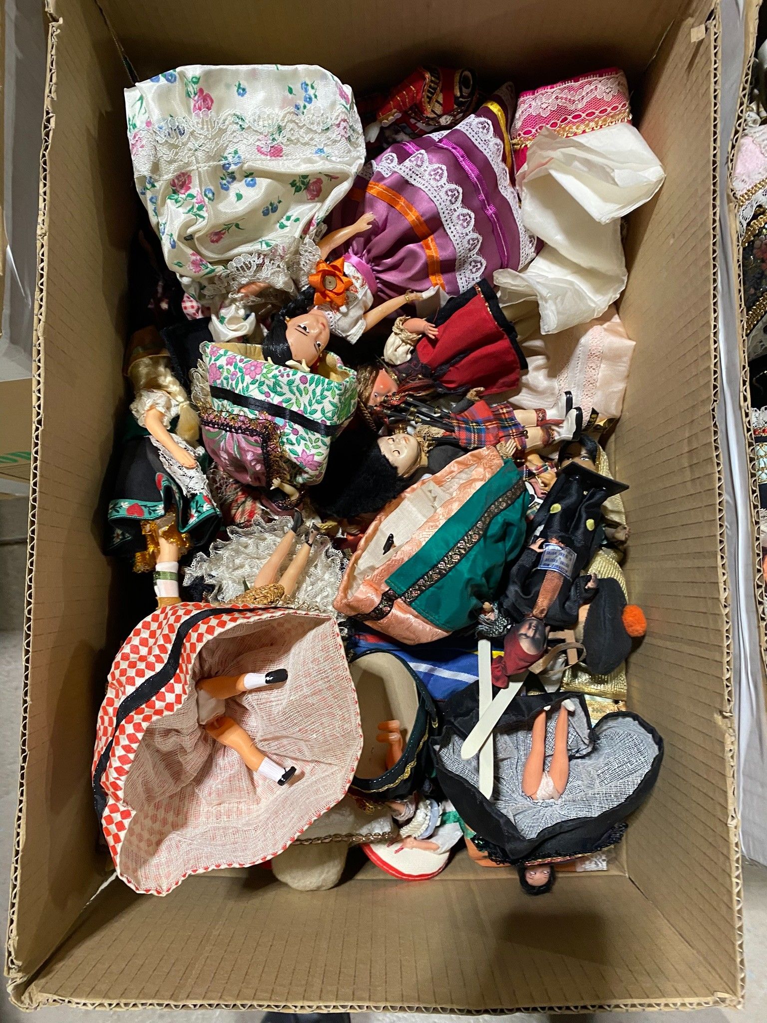 Numerous souvenir dolls from travels in traditional regional dress. Large collection contained in five boxes