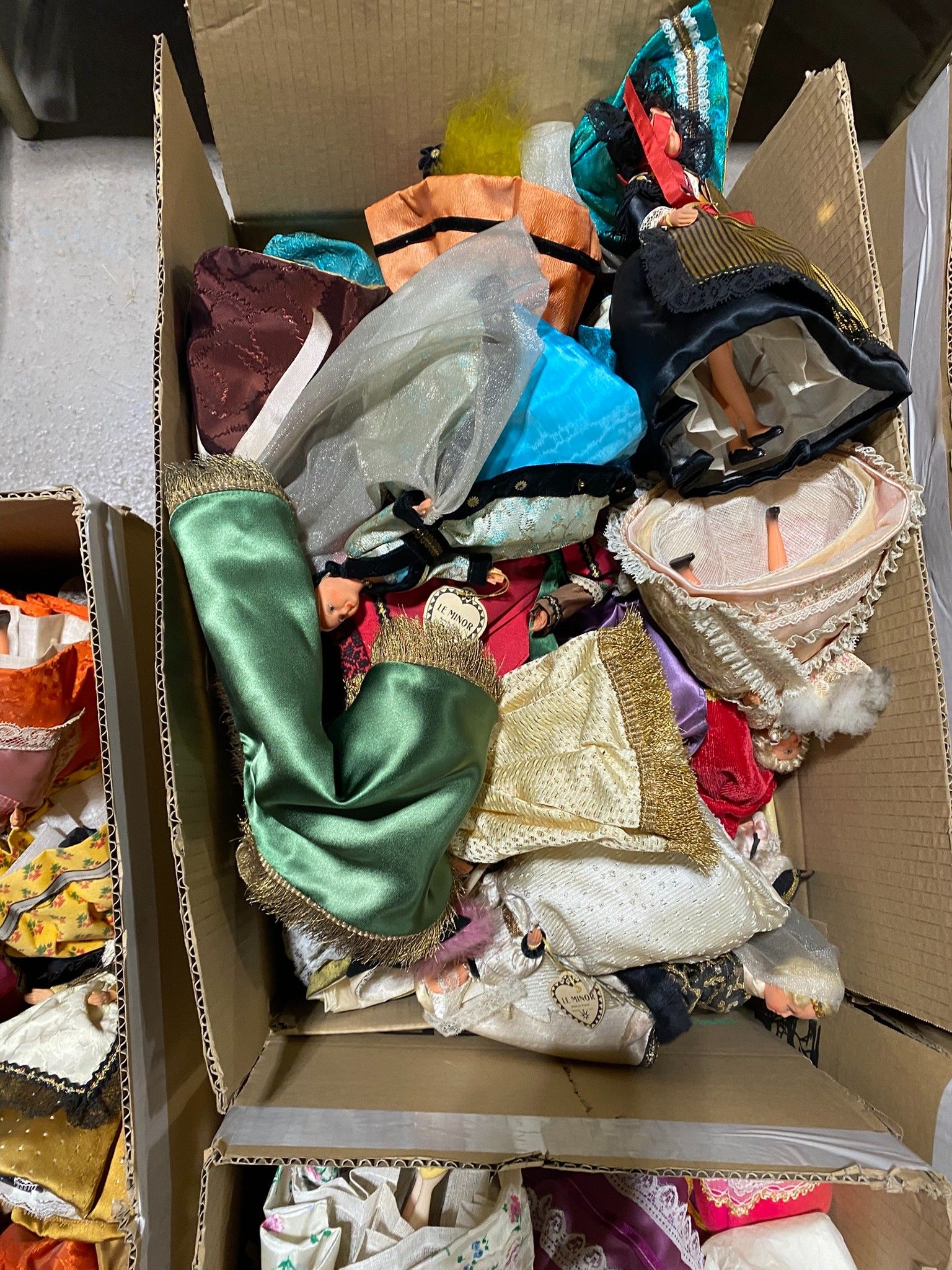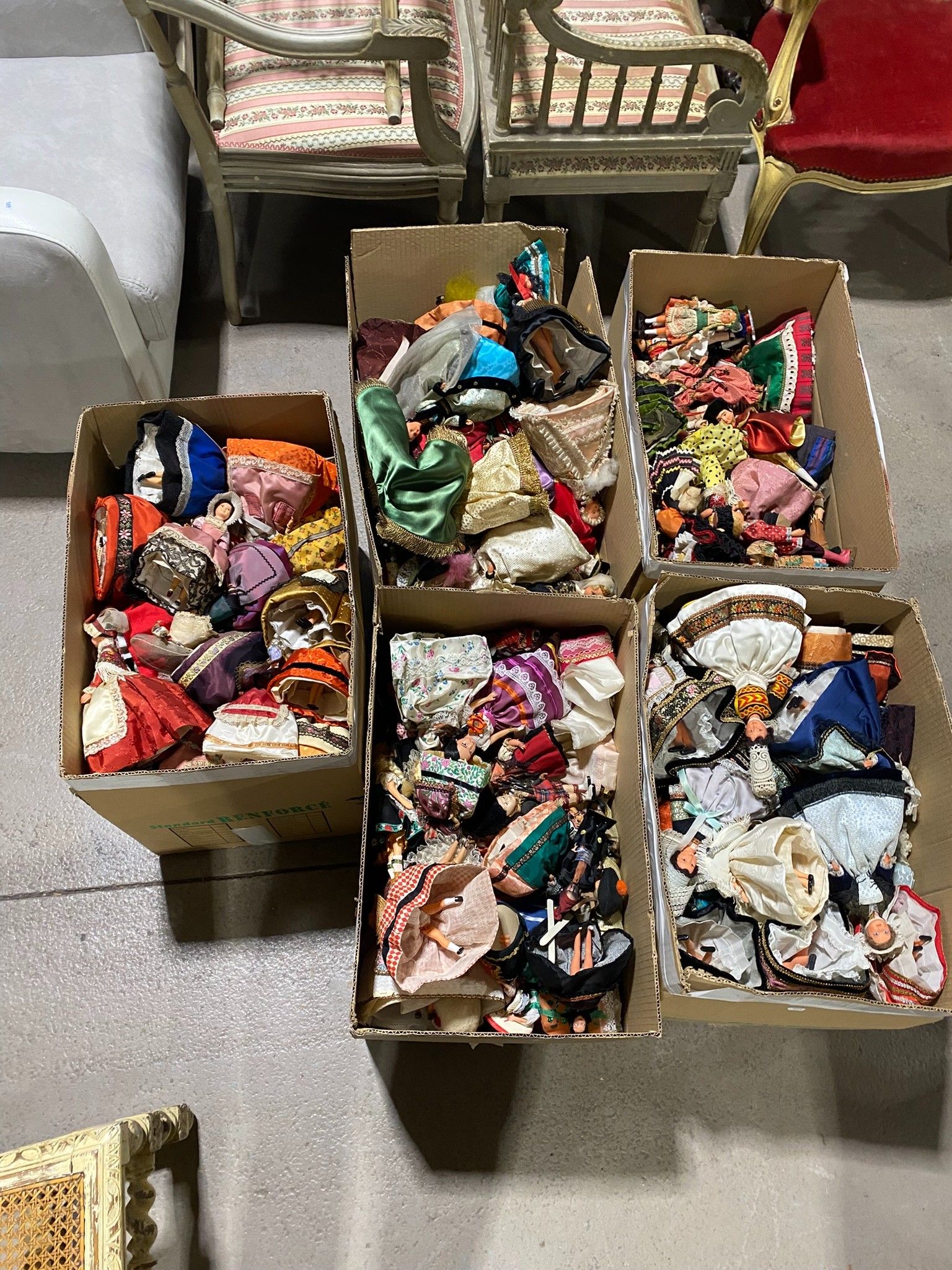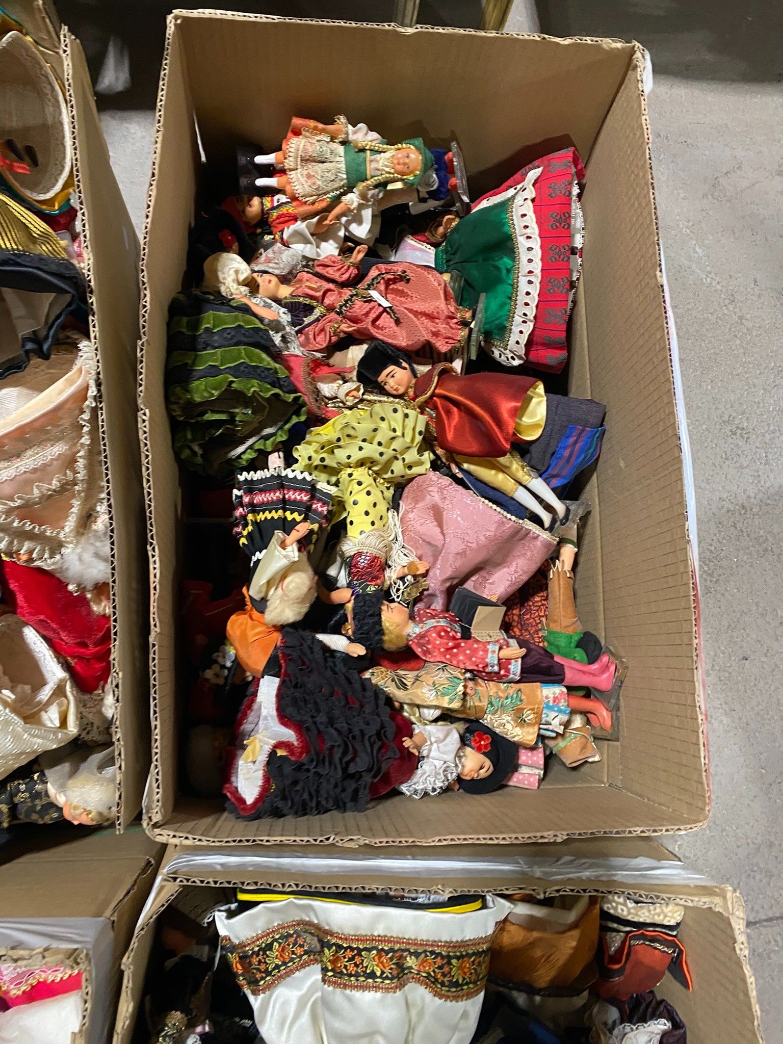 Numerous souvenir dolls from travels in traditional regional dress. Large collection contained in five boxes
