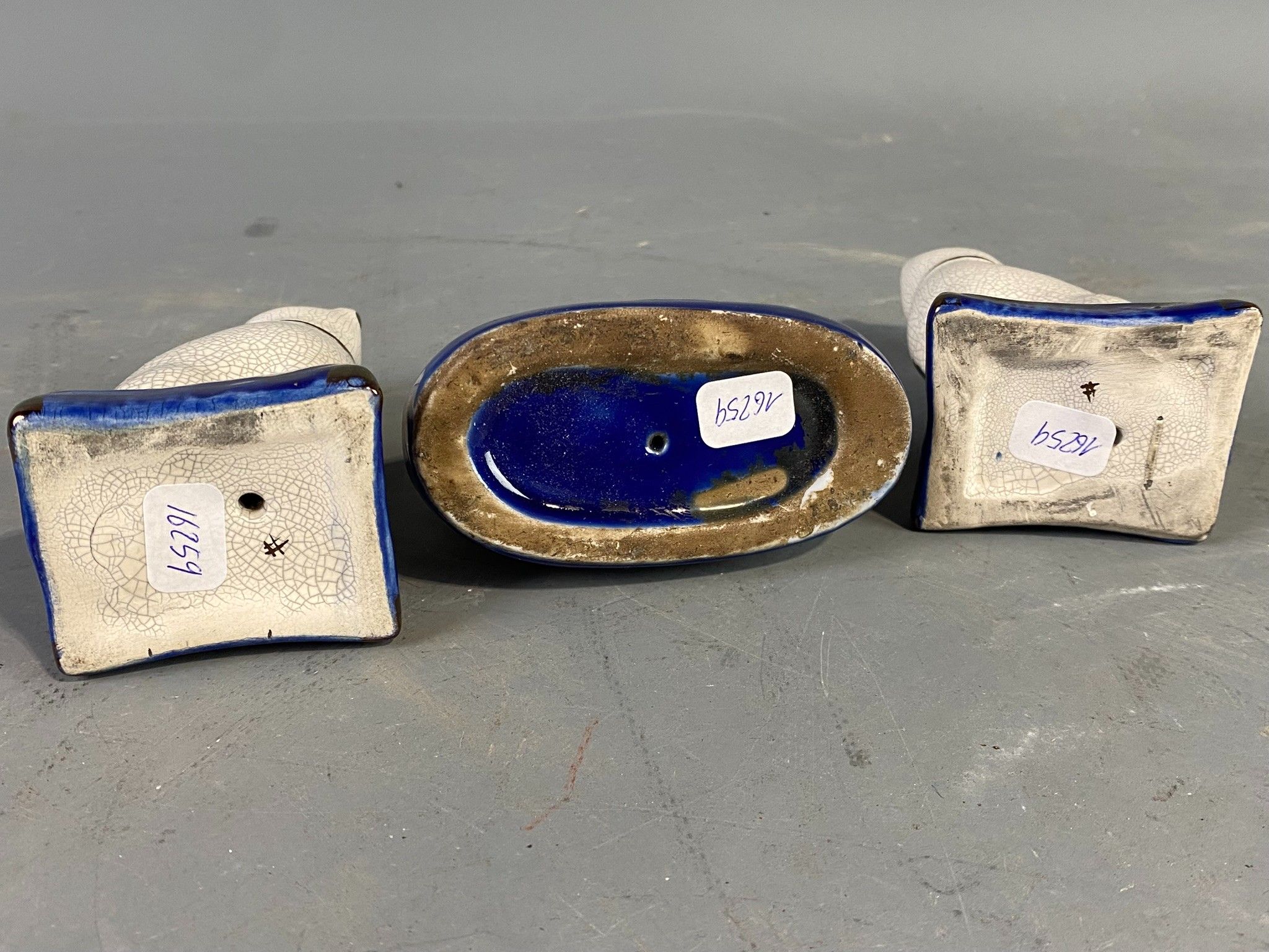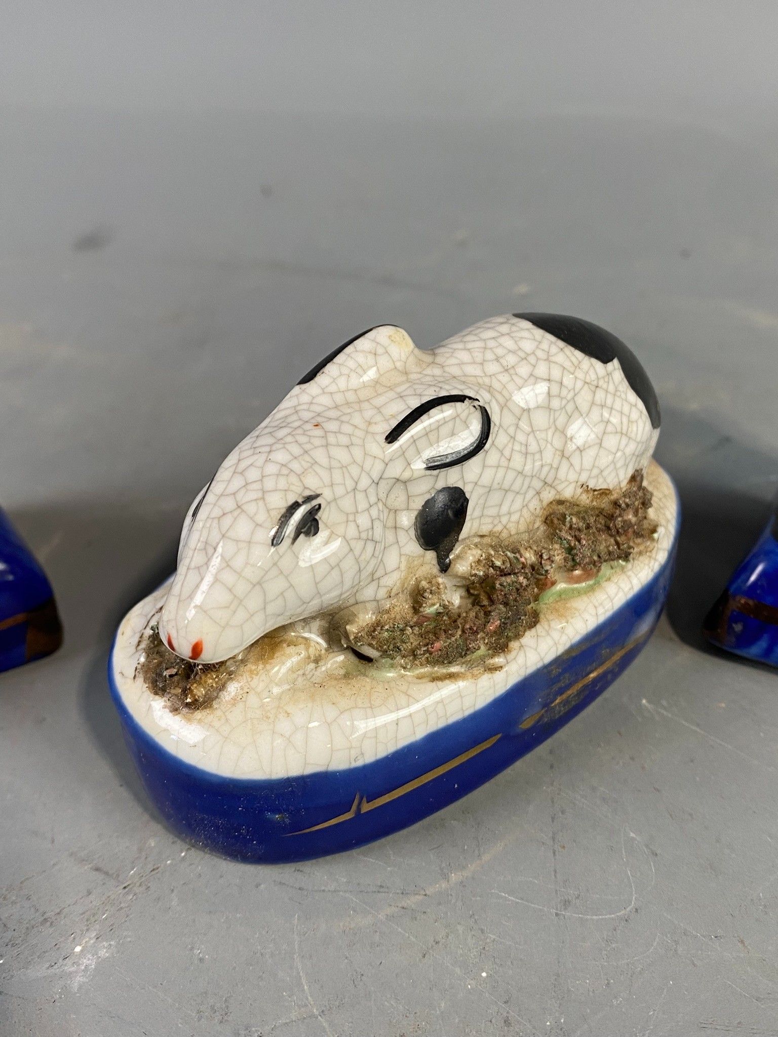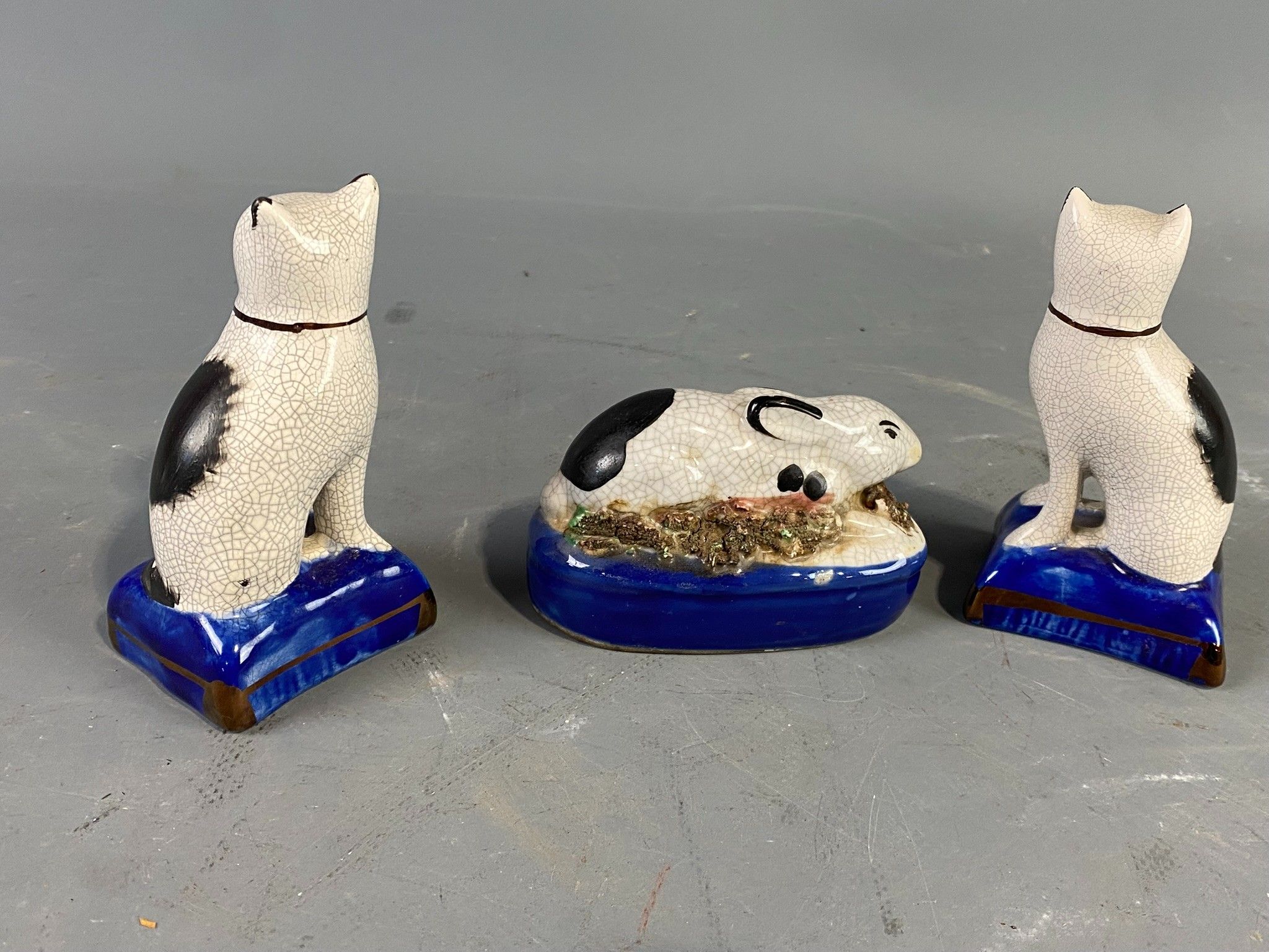 Pair of Staffordshire porcelain cats (Height: 10 cm). A rabbit from the same production (Length: 9.5 cm).