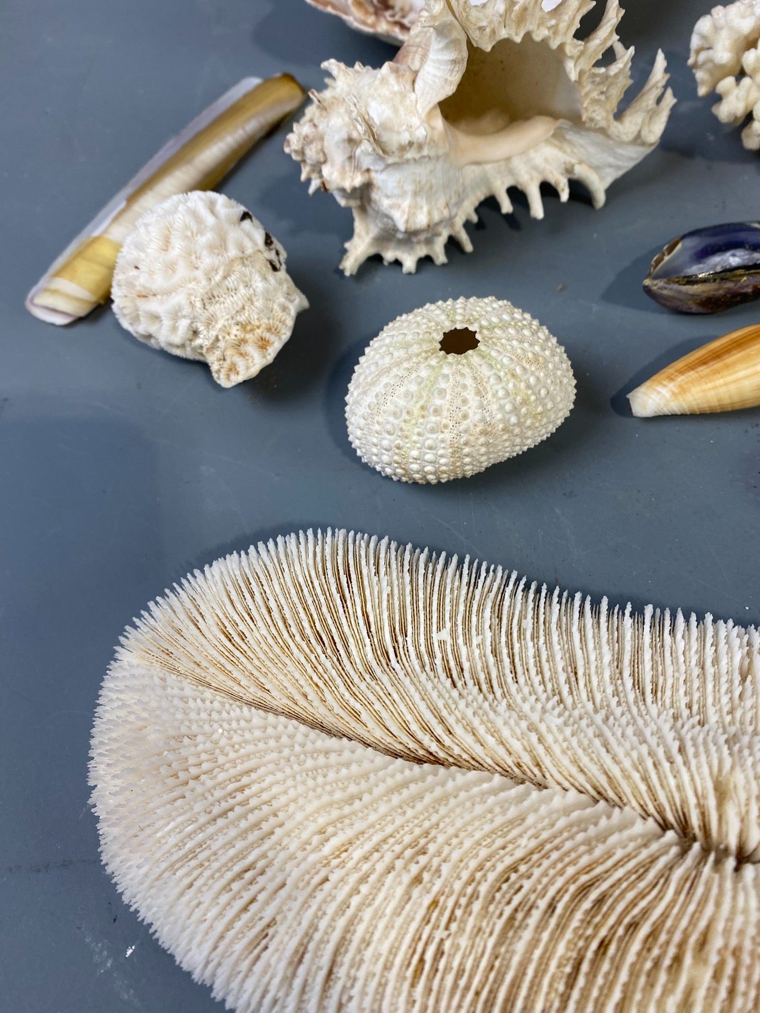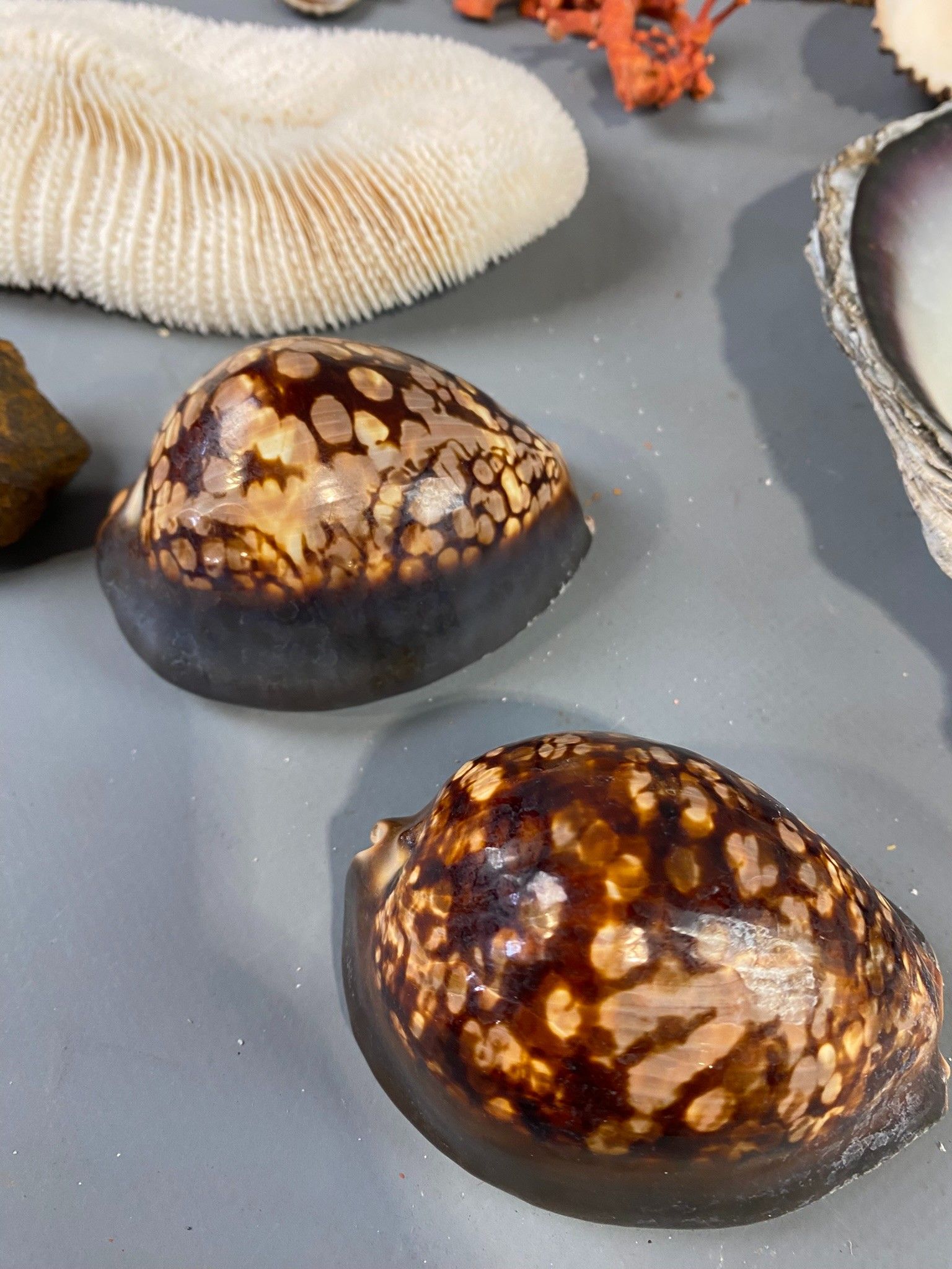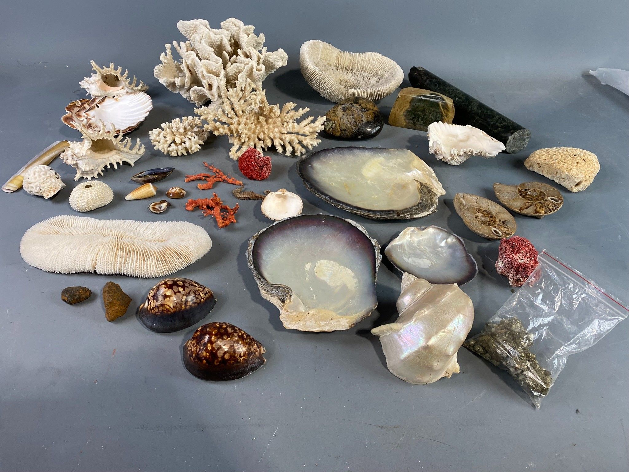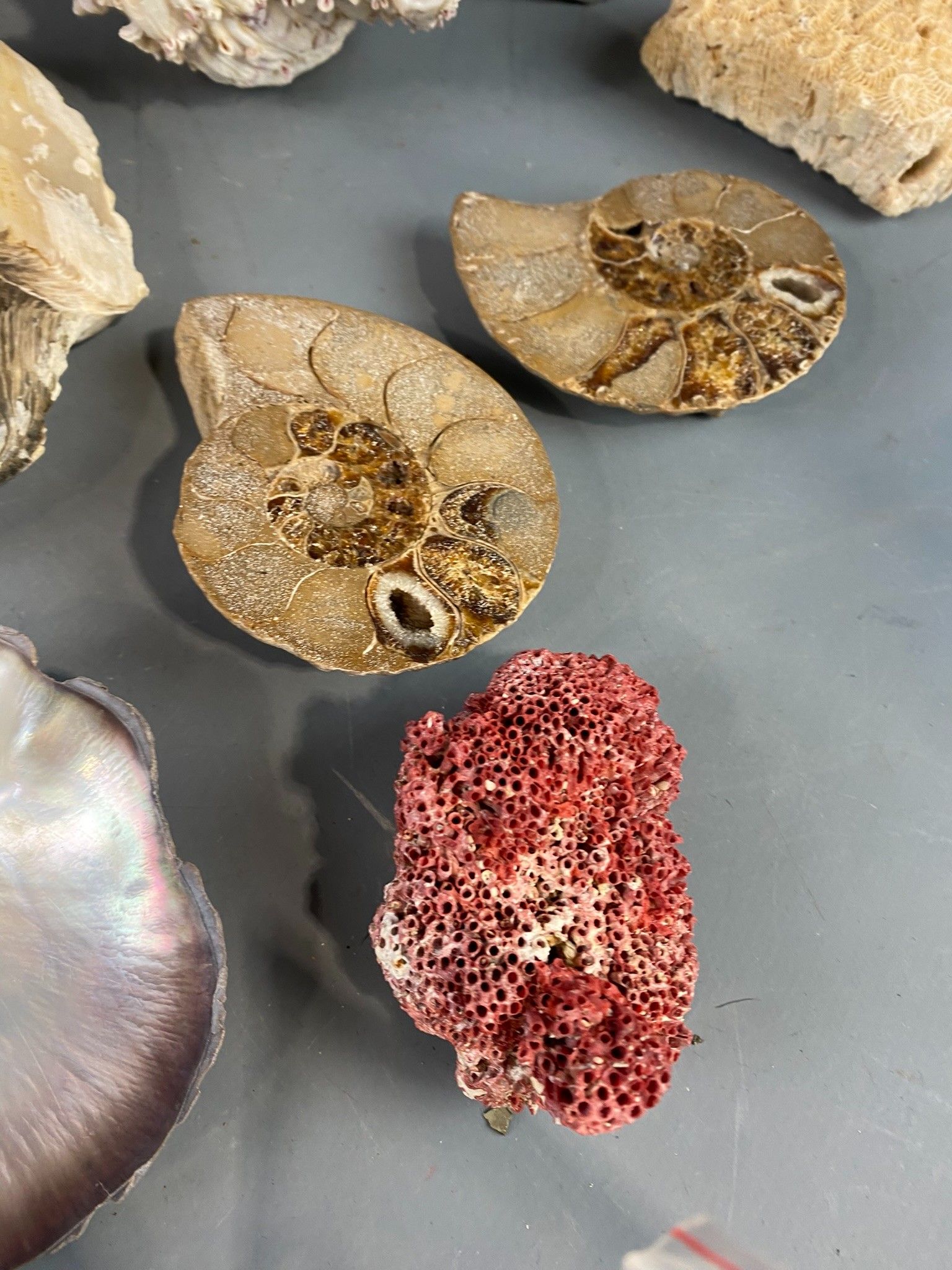 Conchyliophily collection background containing corals, shells, carrots, fossils...