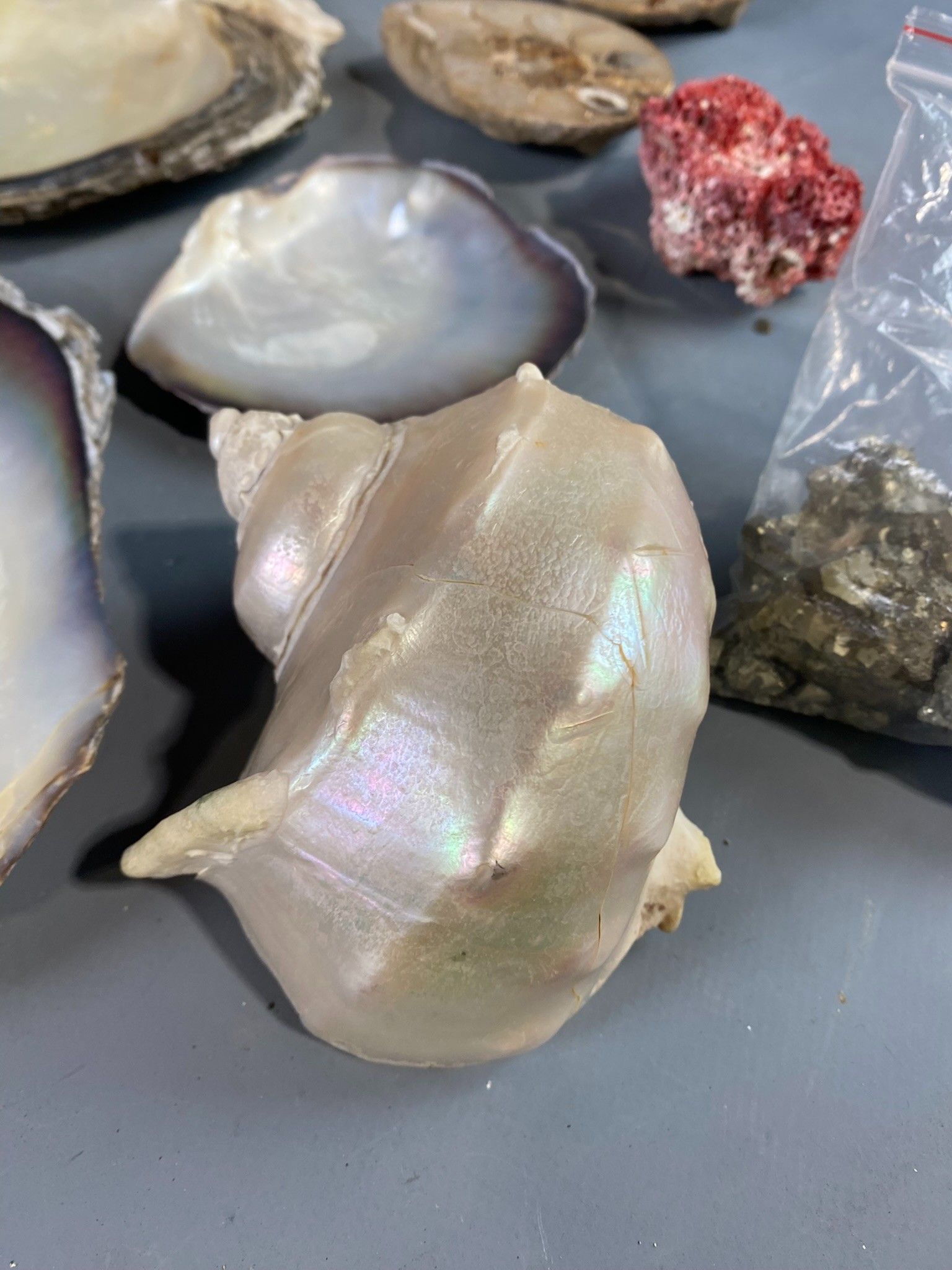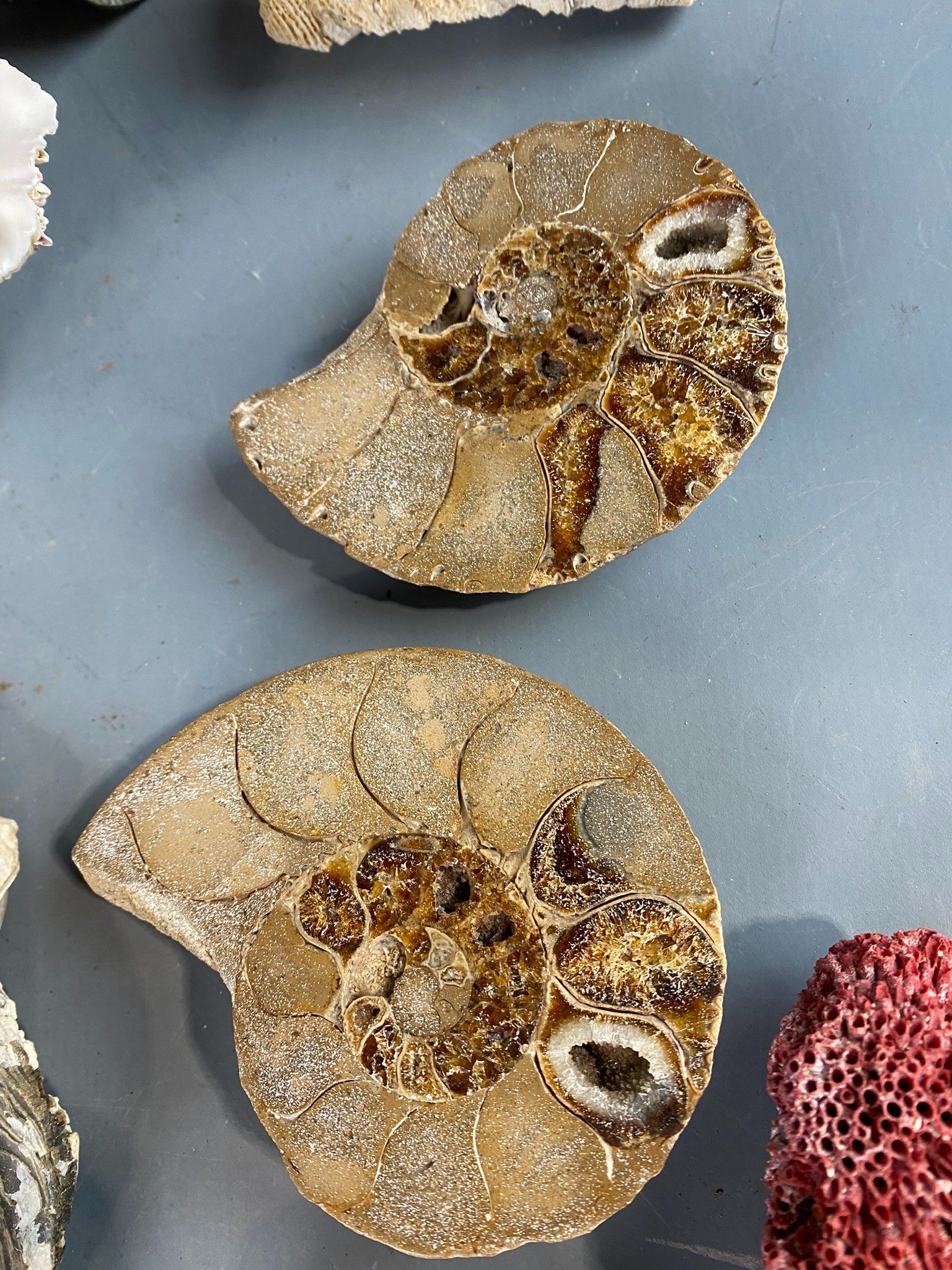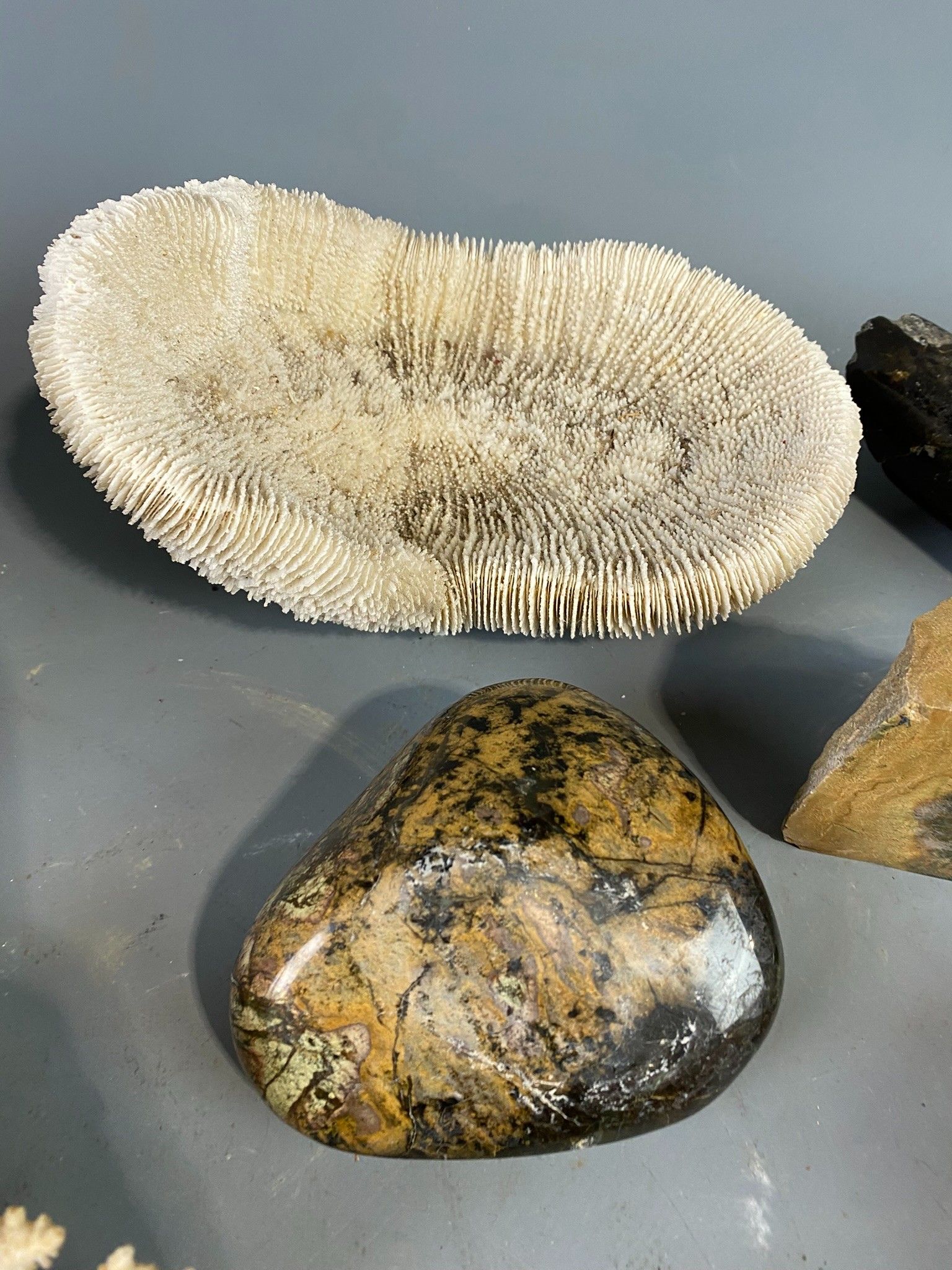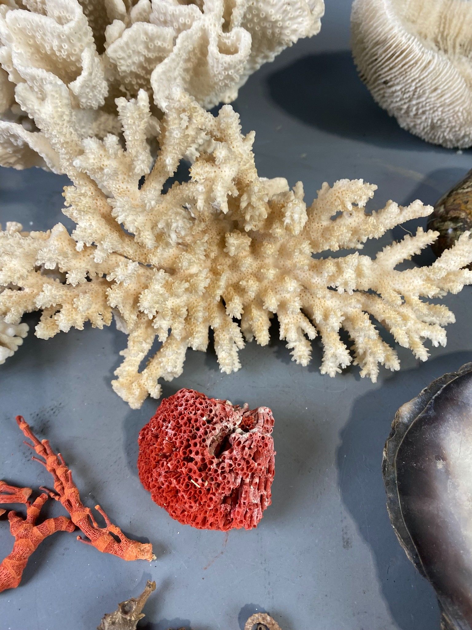 Conchyliophily collection background containing corals, shells, carrots, fossils...