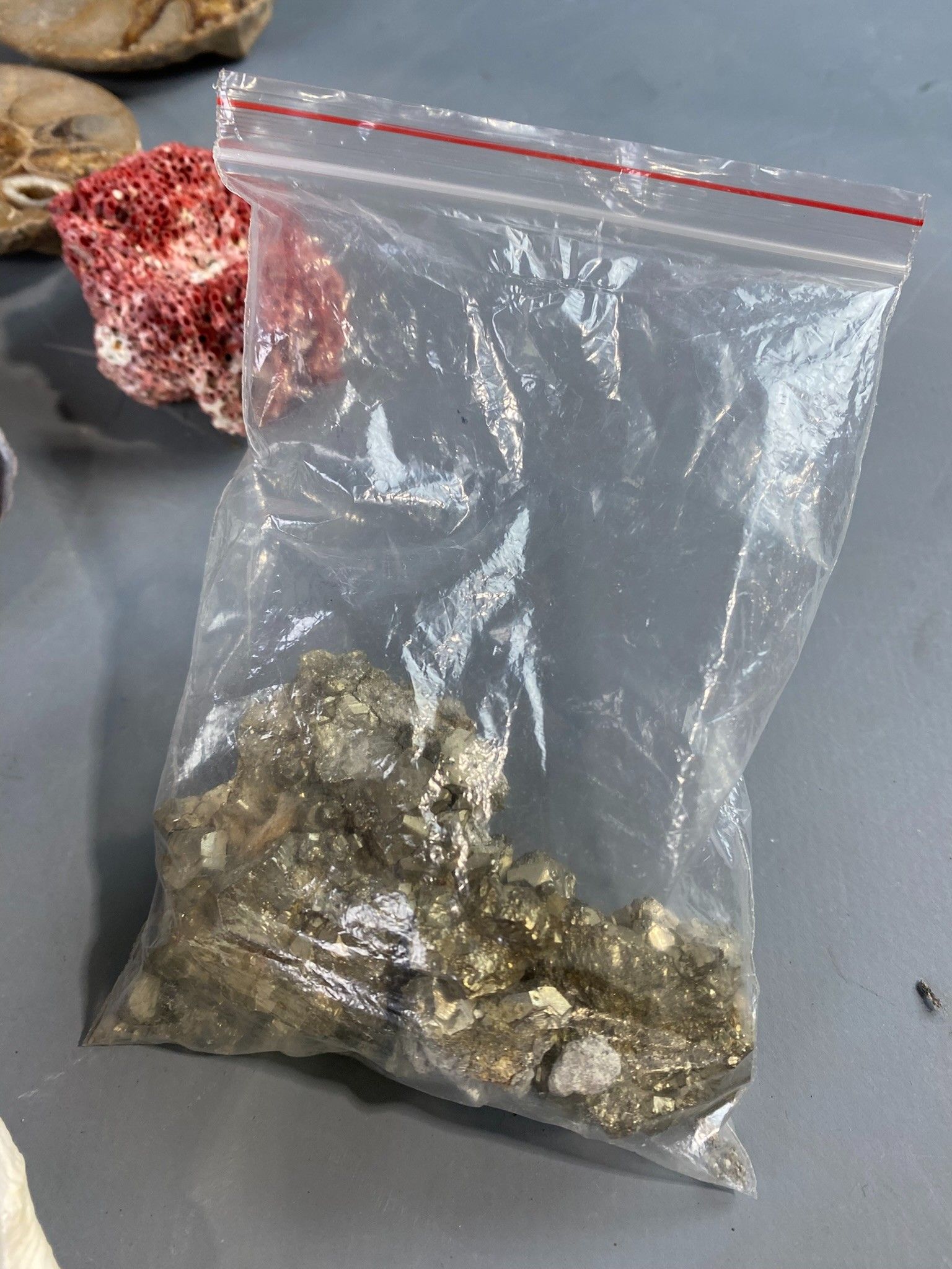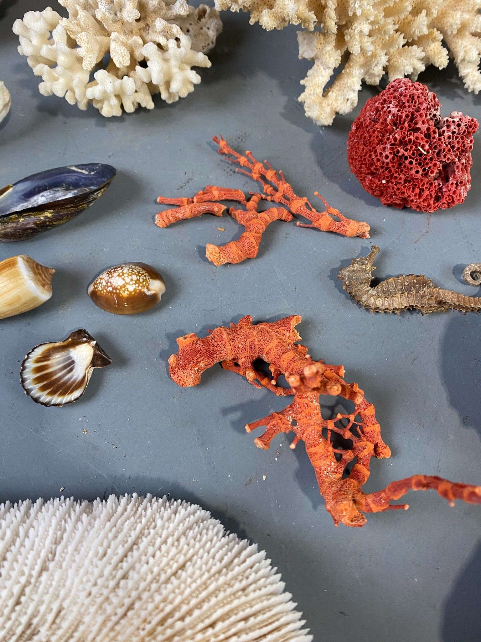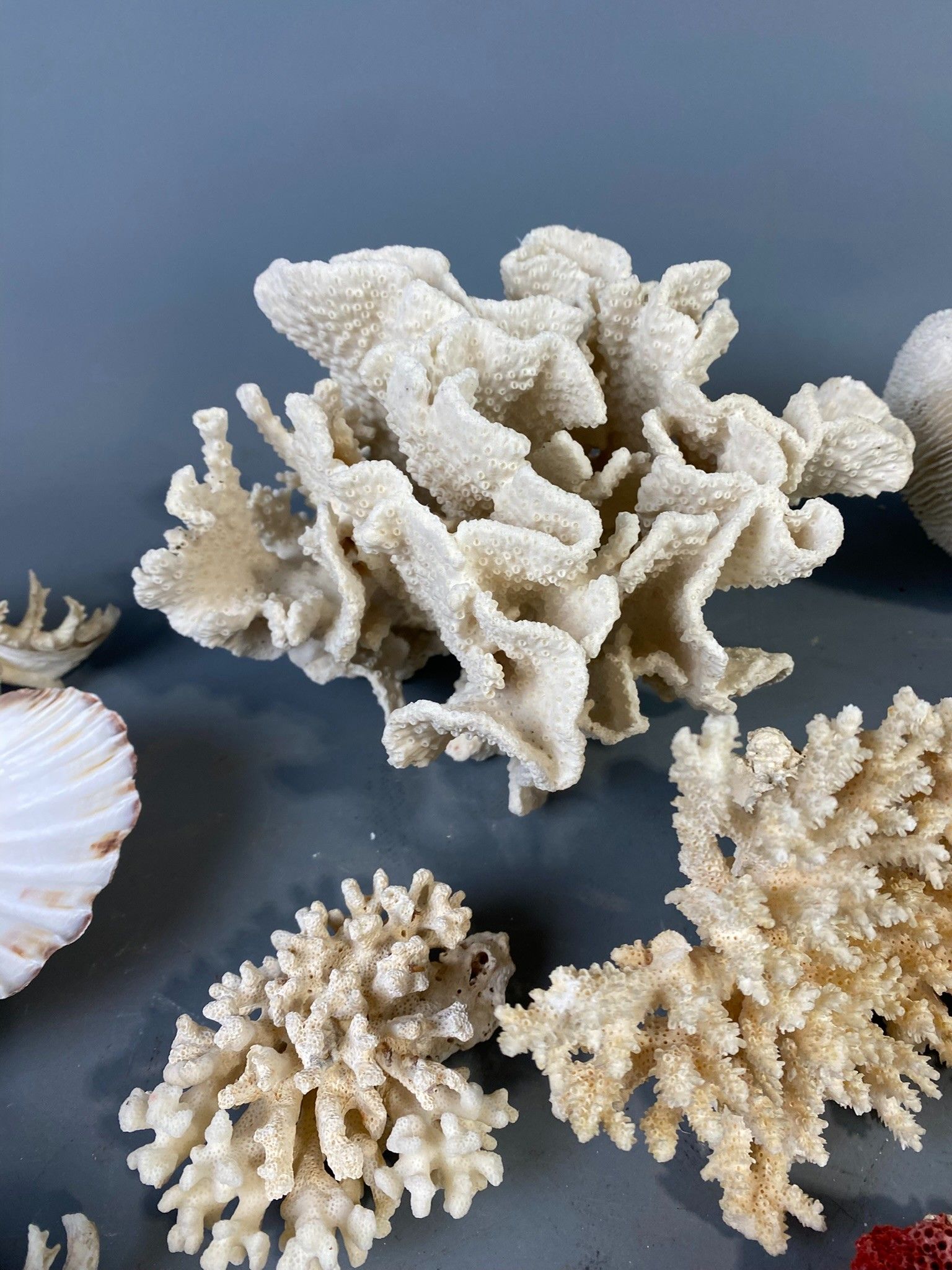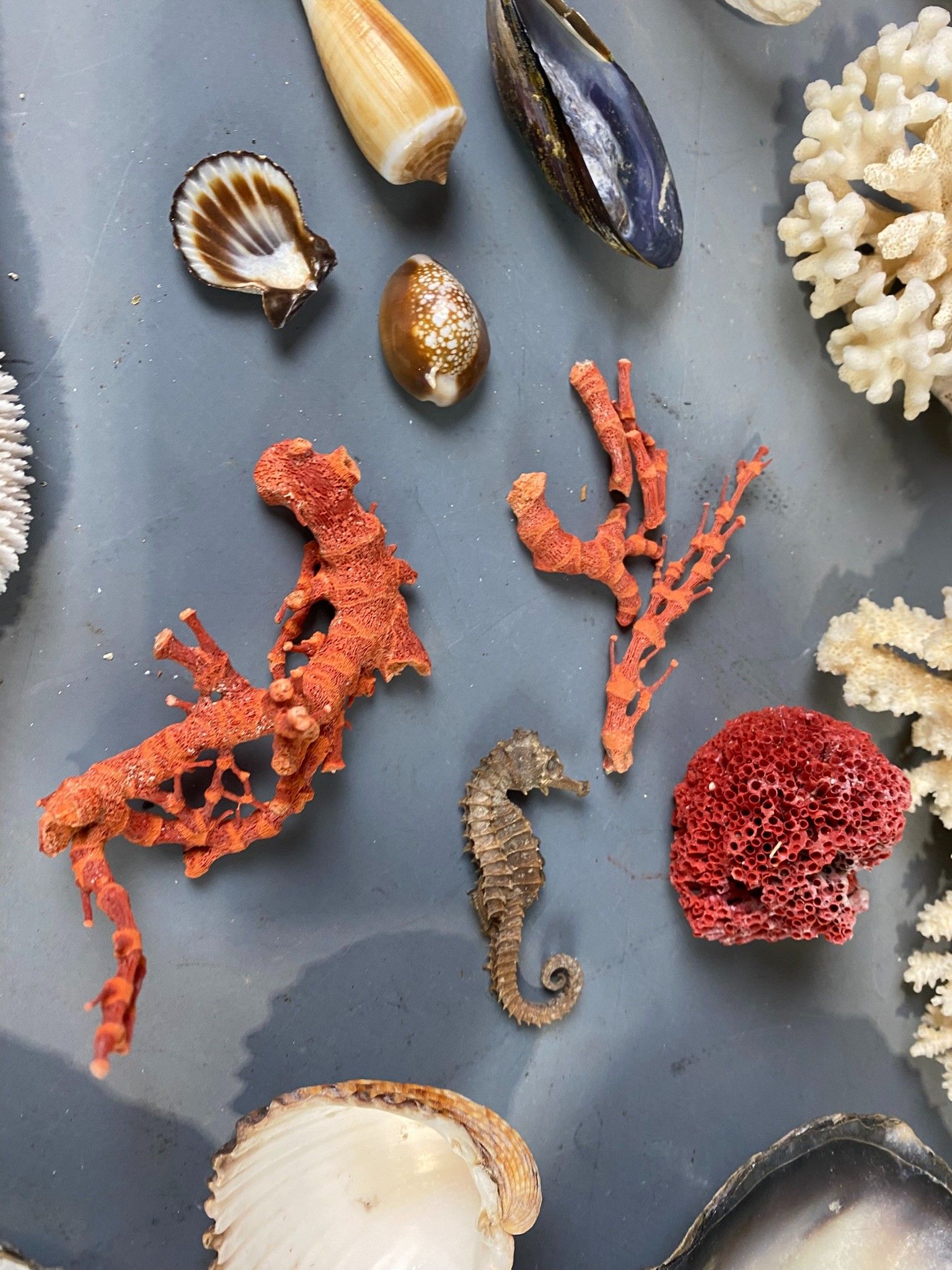 Conchyliophily collection background containing corals, shells, carrots, fossils...