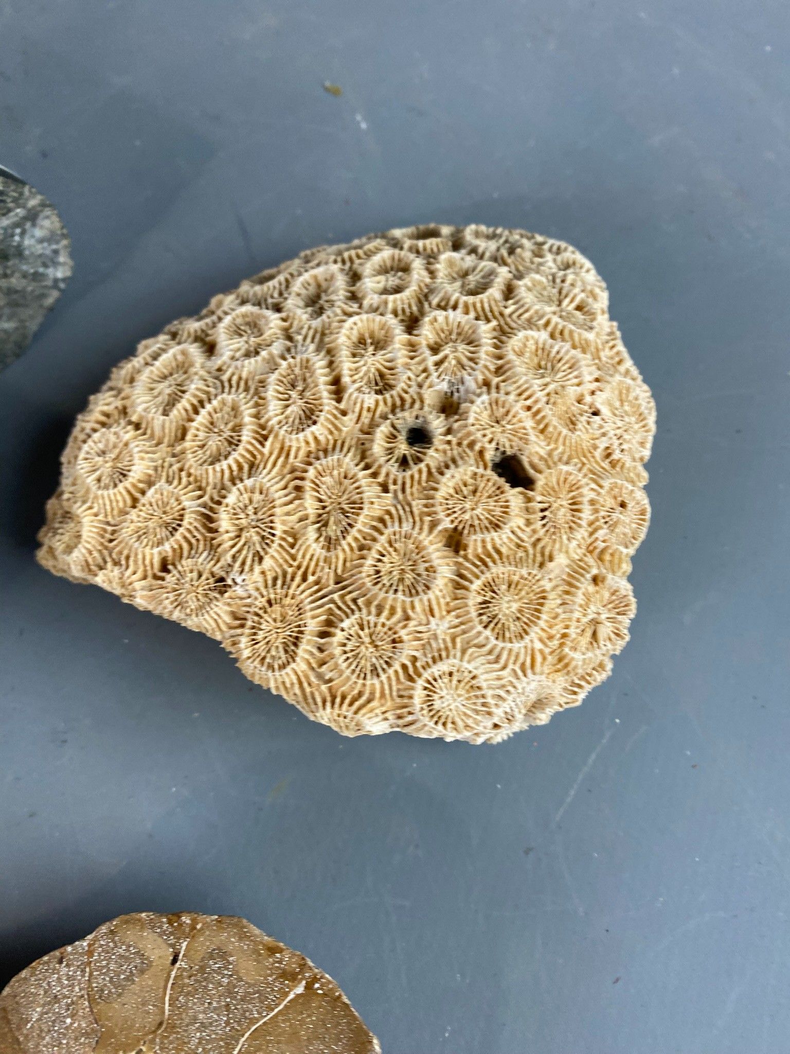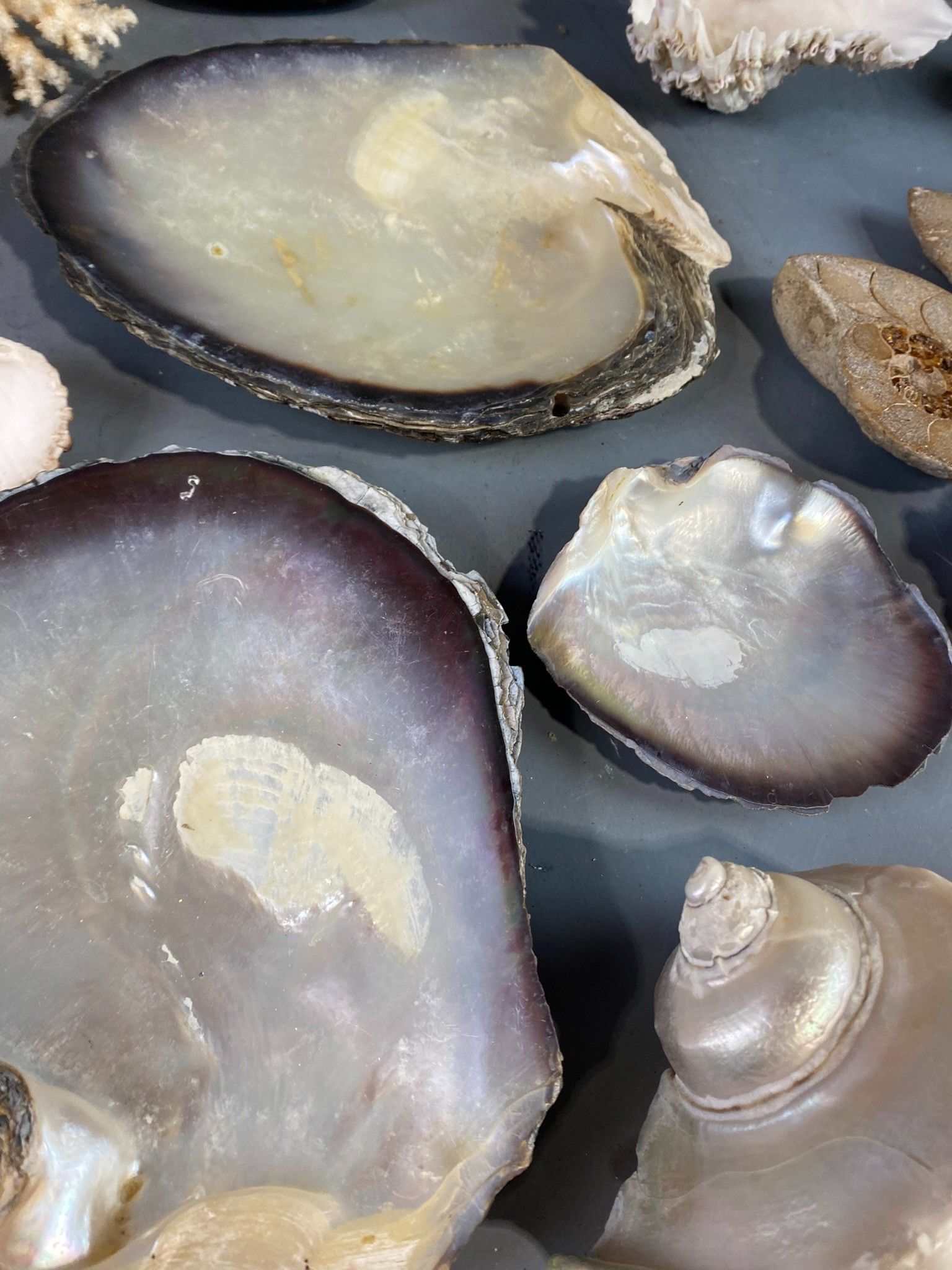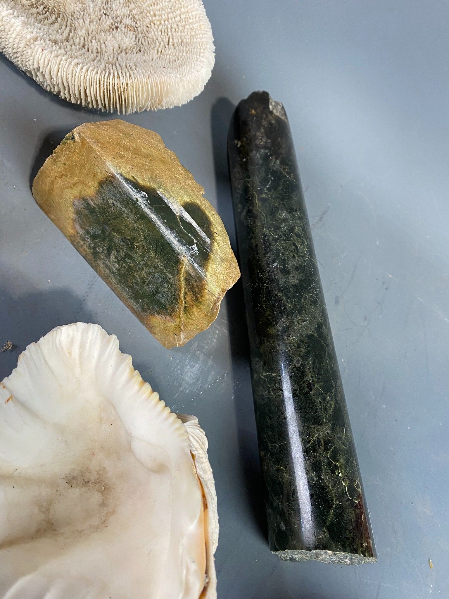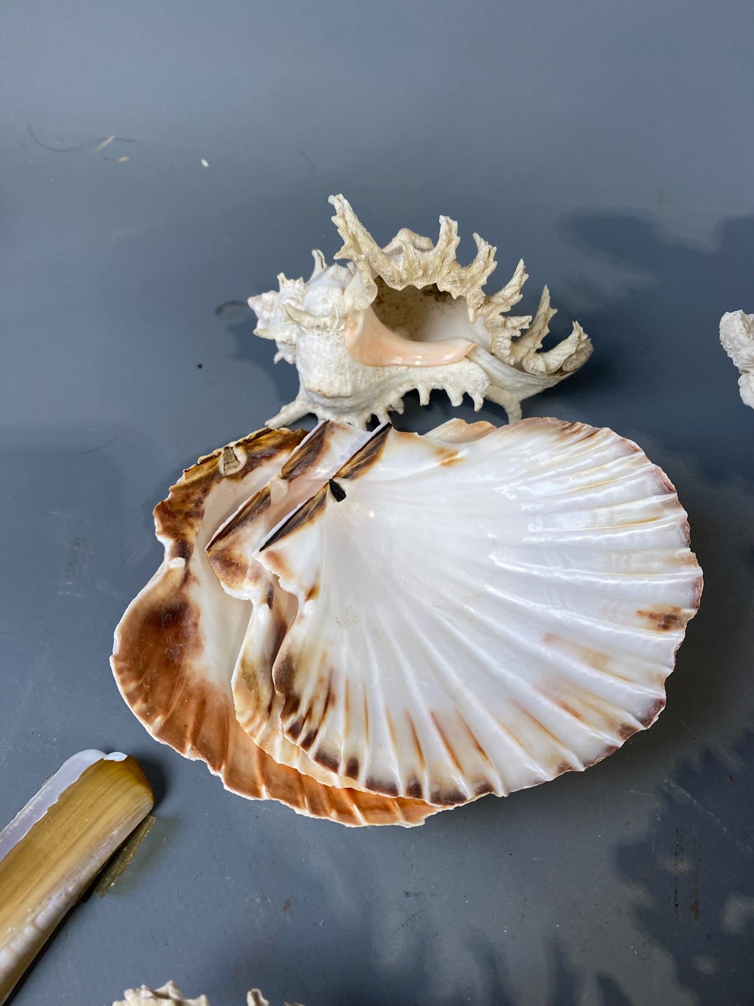 Conchyliophily collection background containing corals, shells, carrots, fossils...