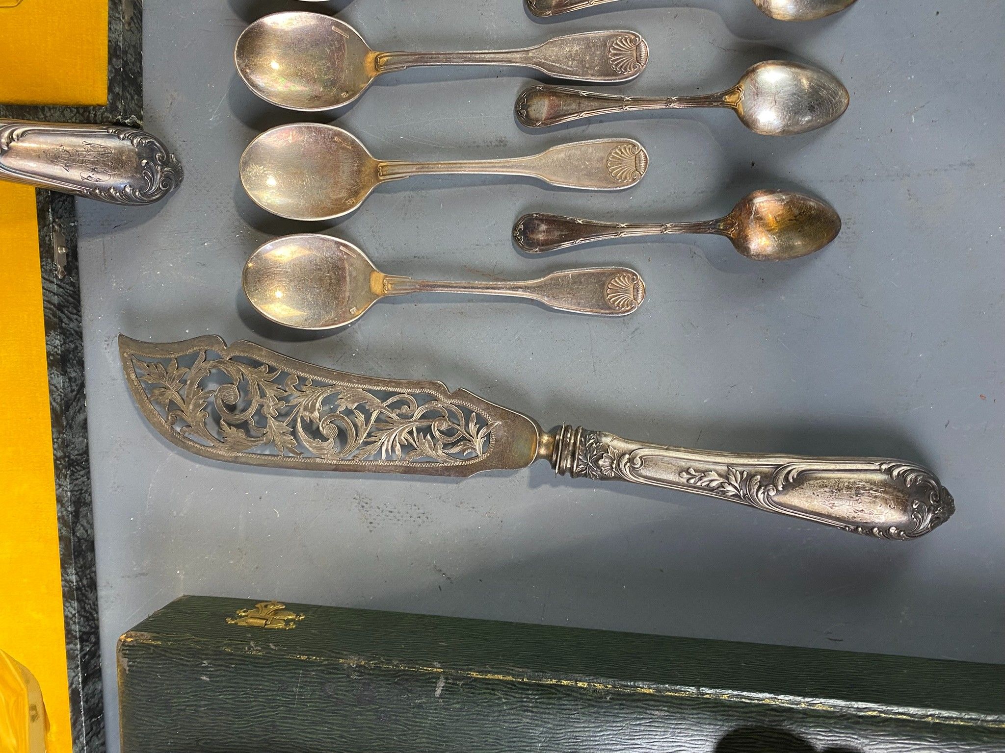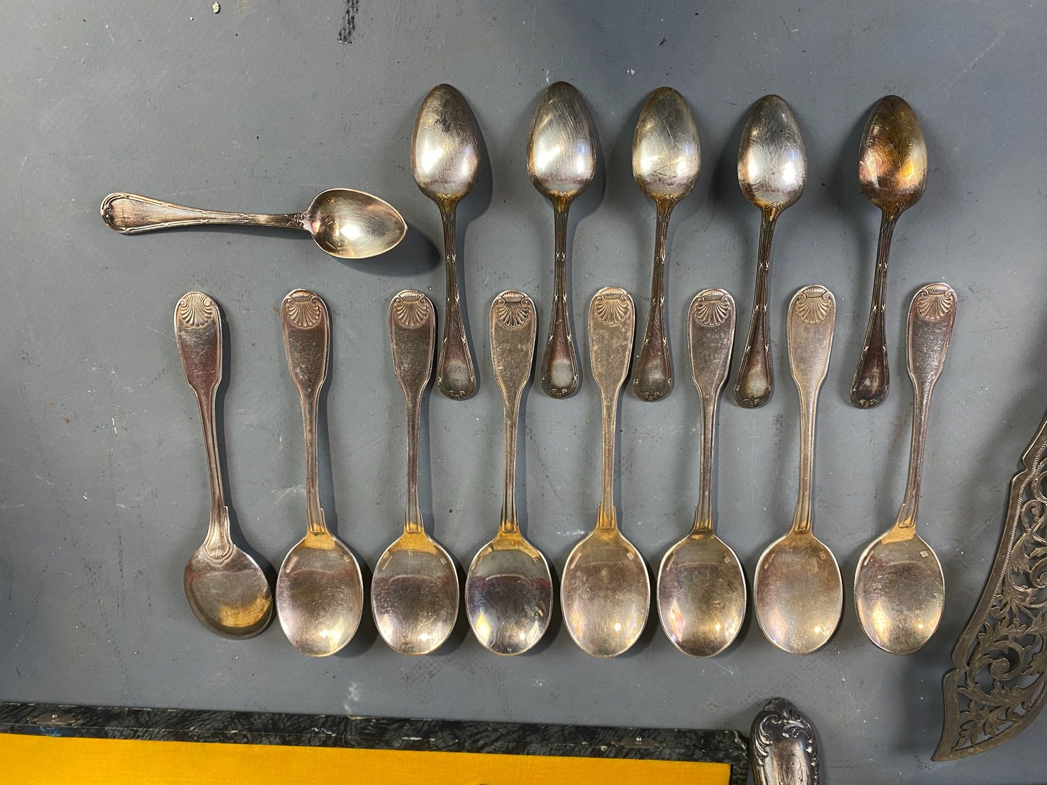Small batch of silver-plated metal including six Christofle moka spoons of the filet enrubanné design, eight Christofle ice-cream spoons of the coquille design and seven serving spoons.