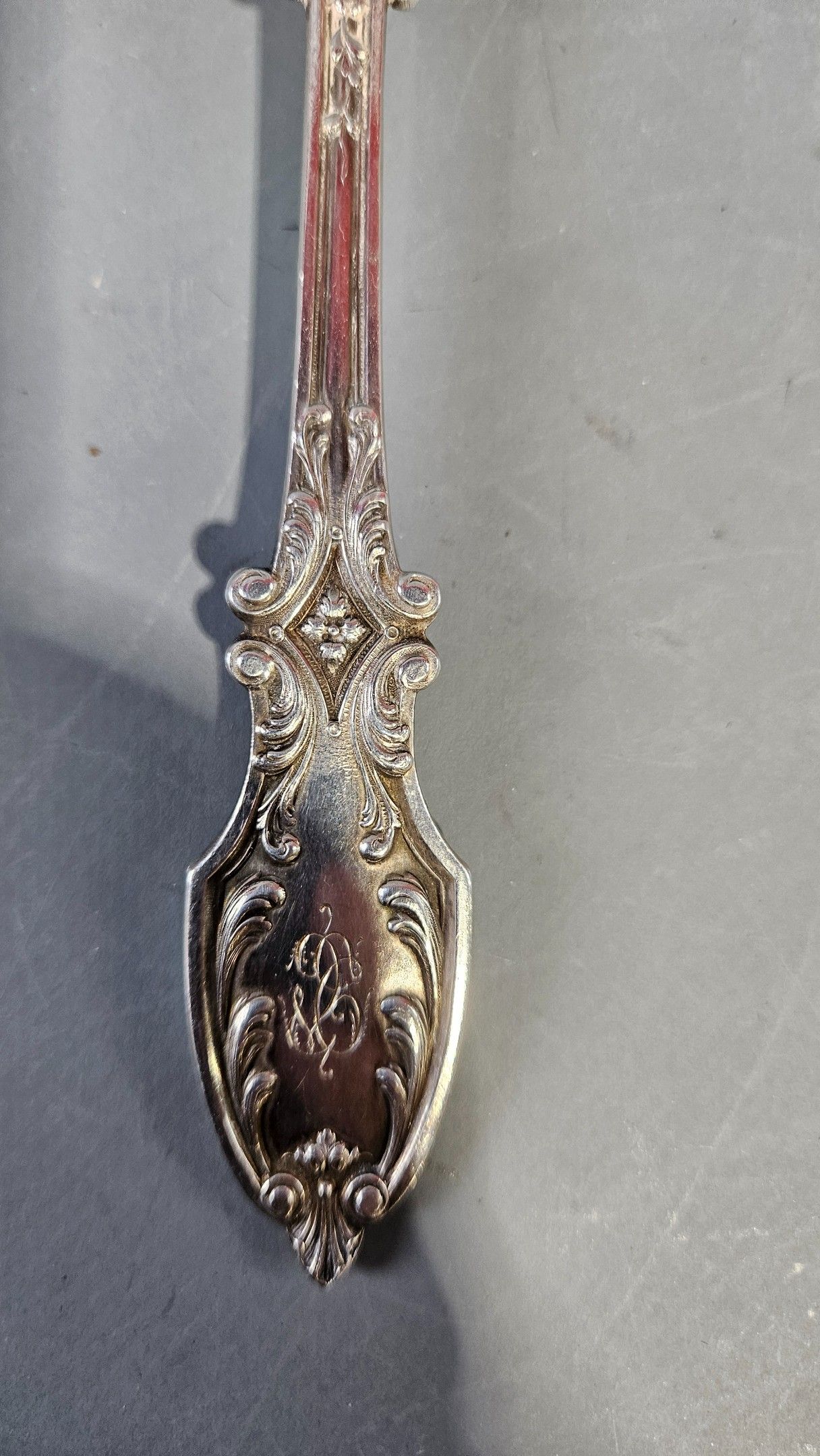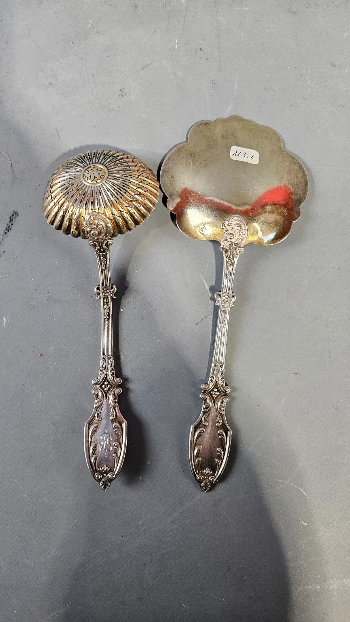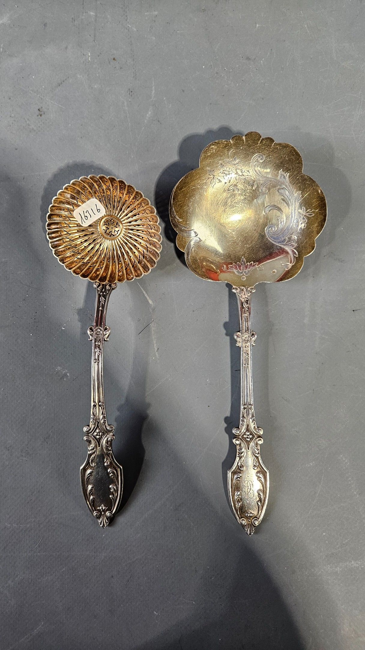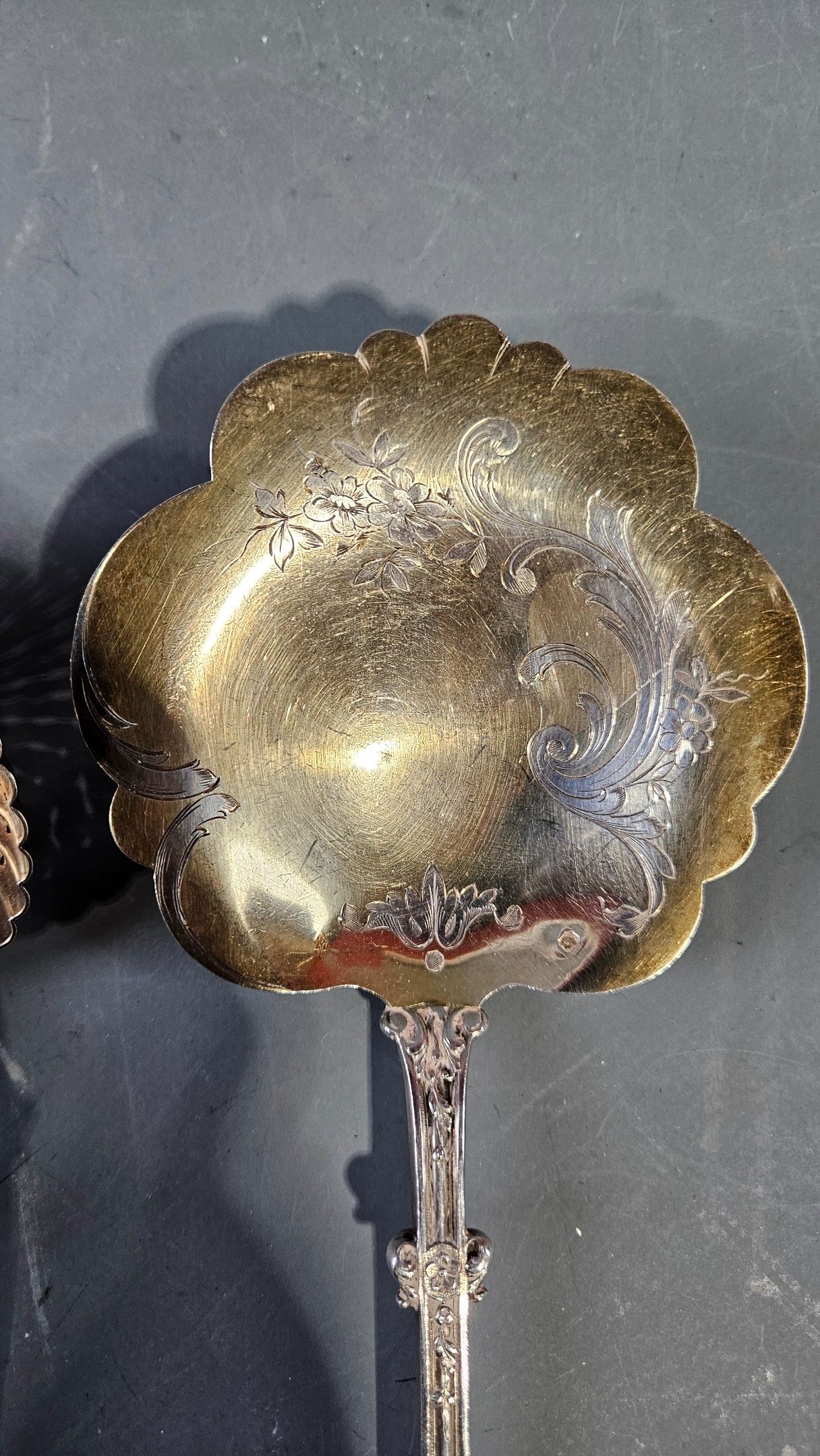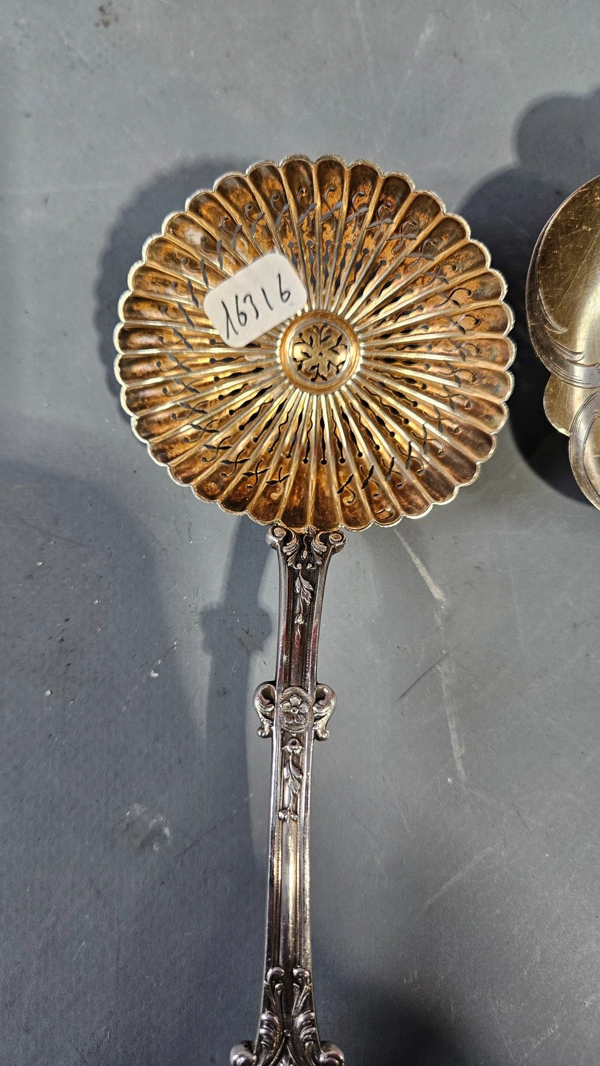 Silver sprinkling spoon and ice-cream spoon (in ruler) with rich foliage and floret decoration. 139g