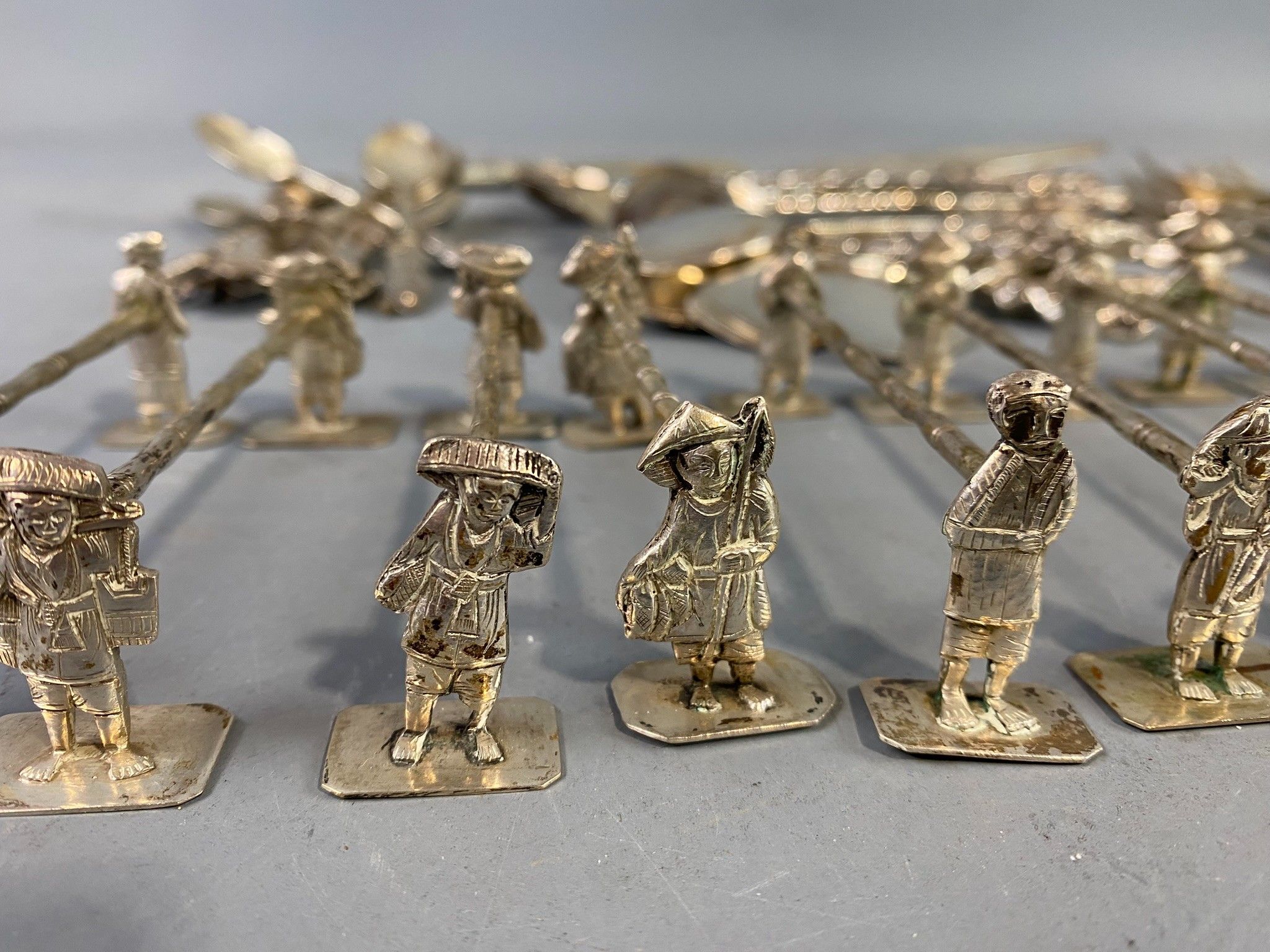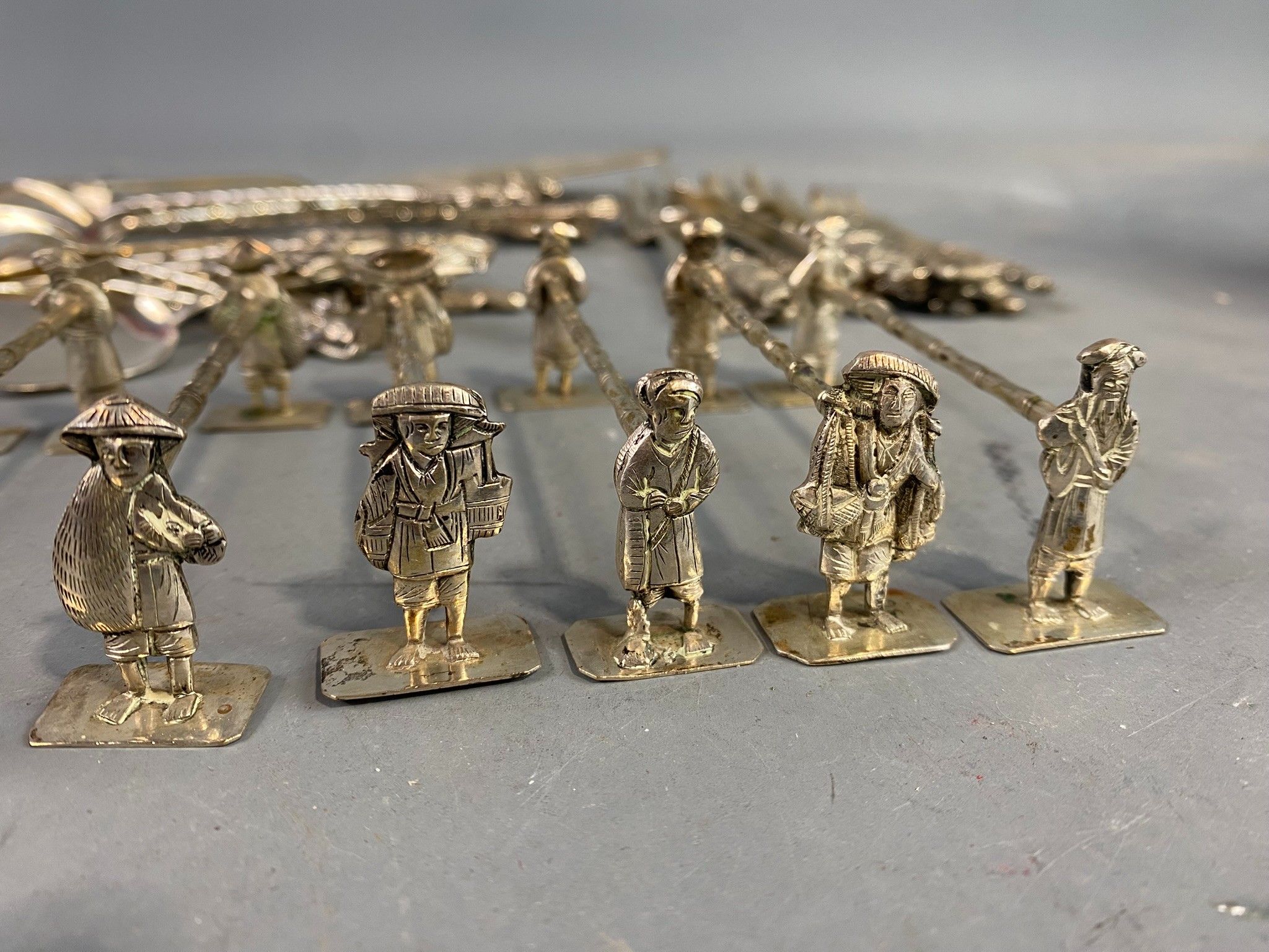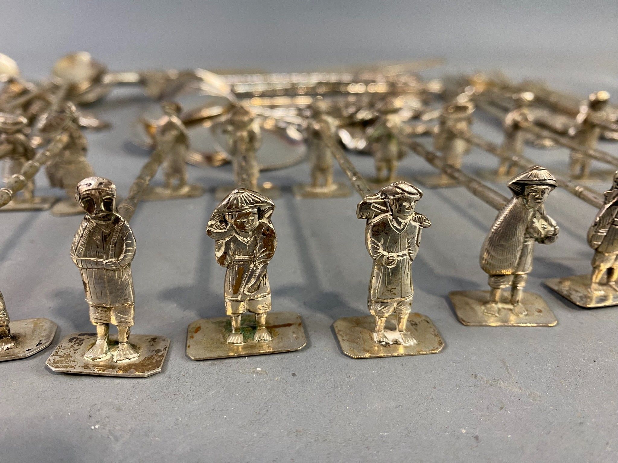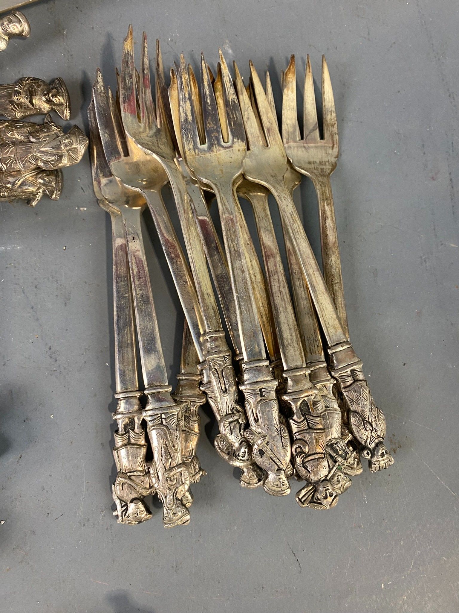 South-East Asian silver-plated cutlery and knife-holders comprising: 12 knife-holders, 12 cake forks, 1 serving scoop, 12 dessert spoons, 12 ice-cream spoons and 5 cocktail spoons