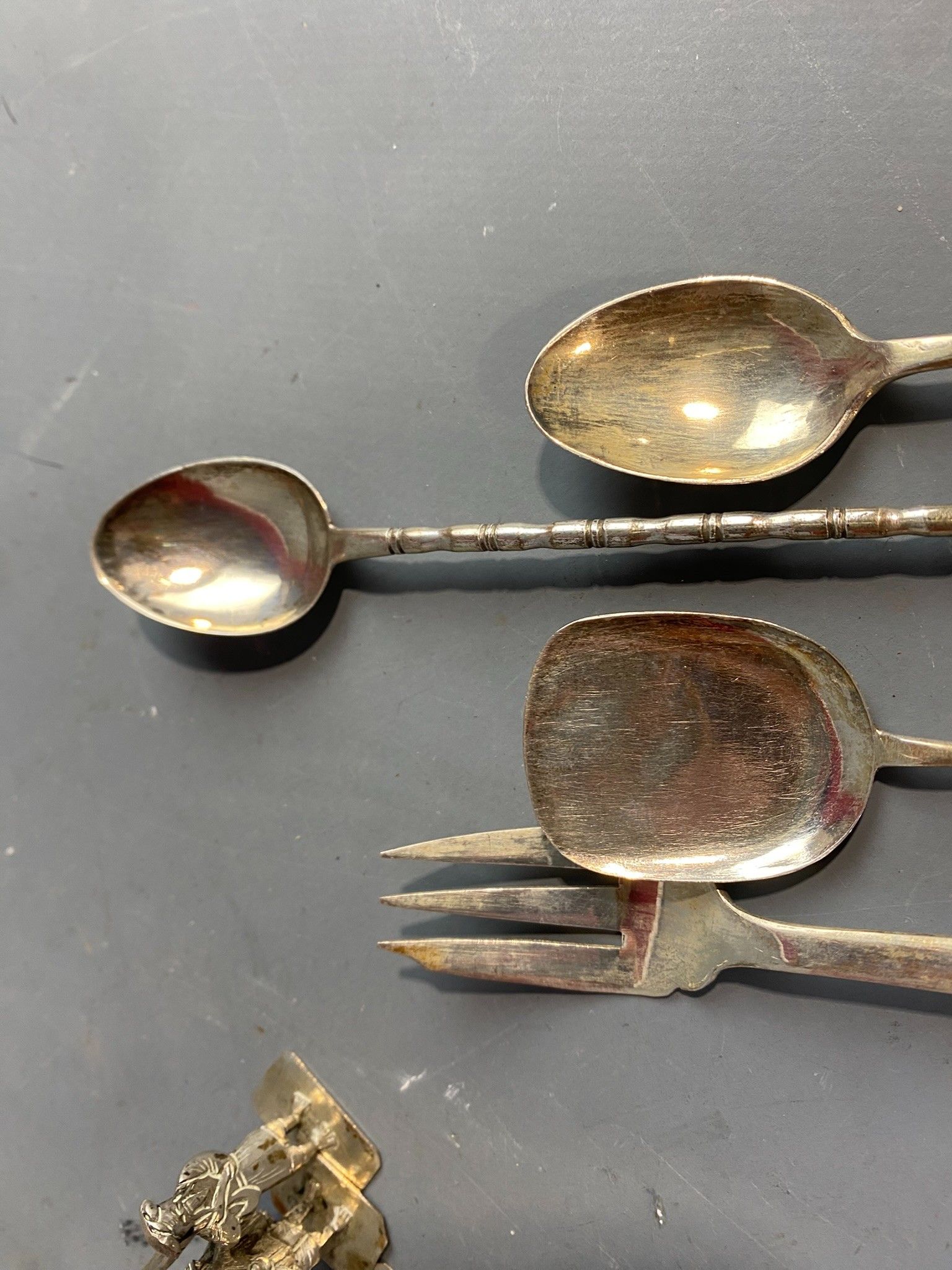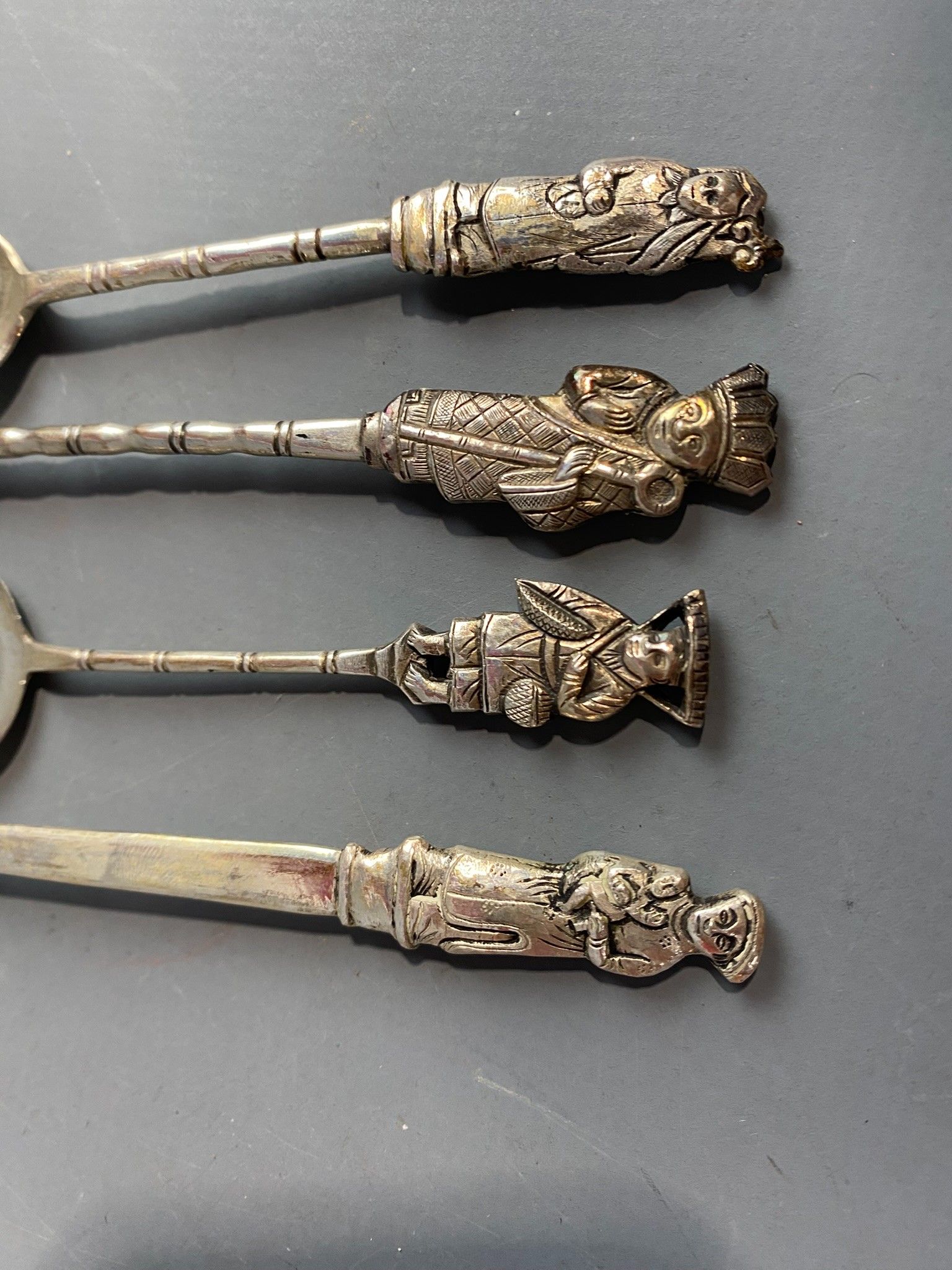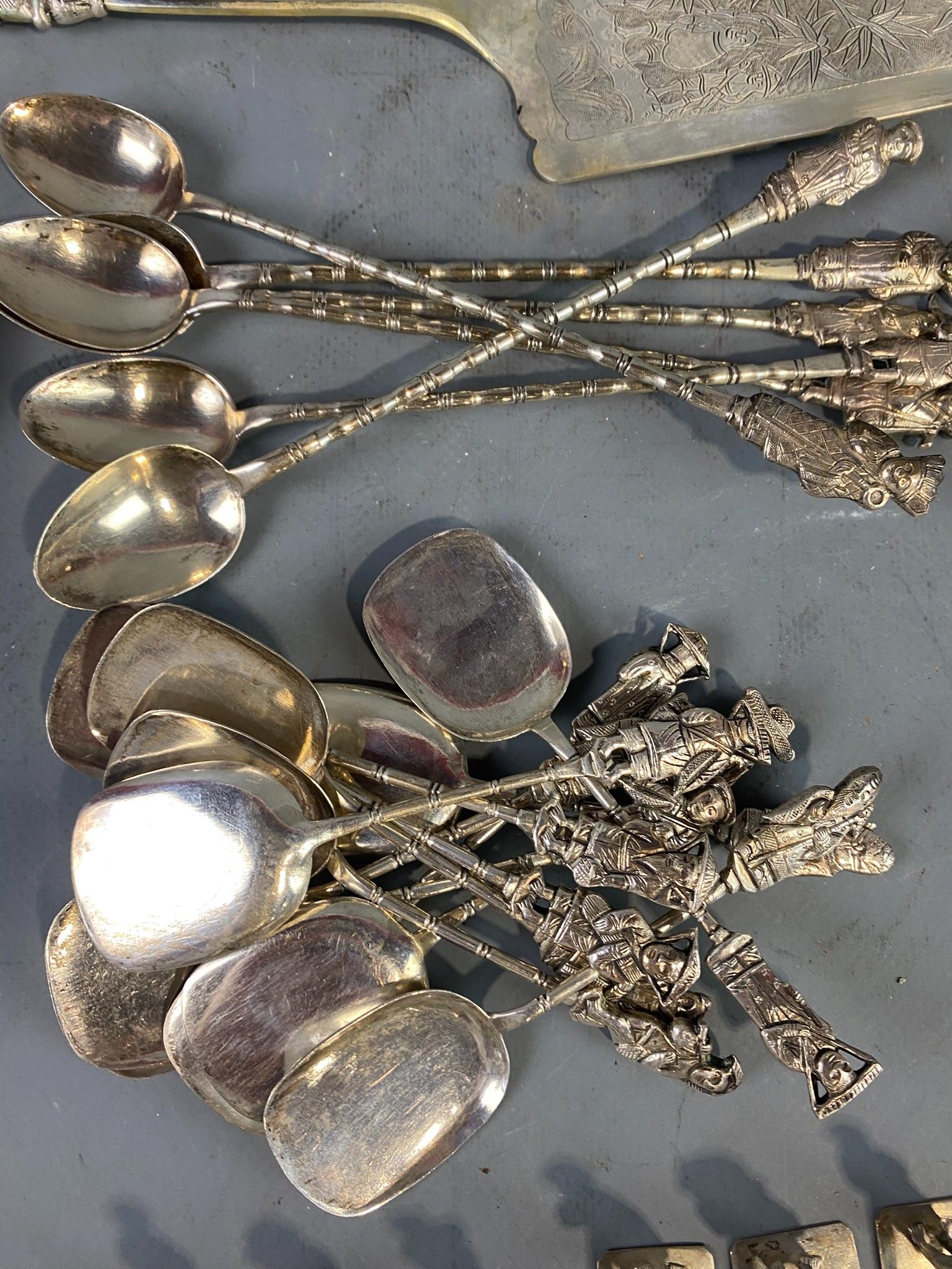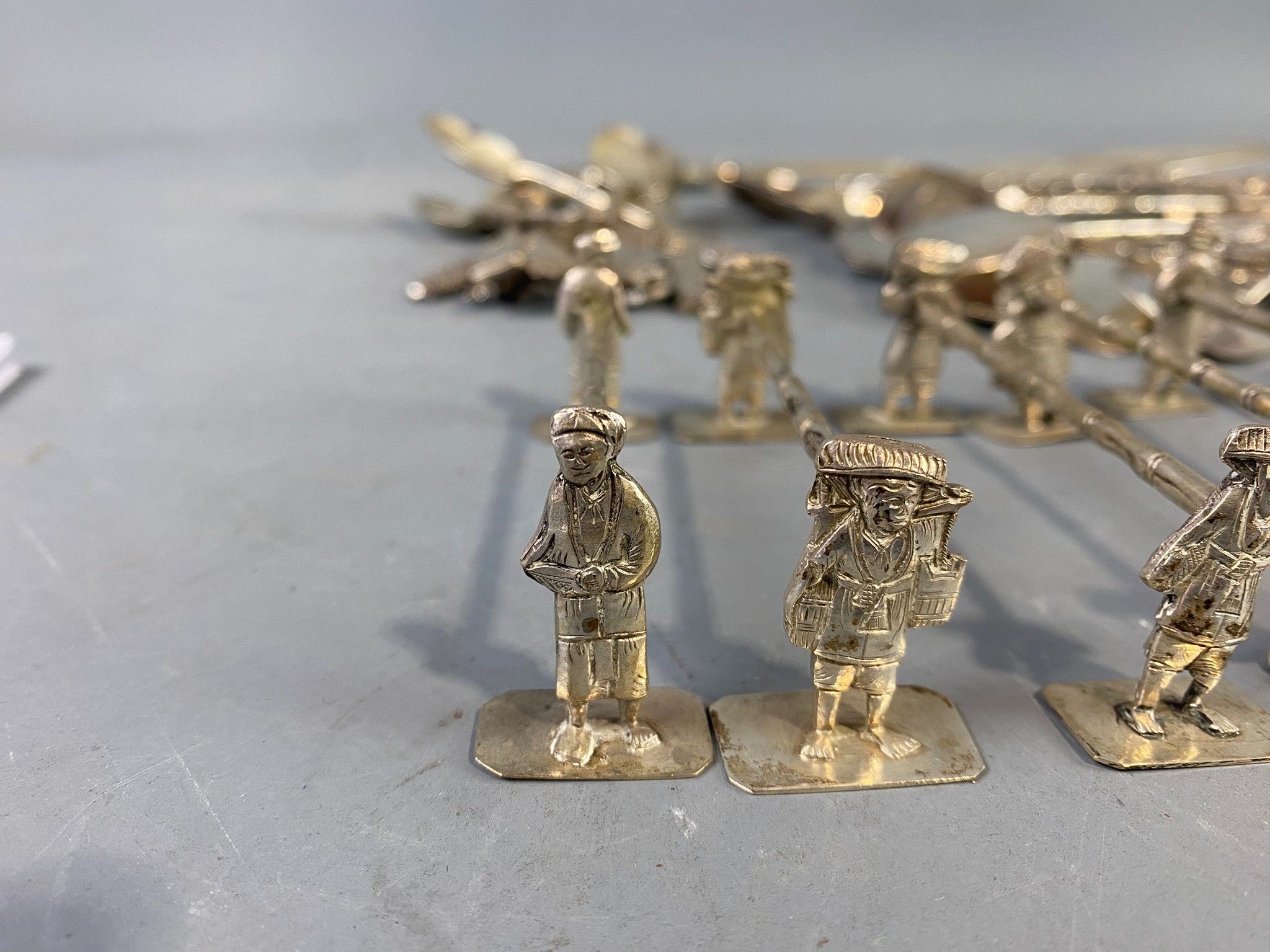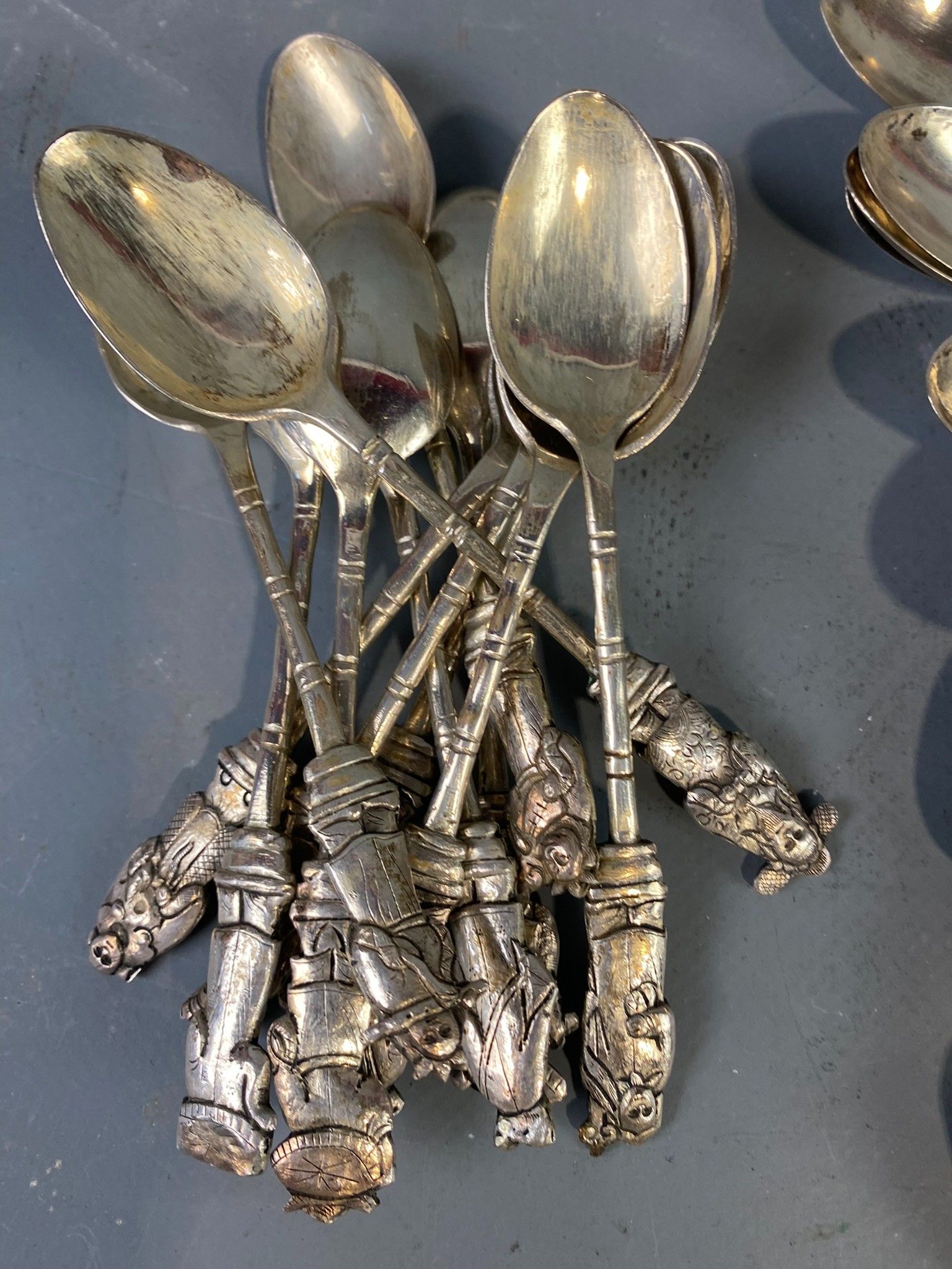South-East Asian silver-plated cutlery and knife-holders comprising: 12 knife-holders, 12 cake forks, 1 serving scoop, 12 dessert spoons, 12 ice-cream spoons and 5 cocktail spoons