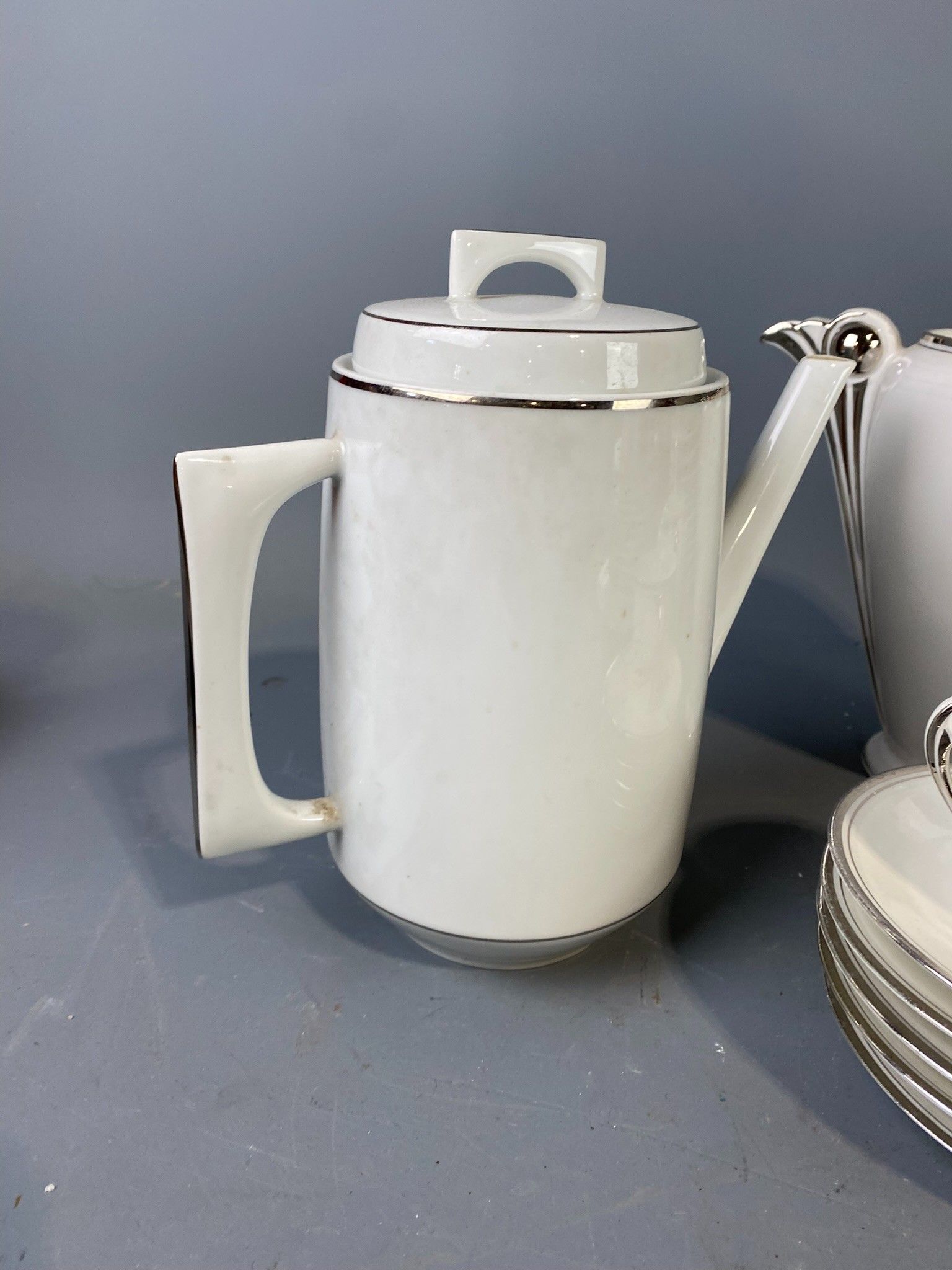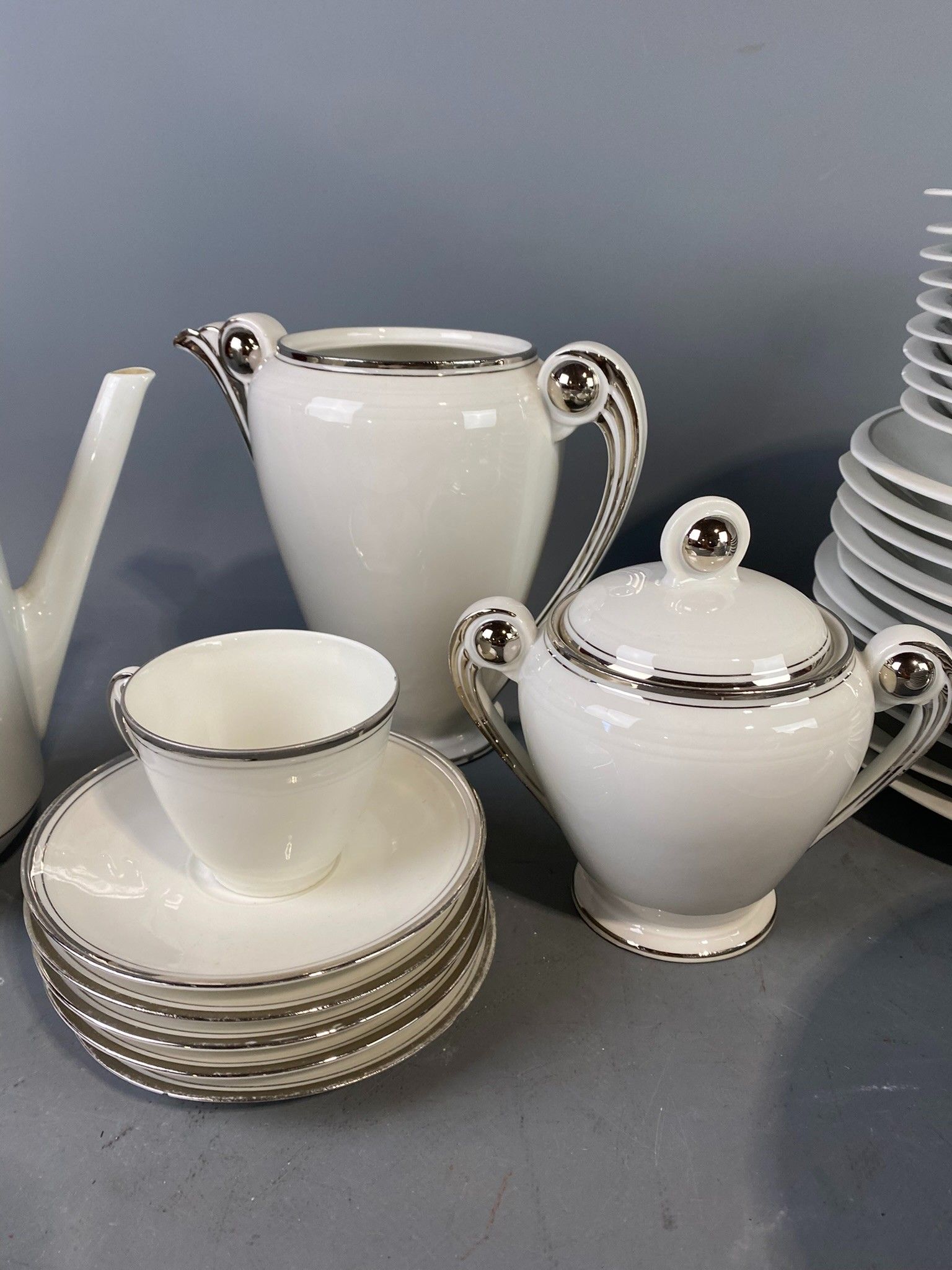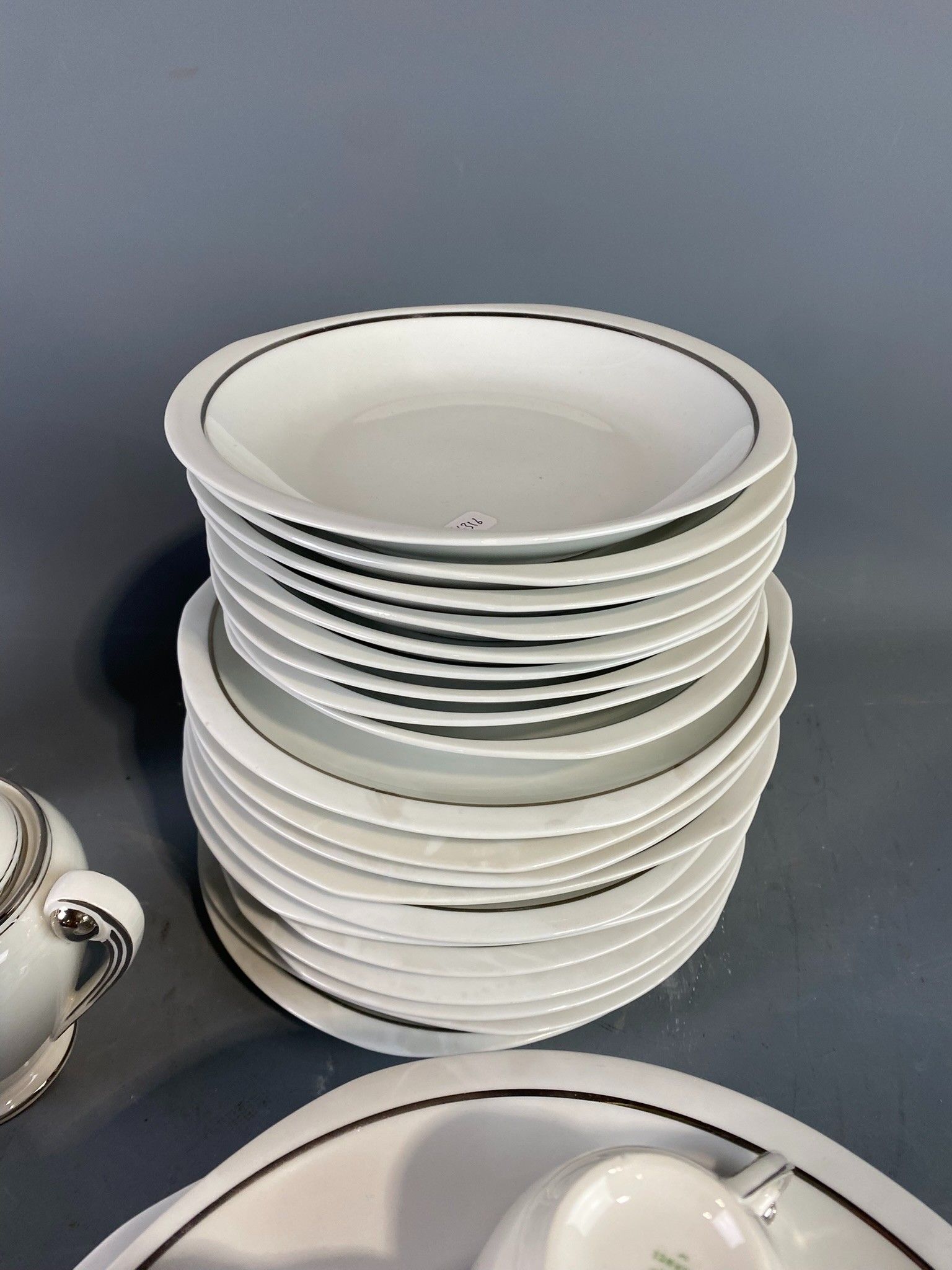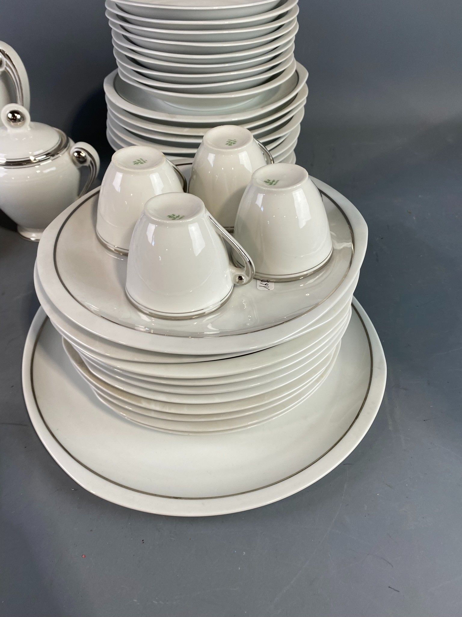 BERNARDAUD & Cie in Limoges: Part of a VIVALDI pattern dinner service in white Limoges porcelain with a simple silver filet, comprising twenty-one large plates (one with chips), nine soup plates, a round platter and a coffee pot. A jug without lid, a sugar bowl, five cups and saucers are included.