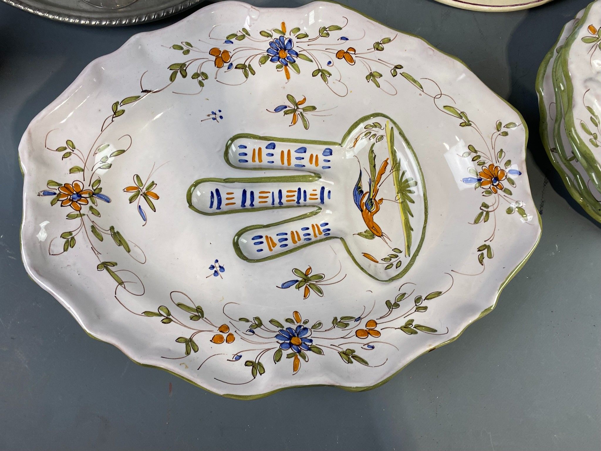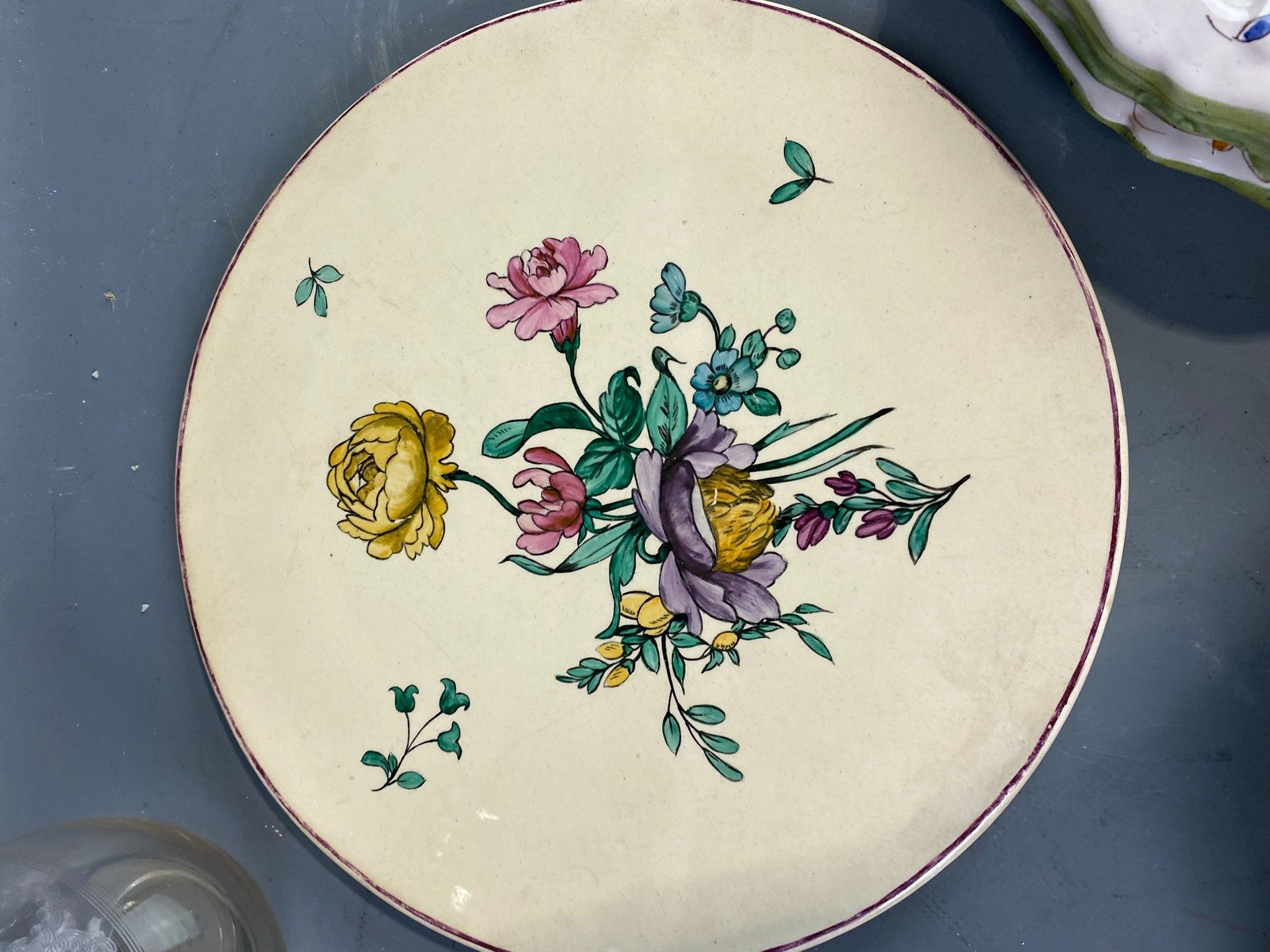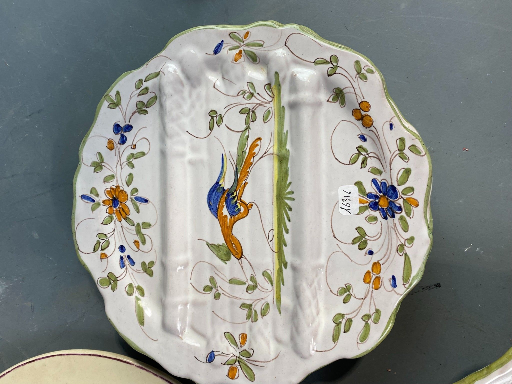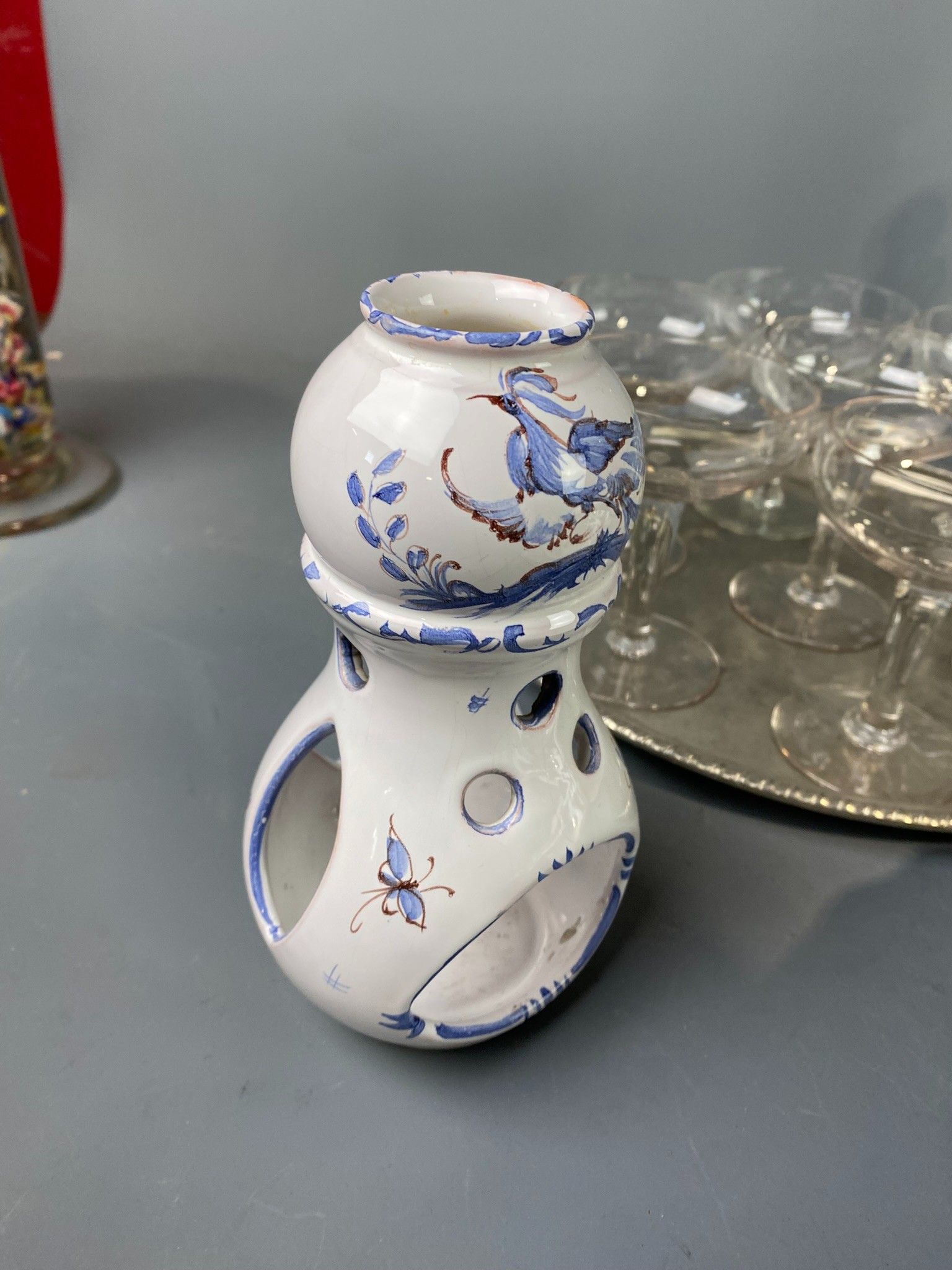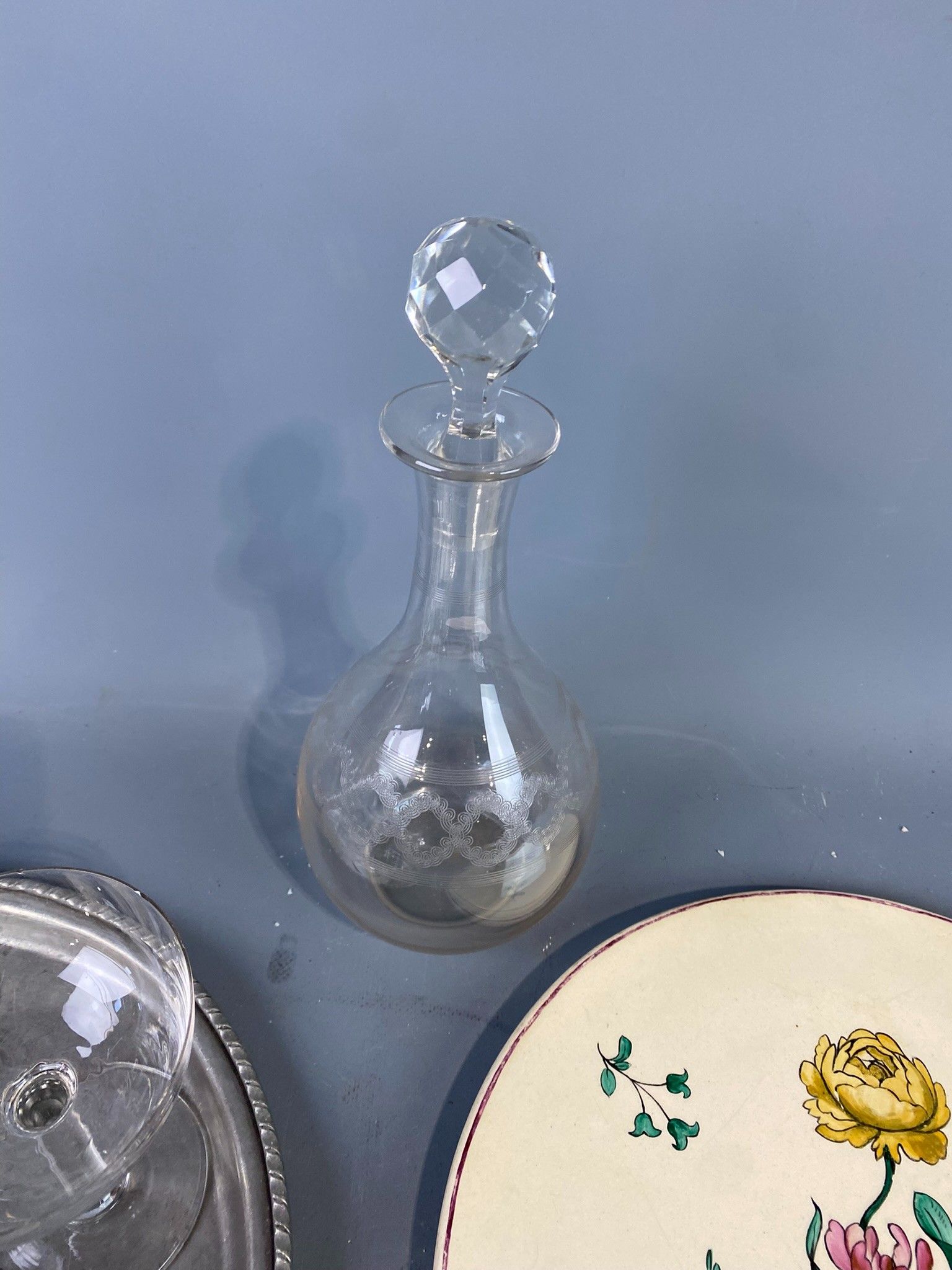 Cupboard backs: Round pewter tray, six champagne glasses of two similar models in glass or half-crystal, an earthenware cheese tray, four plates, a dish and a nightlight in Moustiers earthenware and a crystal decanter engraved with interlacing and fillets.