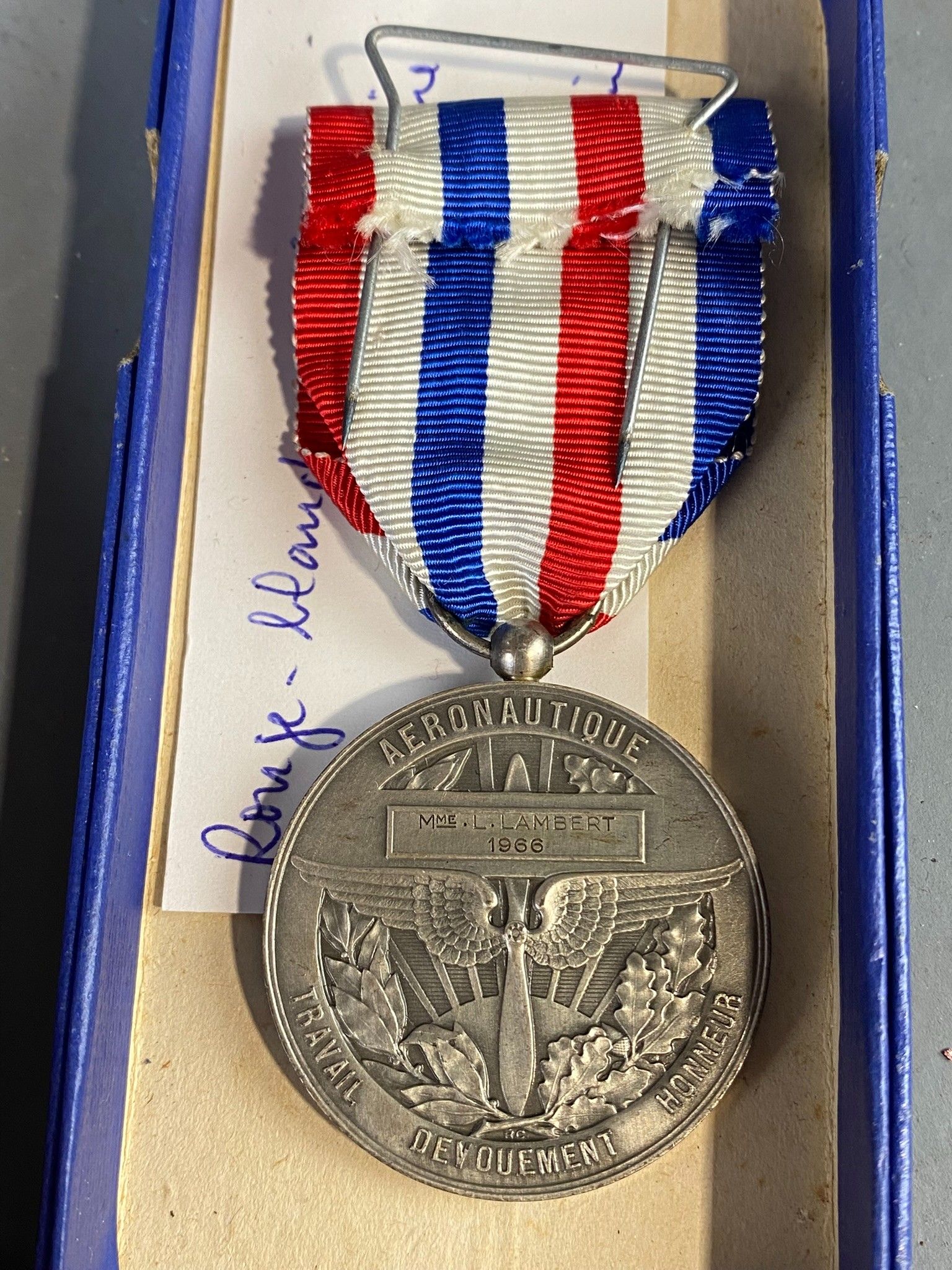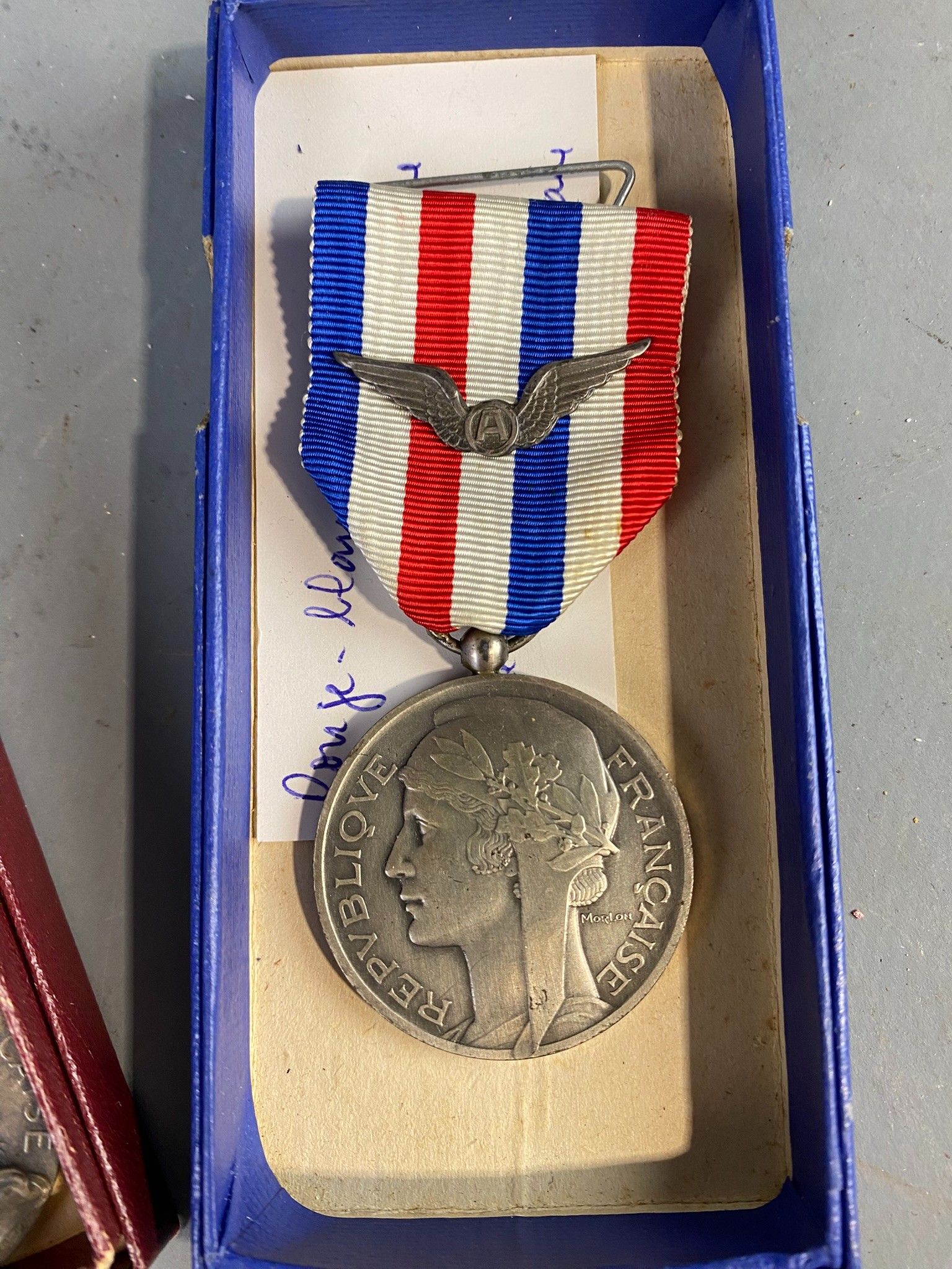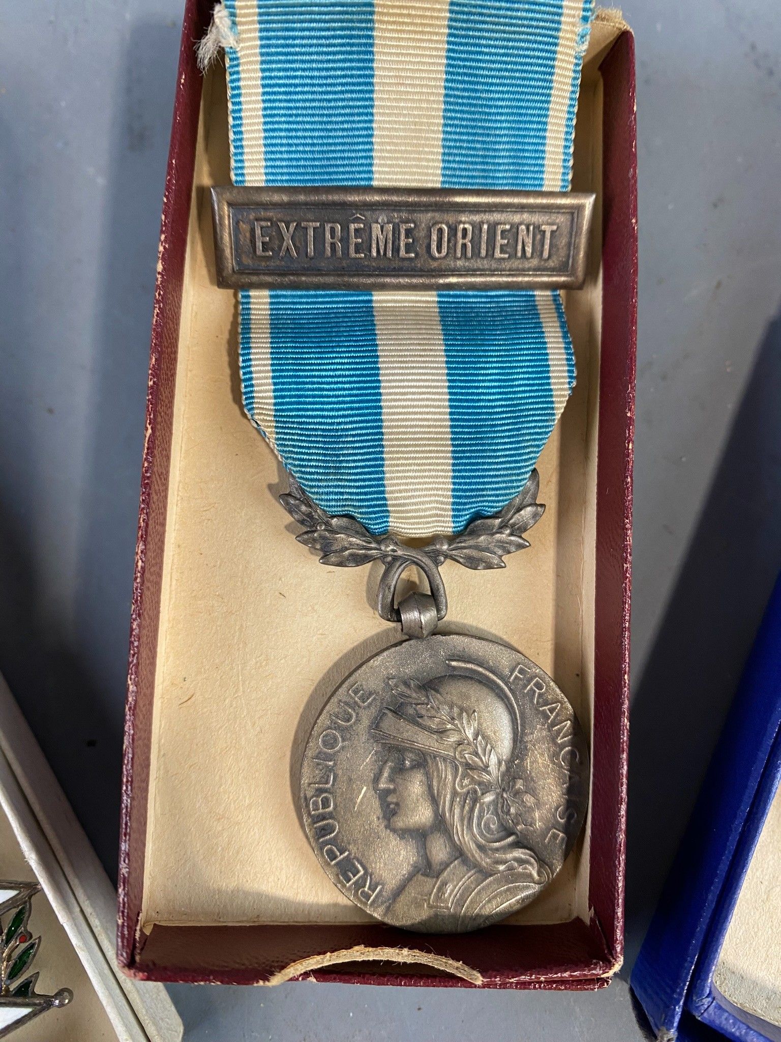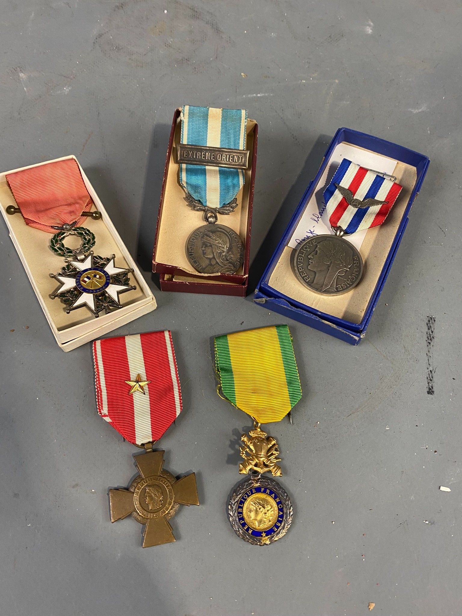 Batch of medals: a Légion d'Honneur, a military medal, a military valour cross, a Far East medal and an aviation medal.
