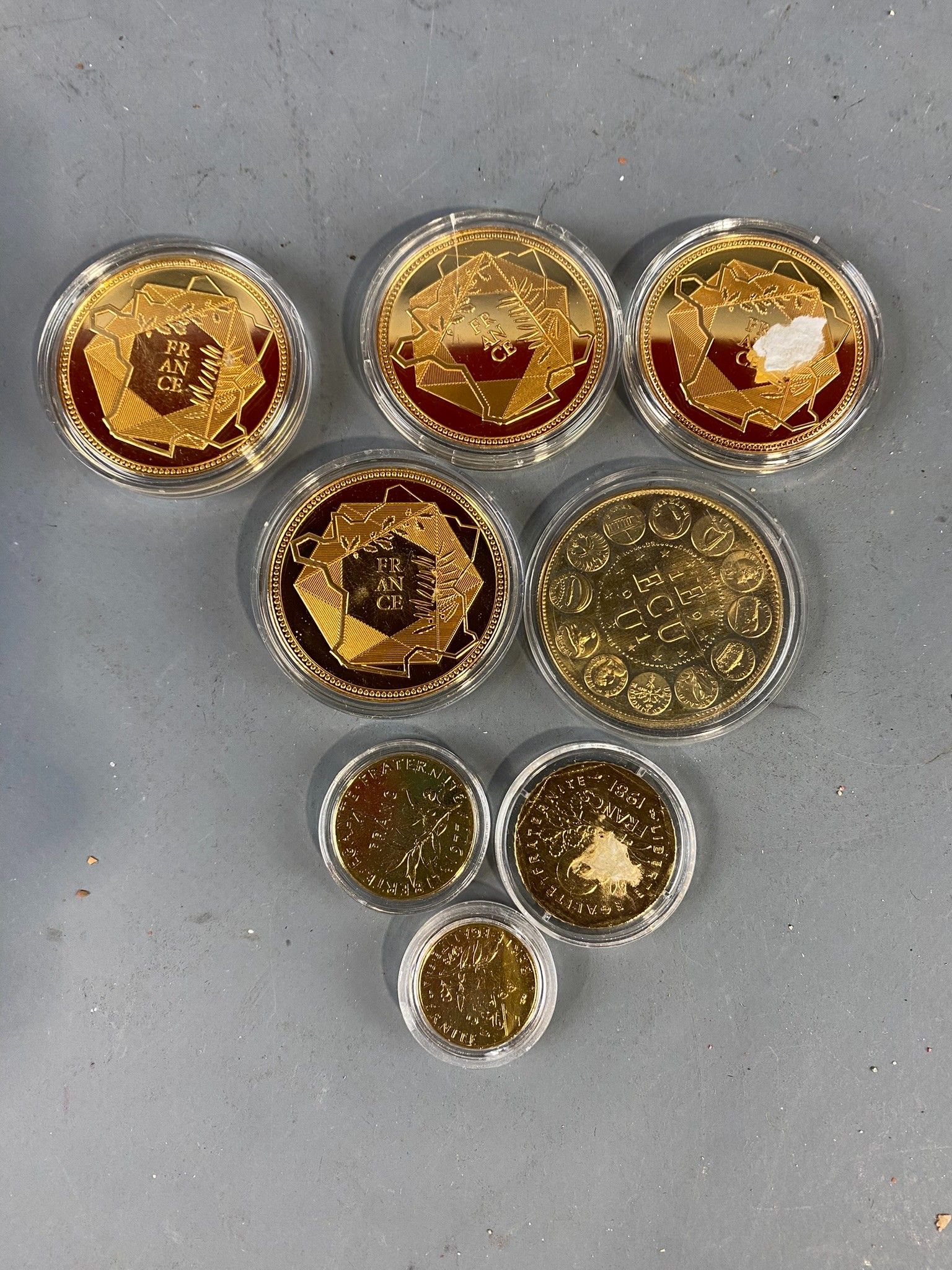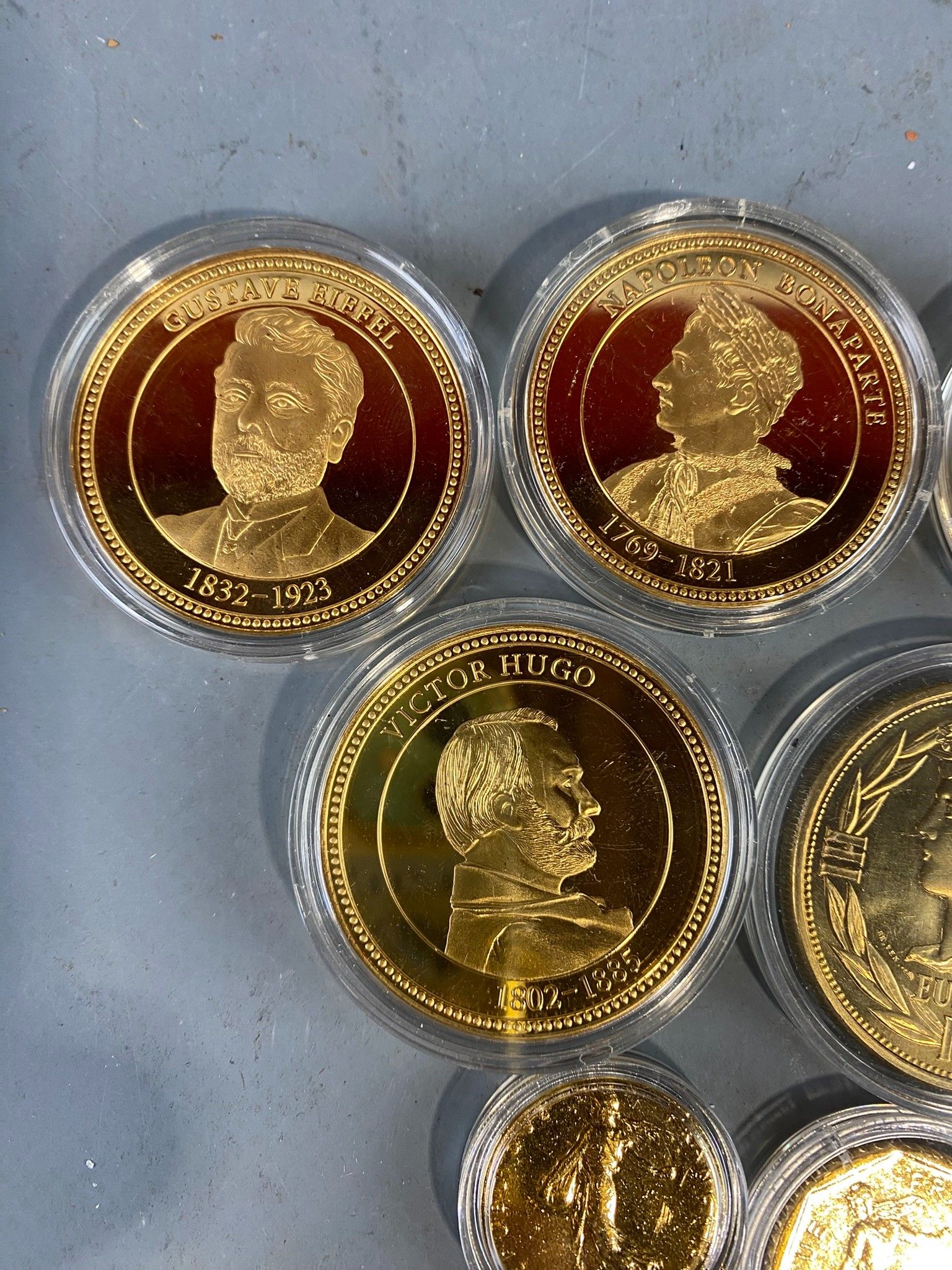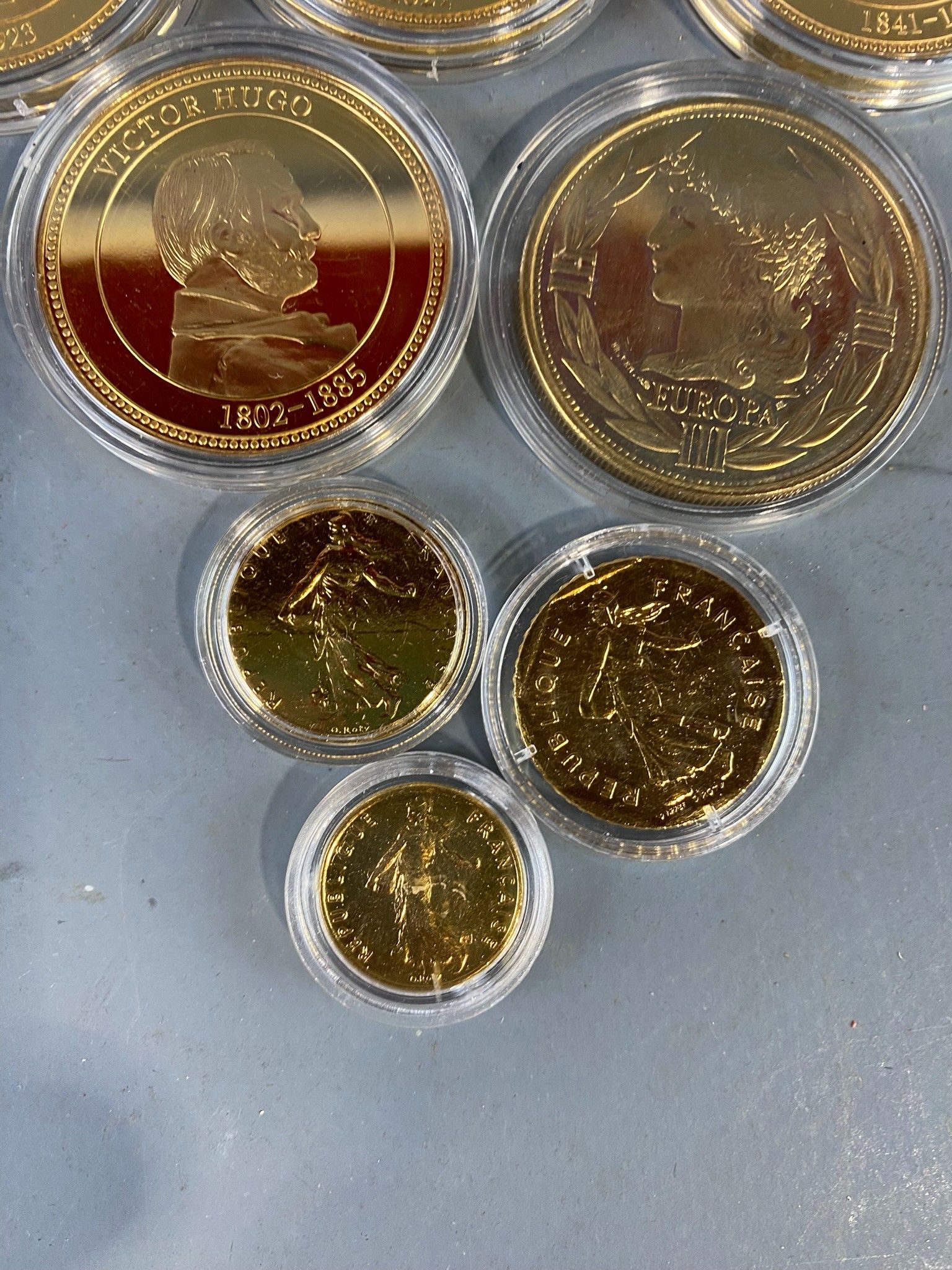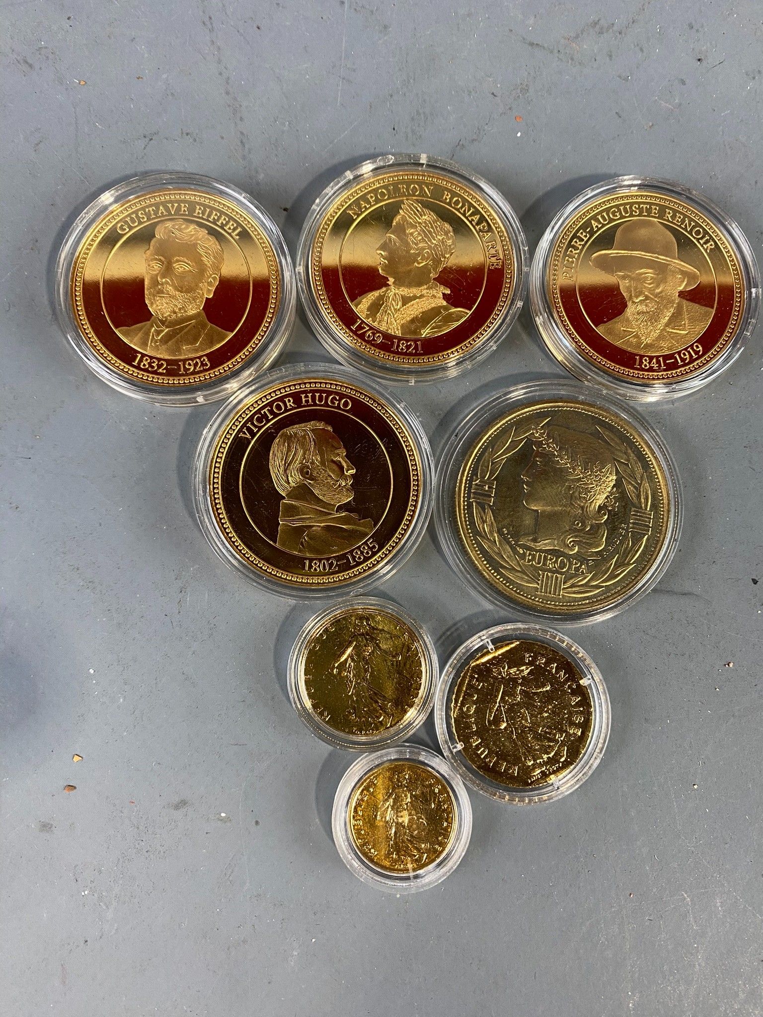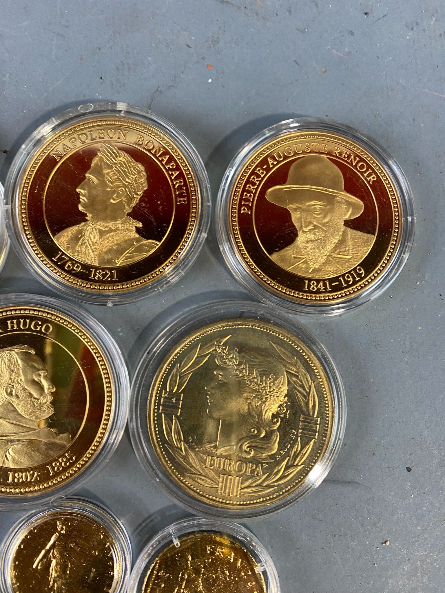 Lot of five table medals including Ecu of the European Union, Gustave Eiffel, Victor Hugo, Pierre Auguste Renoir, Napoléon Bonaparte. There are also 2 Franc, 1 Franc and 1/2 Franc coins. All in capsule.