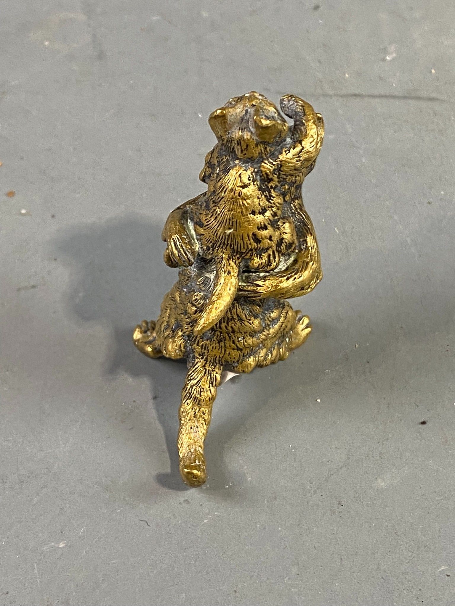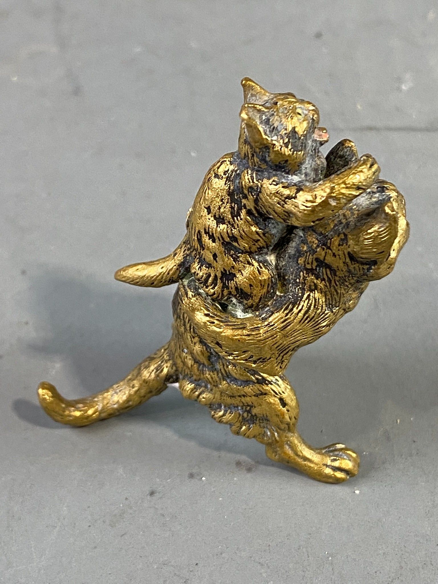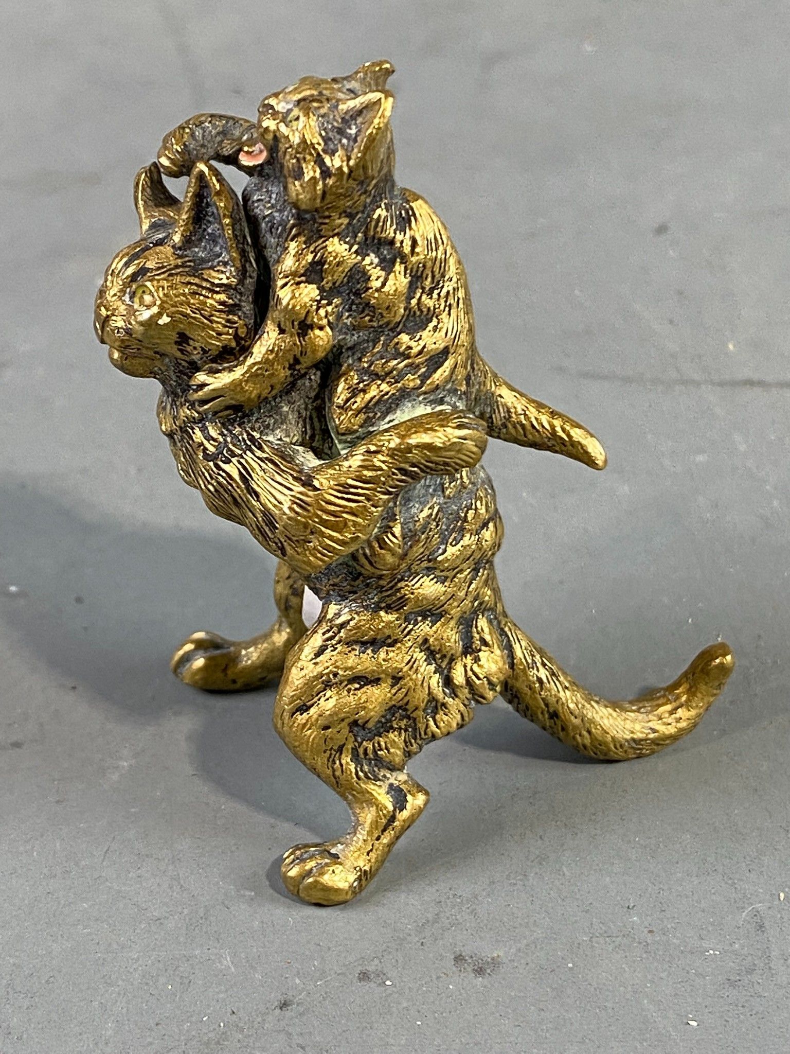An amusing caricature of two cats playing cavalry in bronze from Vienna. Height: 6 cm. Unfortunately depatinated