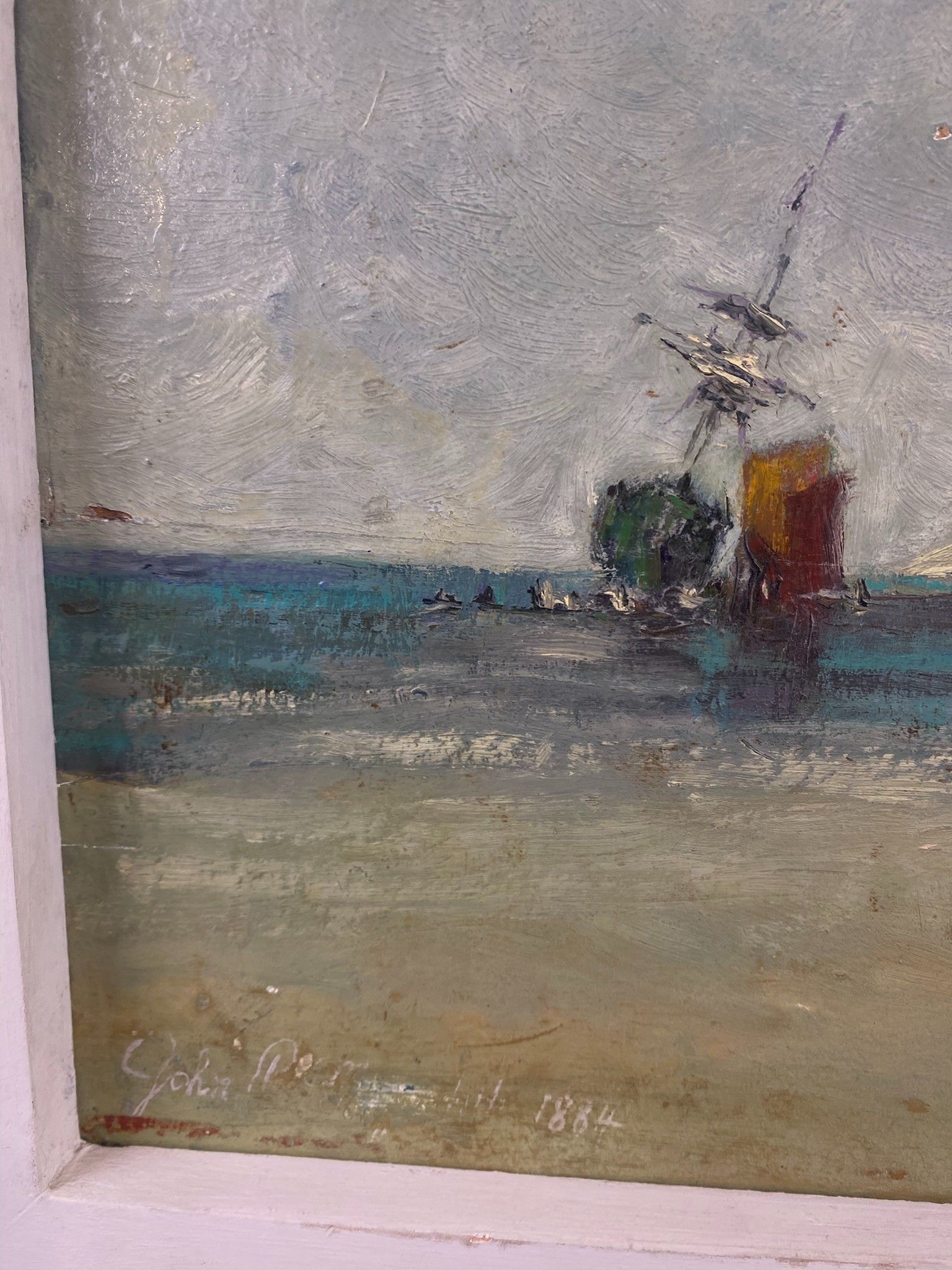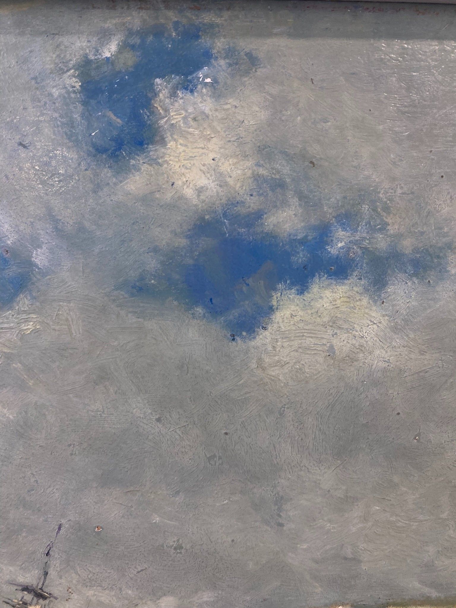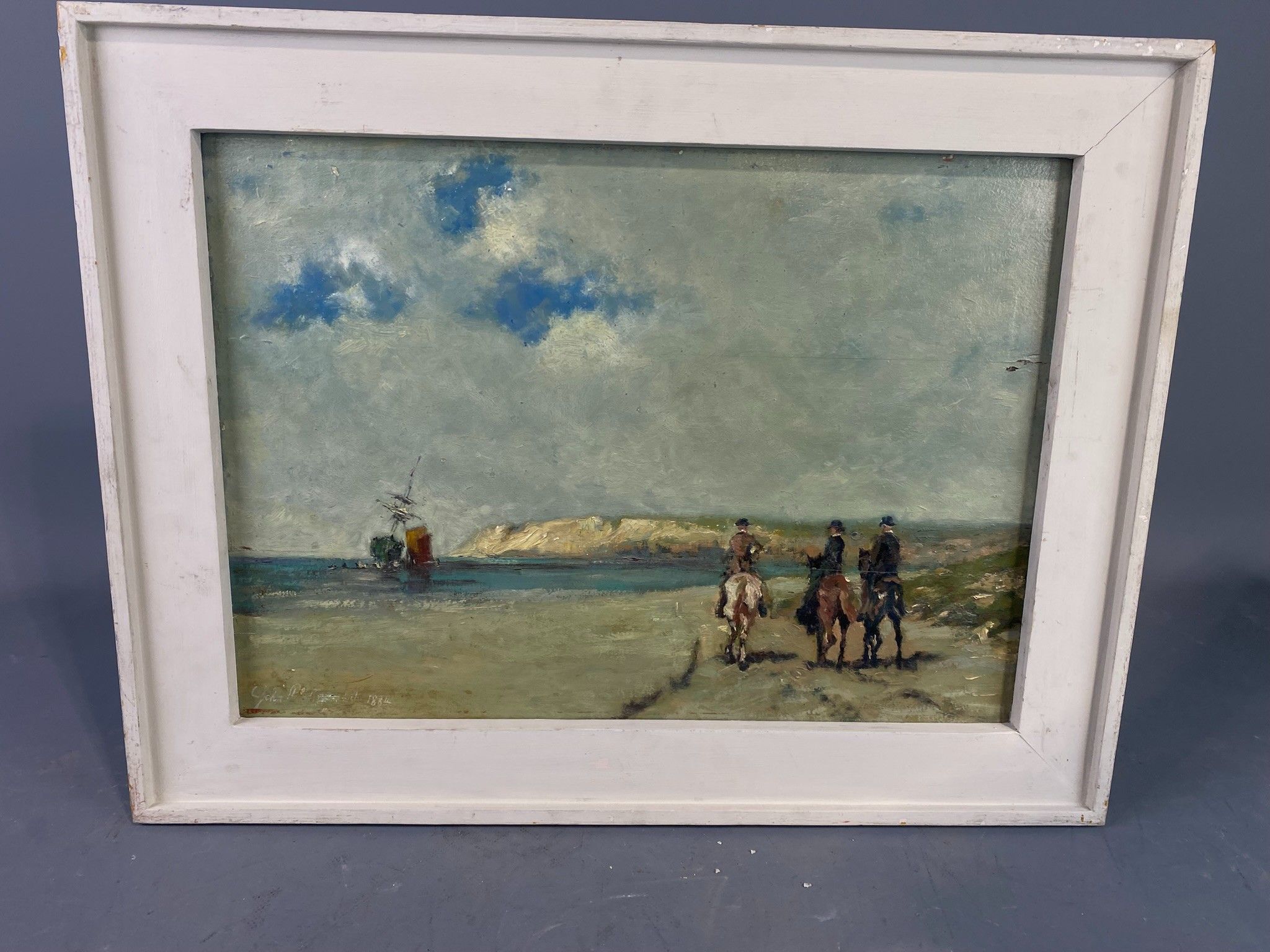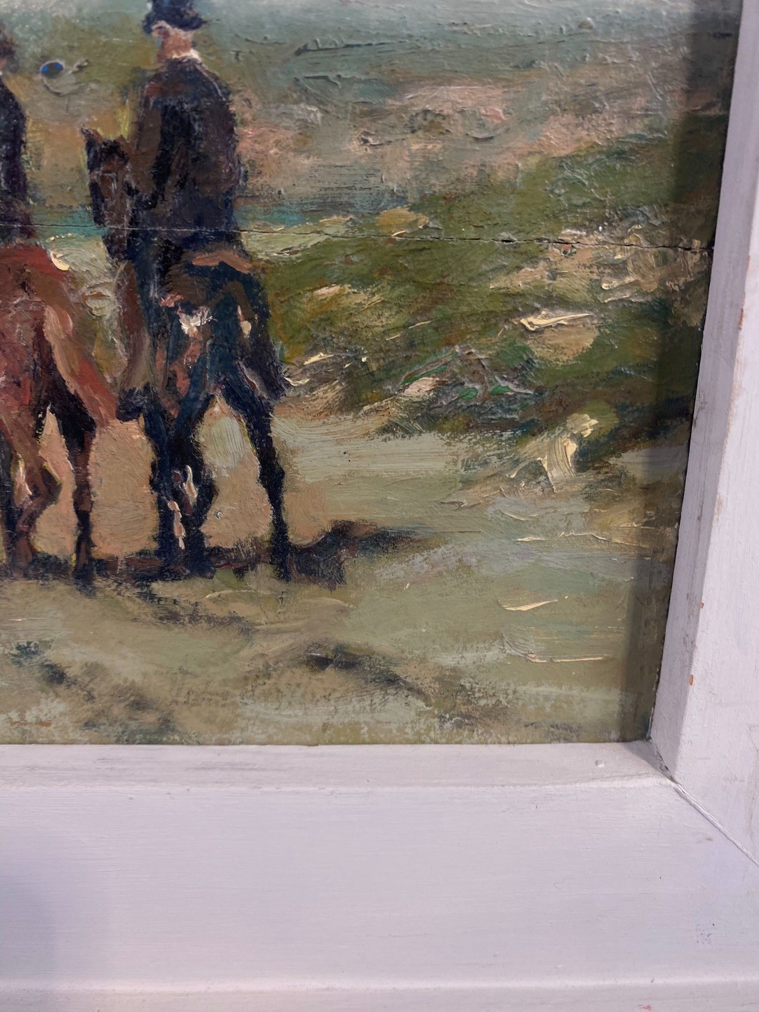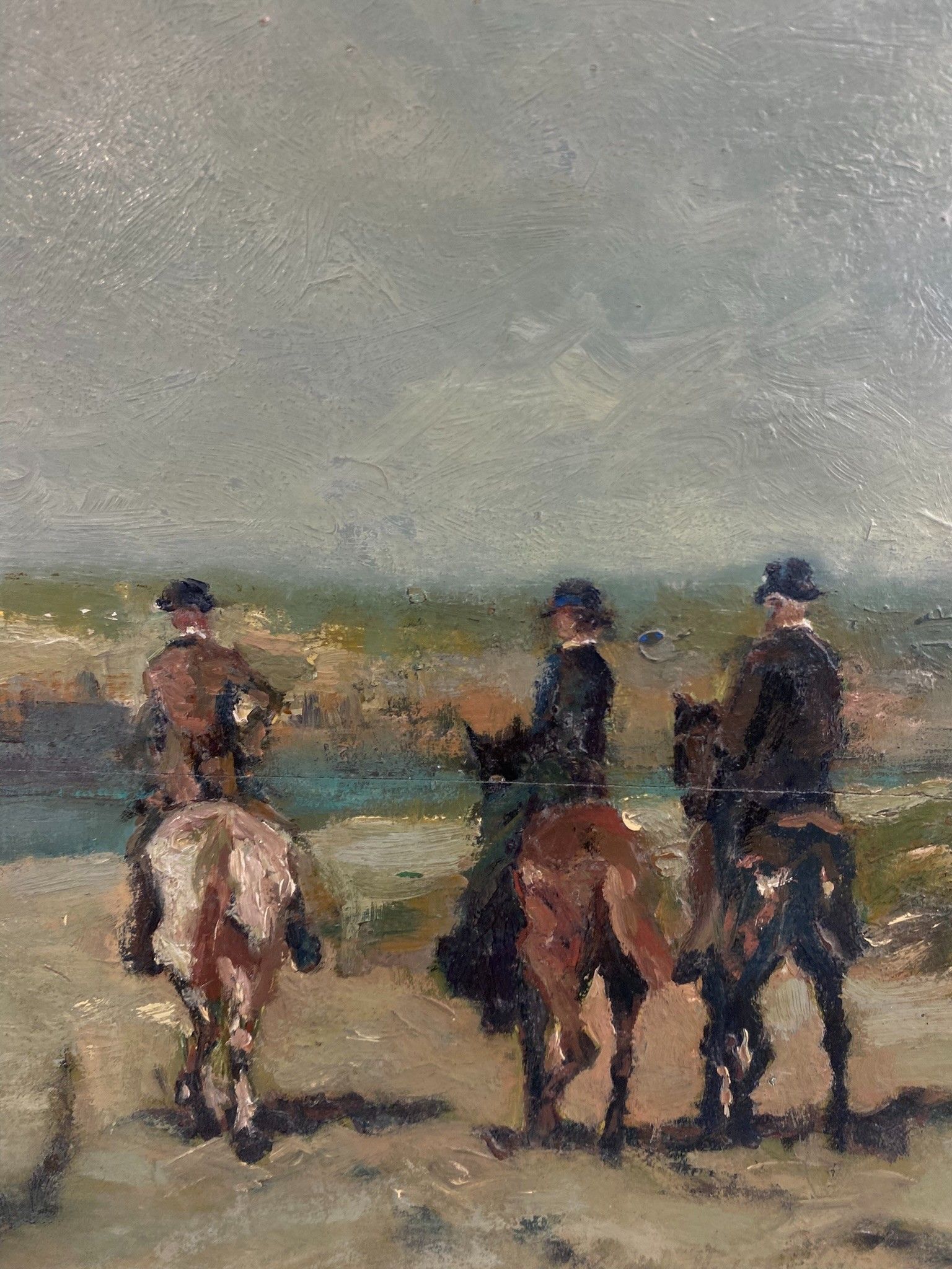 Late 19th century school after Eugène BOUDIN: "Trois cavaliers sur la grève". Oil on panel, trace of signature and date lower left (1884?), 33 x 46 cm, horizontal cracks