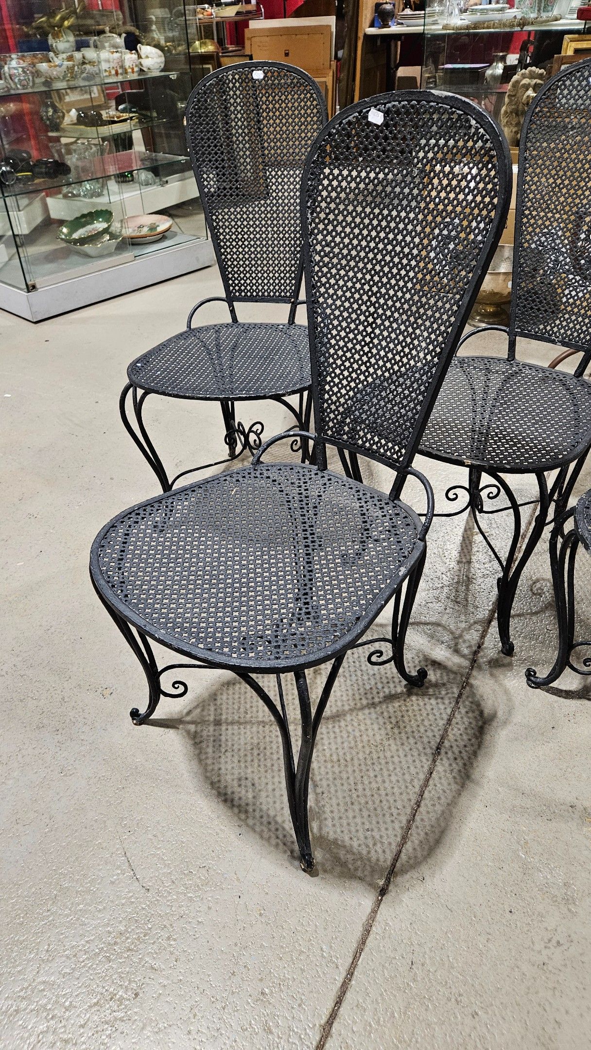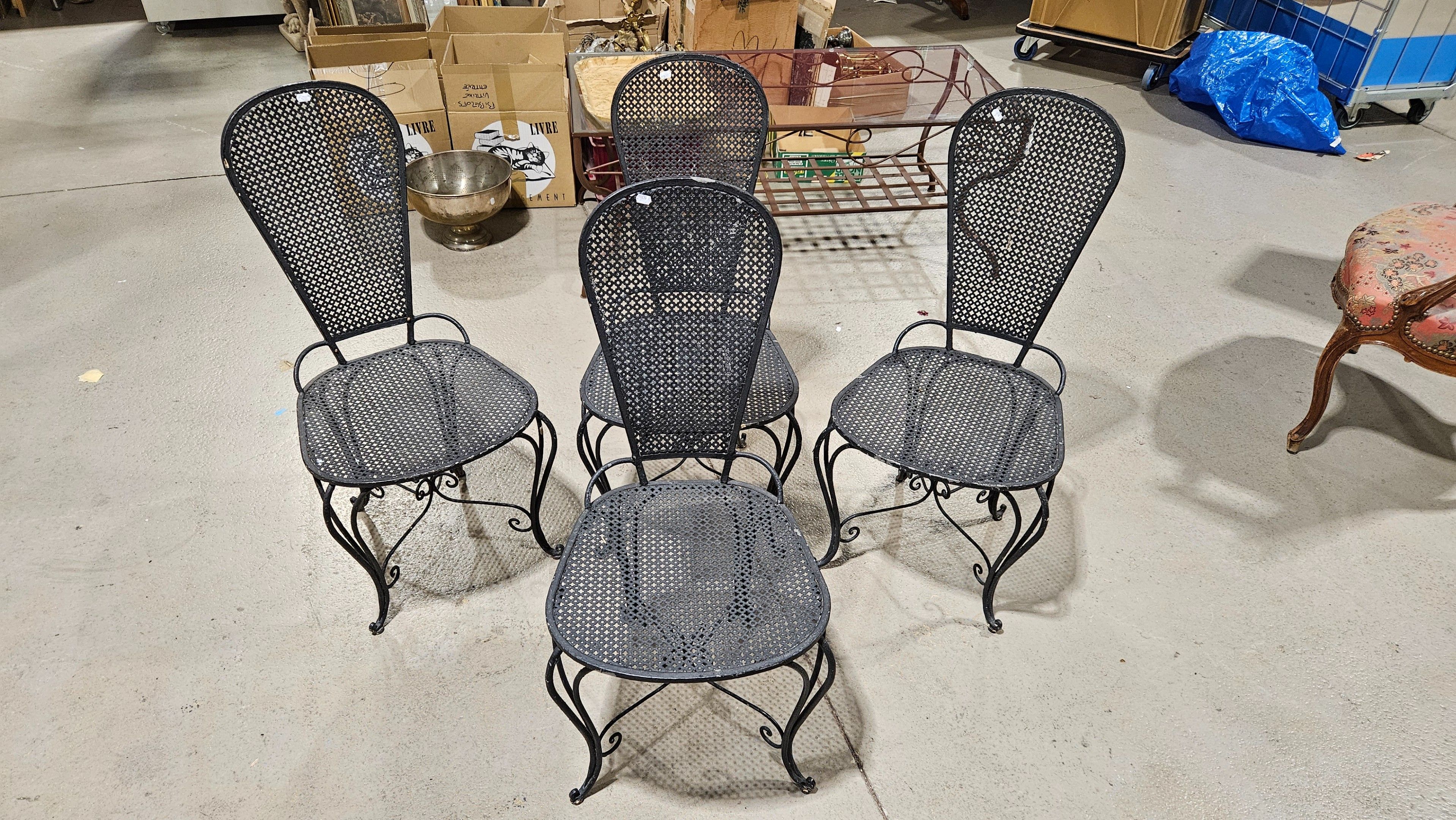 Set of four low wrought-iron chairs from the 1960s, black lacquered, with seat and racket back in sheet metal with a cloverleaf motif. height: 84 cm