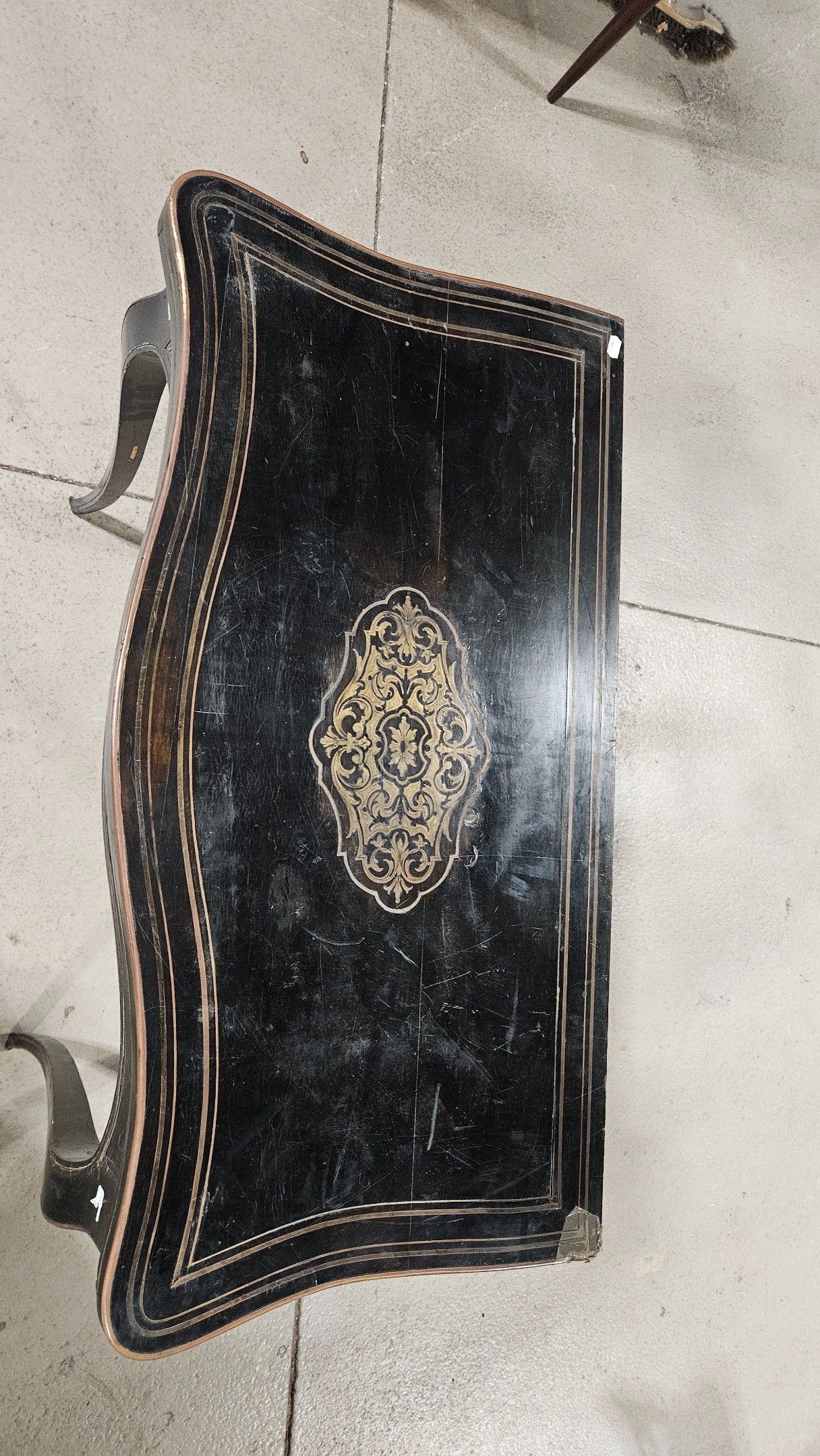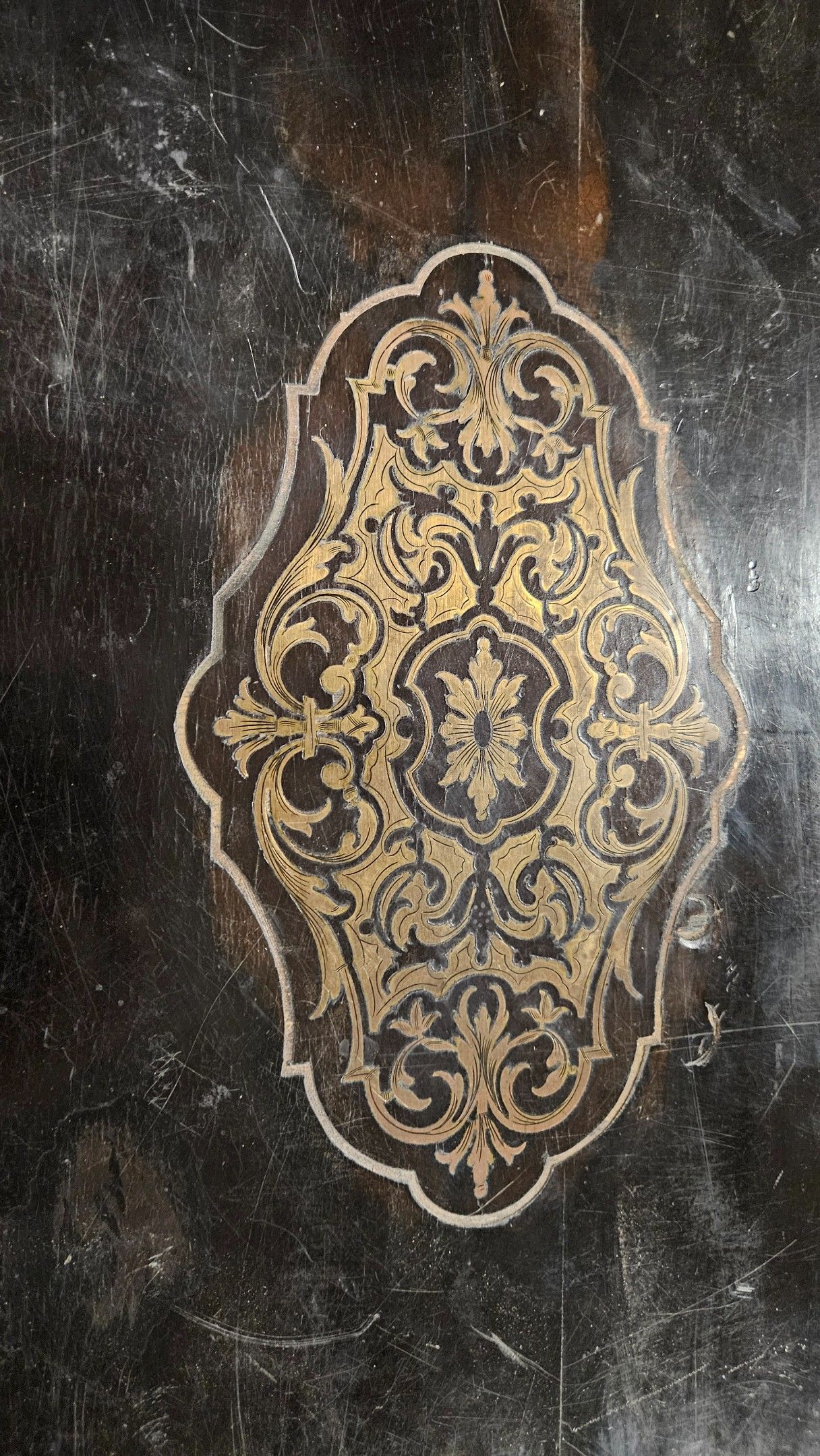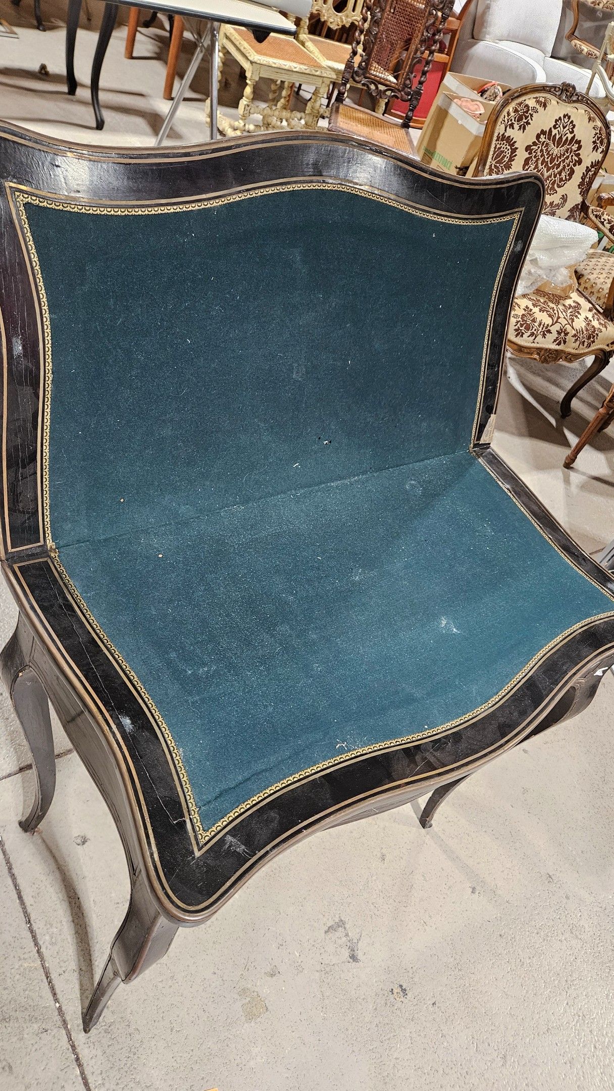 Napoleon III games table in blackened wood veneer and brass fillet inlay, including escutcheon on top. 76 x 82.5 x 43 cm. Inside top lined with velvet (as is). Misses and small accidents