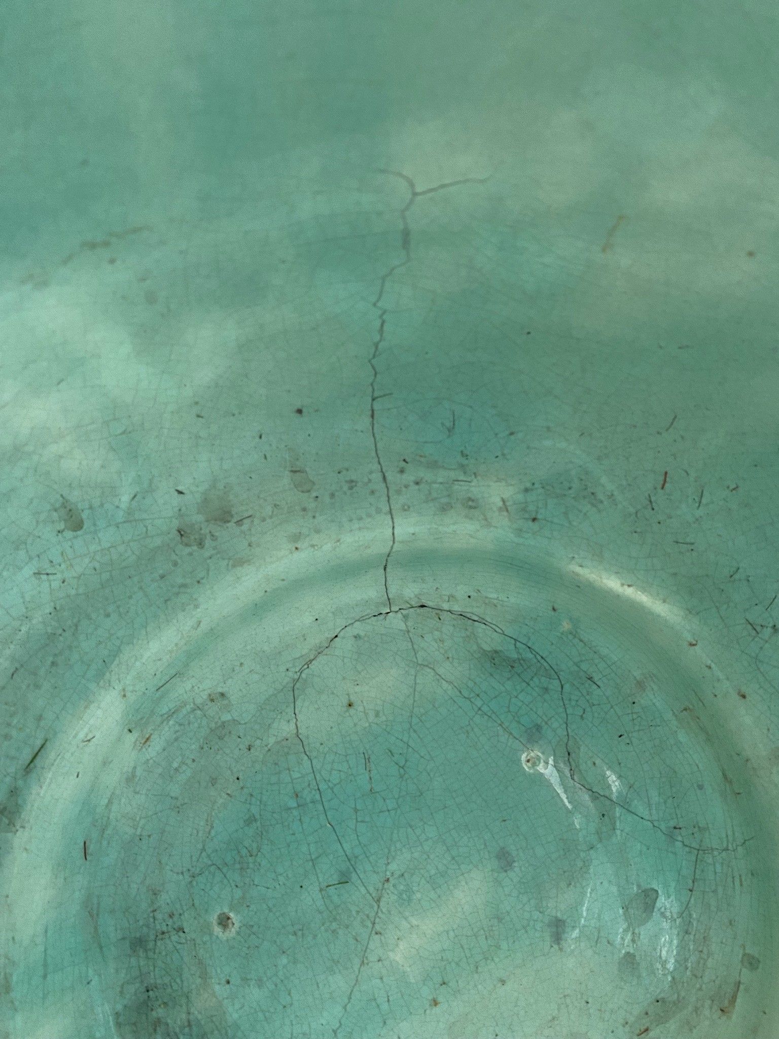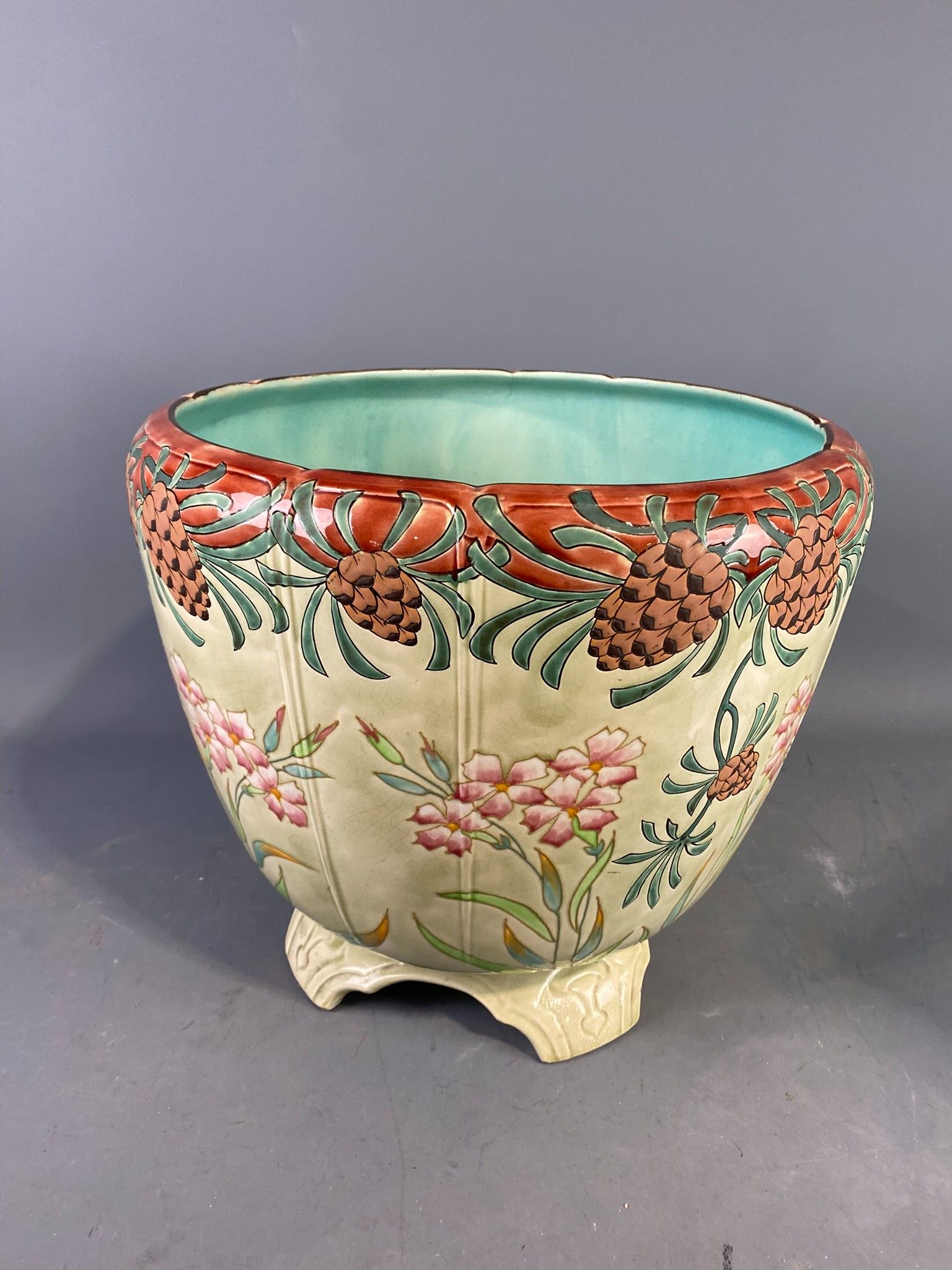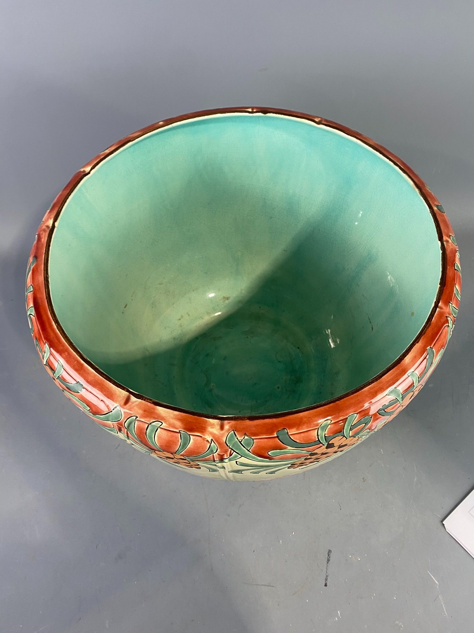 An early 20th century slipware pot with polychrome floral decoration. One crack. Diameter: 40 cm, height: 35 cm