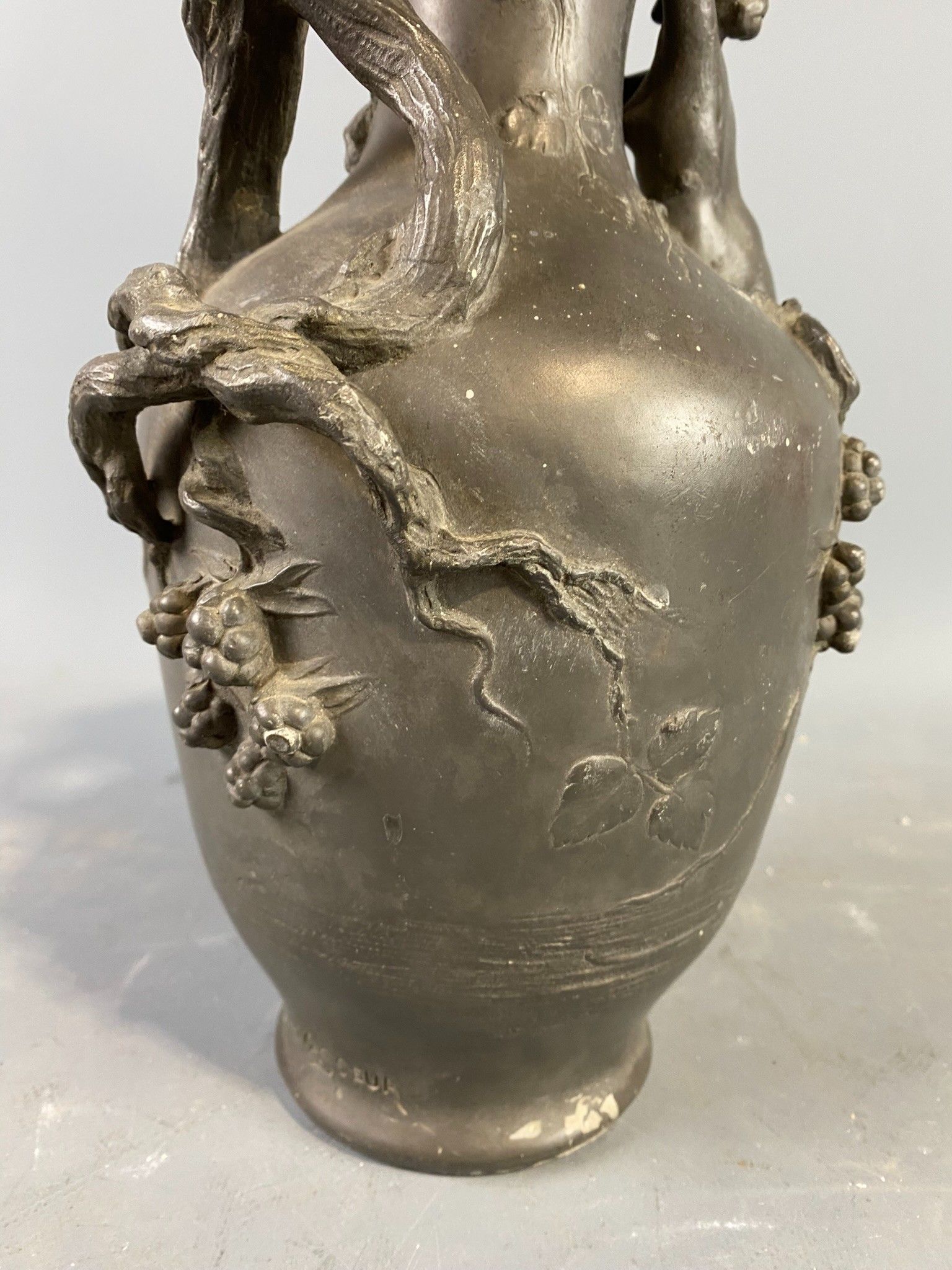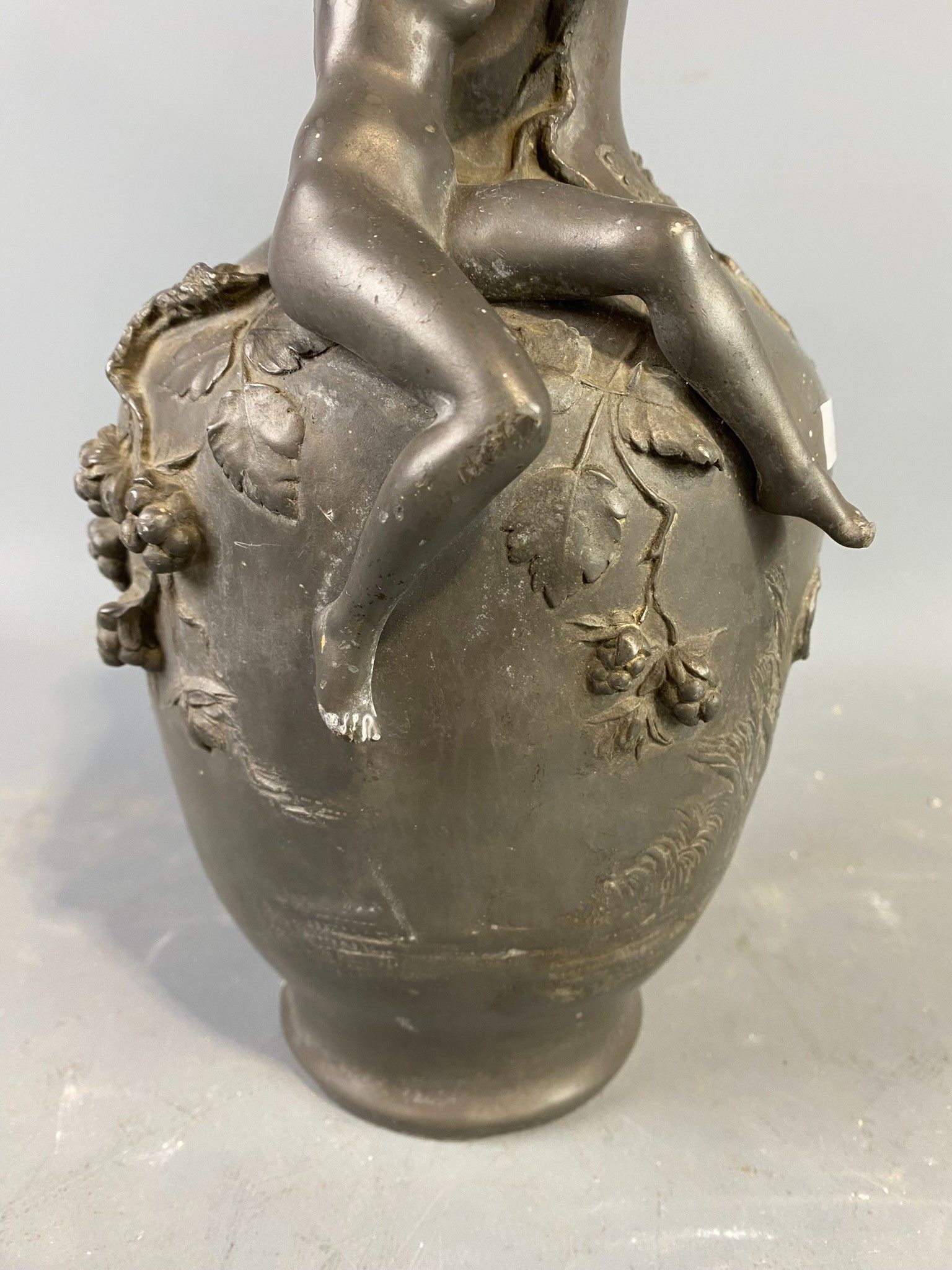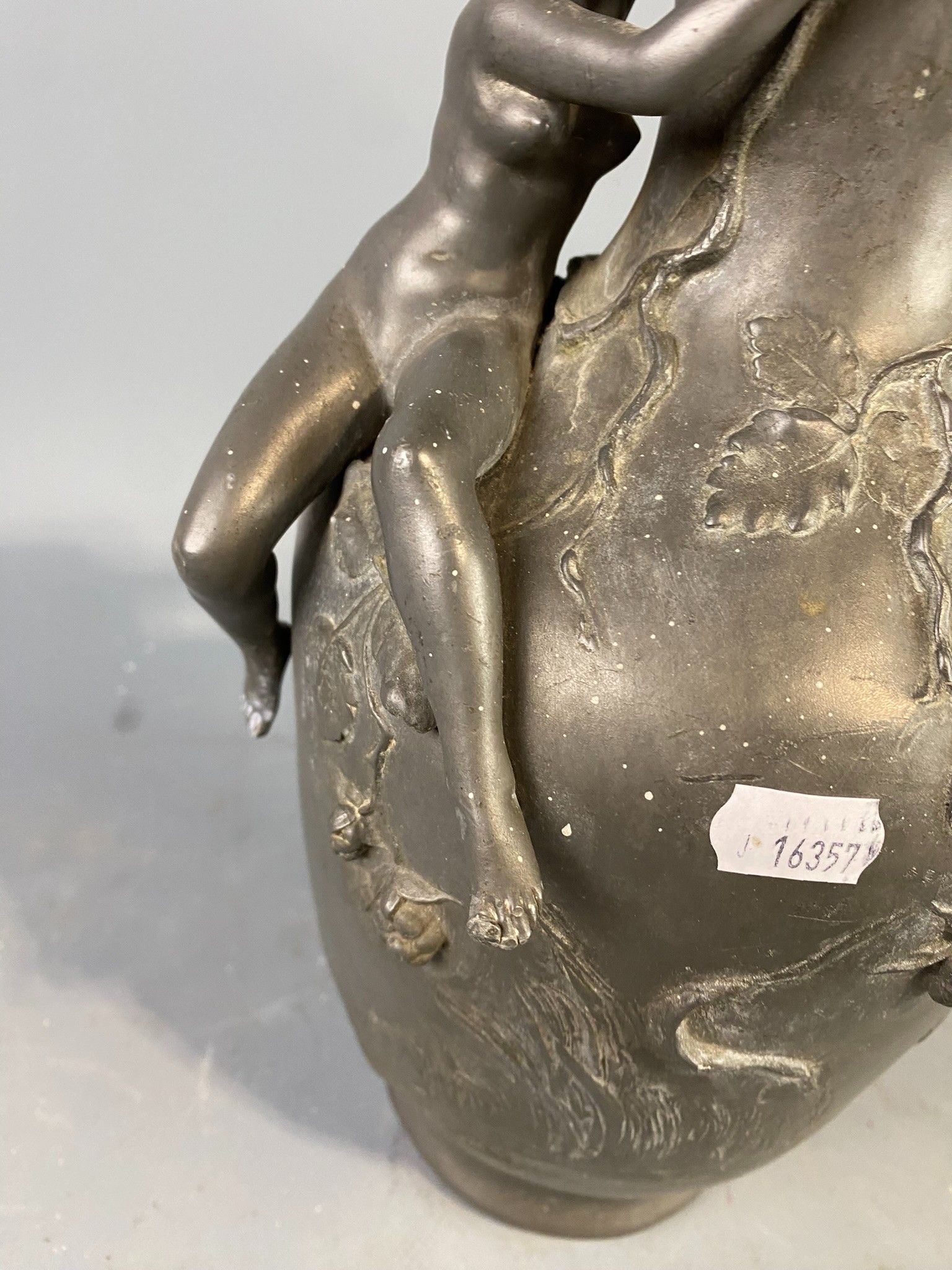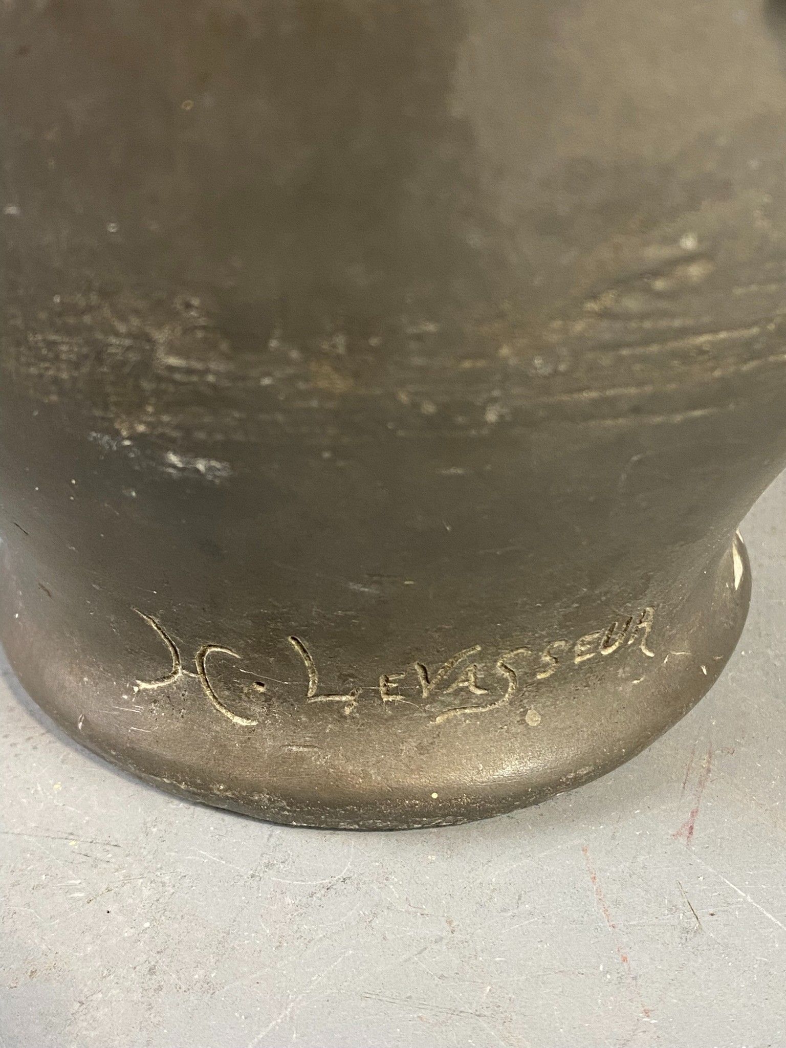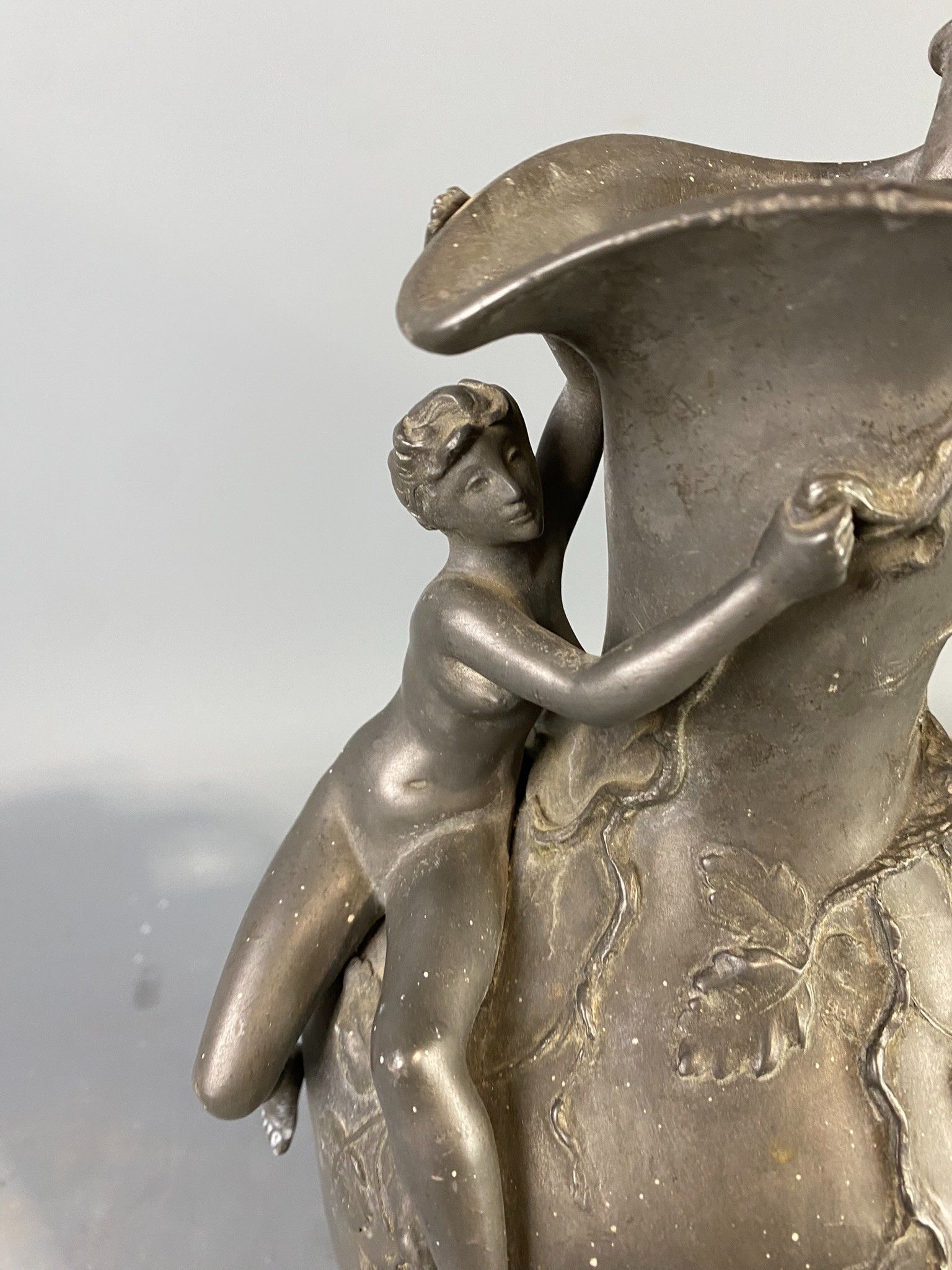 Elegant pewter ewer from the Art Nouveau period with a flower woman after Levasseur. It is inscribed 1873 15 novembre 1898. The lid is missing. Height: 32 cm