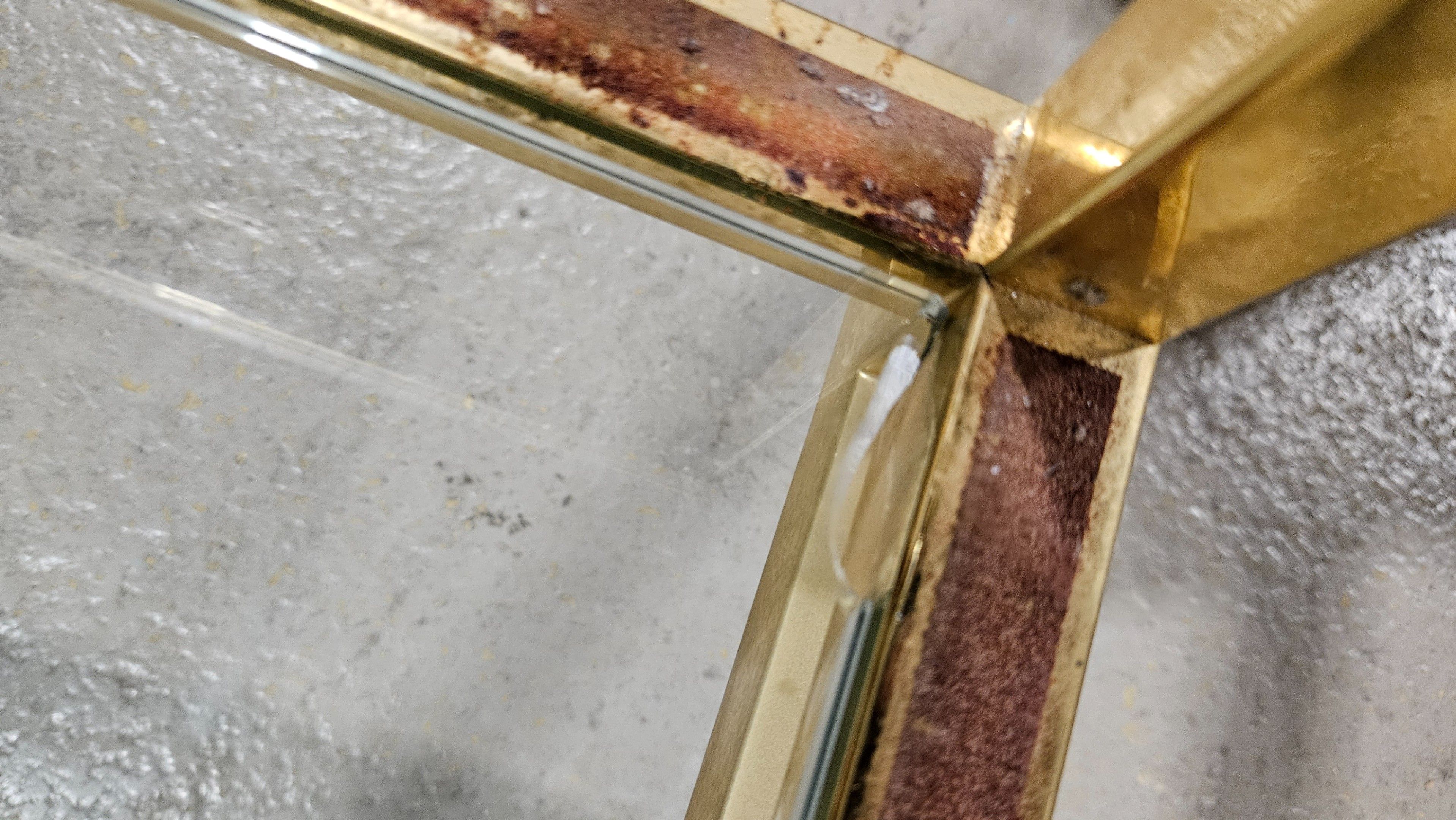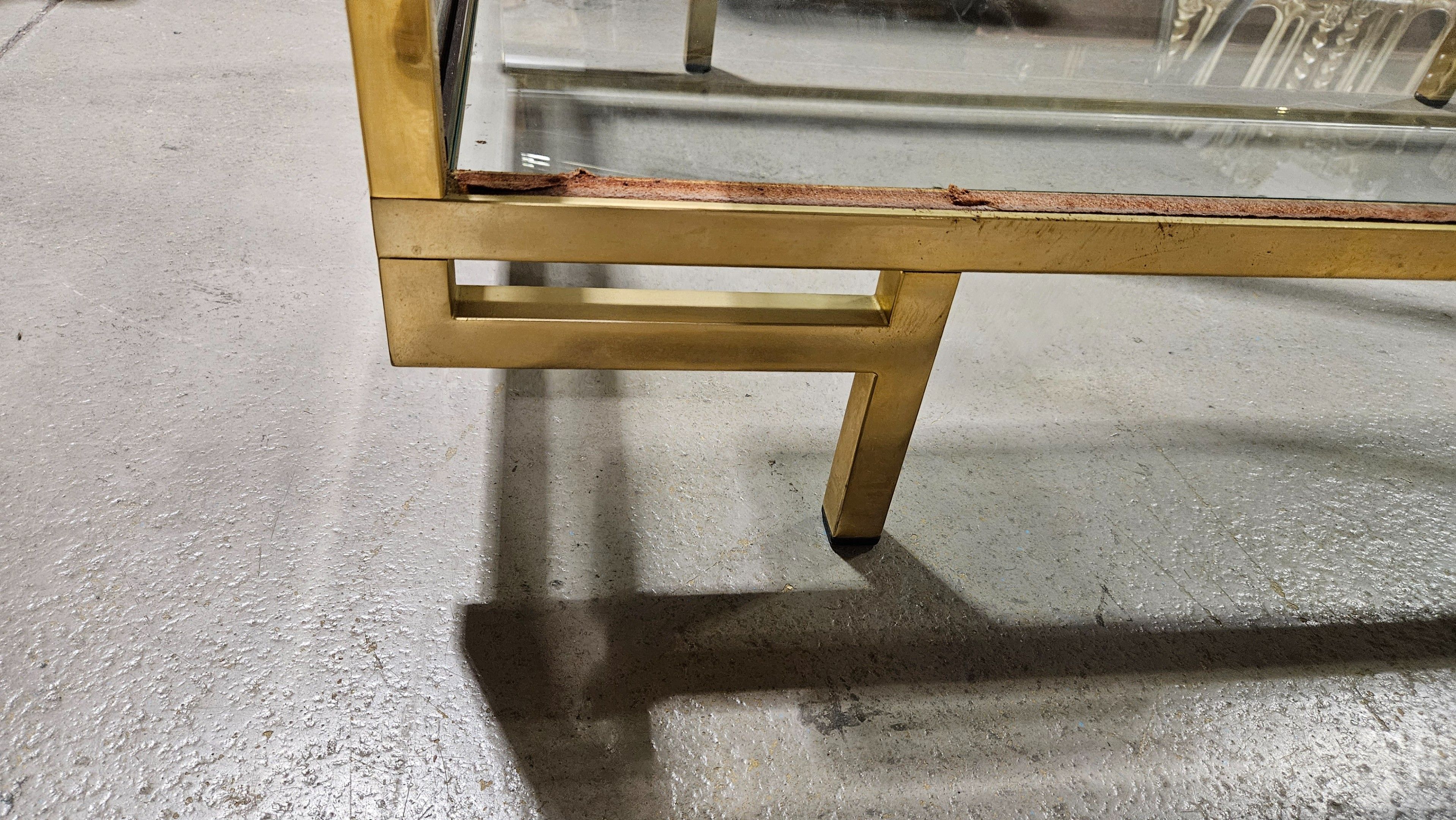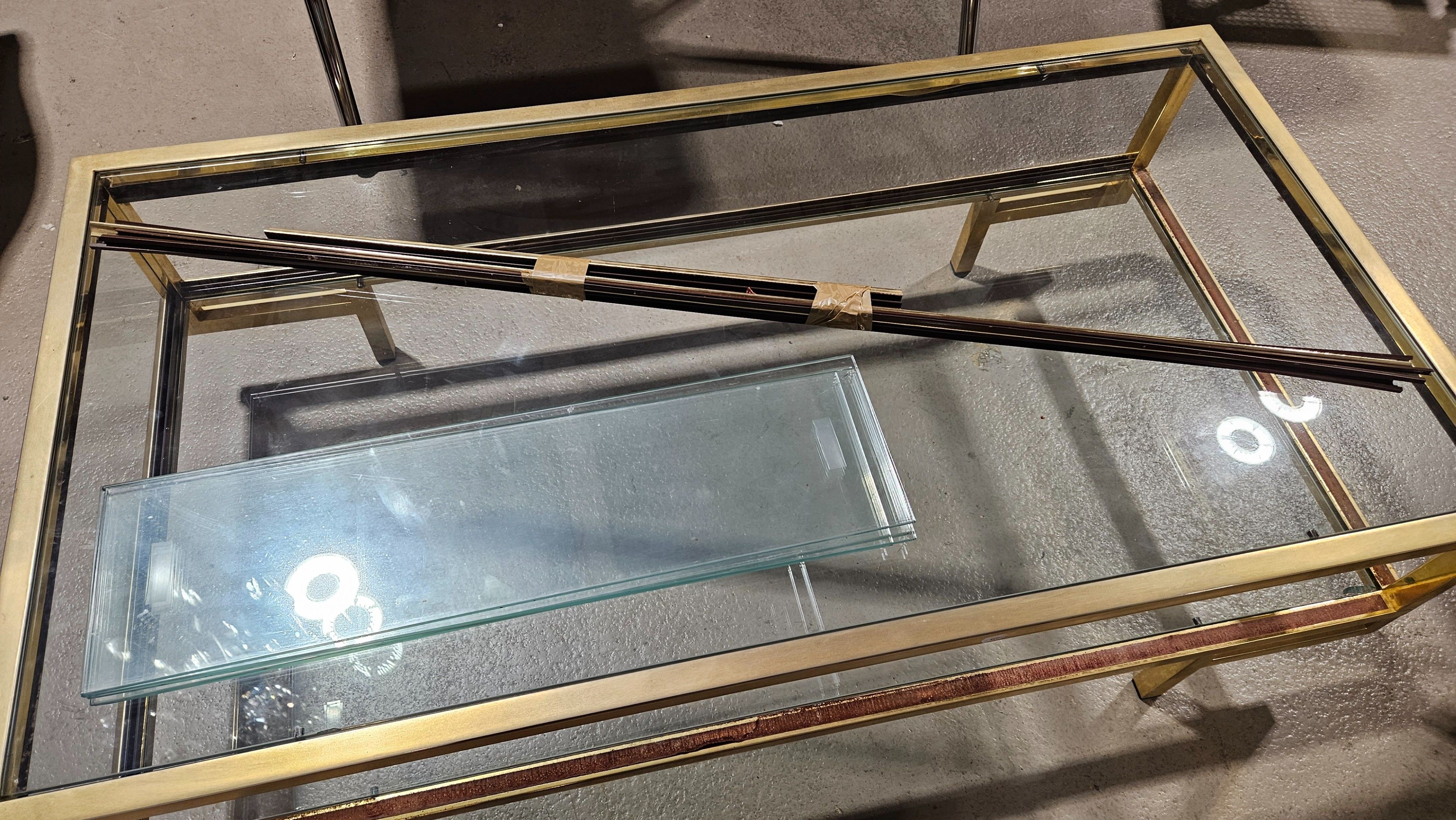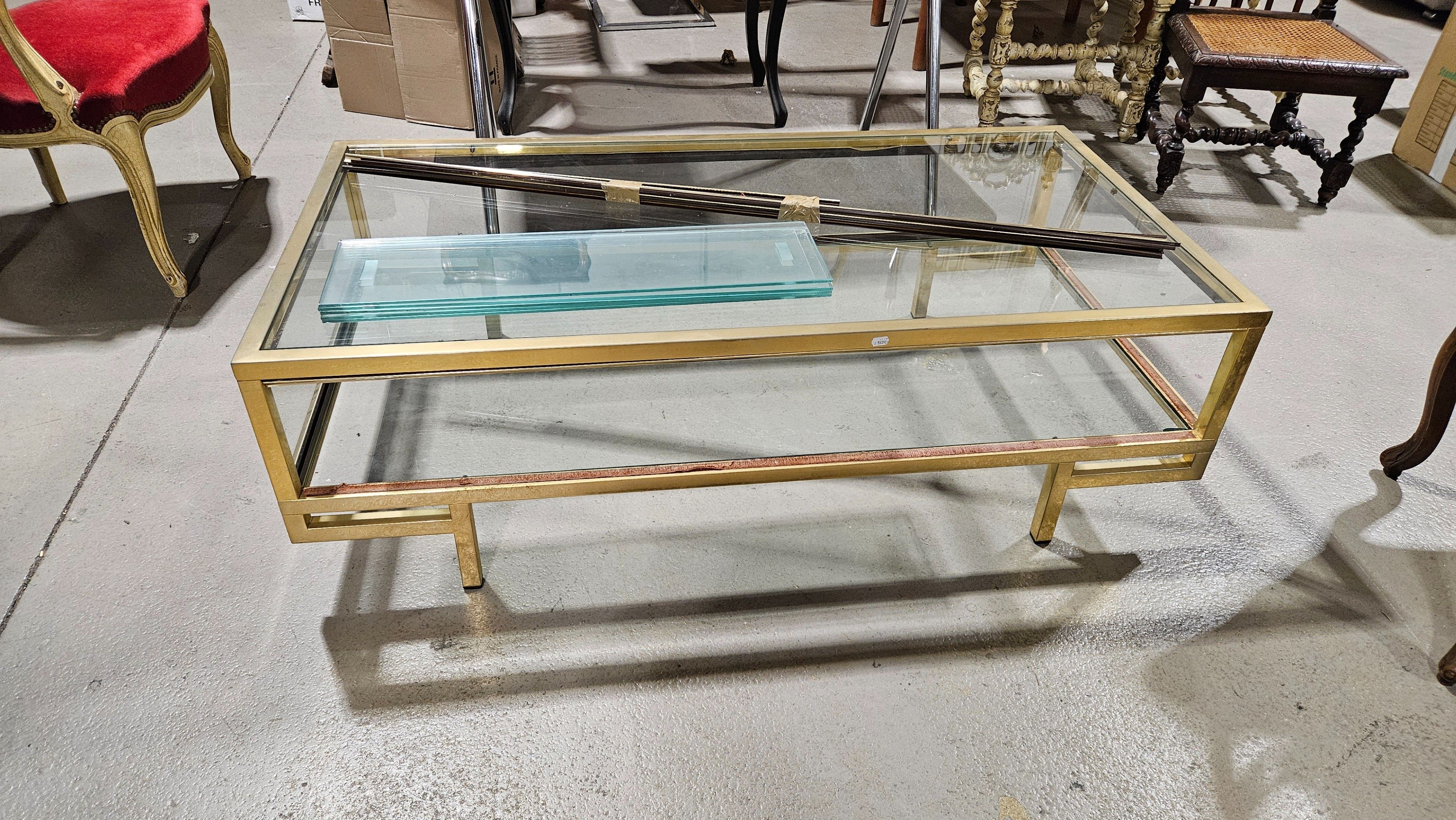 Rectangular coffee table in gilded metal and glass forming a display case. 39 x 125 x 65 cm. Sliders to be reattached, a chip in the corner of one of the two large glass slabs.