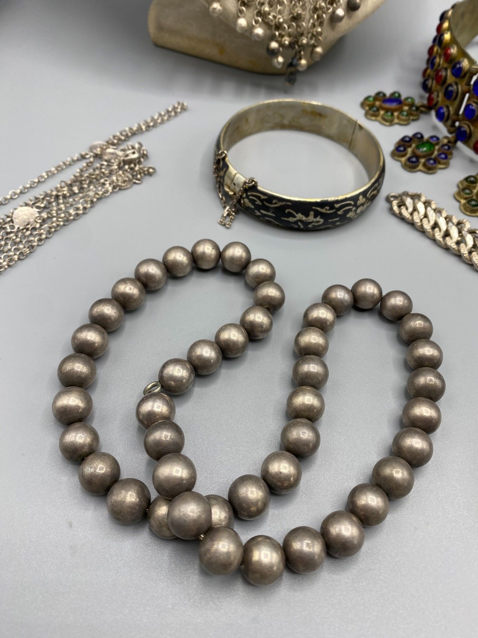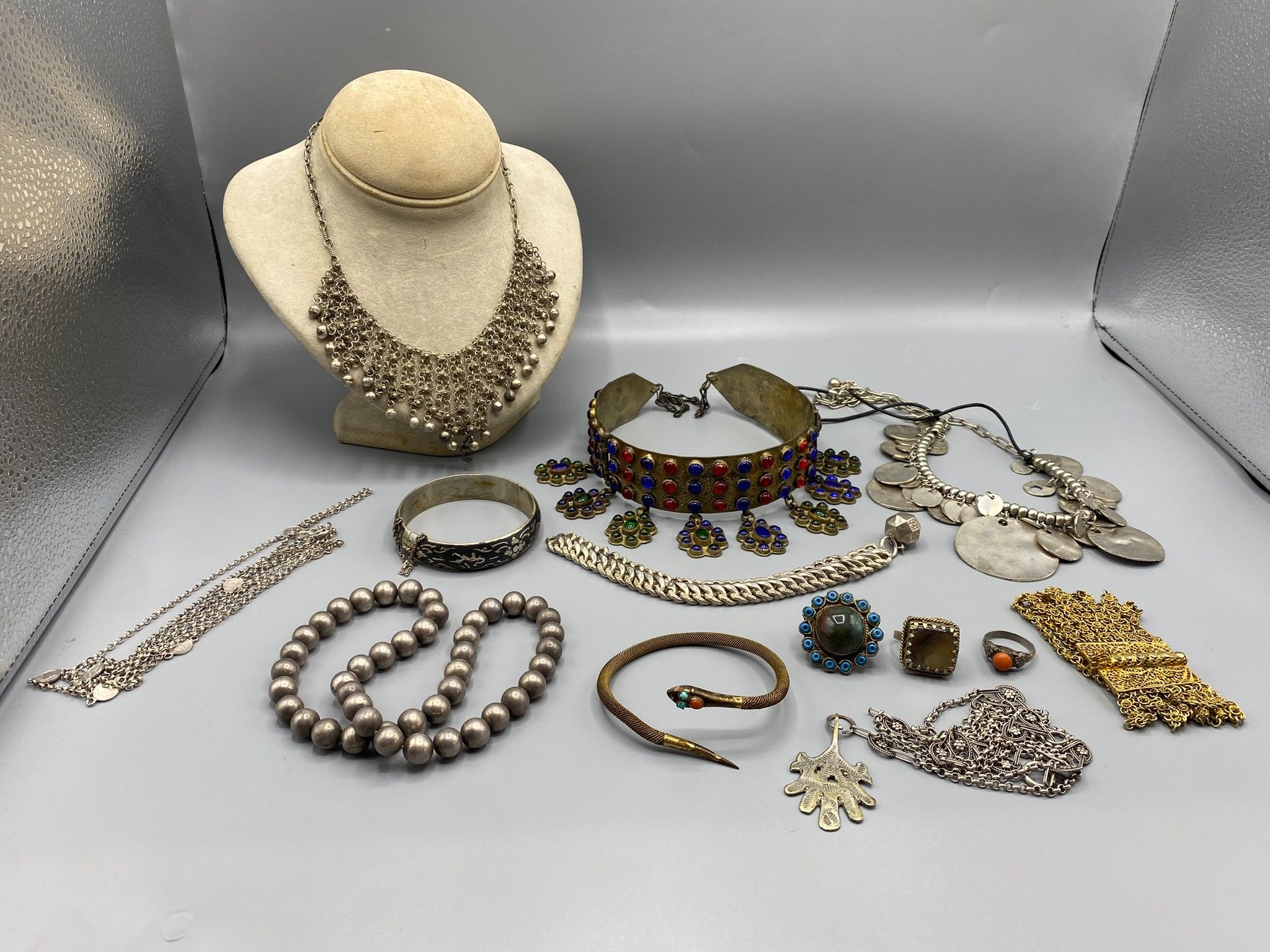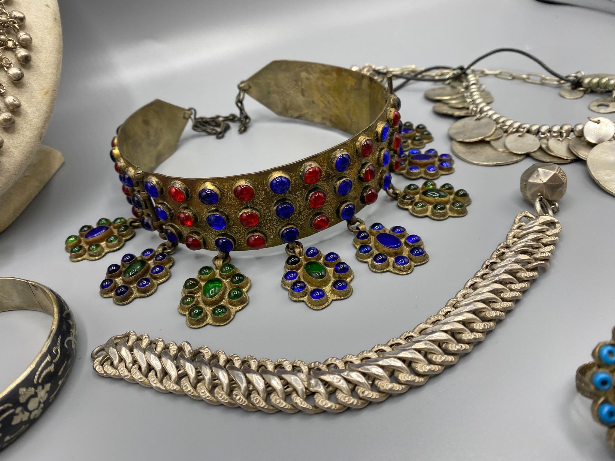 Lot of traditional jewellery made of various metal alloys (no title guarantee), fine stones and glassware, including a headdress ornament (red and blue beads), 3 rings, a rigid bracelet with a niello background, a gilded snake bracelet, a bracelet with a faceted ball charm, a gilded metal ribbon bracelet with a stick clasp, a ball necklace, 2 drapery necklaces with rich disc decoration and 2 long chains.