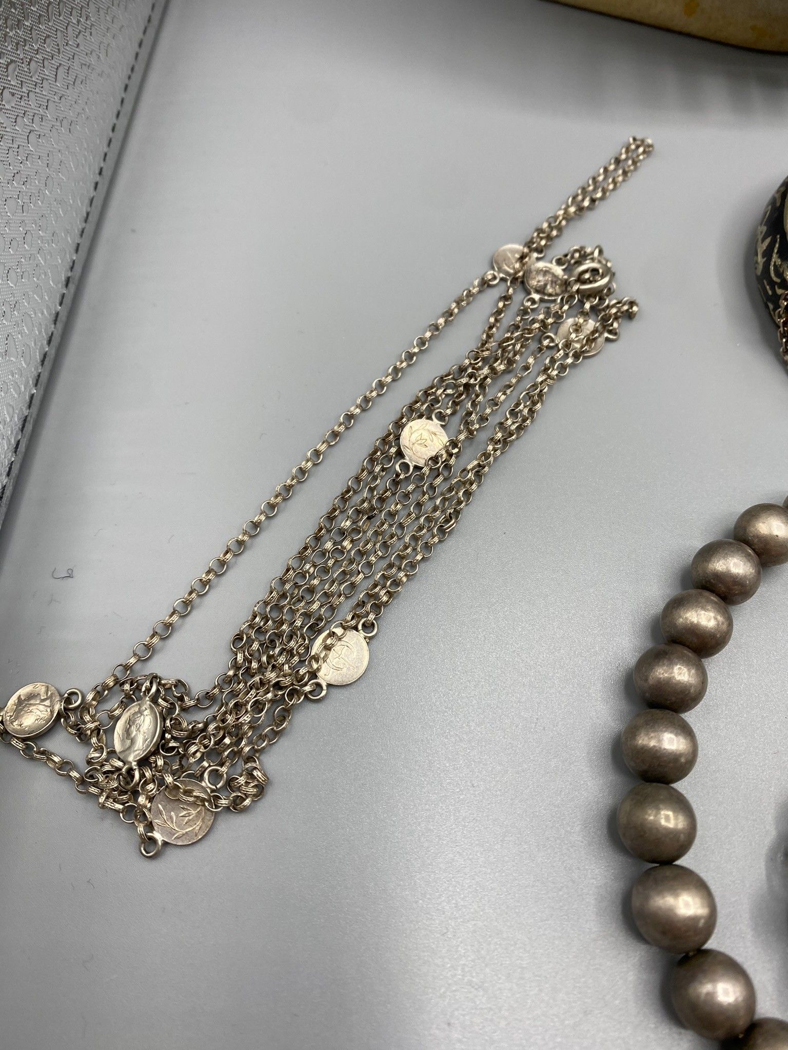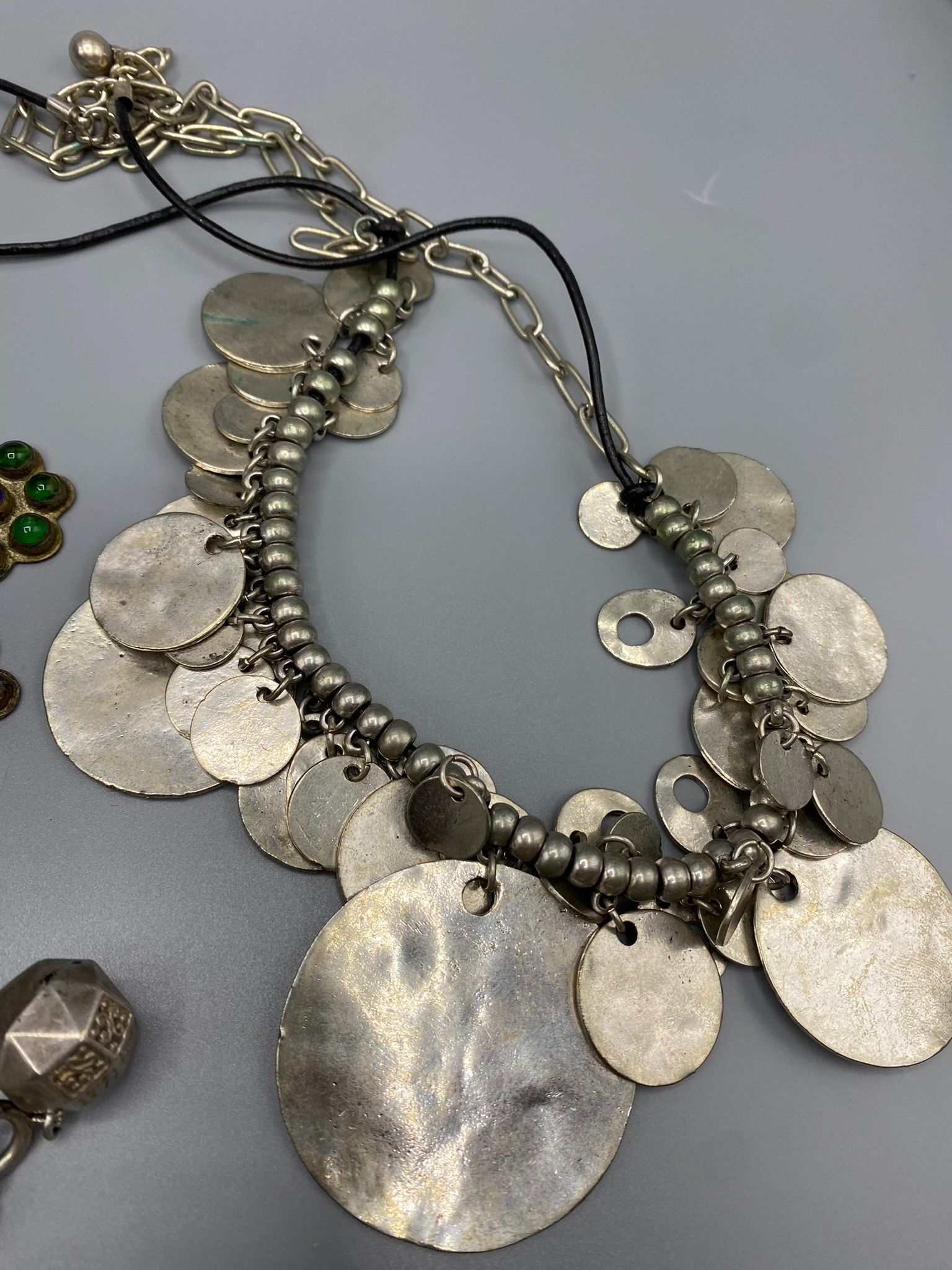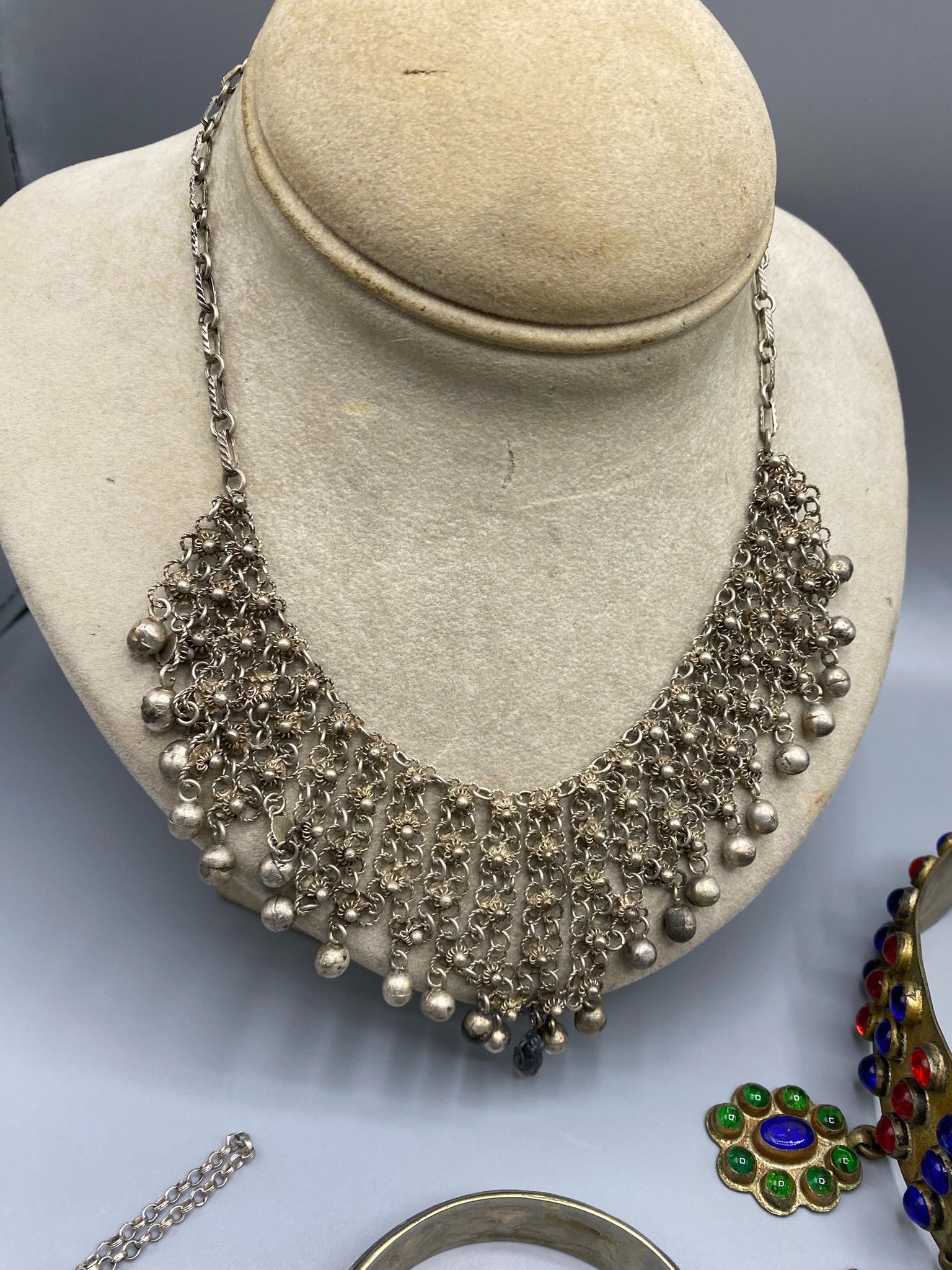 Lot of traditional jewellery made of various metal alloys (no title guarantee), fine stones and glassware, including a headdress ornament (red and blue beads), 3 rings, a rigid bracelet with a niello background, a gilded snake bracelet, a bracelet with a faceted ball charm, a gilded metal ribbon bracelet with a stick clasp, a ball necklace, 2 drapery necklaces with rich disc decoration and 2 long chains.