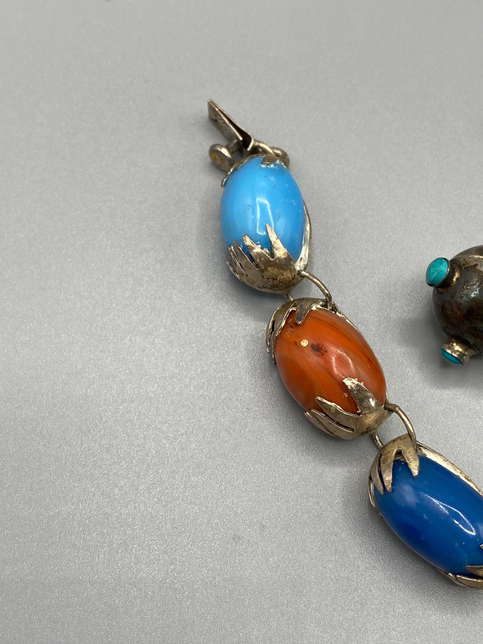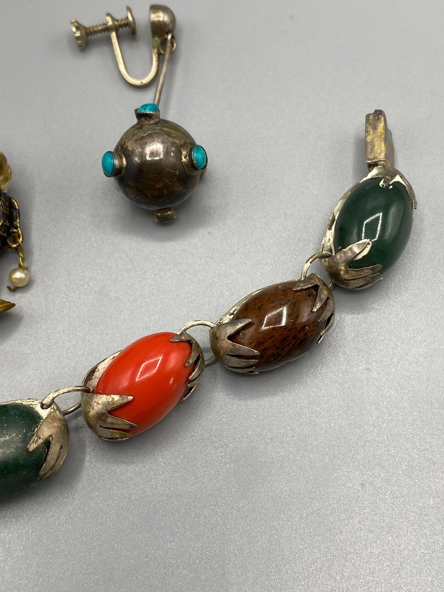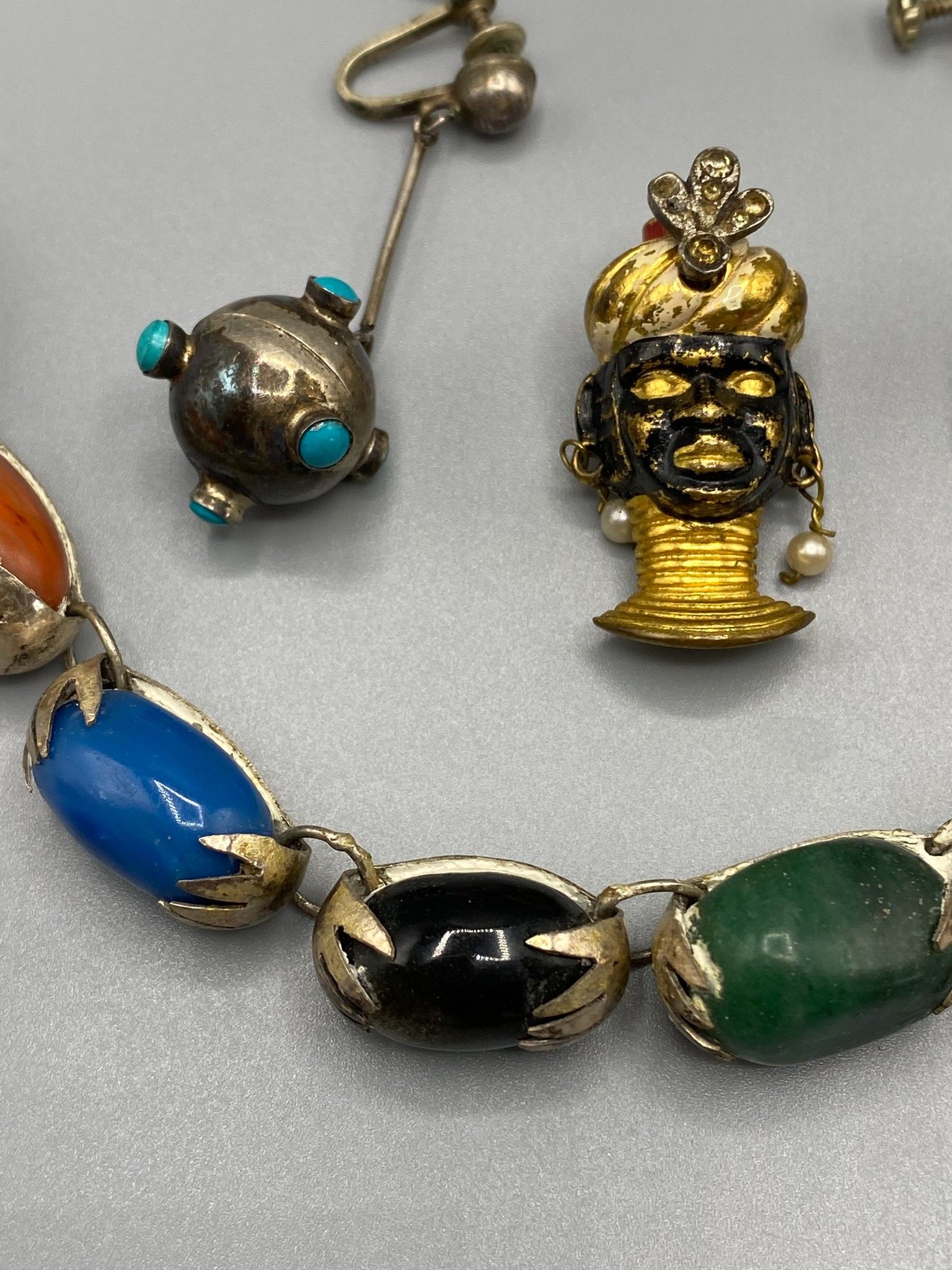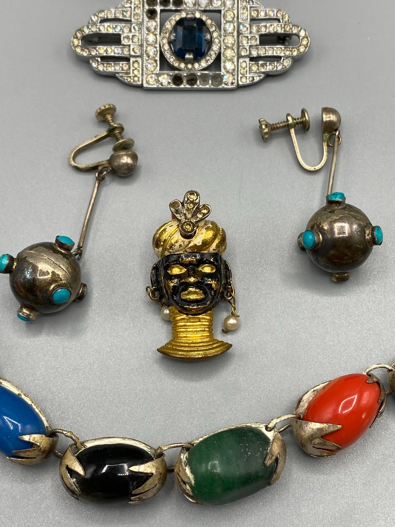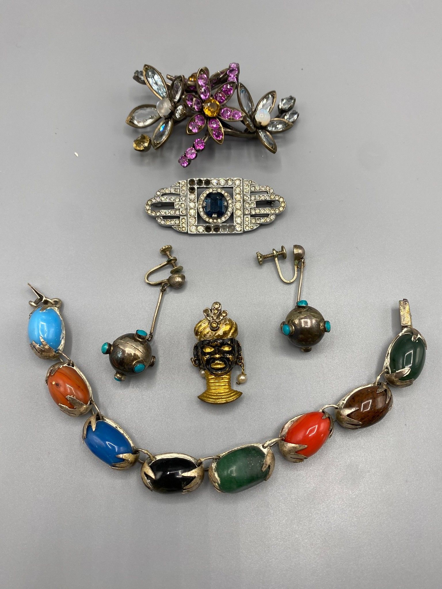 Set of quality costume jewellery: Flower alloy brooch with rhinestones and imitation opal glass (length 70 mm), supple bracelet with polished navettes of coloured gemstones (length 19 cm), pair of sputnik earrings with turquoise pearls (height 45 mm), small enamelled Nubian clip and small Art Deco-style plaque brooch.