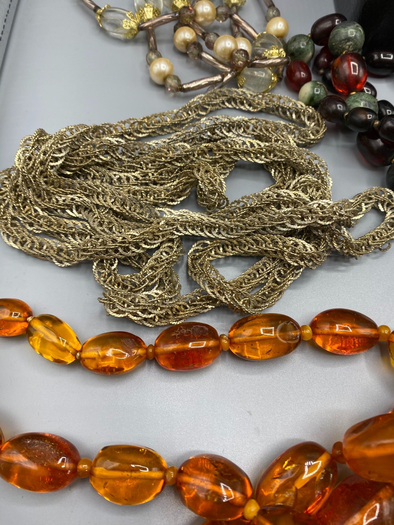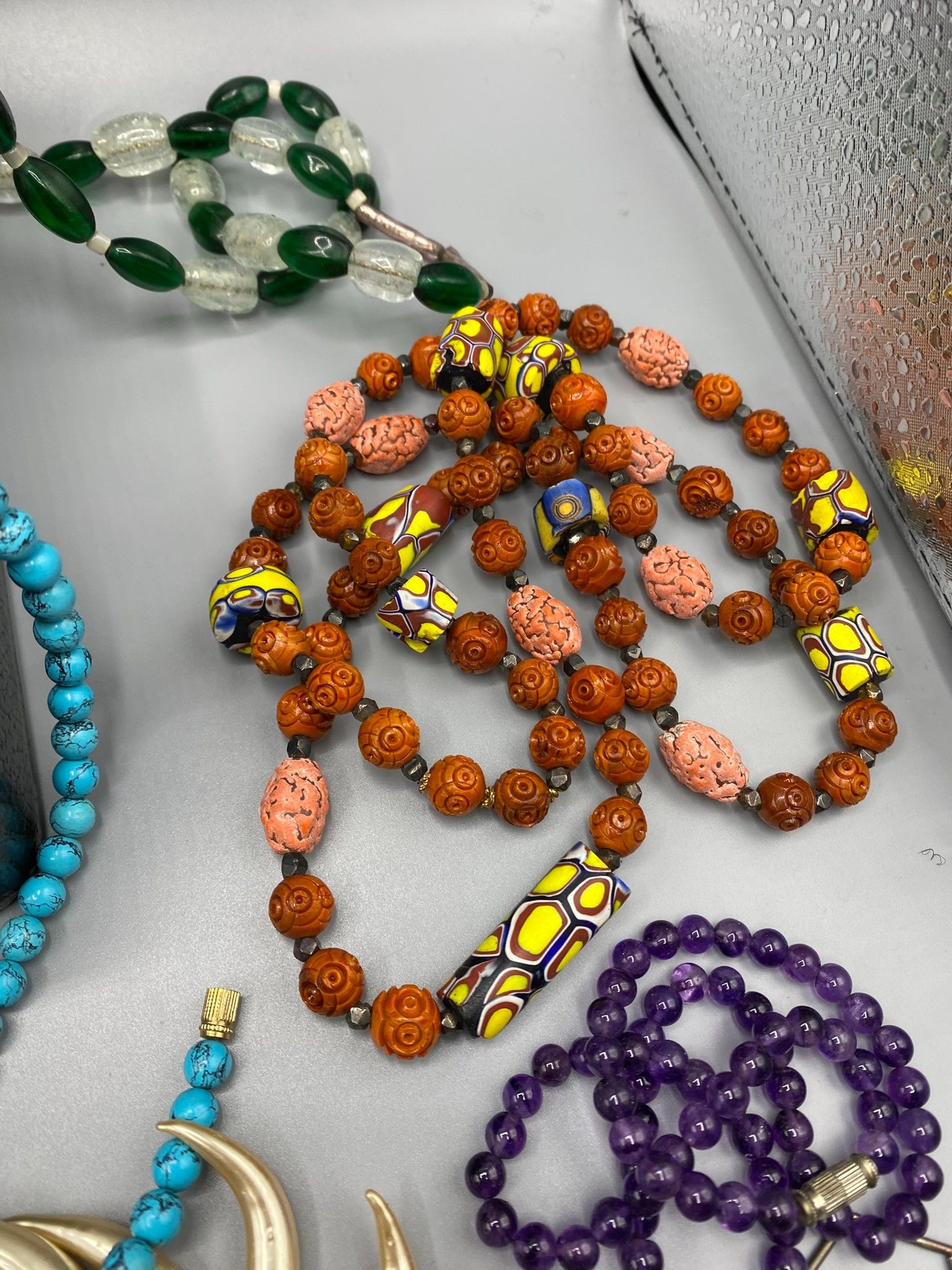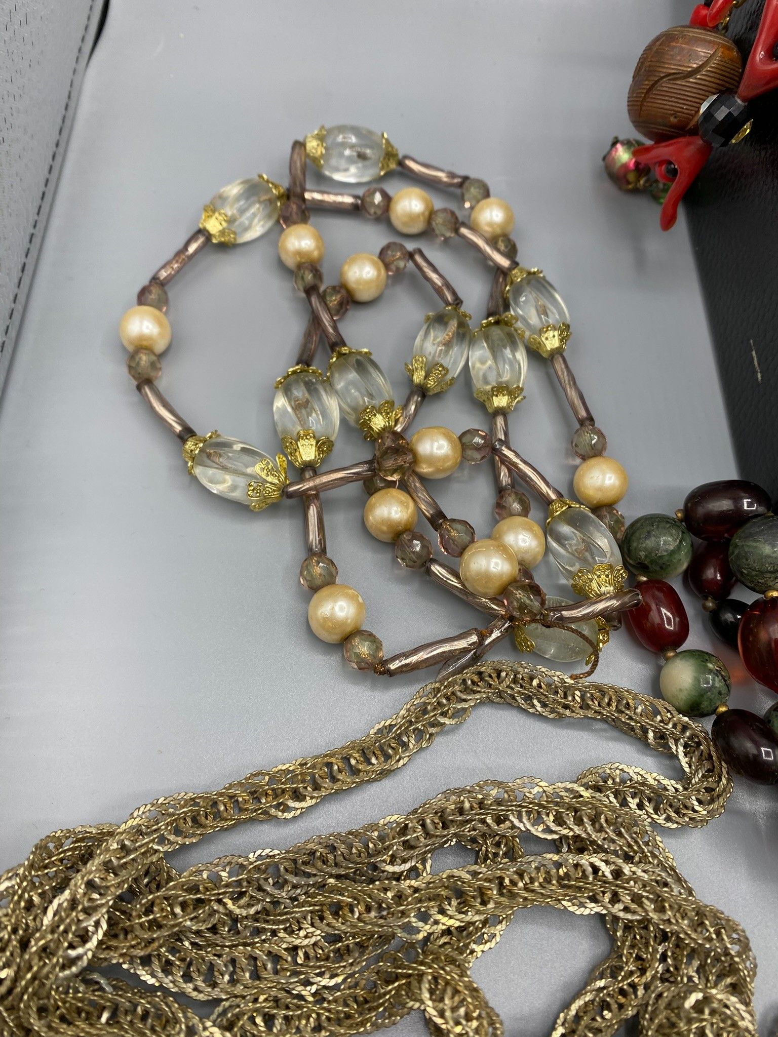 The box contains a number of fancy necklaces with large colo…