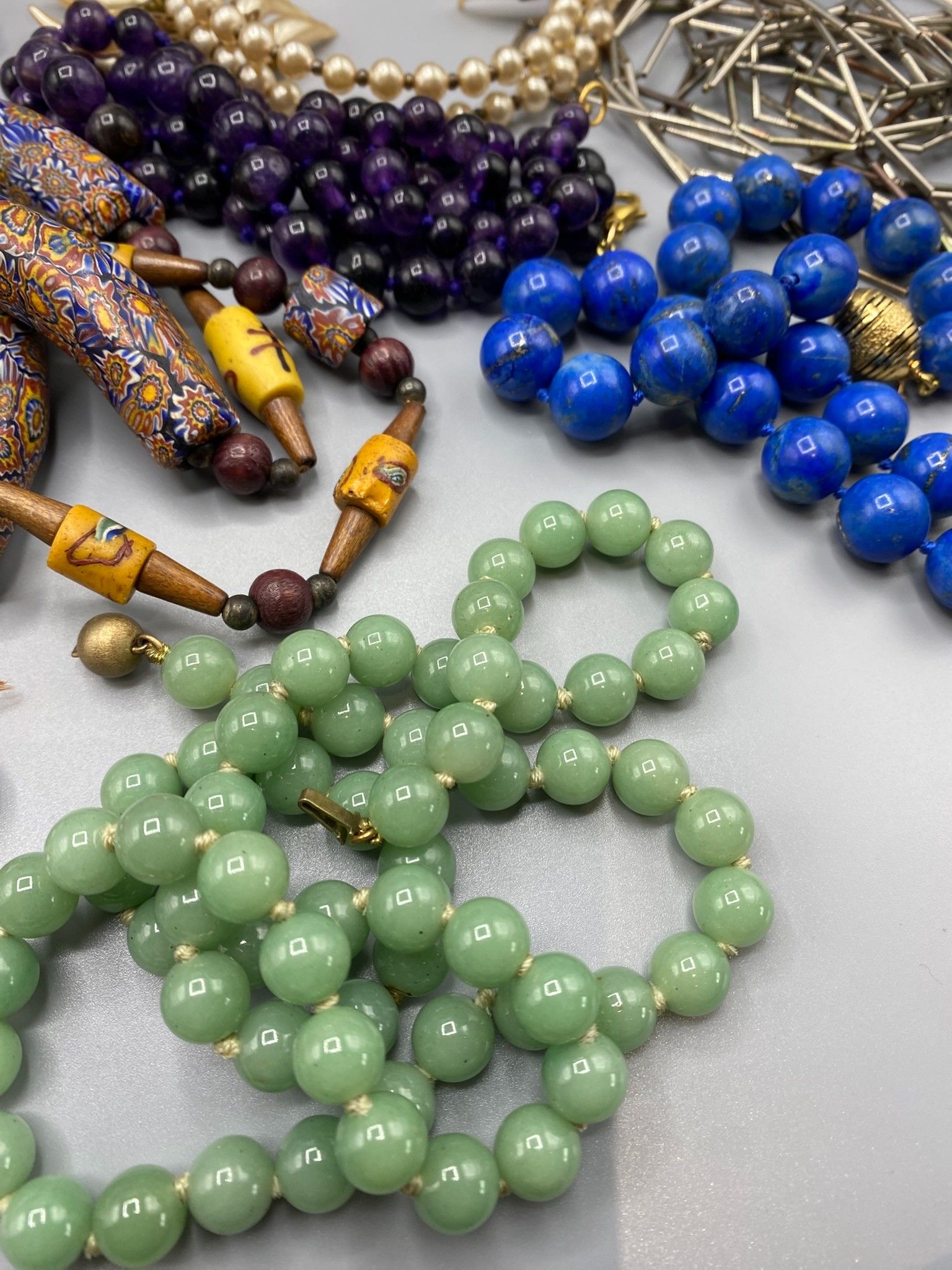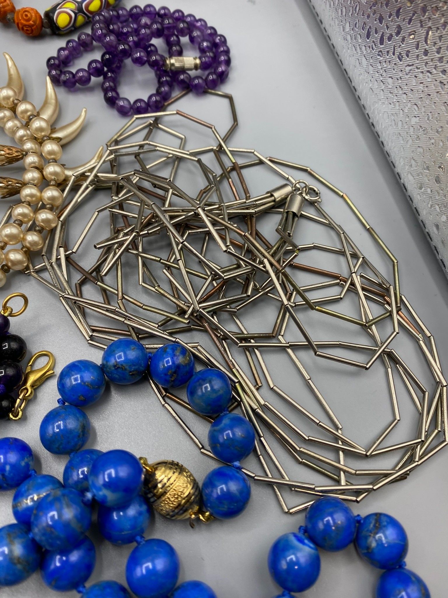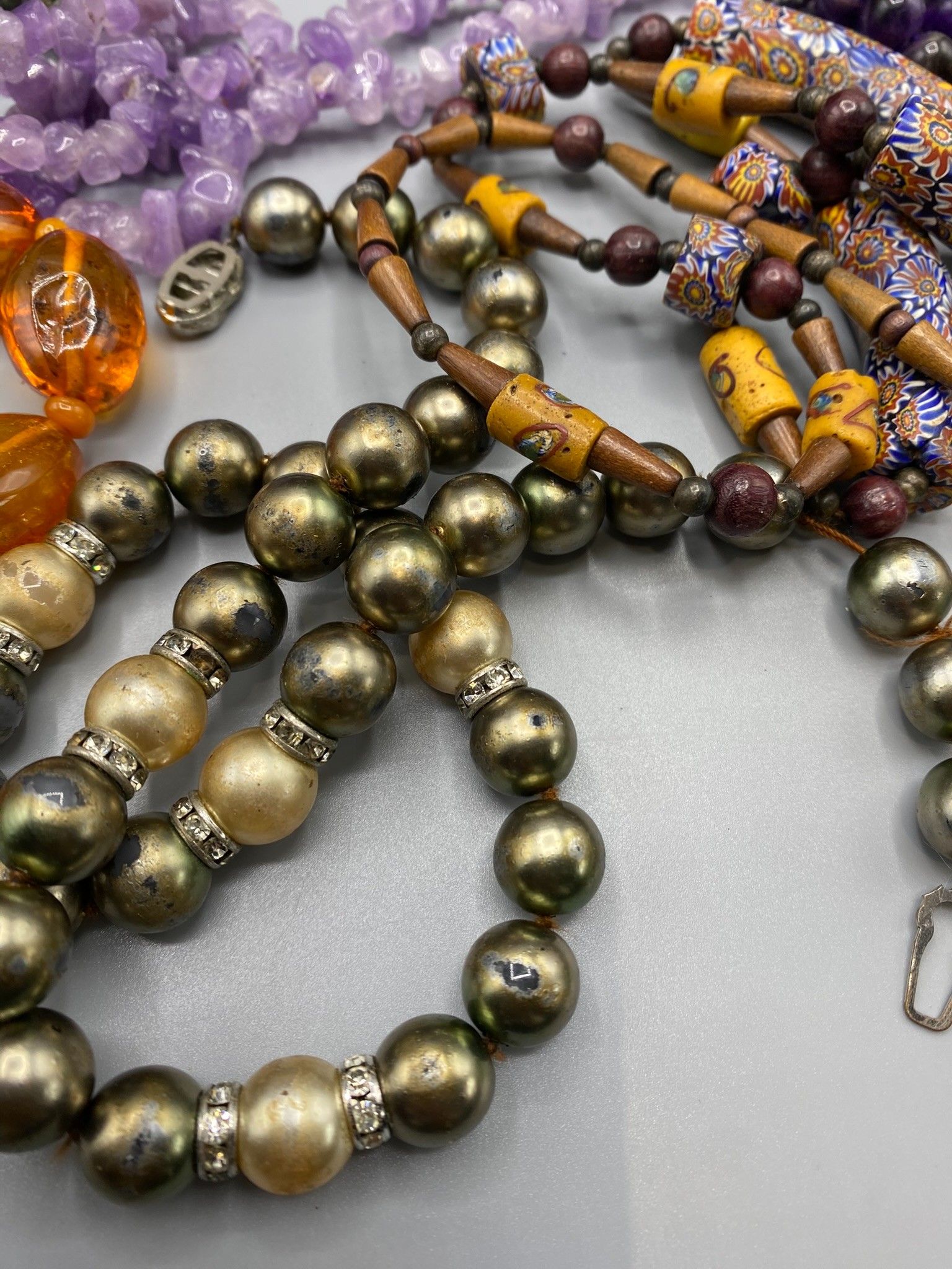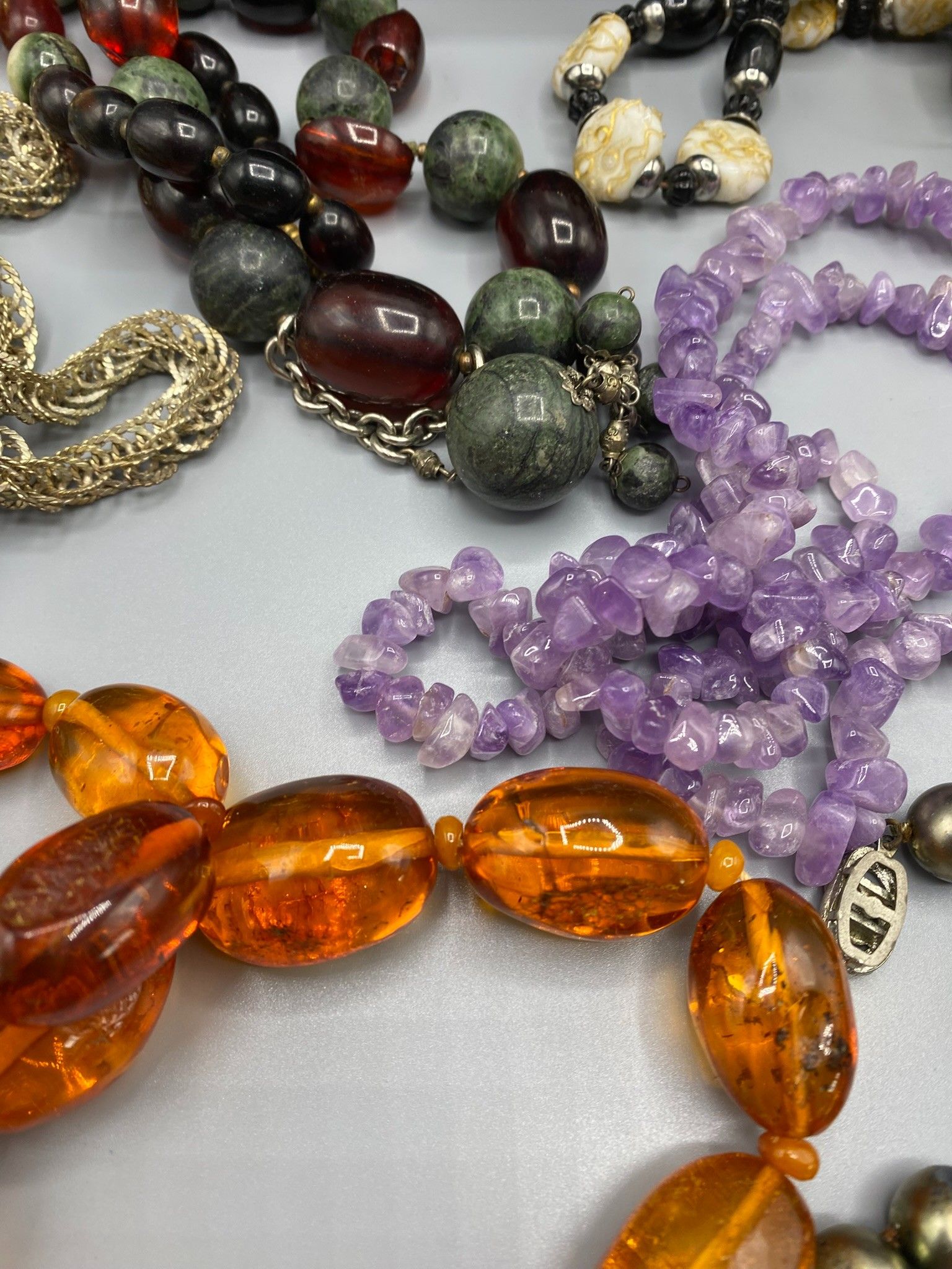 The box contains a number of fancy necklaces with large colo…
