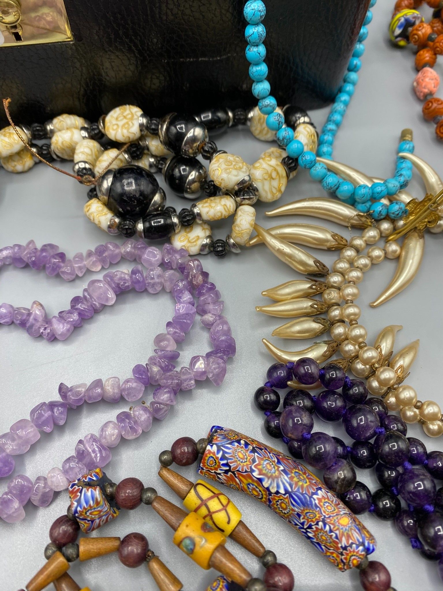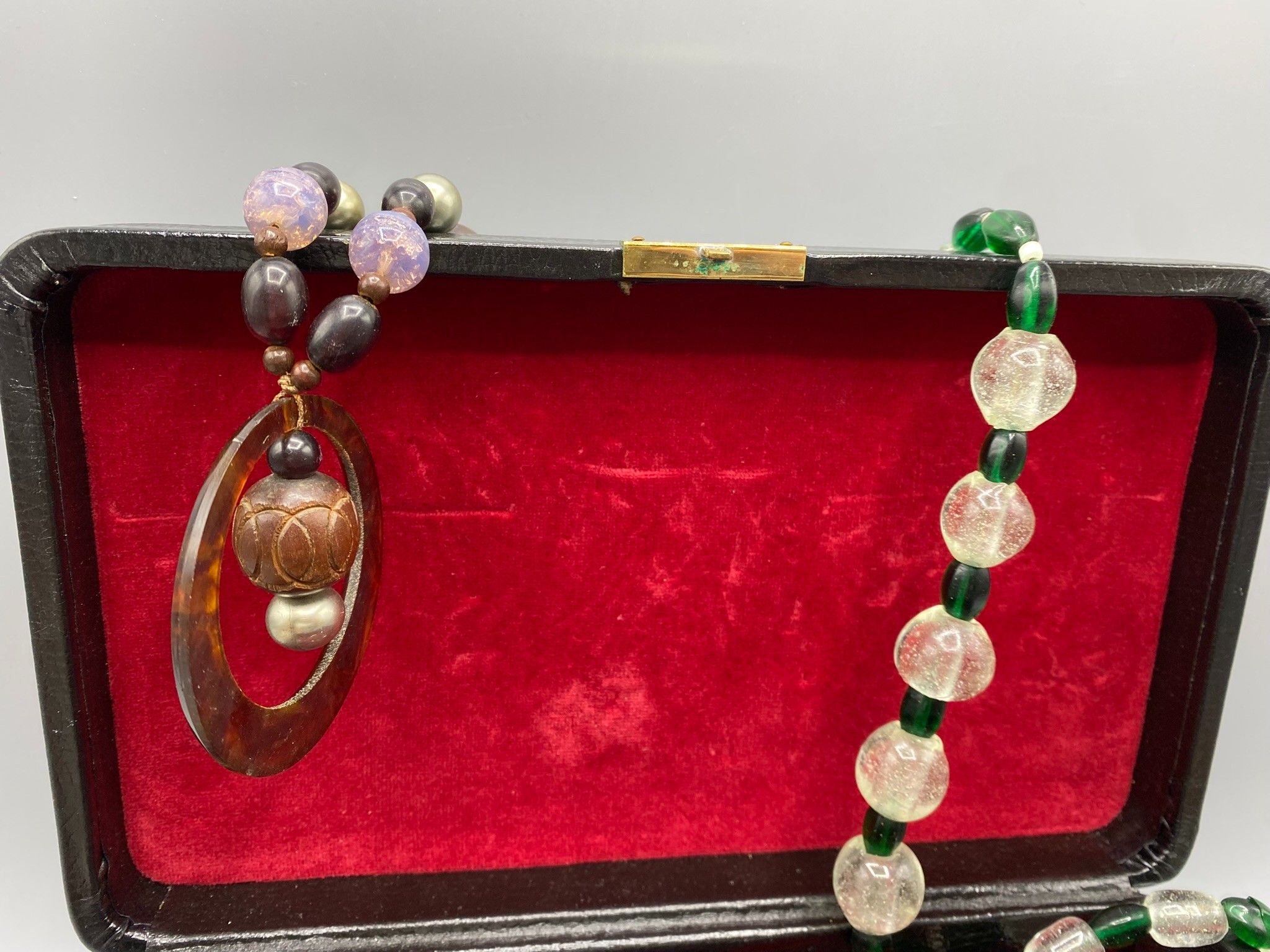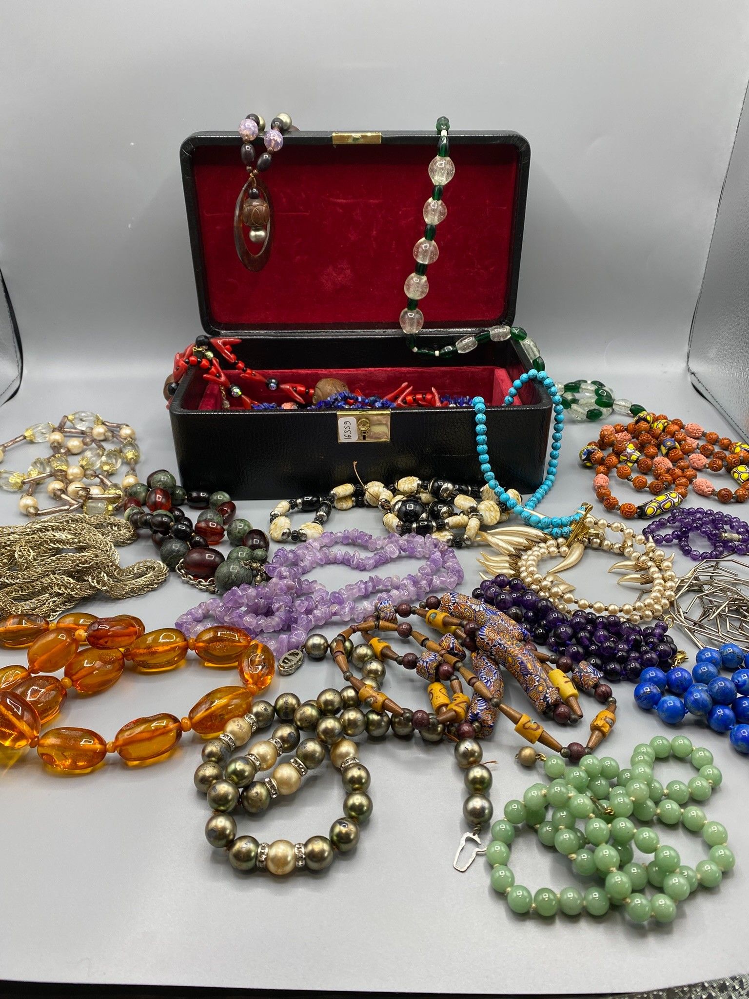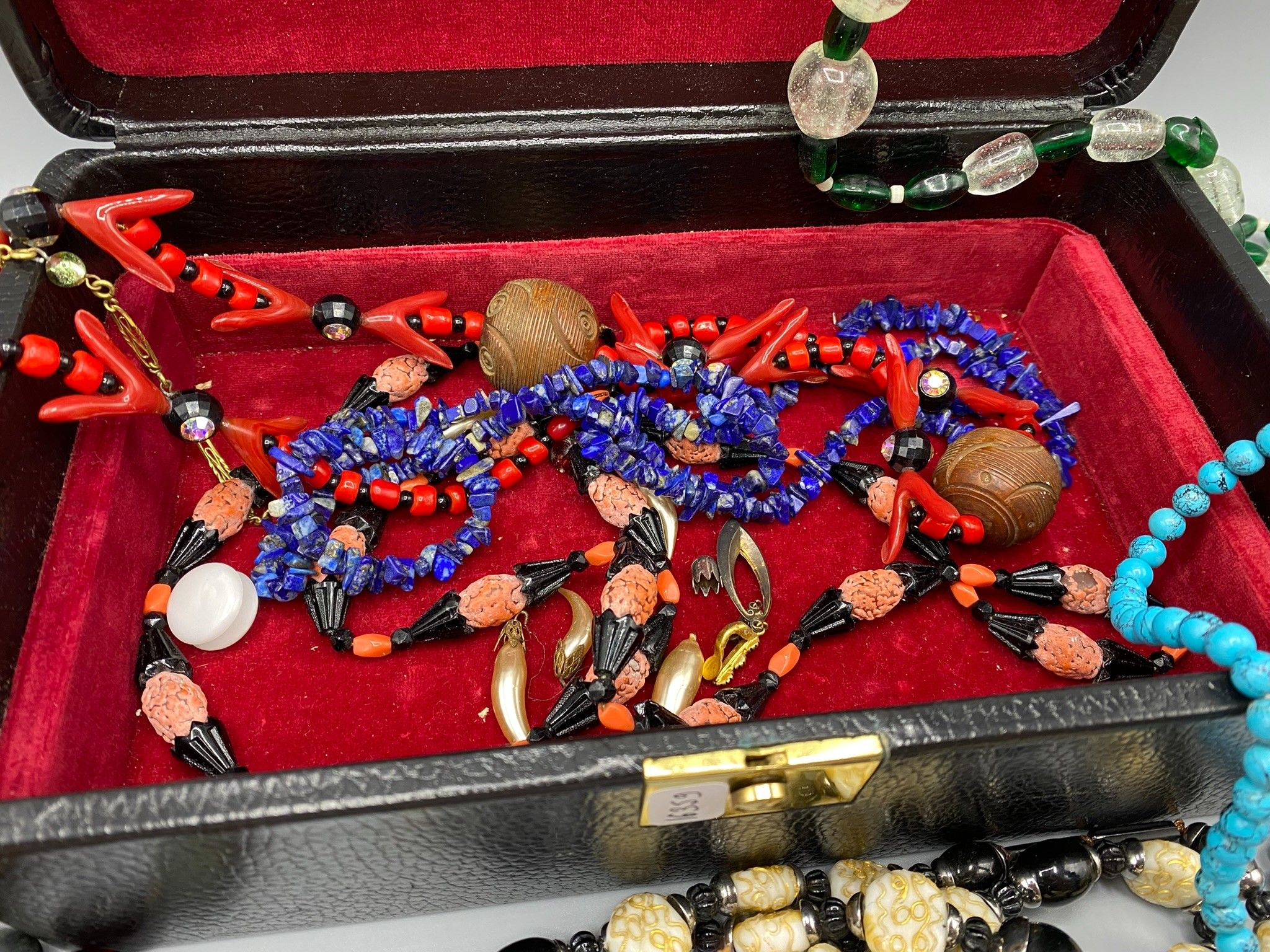 The box contains a number of fancy necklaces with large coloured glass beads, imitation mother-of-pearl, imitation coral, silver-plated metal, etc. All in a black rectangular box