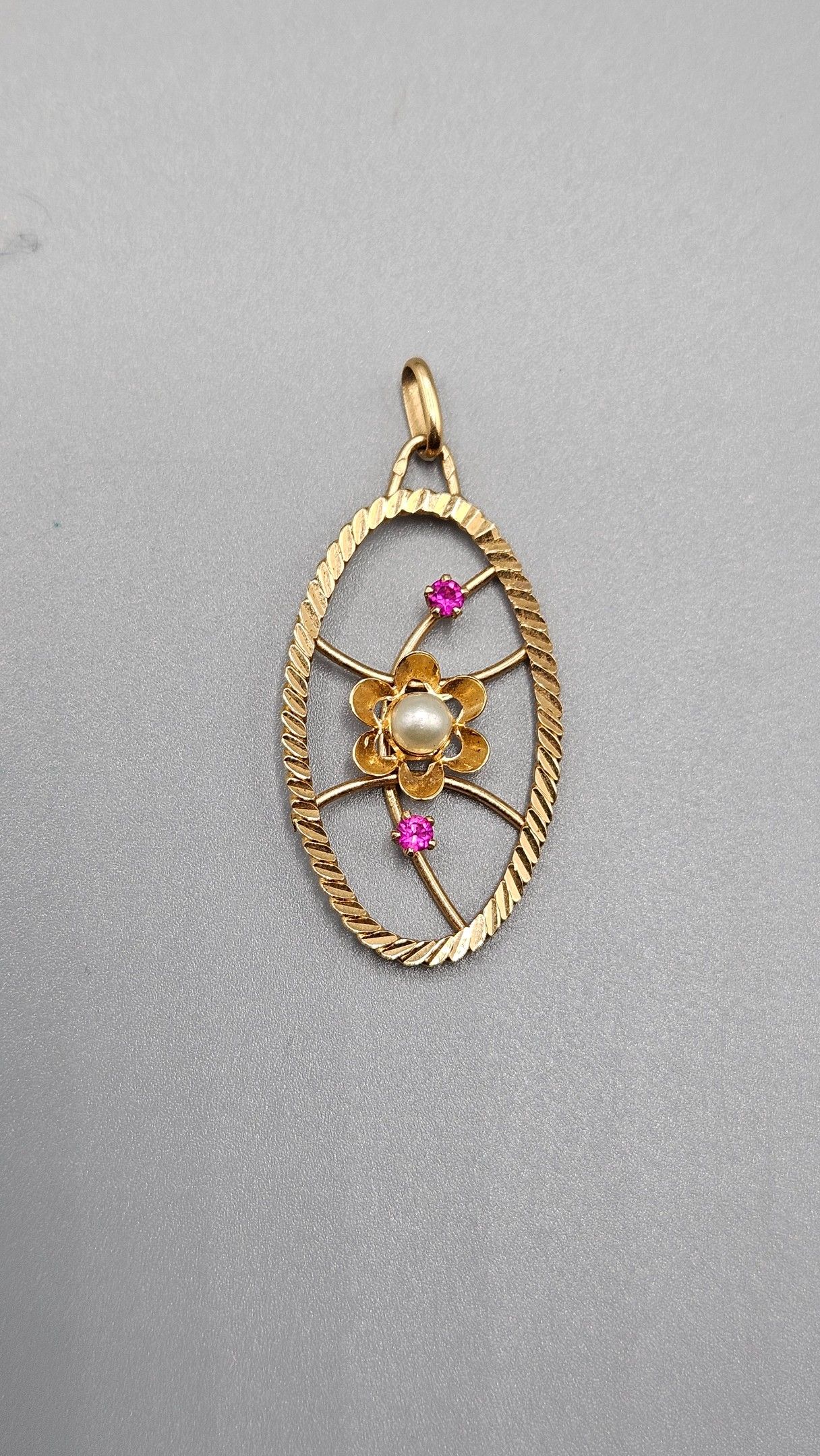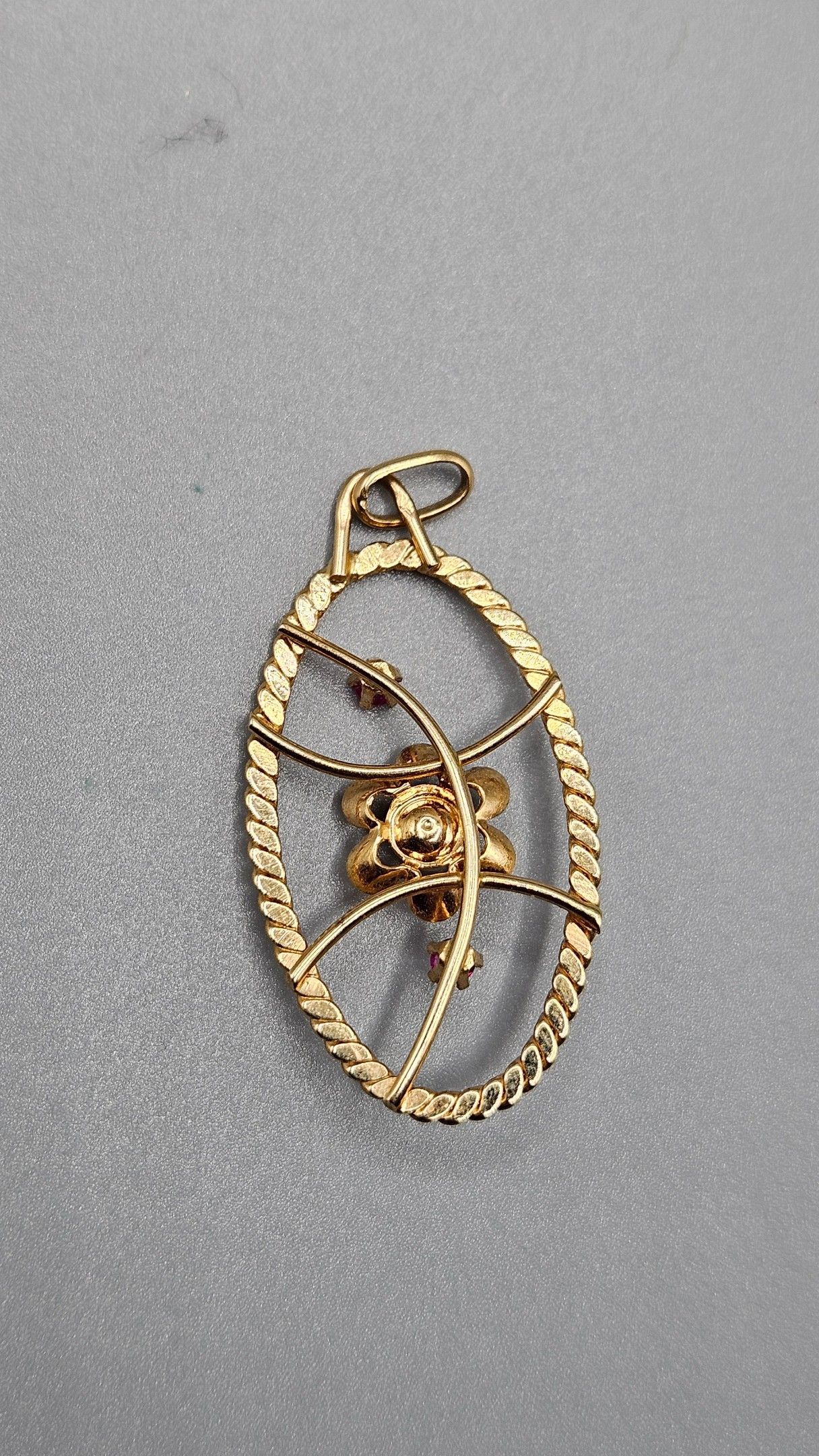 Oval openwork gold pendant (in ruler) with central flower motif adorned with a tiny pearl and set with two tiny red stones. 2.7 gr gross