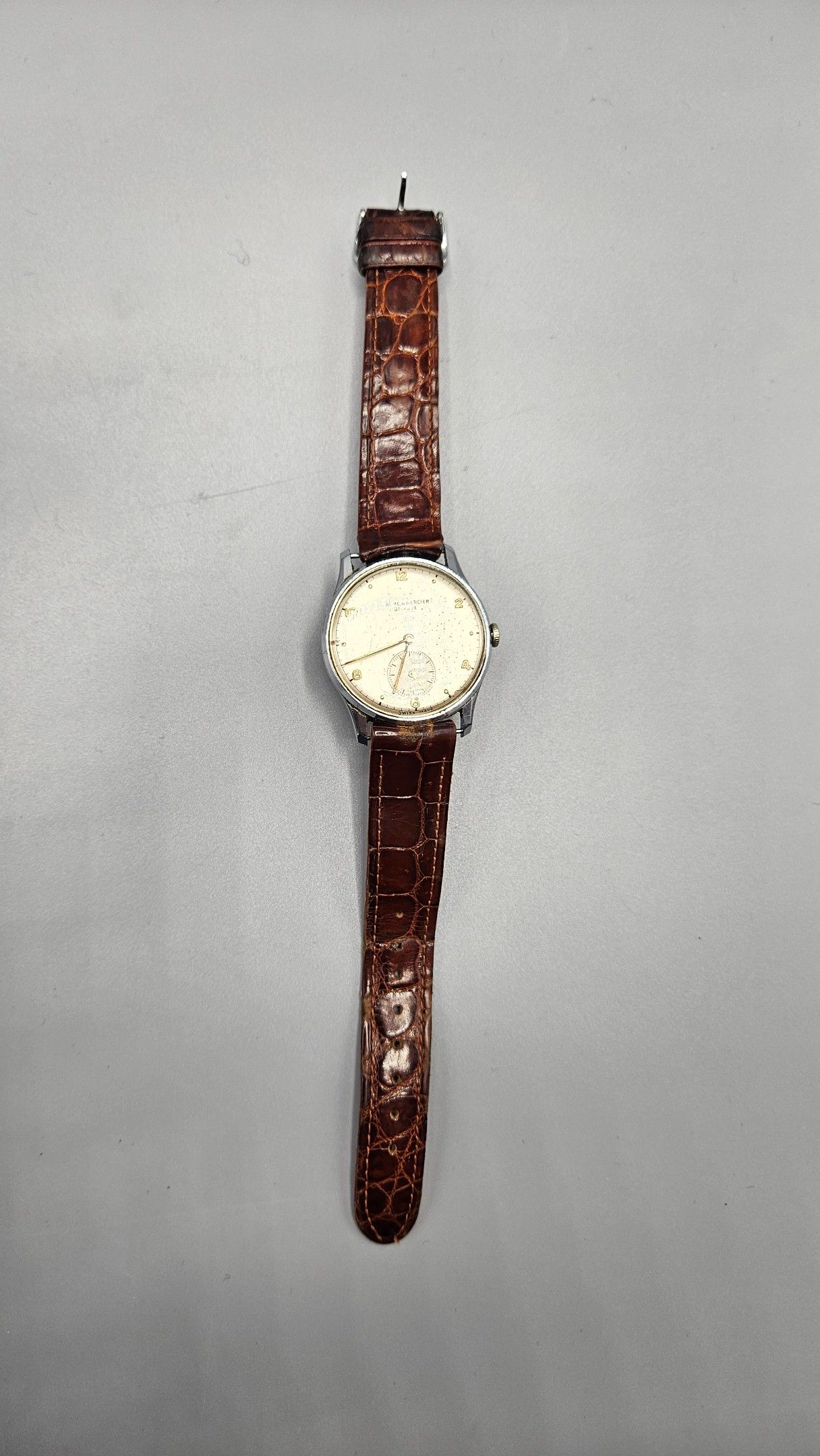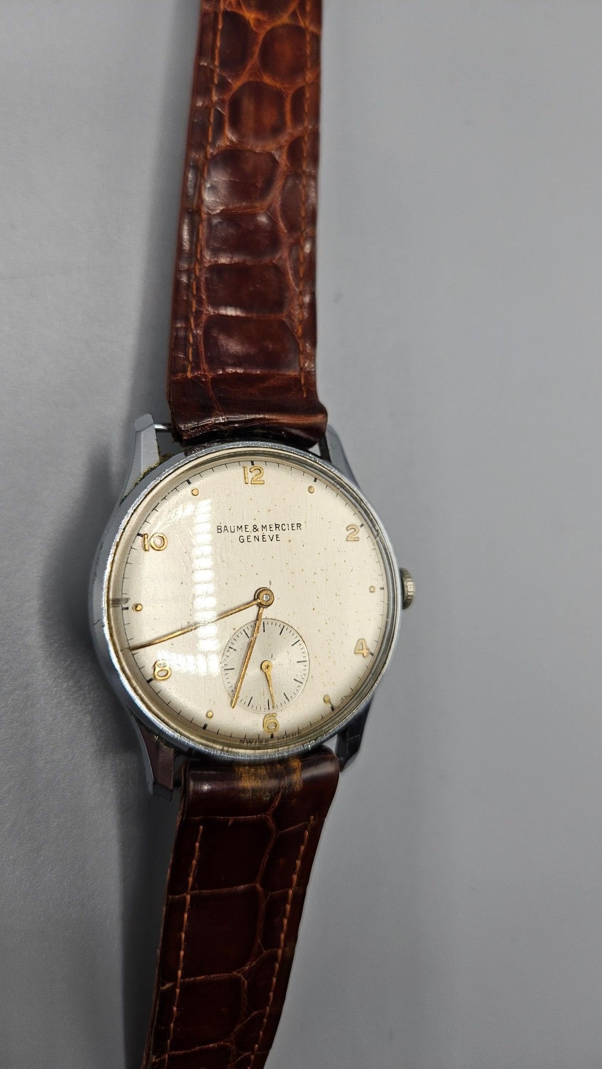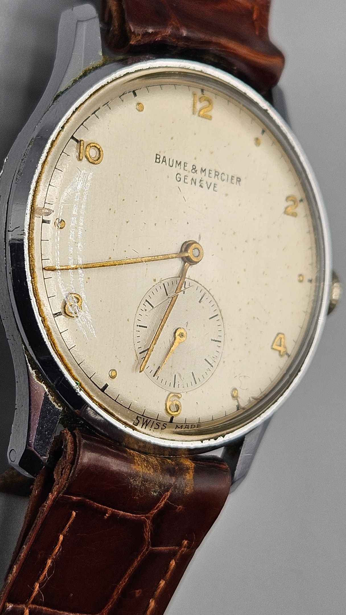 BAUME & MERCIER: Watch with round steel case (34 mm) and leather strap. Dial with silvered background and seconds counter at 6 o'clock. Mechanical hand-wound movement to be serviced