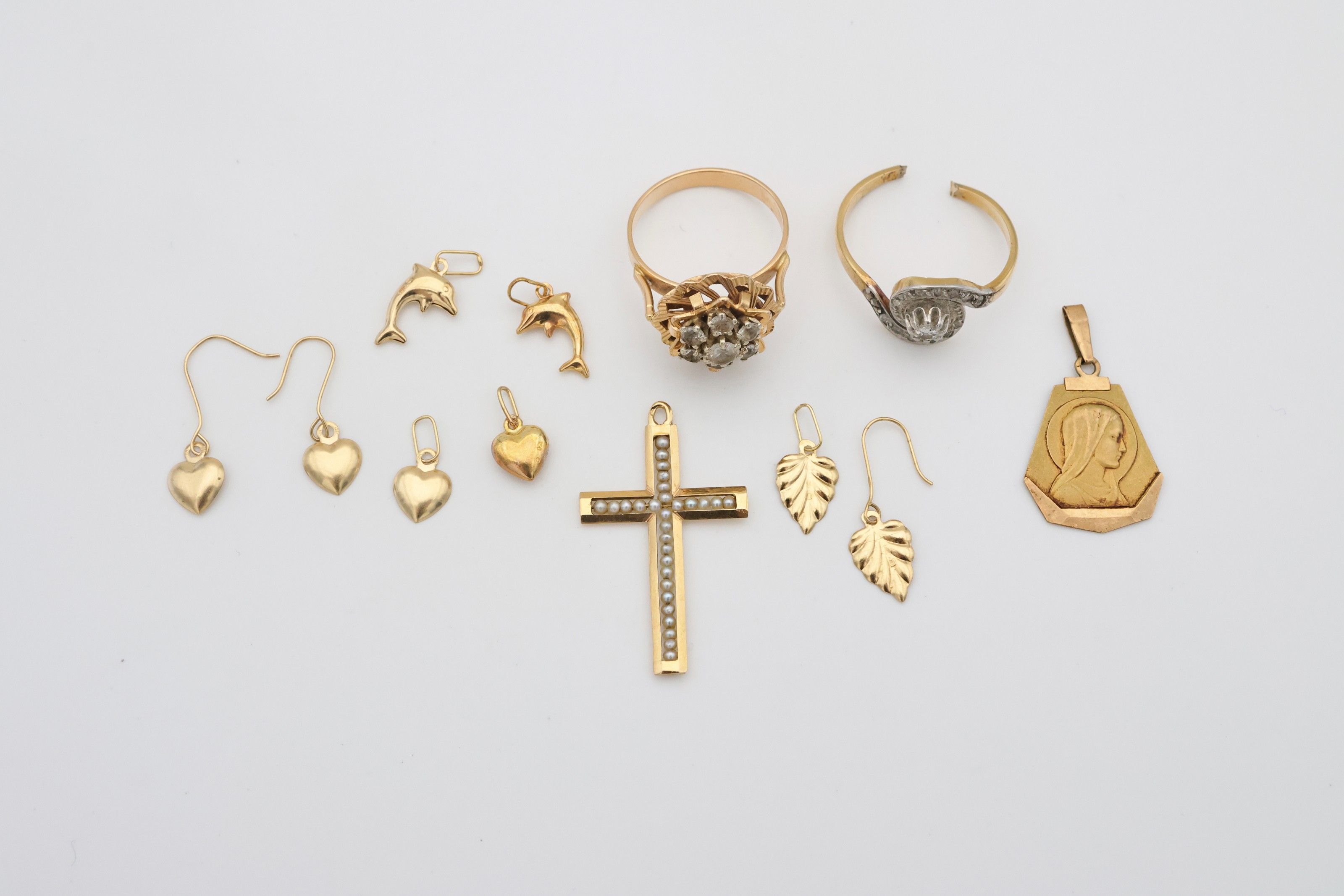 Lot in yellow and white gold (750) comprising a flower ring set with white stones, a tourbillon ring set with old-cut and rose-cut diamonds (broken), a Latin cross pendant set with small cultured pearls, dolphin and heart pendants, small earrings and a Virgin Mary medal, 11.4 gbt, wear, as is