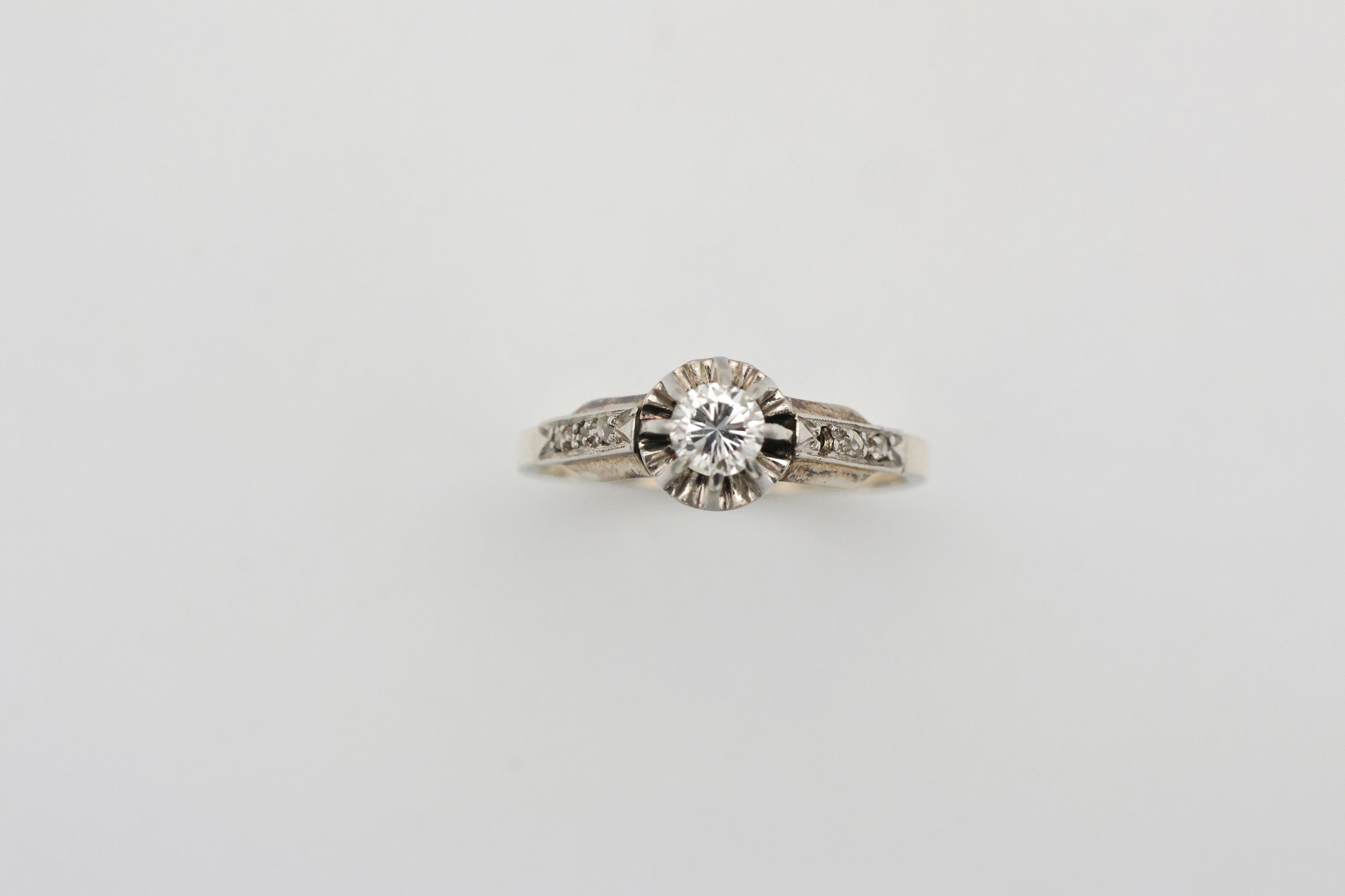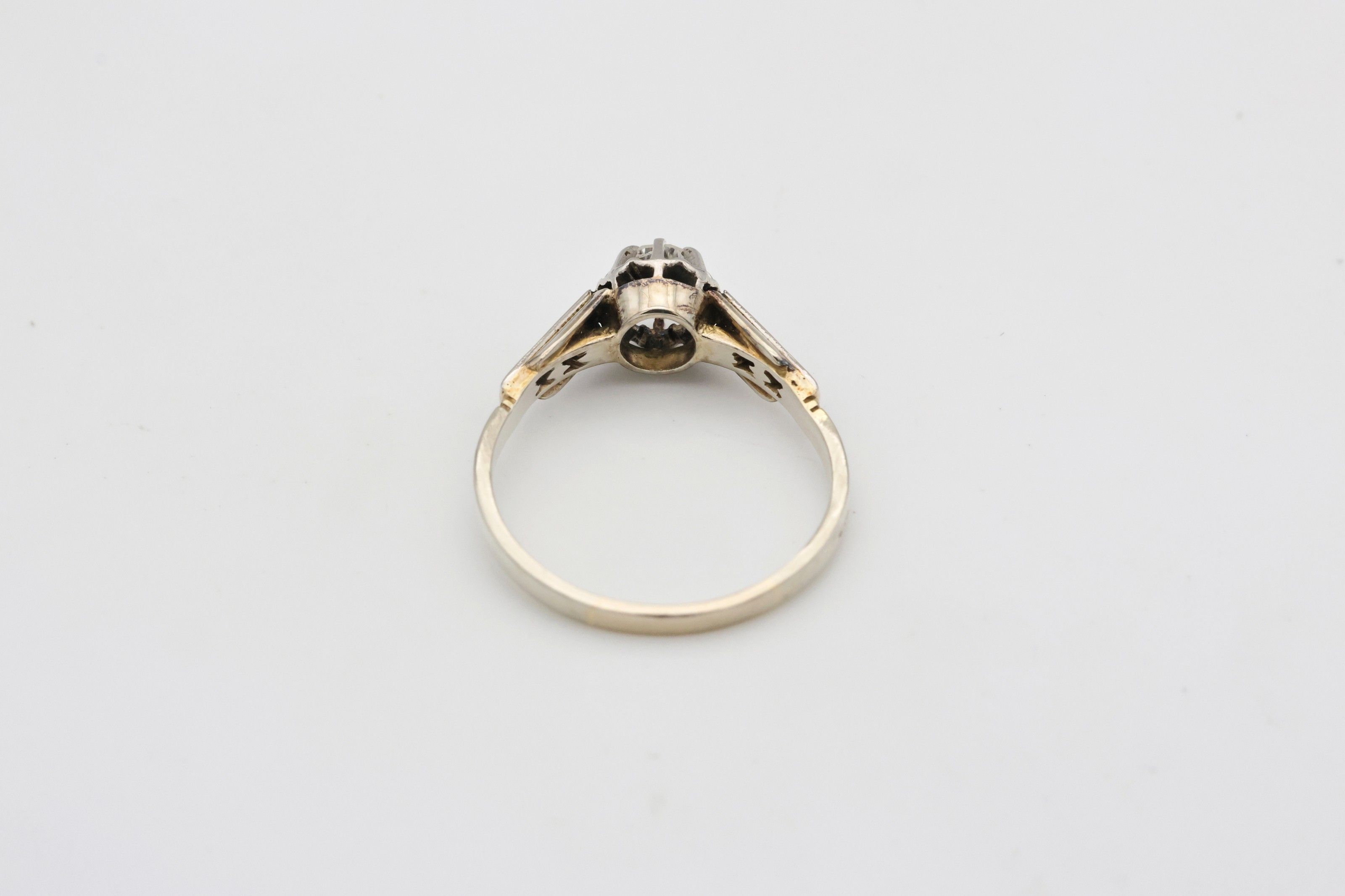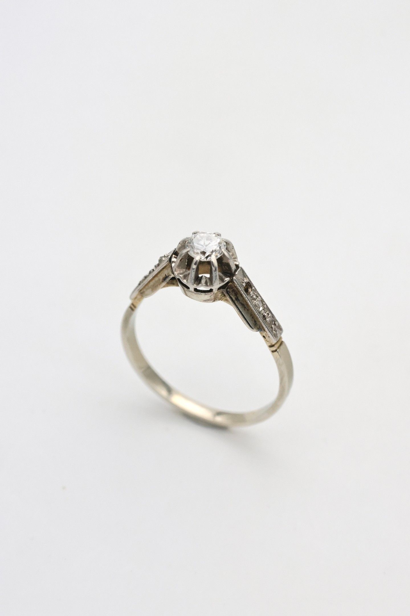 Solitaire ring in white gold (750) and platinum (950) set with a round brilliant-cut diamond weighing approximately 0.25 ct, flanked by rose-cut diamonds (one missing), finger size 59, 3.5 gbt