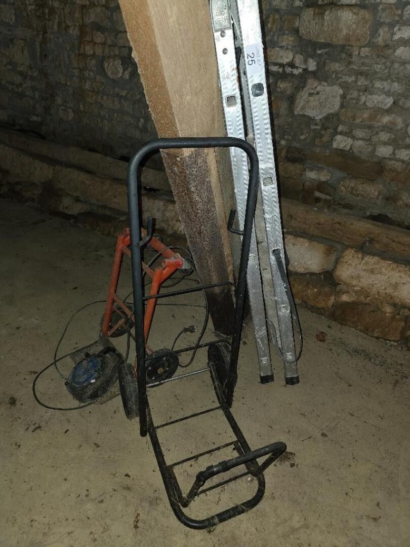 A set comprising: an aluminium stepladder, a log transport trolley, an electric winder and an orange rolling trolley.
