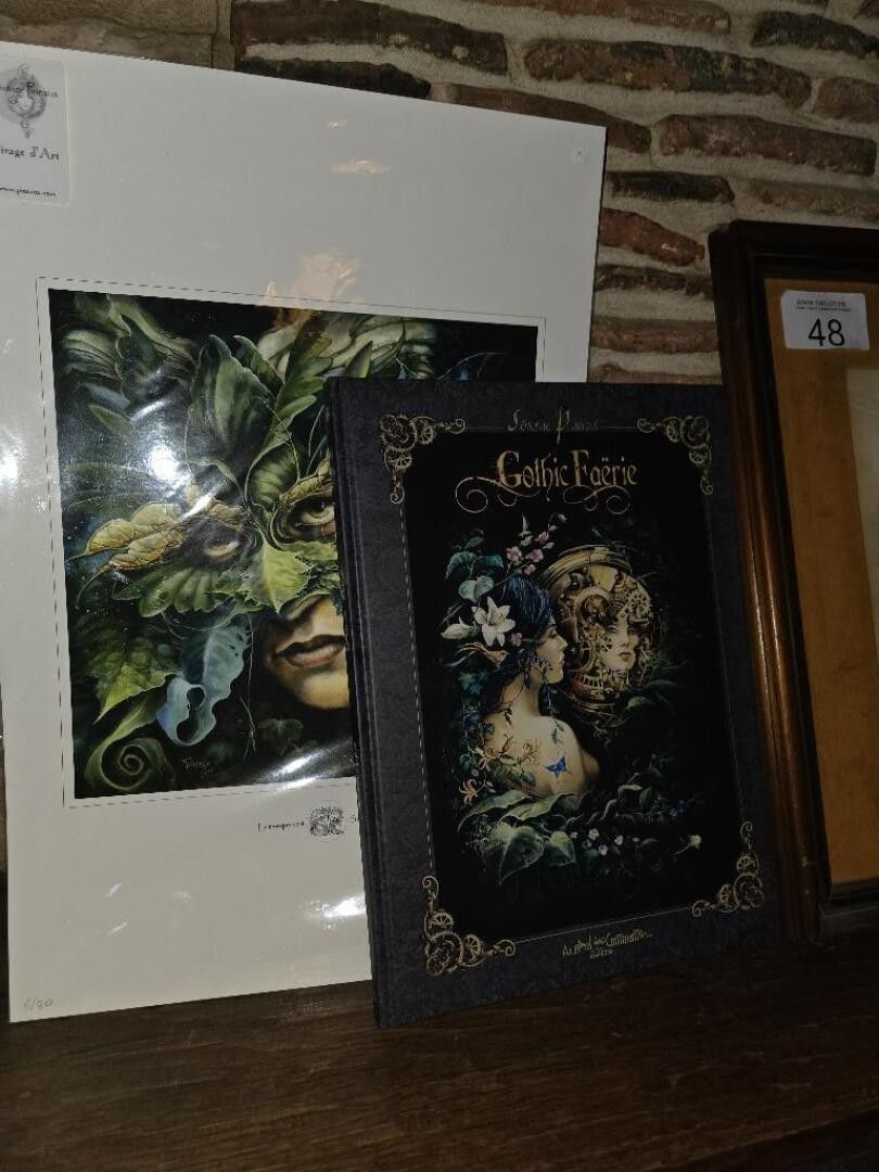 On the mantelpiece: a frame representing "a hunting dog holding game in its mouth" bearing a mark by Brial, a book "voyages avec aquarelle de Pasquereau" and a book "gothic faërie".