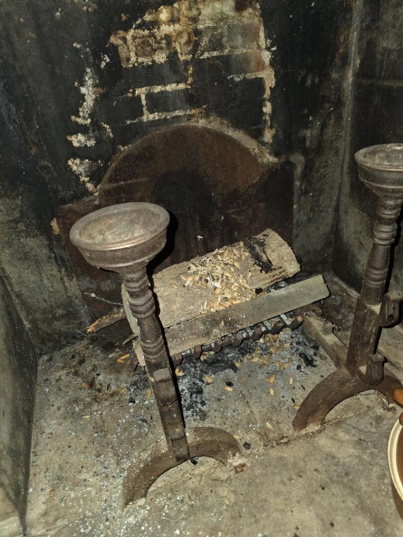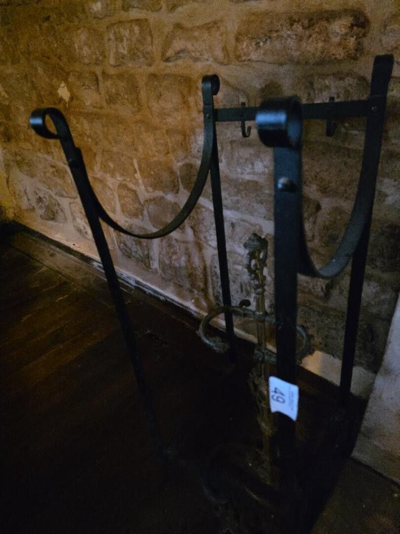A pair of landier andirons, a metal log stand and a fireplac…