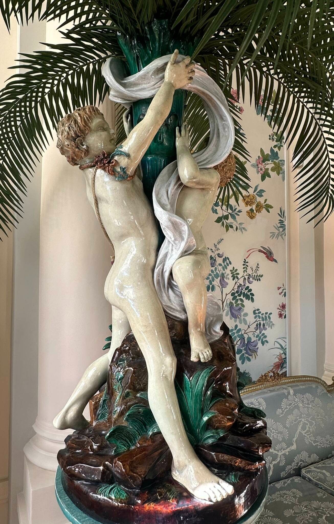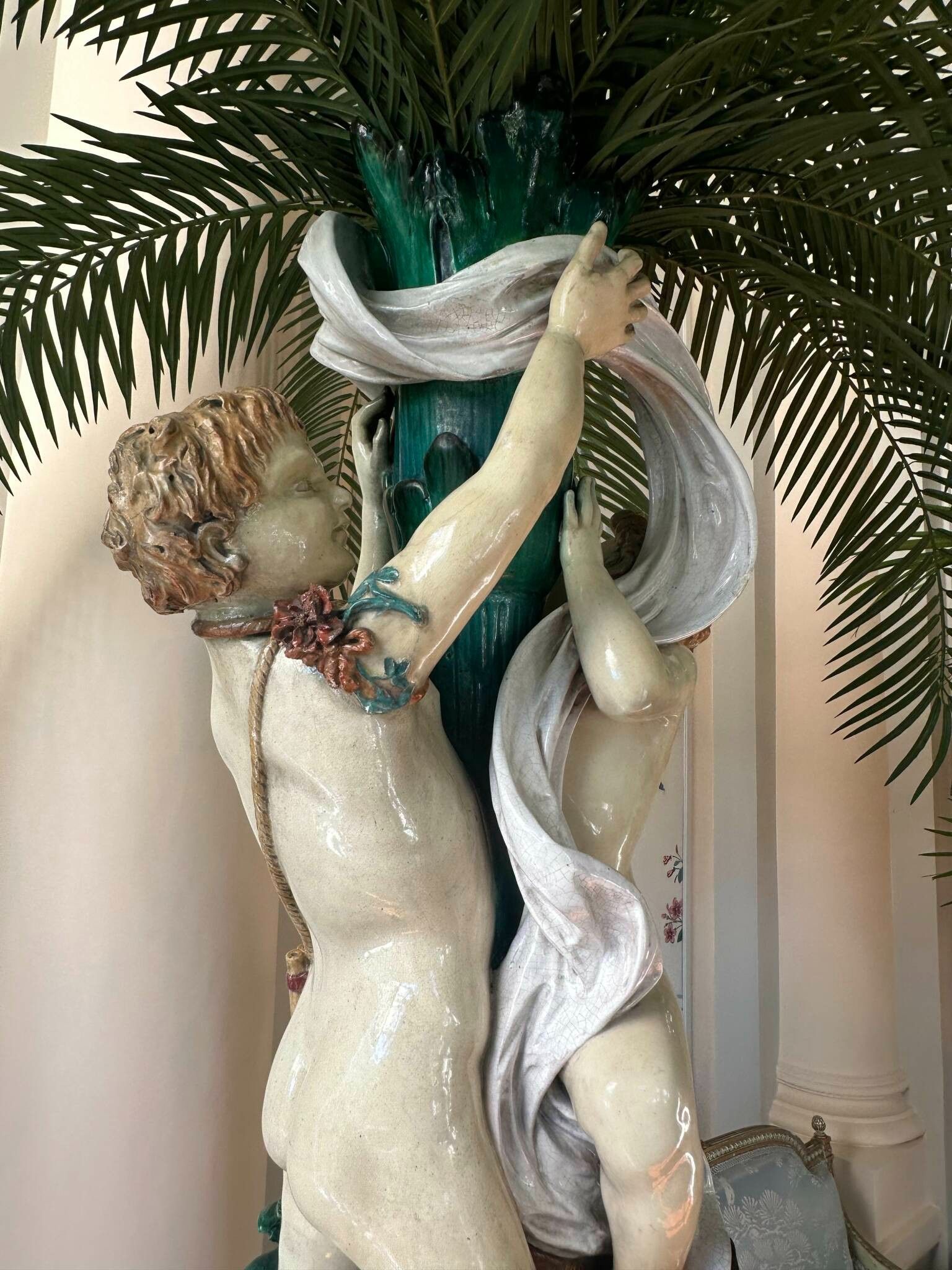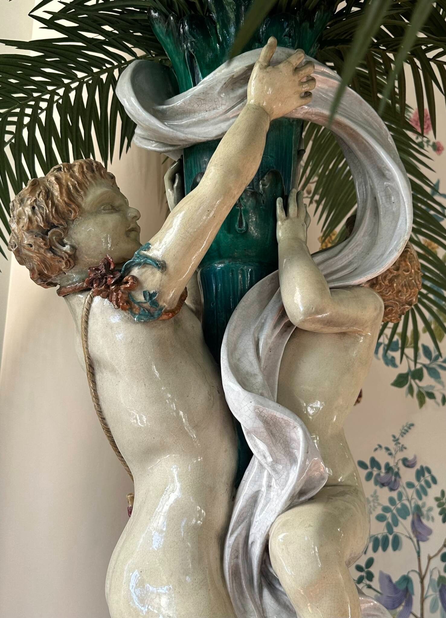A large polychrome enamelled earthenware and barbotine vase decorated with two putti embracing a plant and supporting a bouffant drape.